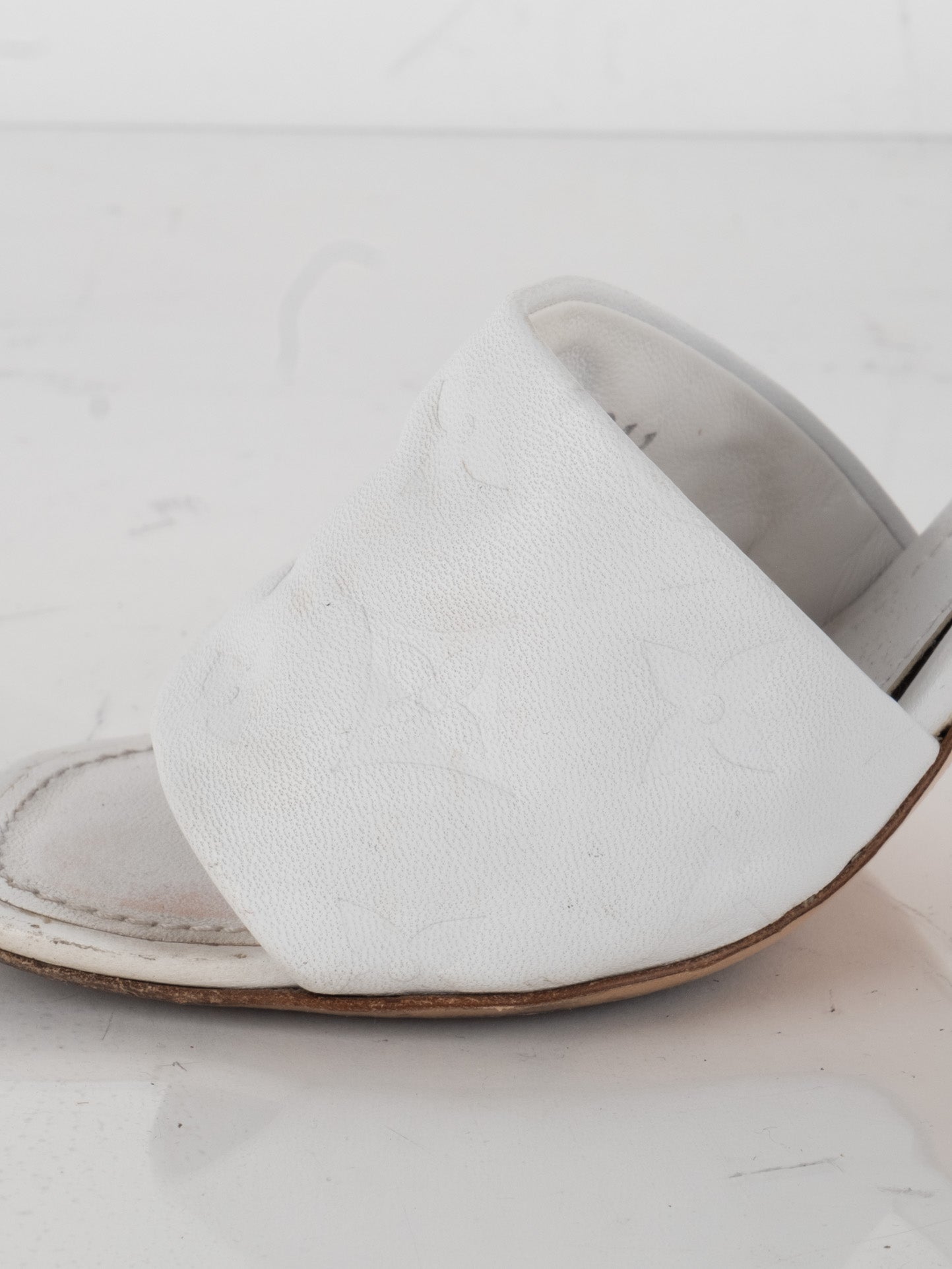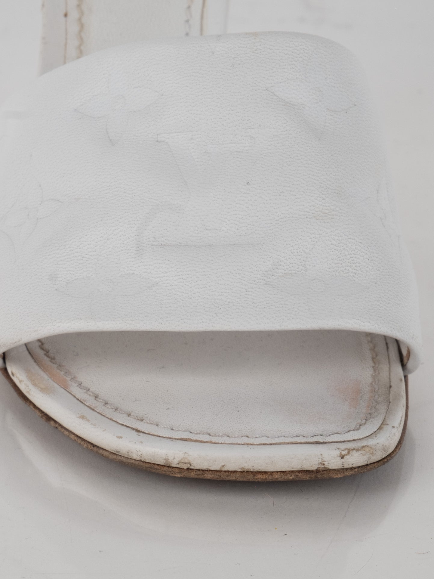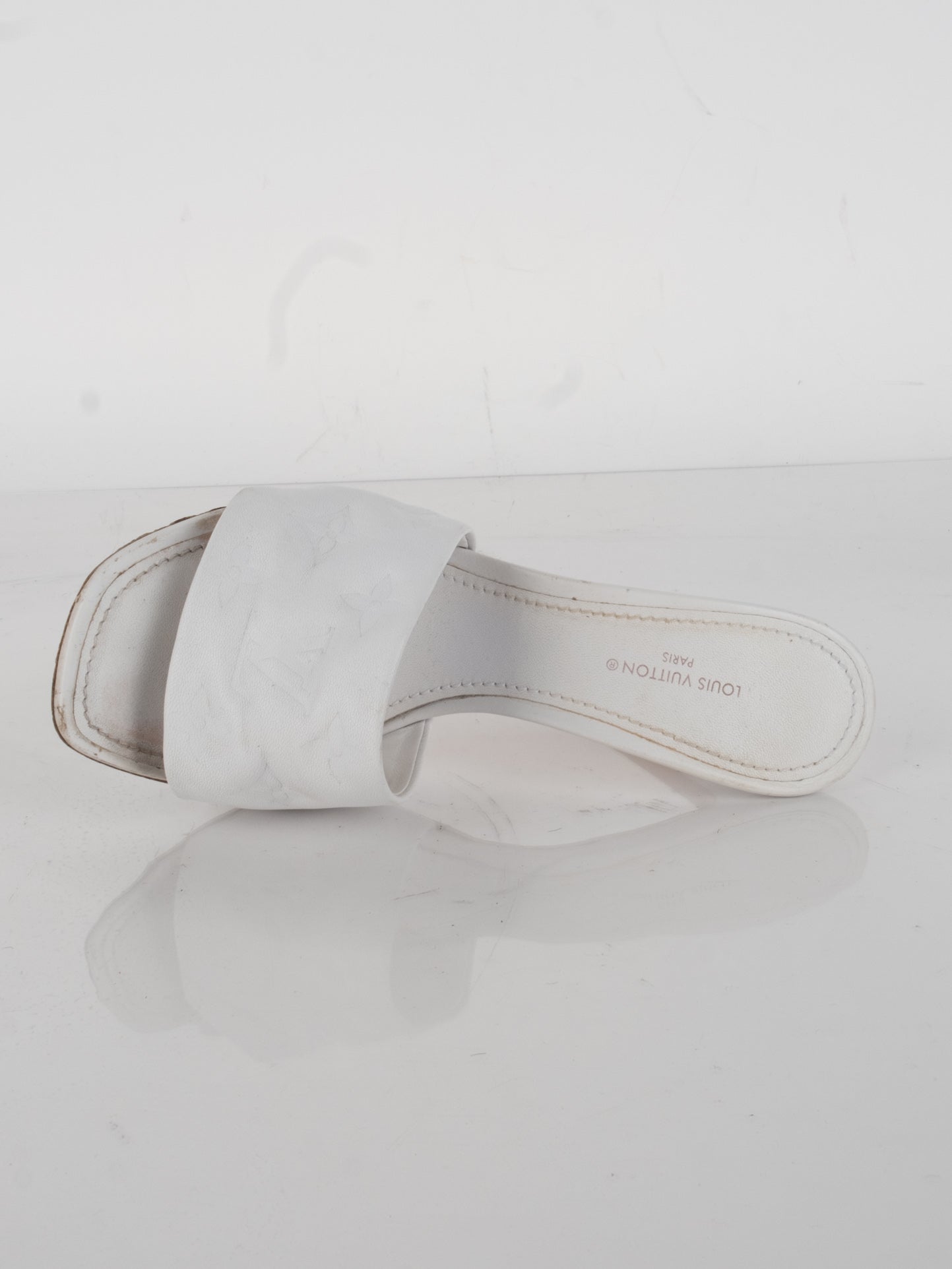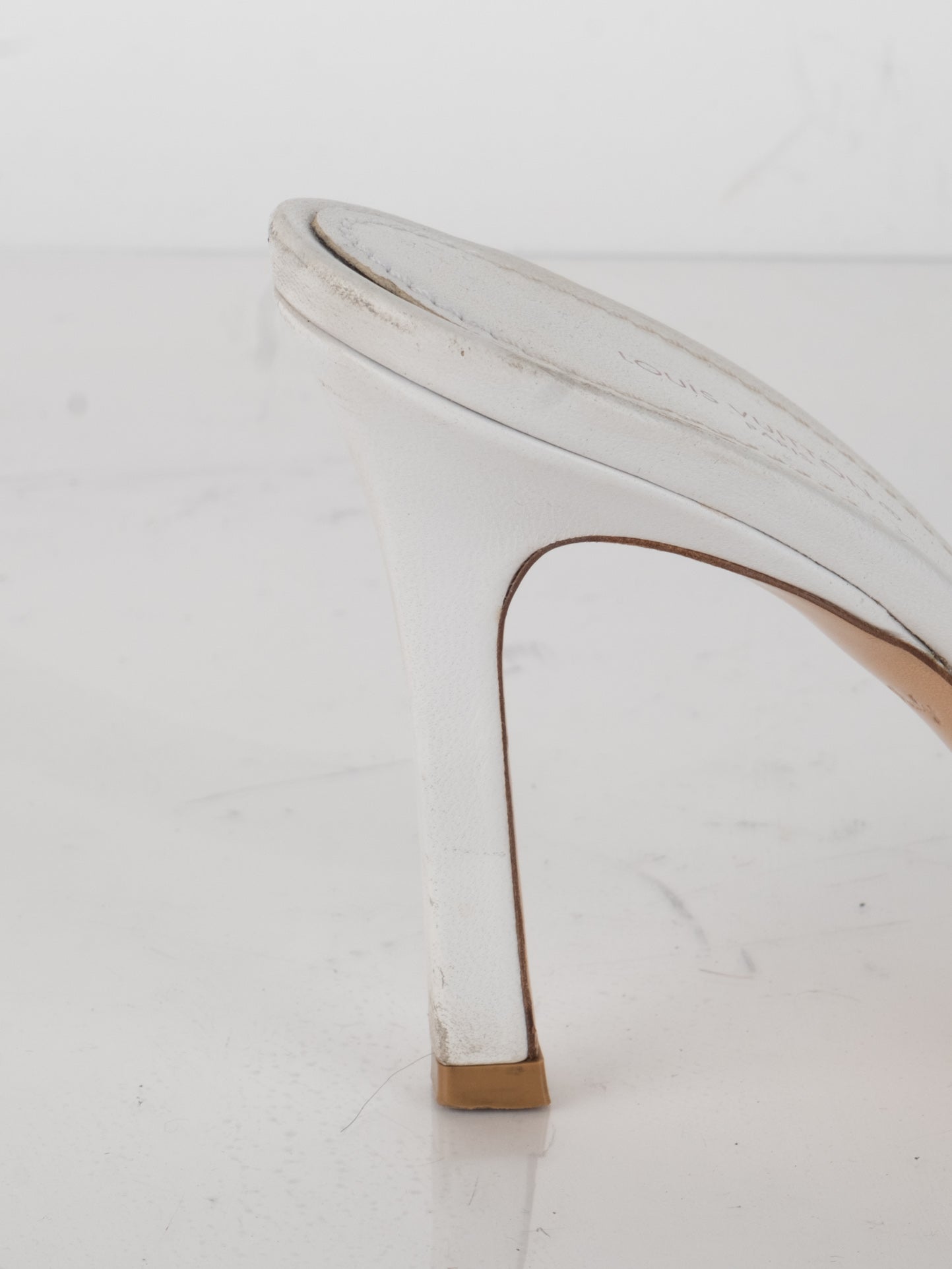 עקב סנדל העשוי מעור בצבע לבן בהדפס המונוגרמי המוכר של המותג הצרפתי בעל עקב דק.