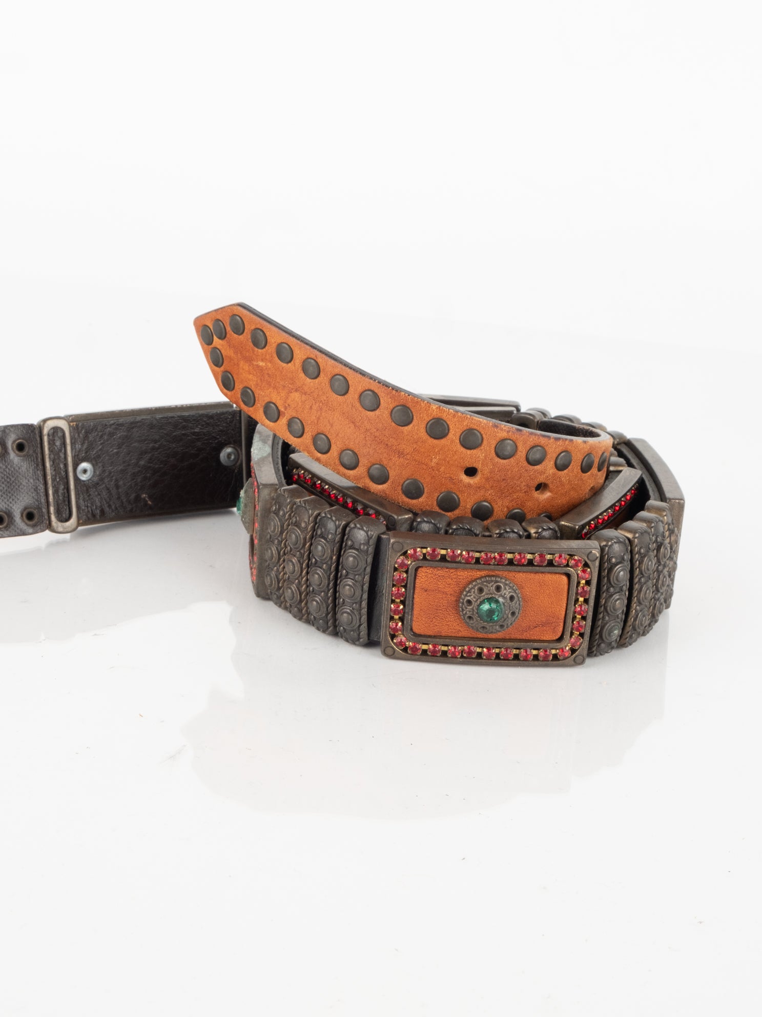 חגורה העשוי מעור בשילוב של מתכת (כבדה) עם דיטיילים בצבע ברונזה ואבנים.