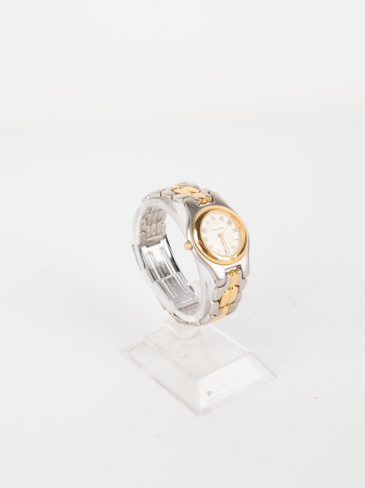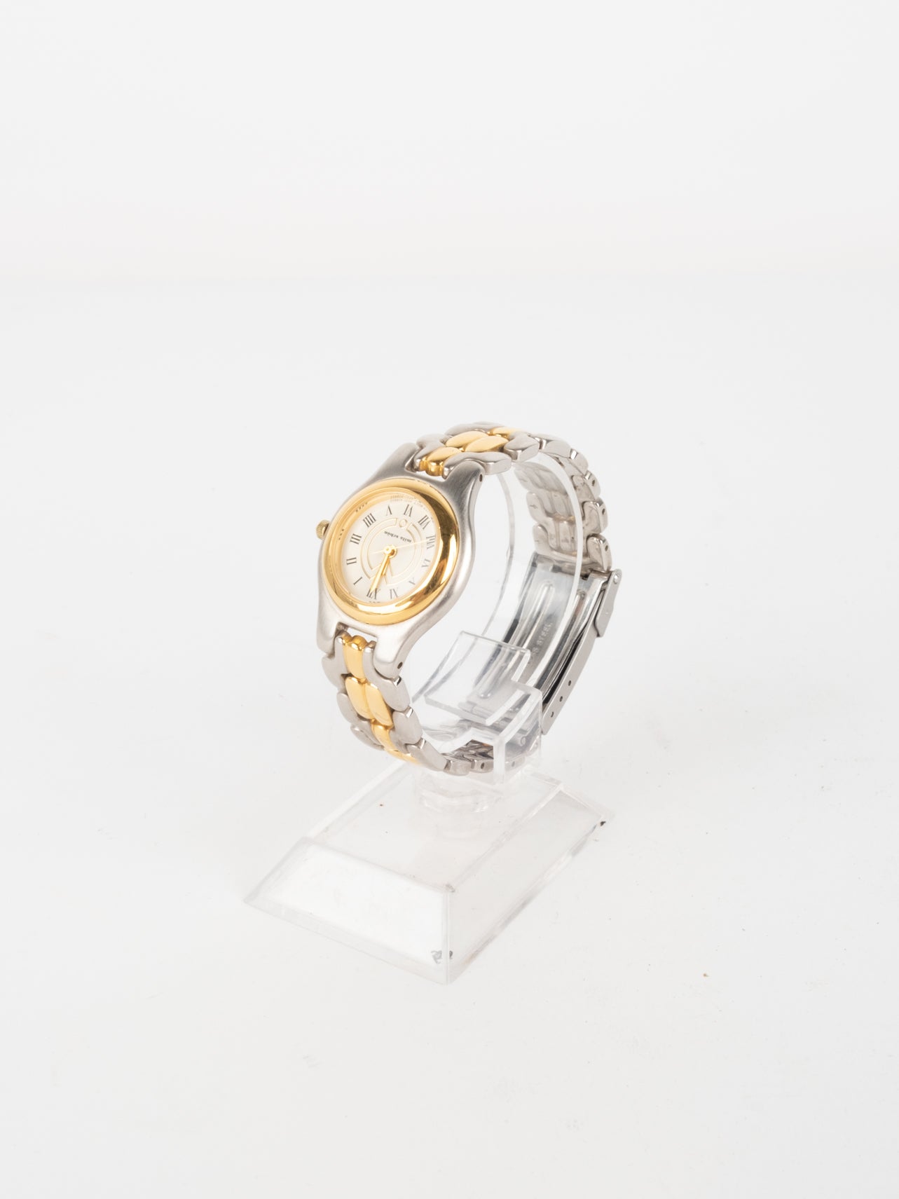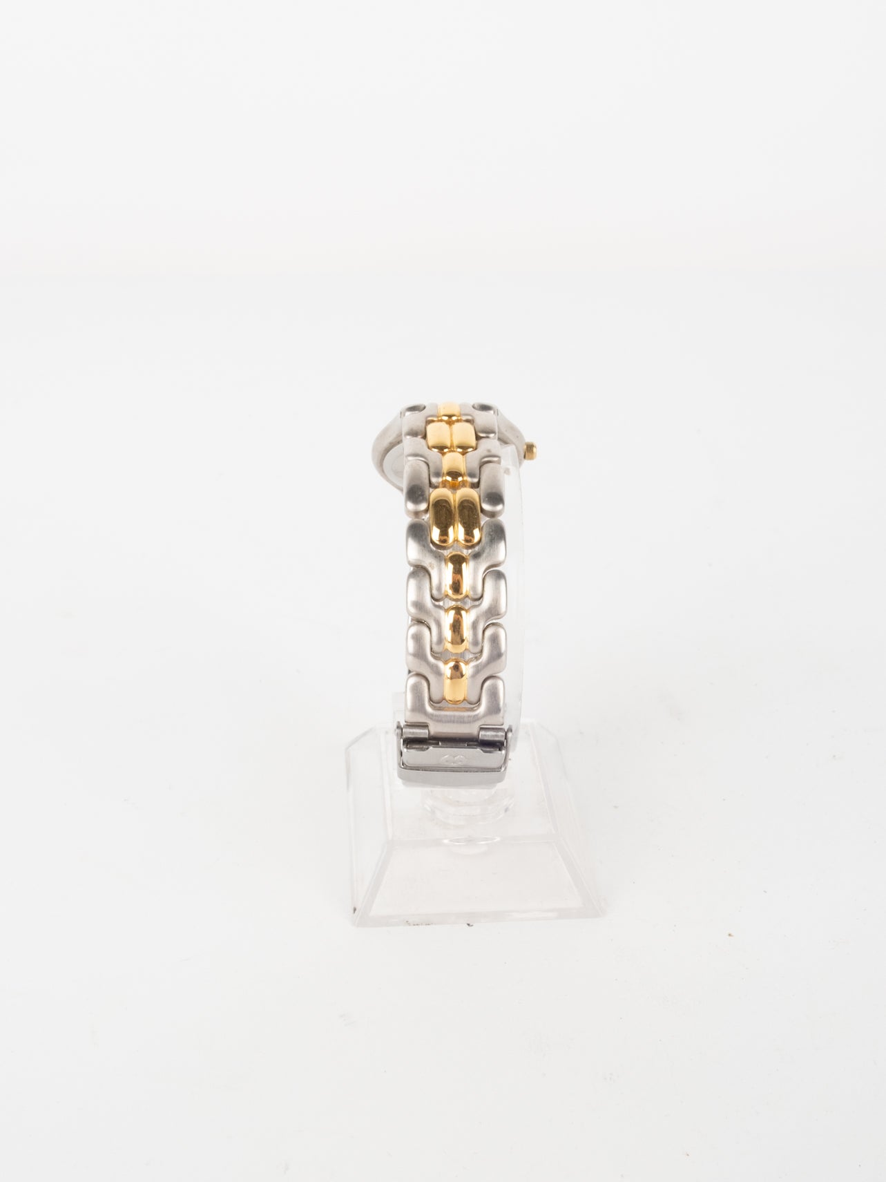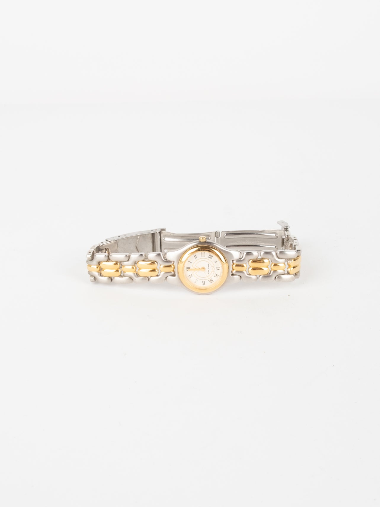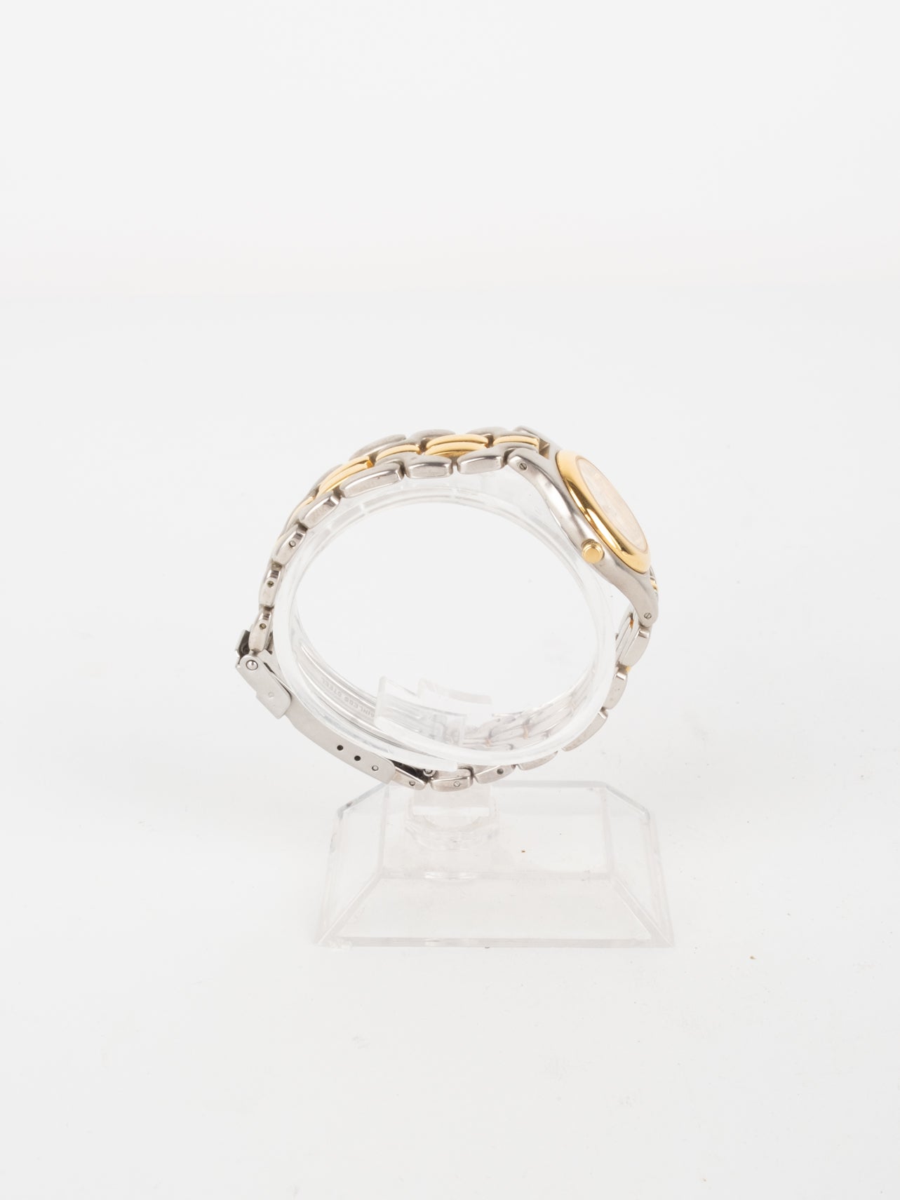 שעון מהמם בצבע כסף המשולב עם זהב בעל פני שעון בצורה עגולה עם רקע לבן ומחוגים שעון זה נסגר באמצעות סוגר ממותג.