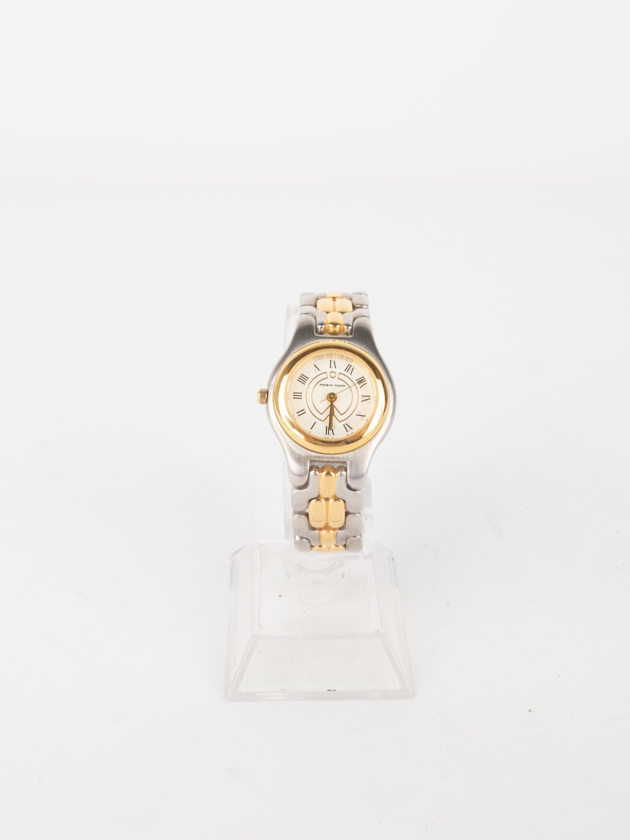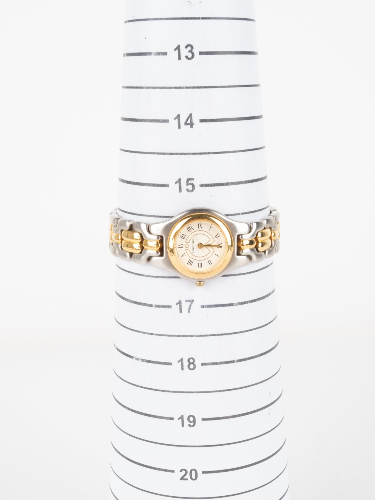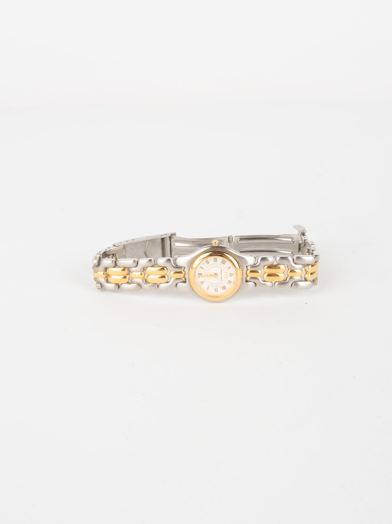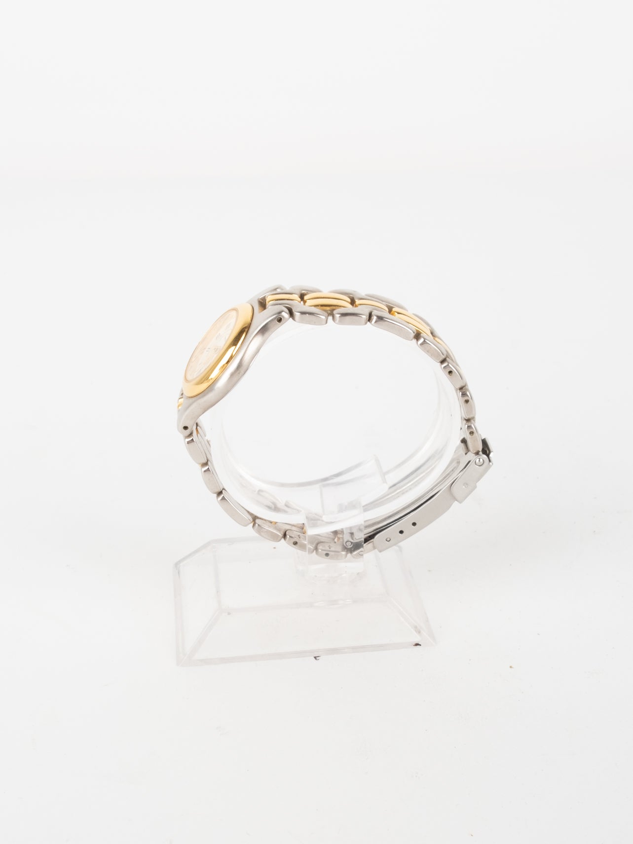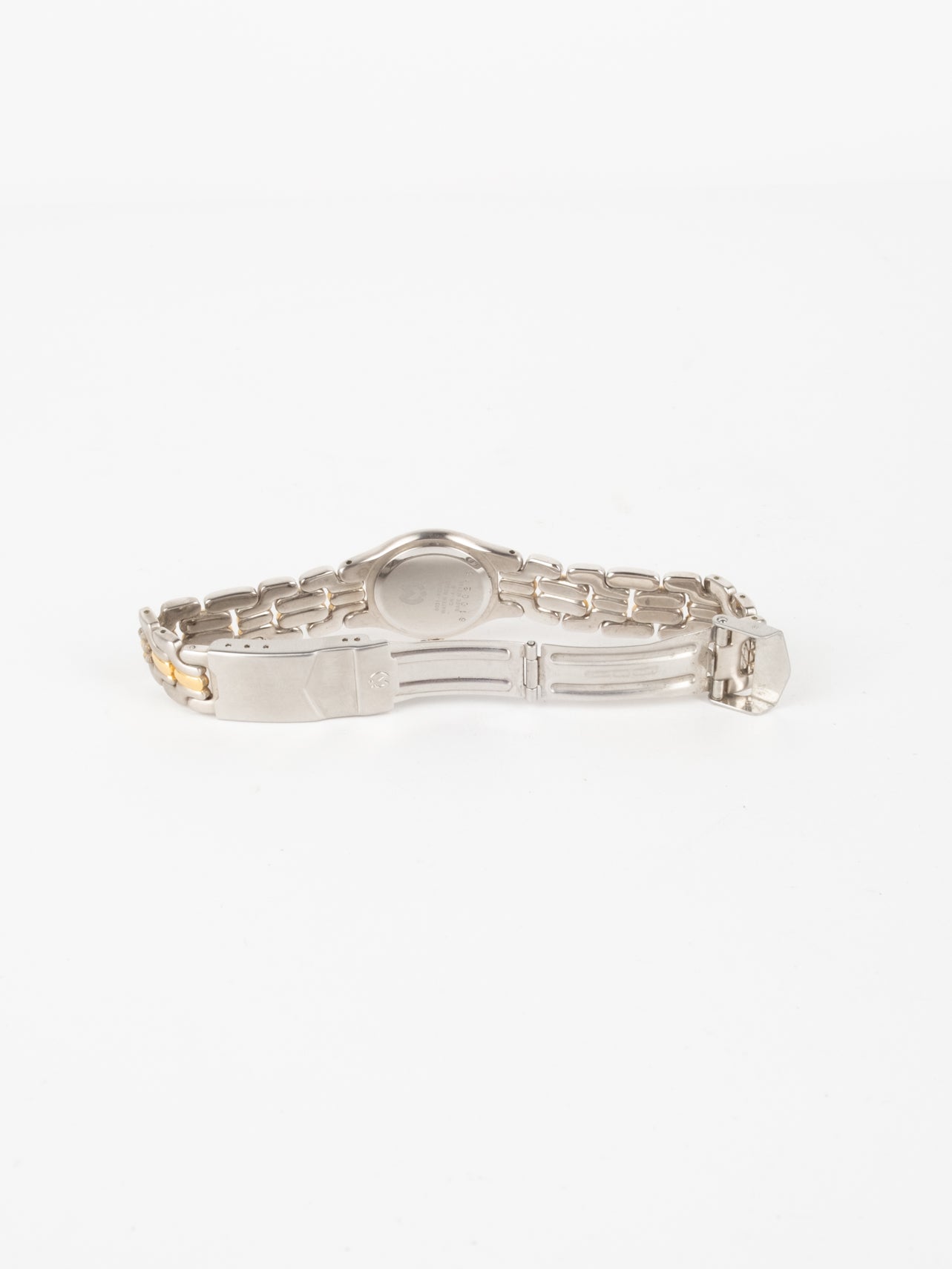 שעון מהמם בצבע כסף המשולב עם זהב בעל פני שעון בצורה עגולה עם רקע לבן ומחוגים שעון זה נסגר באמצעות סוגר ממותג.