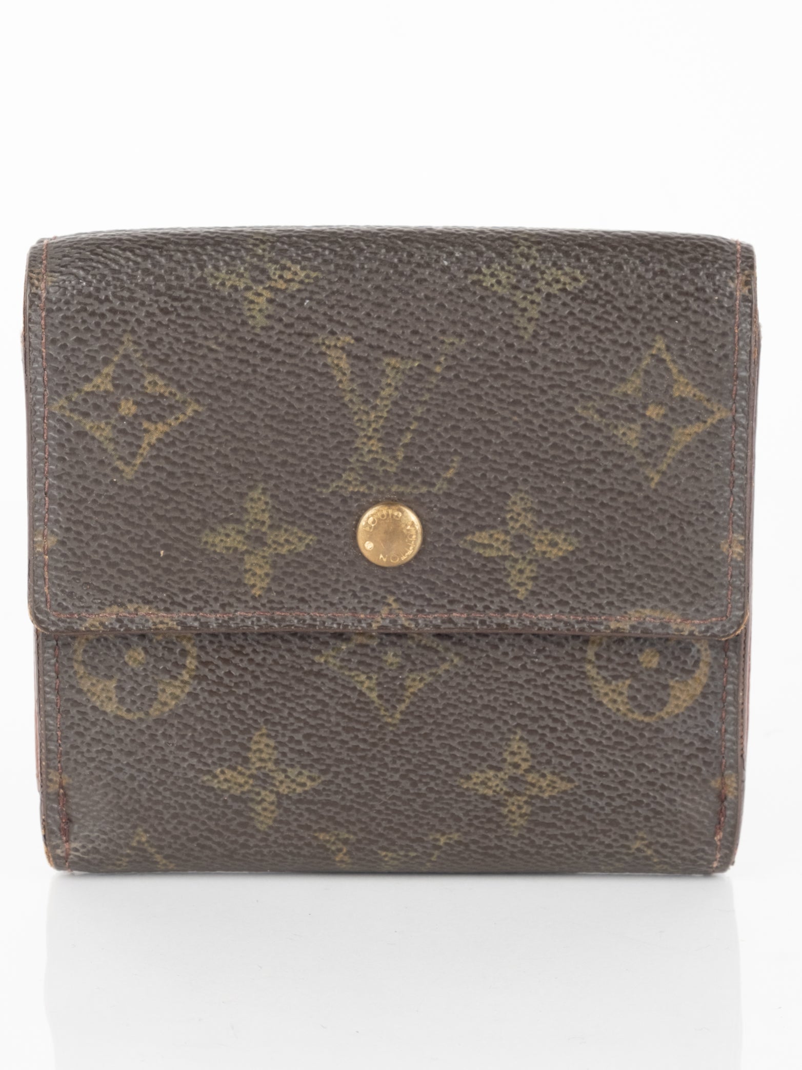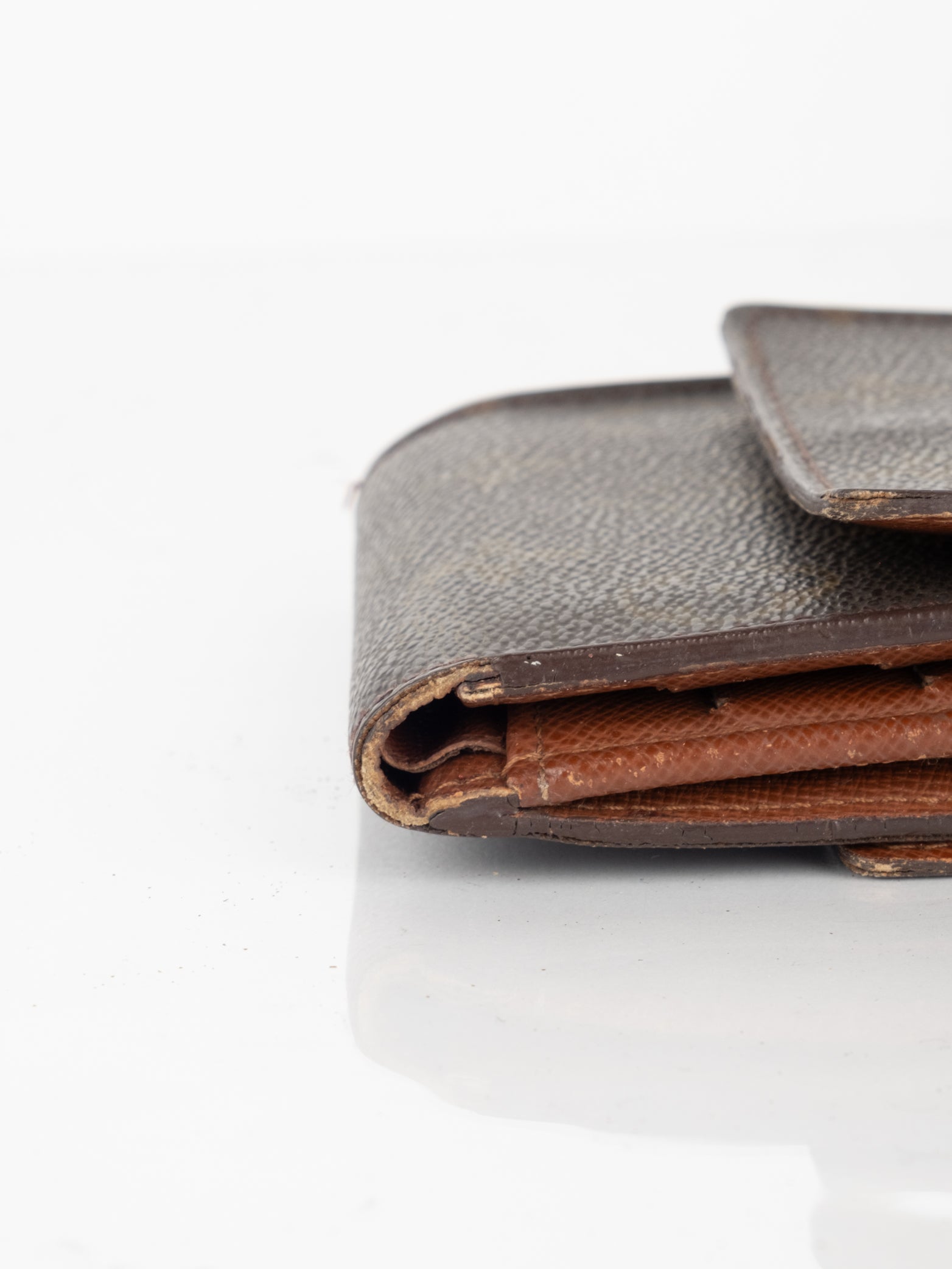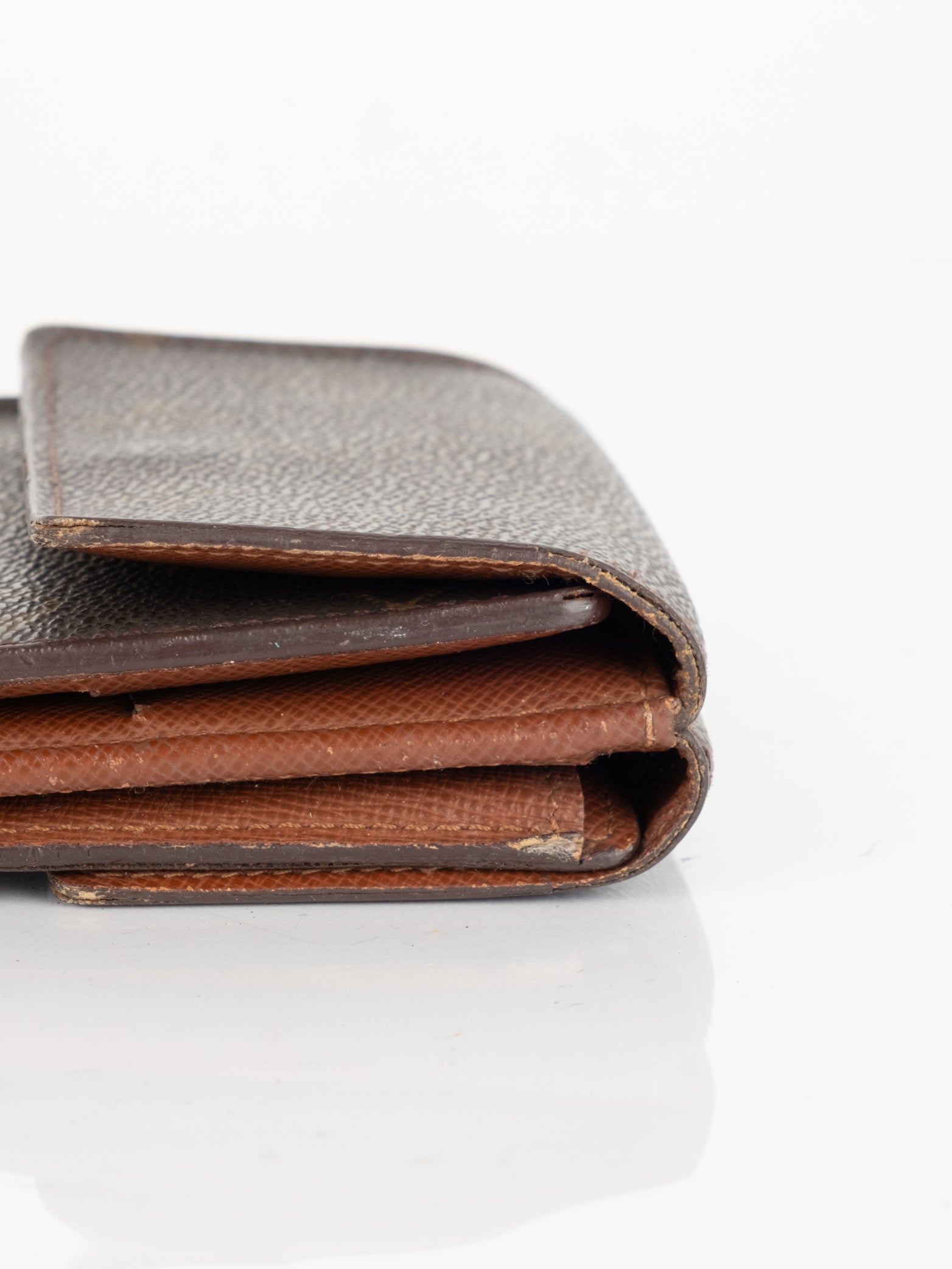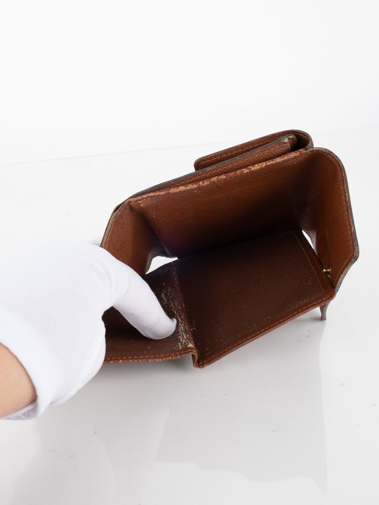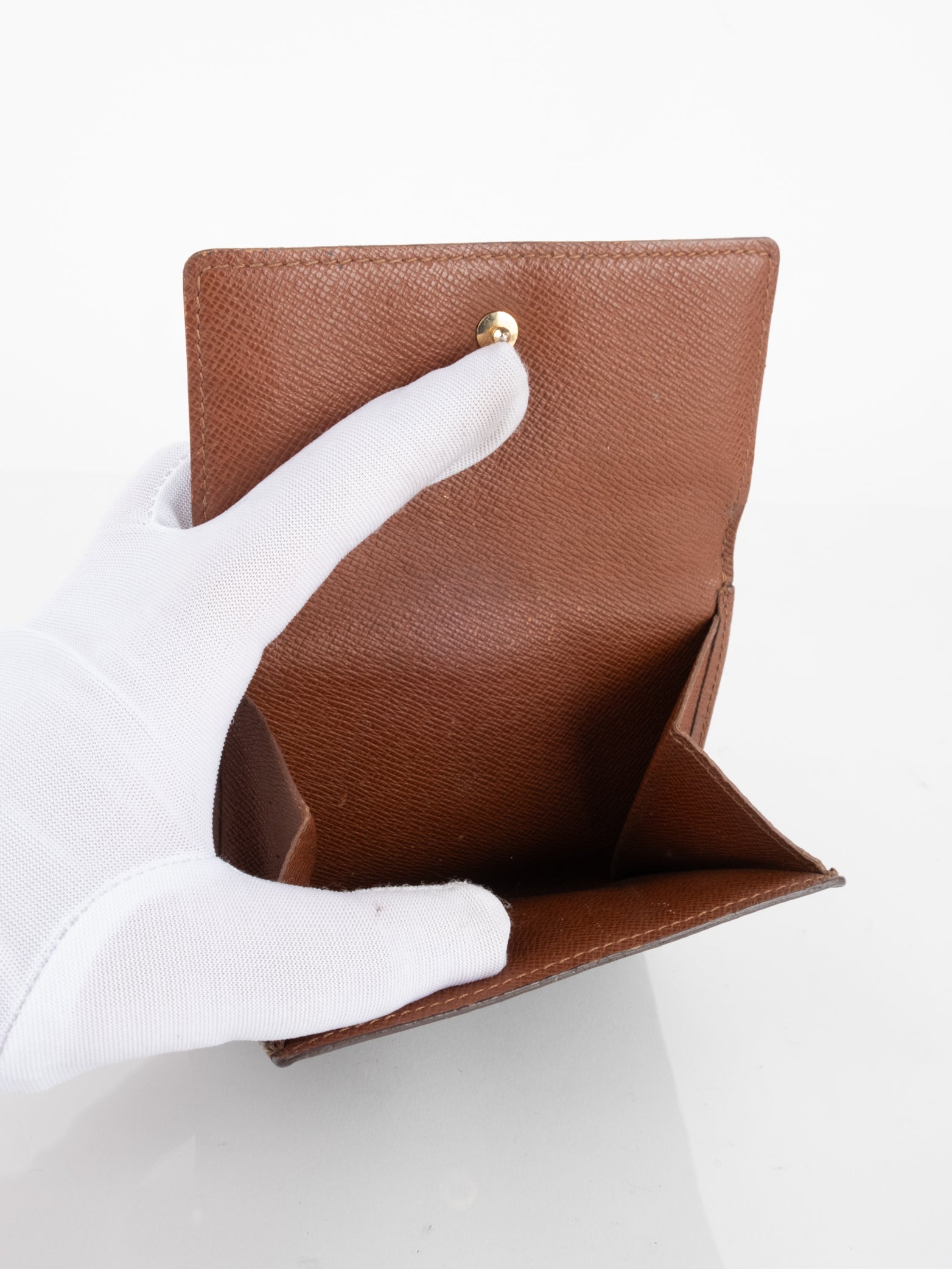 ארנק העשוי מקנבס בהדפס המונוגרמי המוכר של המותג בצרפתי הנסגר באמצעות כפתורי תיק-תק מוזהבים. ארנק זה מיועד למטבעות, כרטיסים ושטרות.