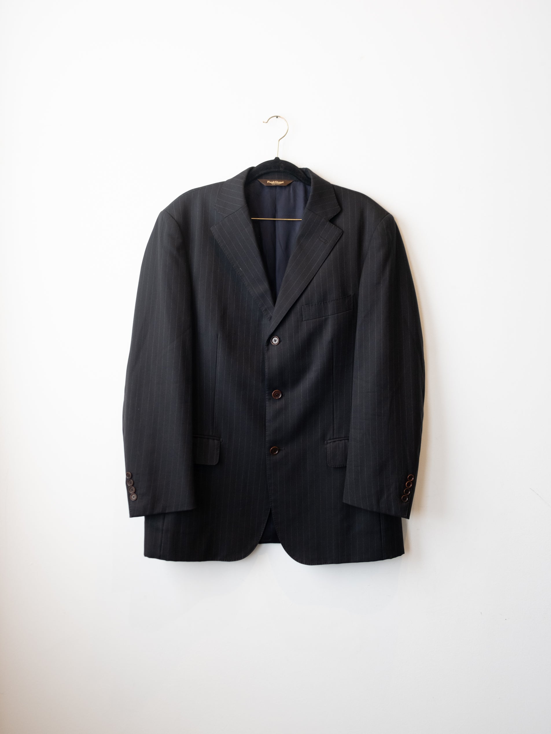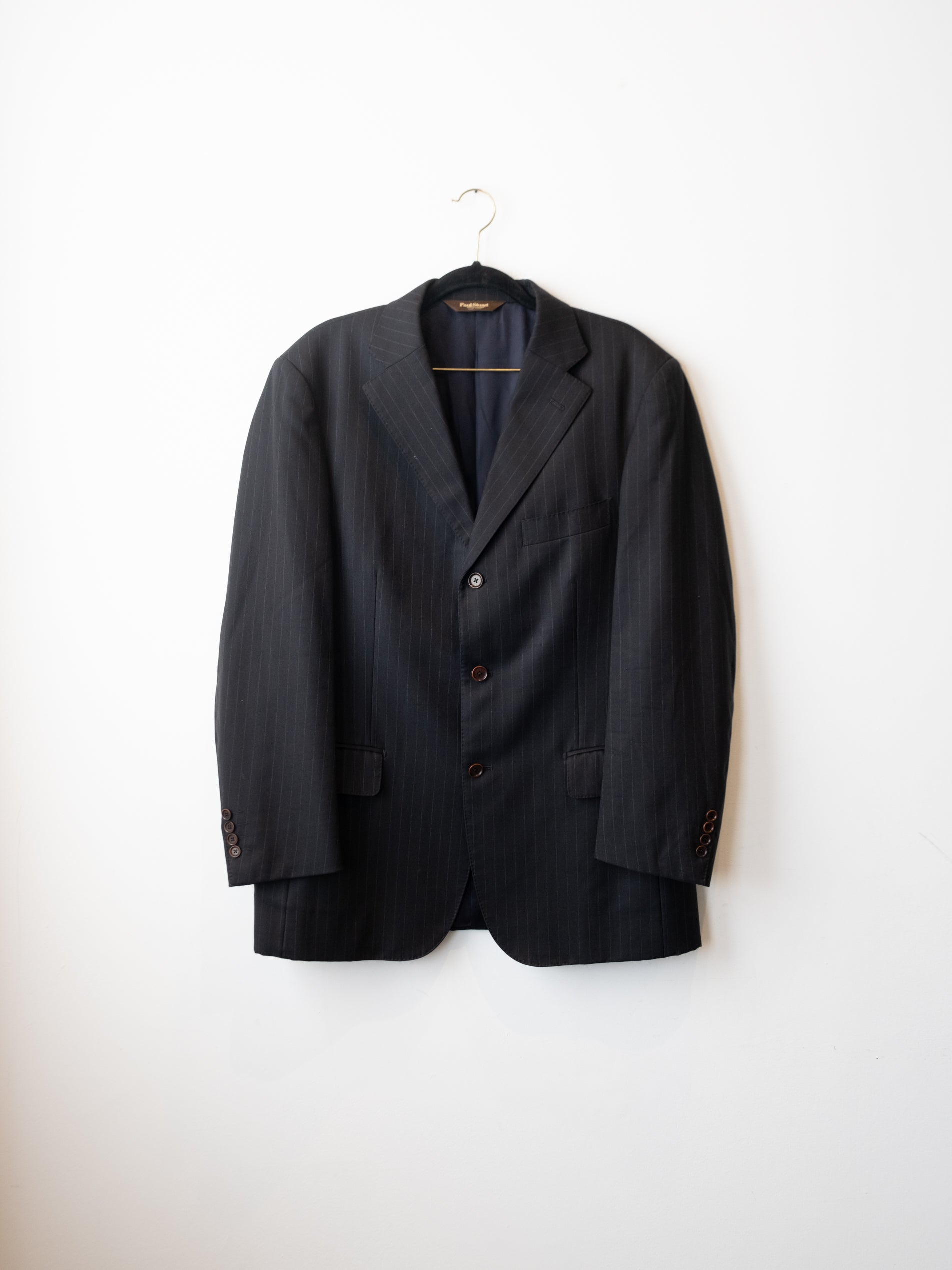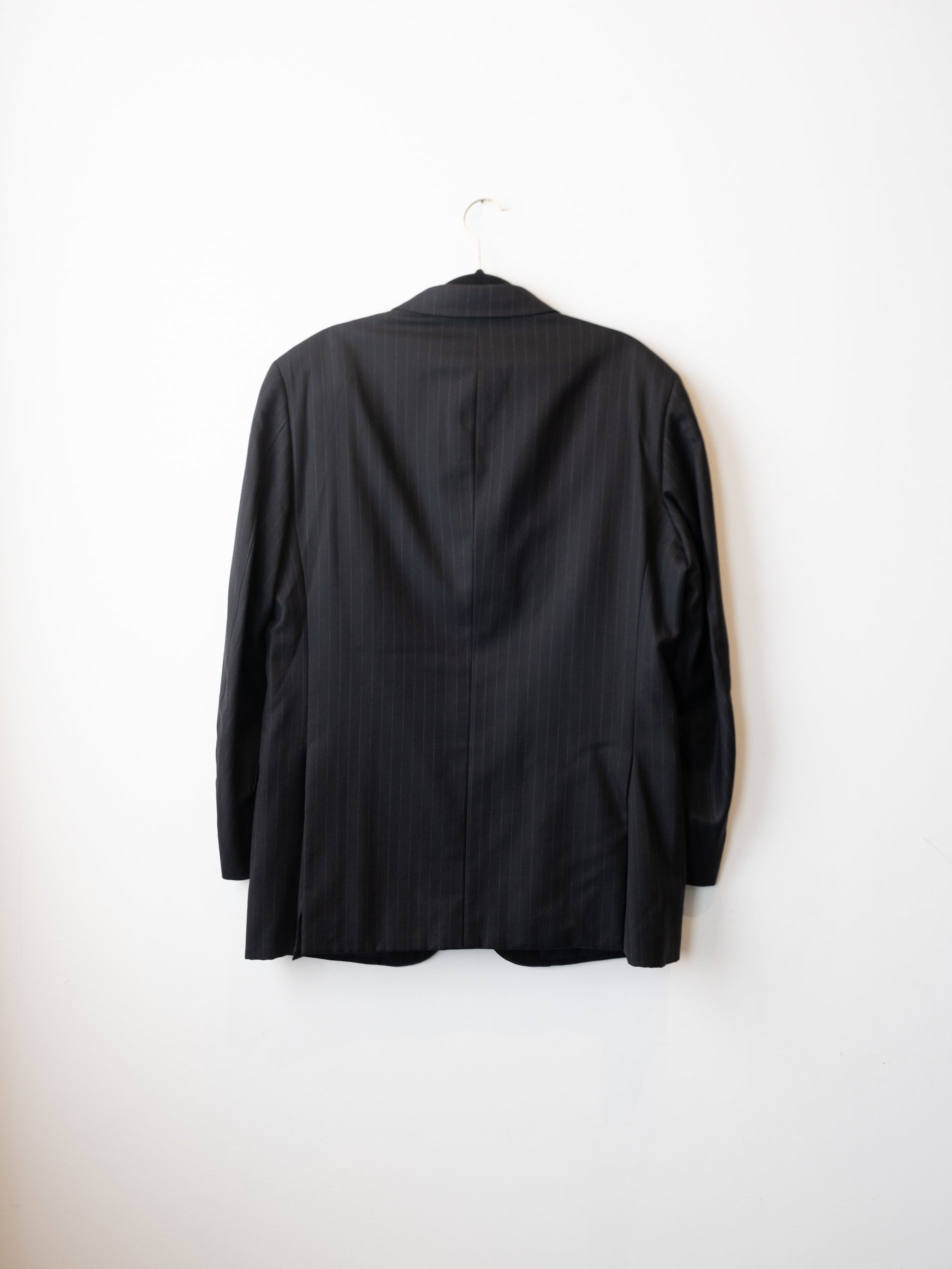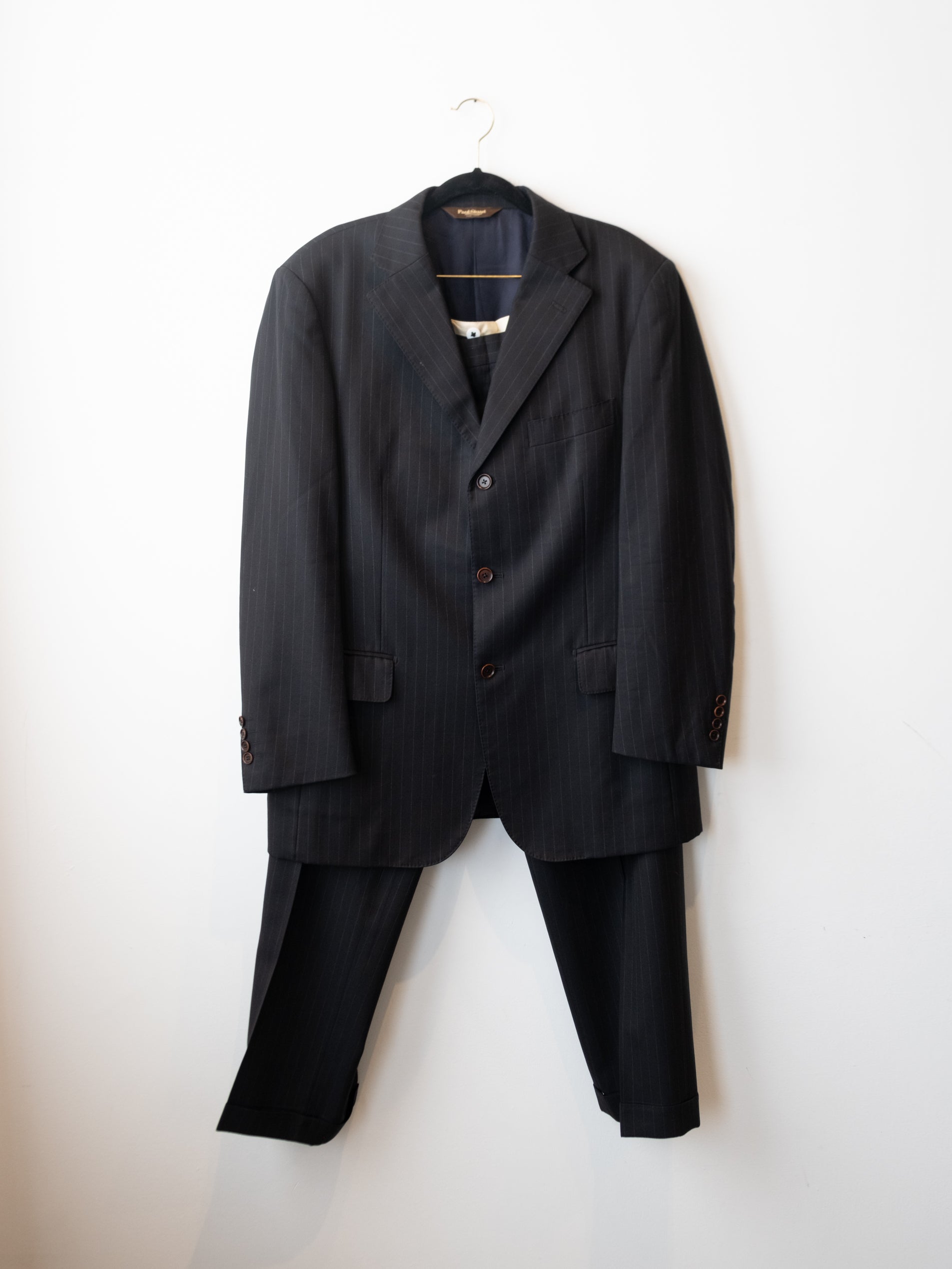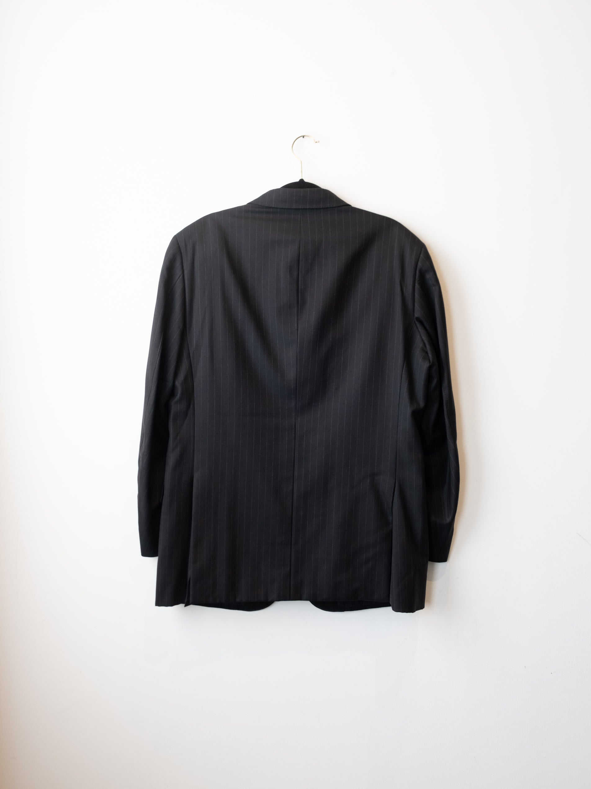 חליפה שני חלקים של בלייזר מחויט עם כפתיים מרופדות ומכנסיים מחויטים בצבע אפור פסים.