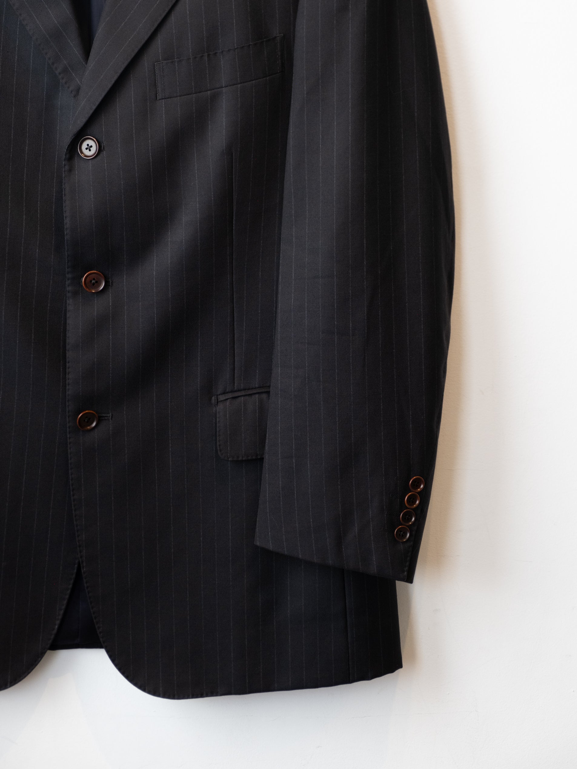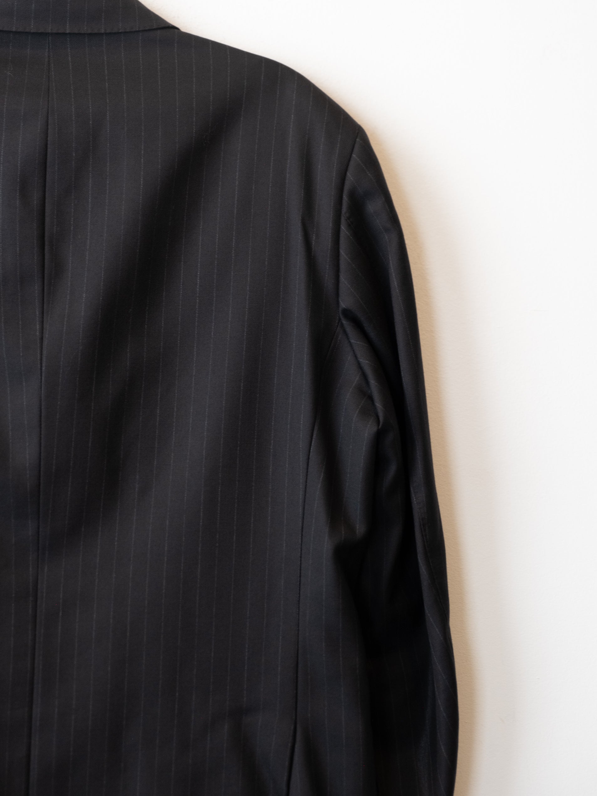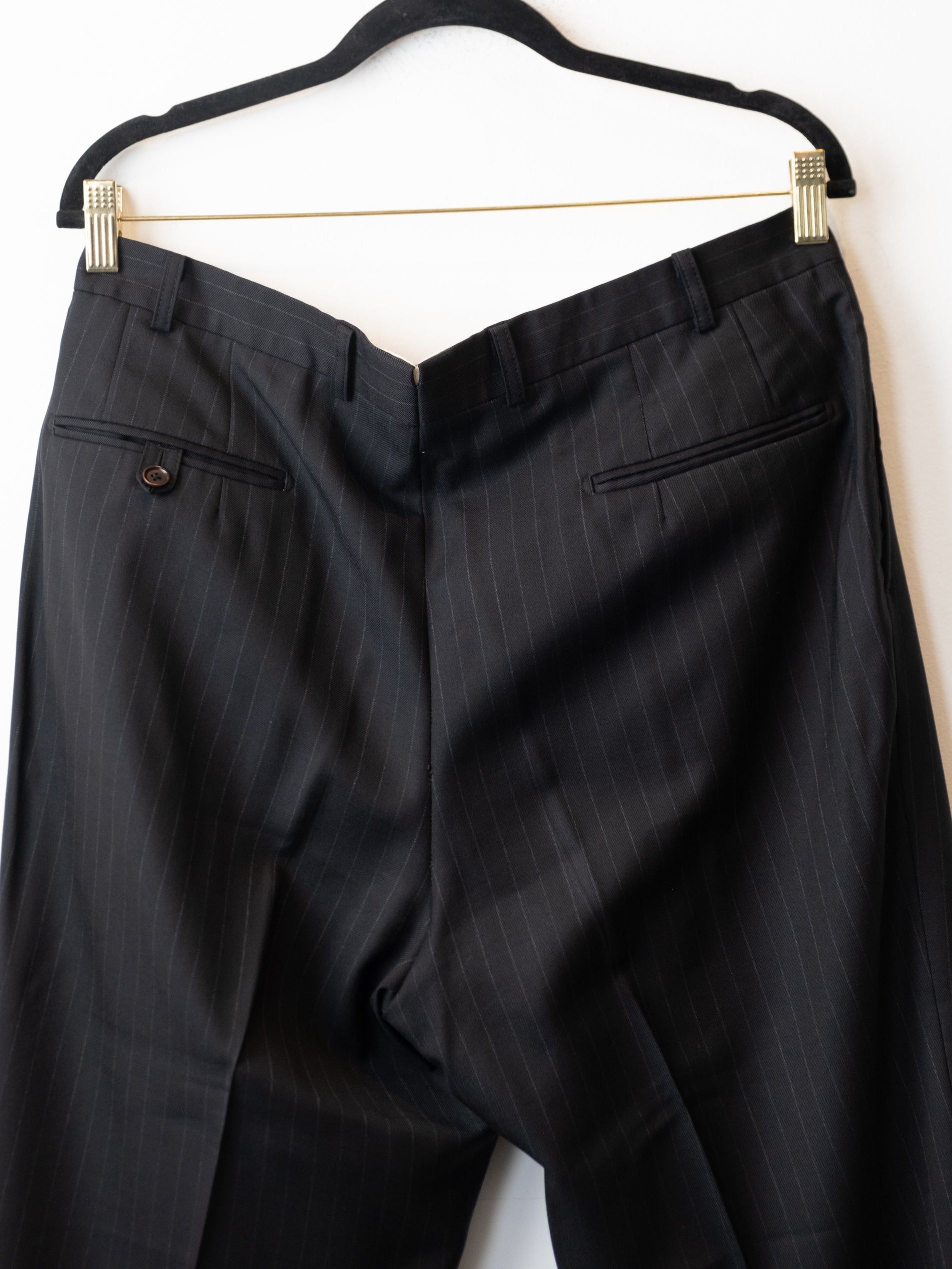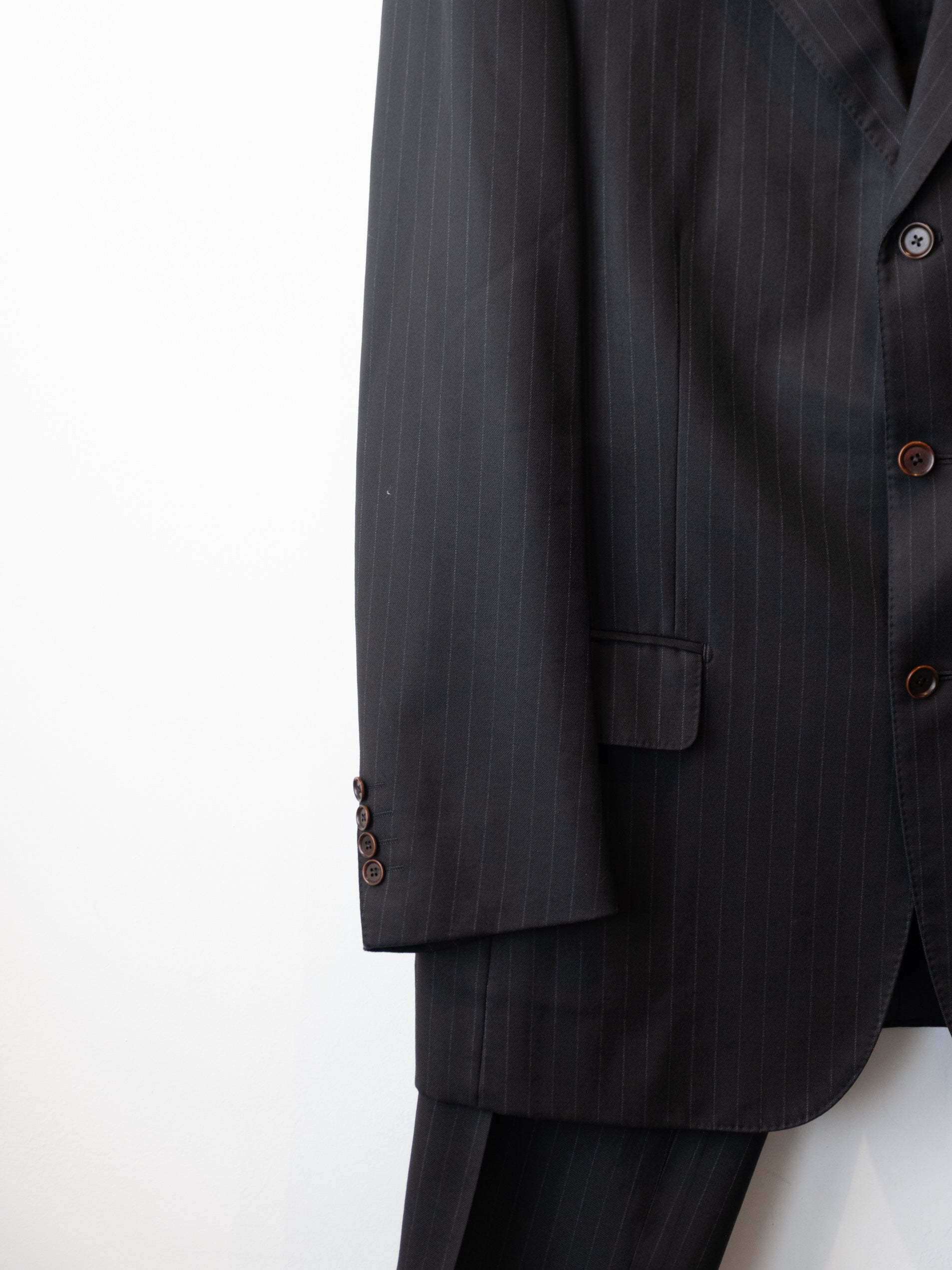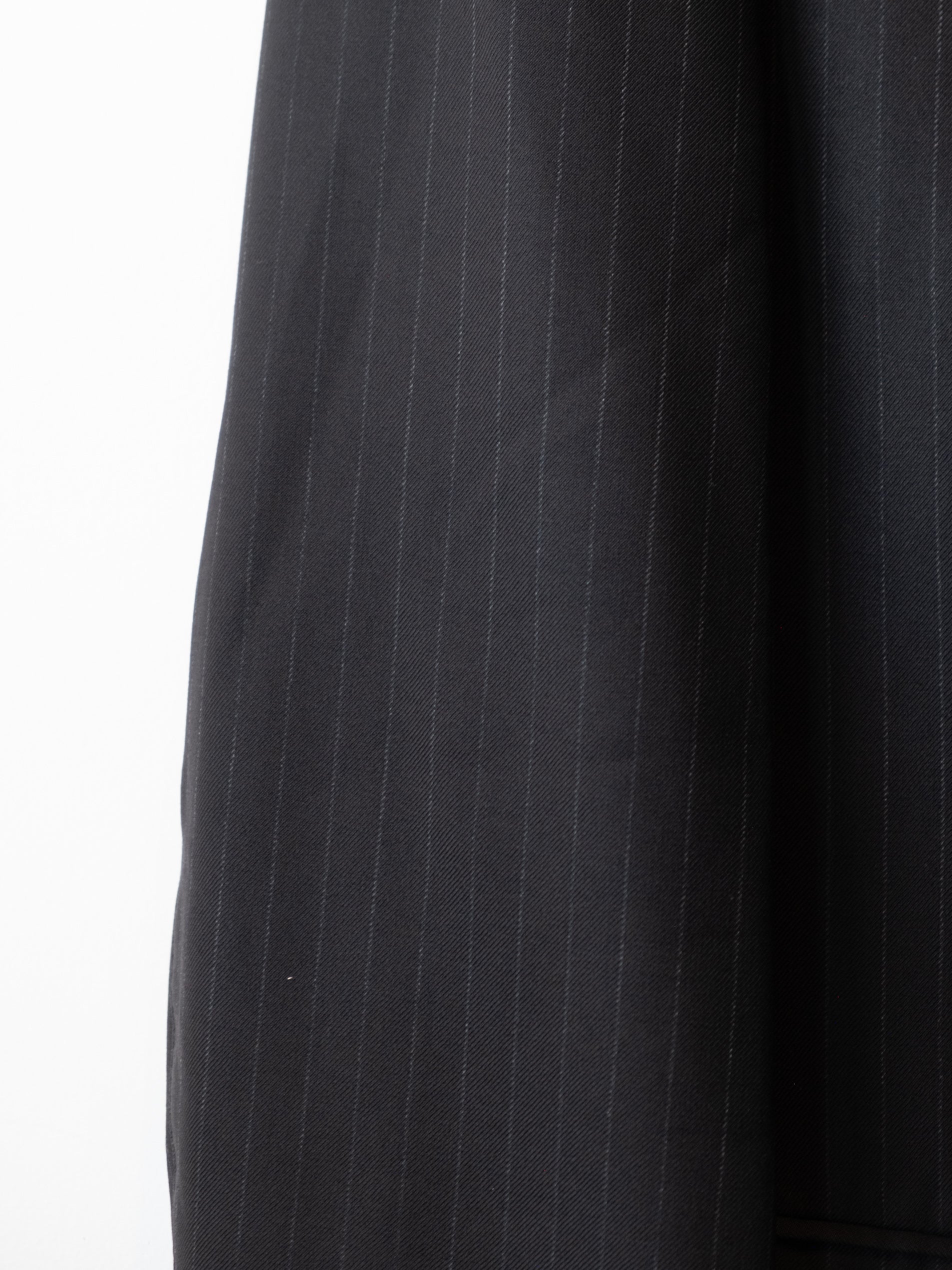 חליפה שני חלקים של בלייזר מחויט עם כפתיים מרופדות ומכנסיים מחויטים בצבע אפור פסים.