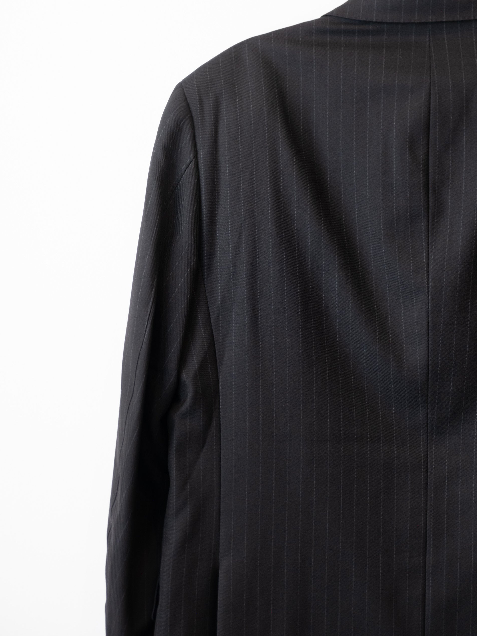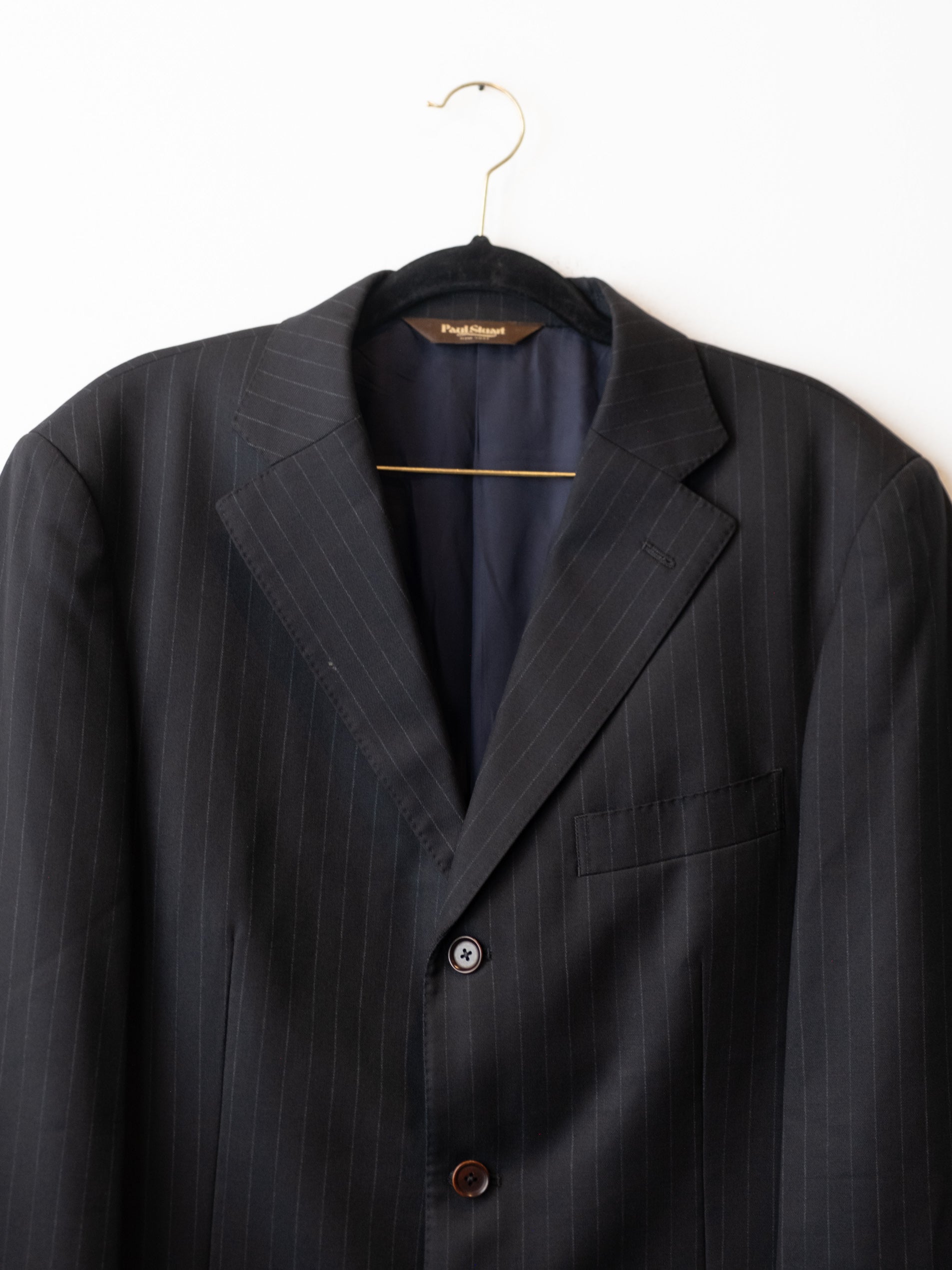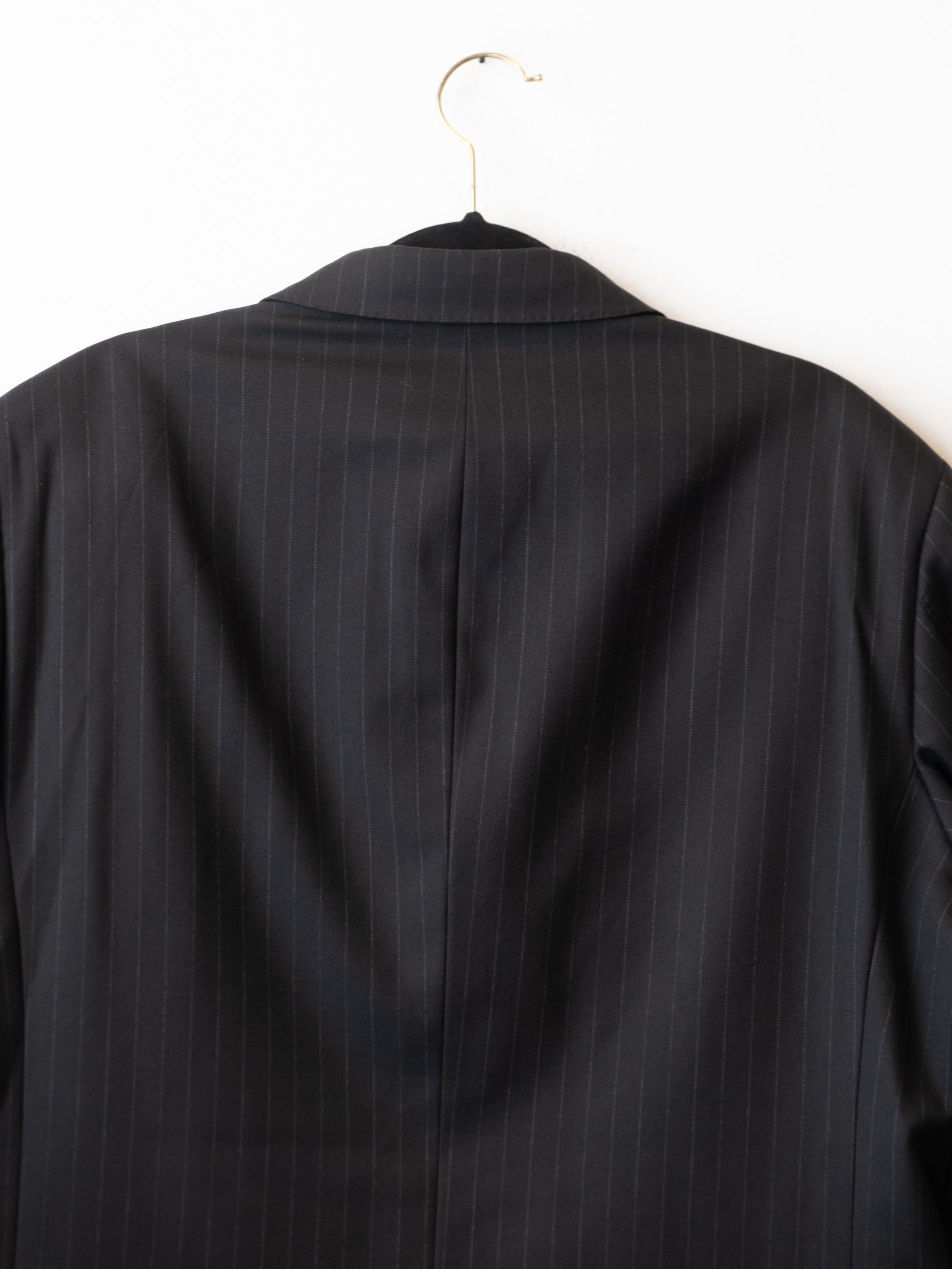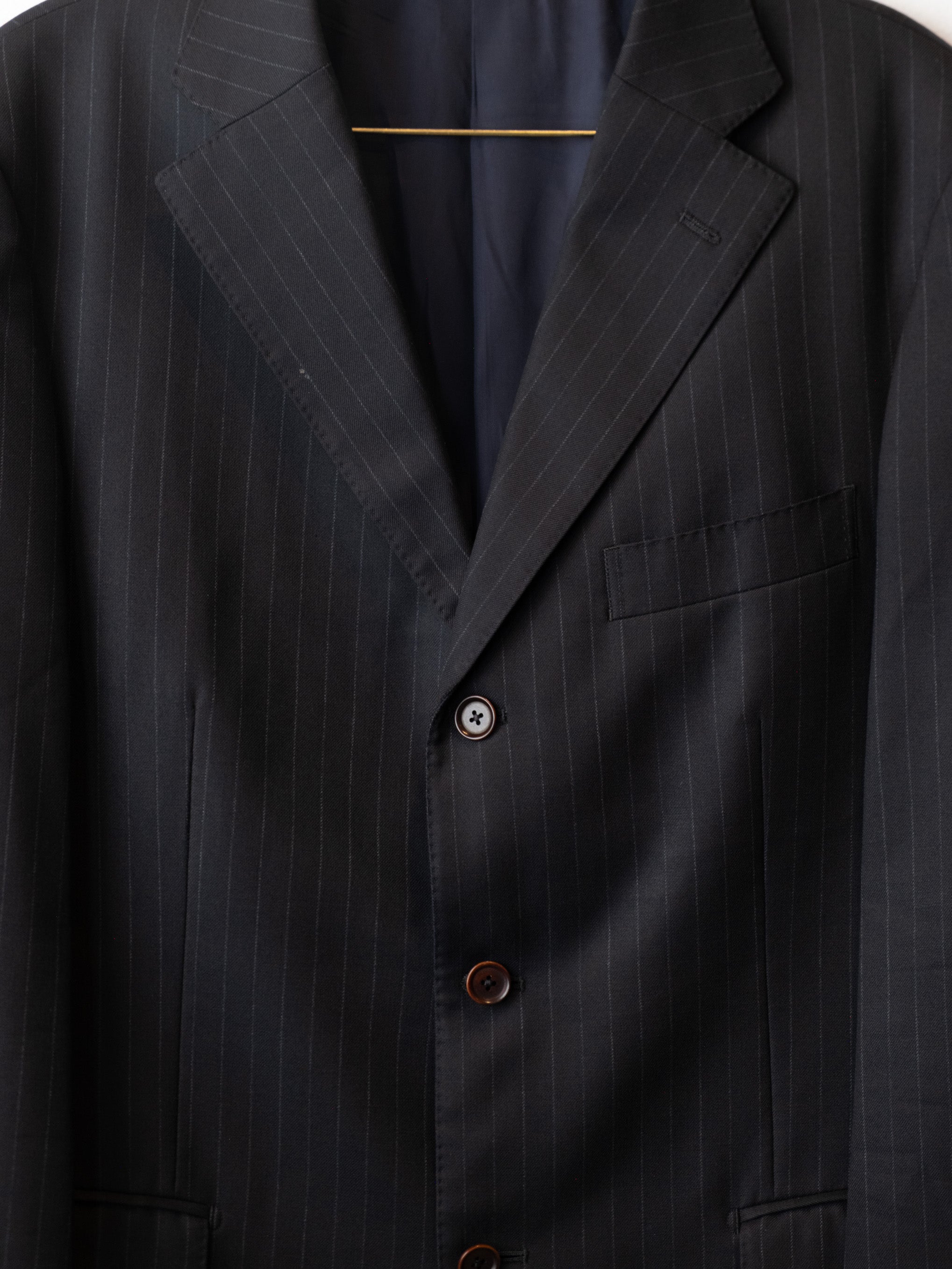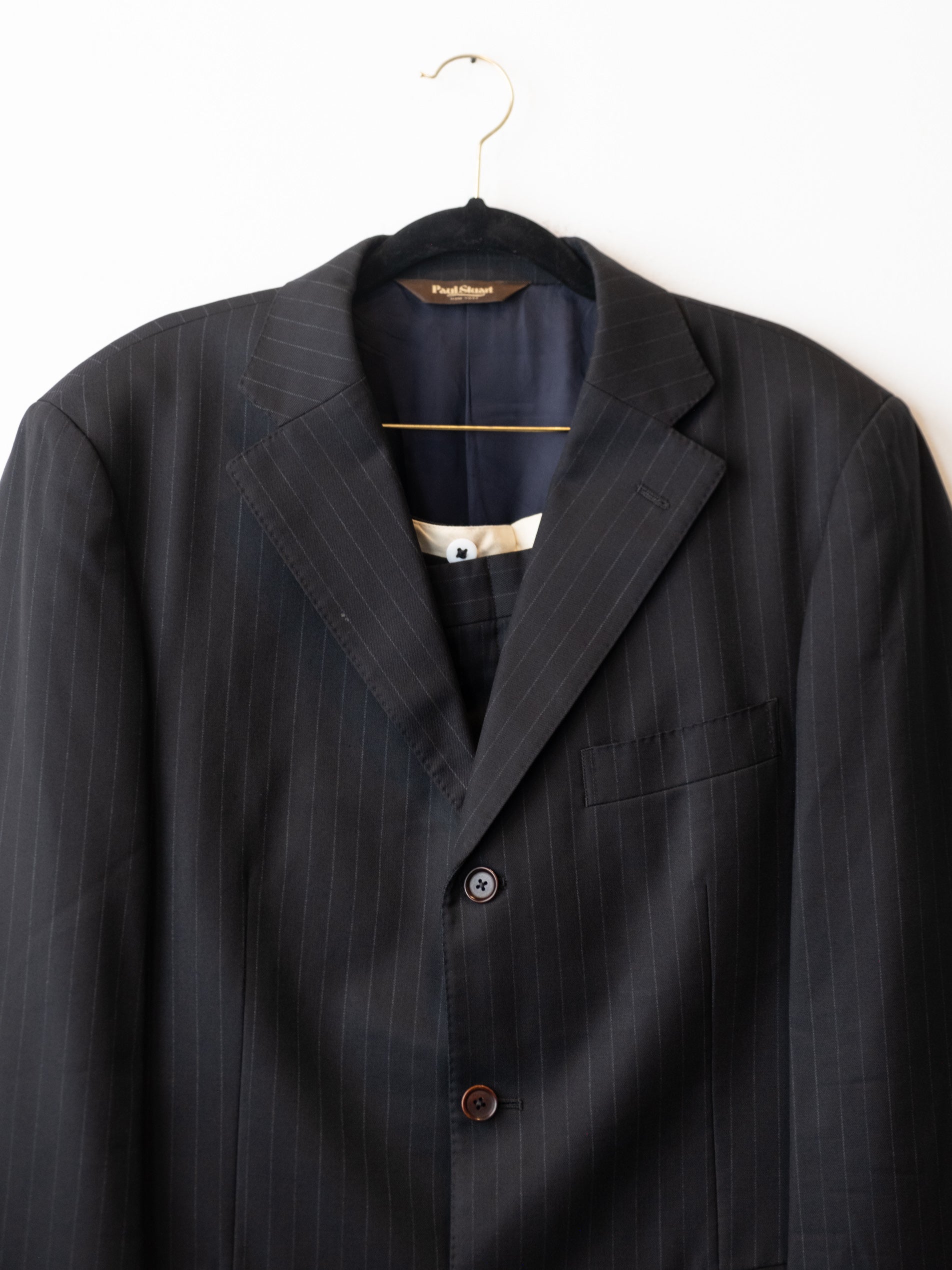 חליפה שני חלקים של בלייזר מחויט עם כפתיים מרופדות ומכנסיים מחויטים בצבע אפור פסים.