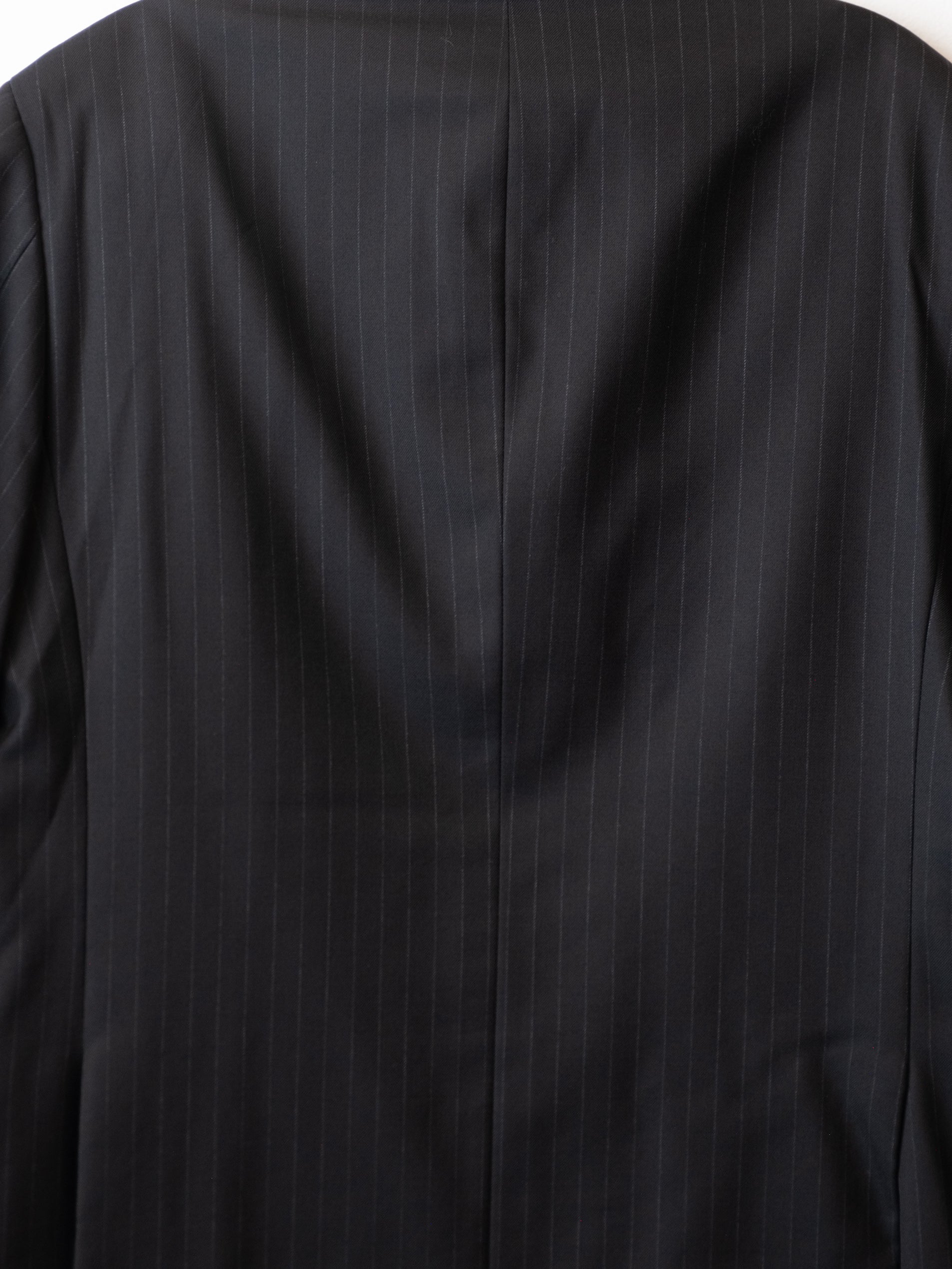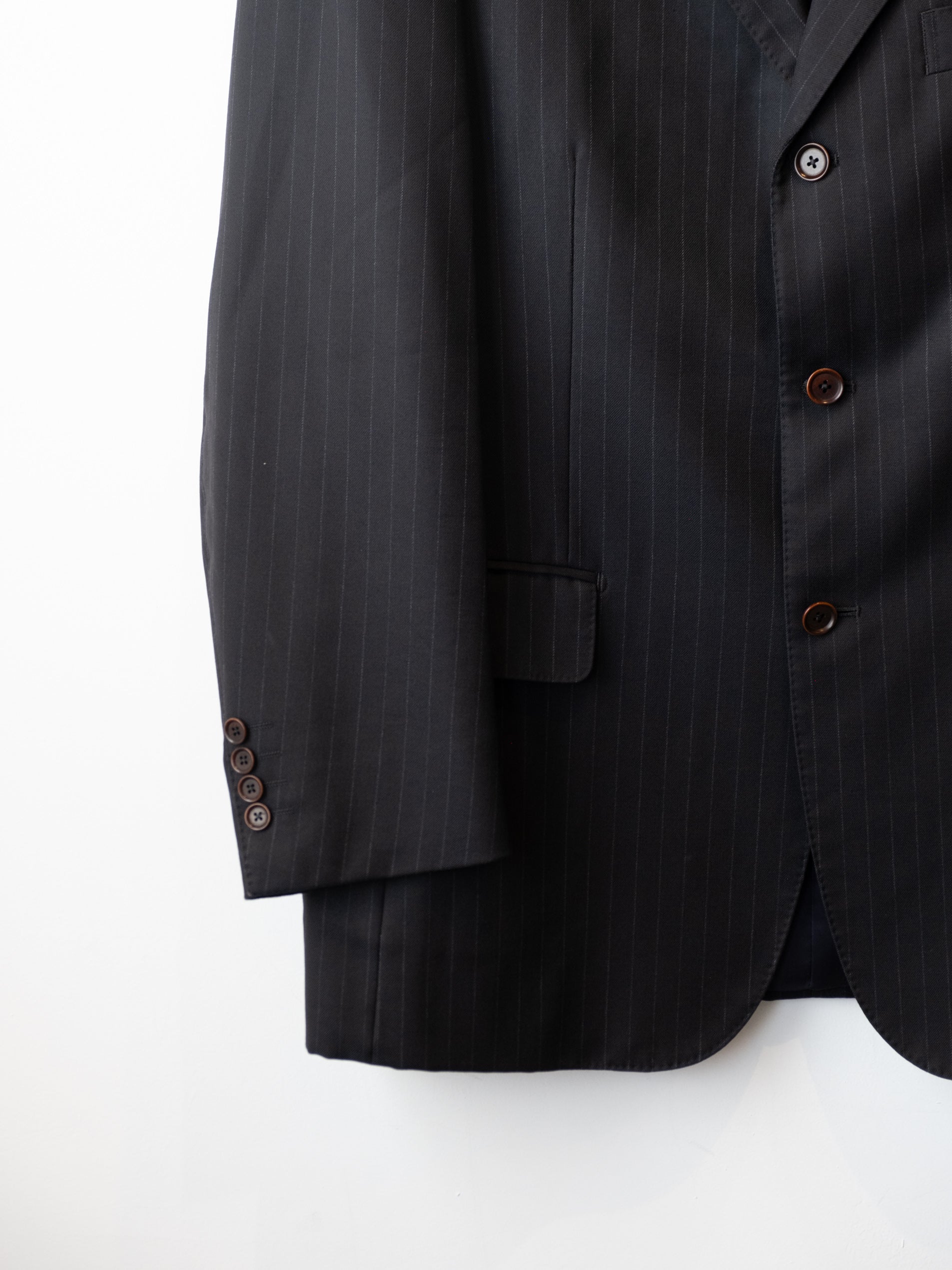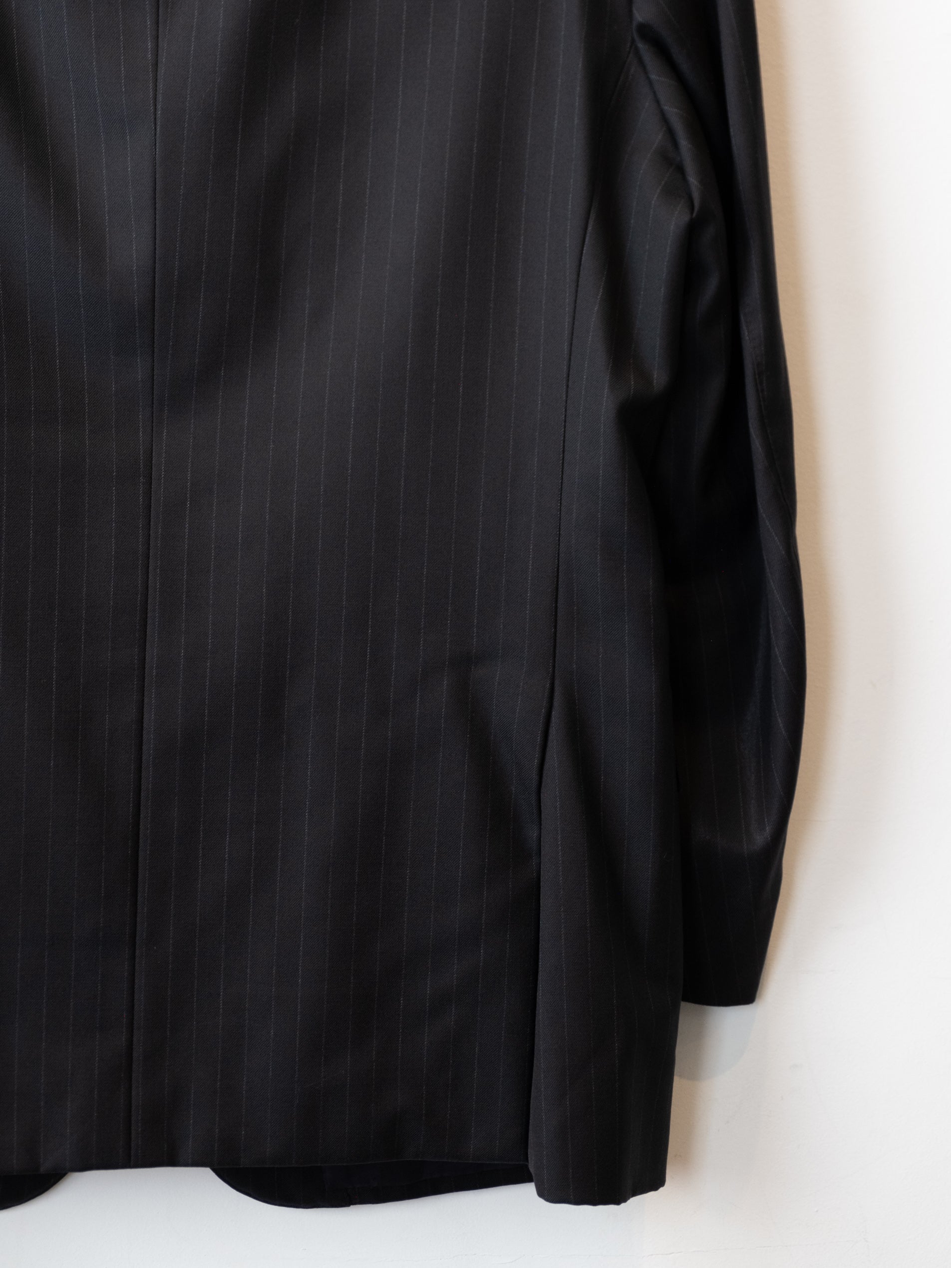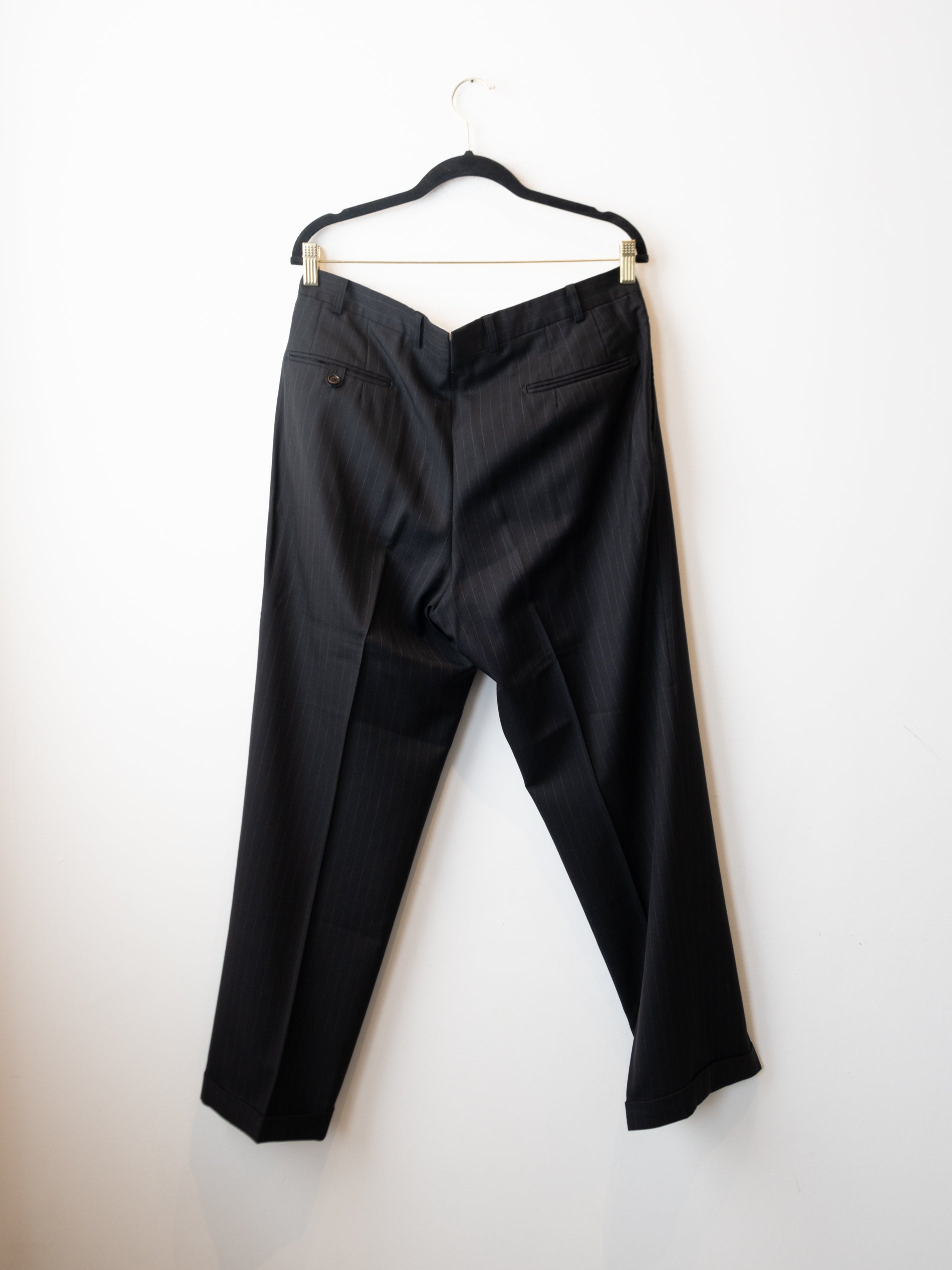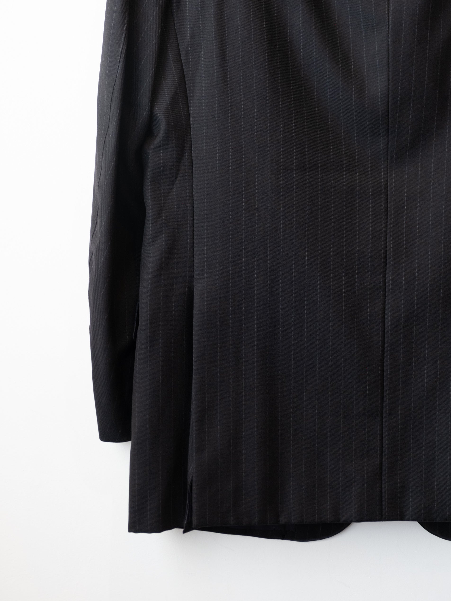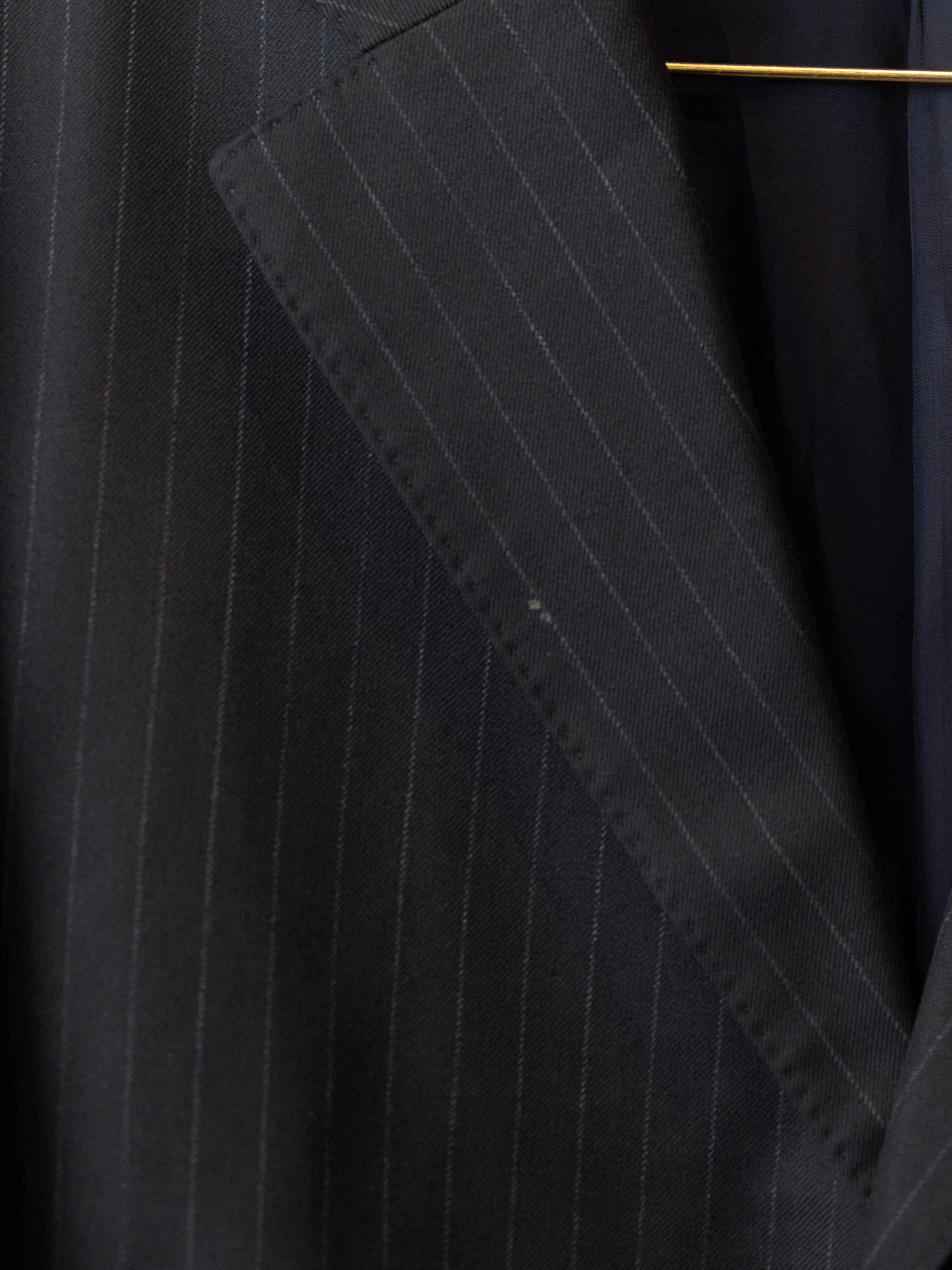 חליפה שני חלקים של בלייזר מחויט עם כפתיים מרופדות ומכנסיים מחויטים בצבע אפור פסים.