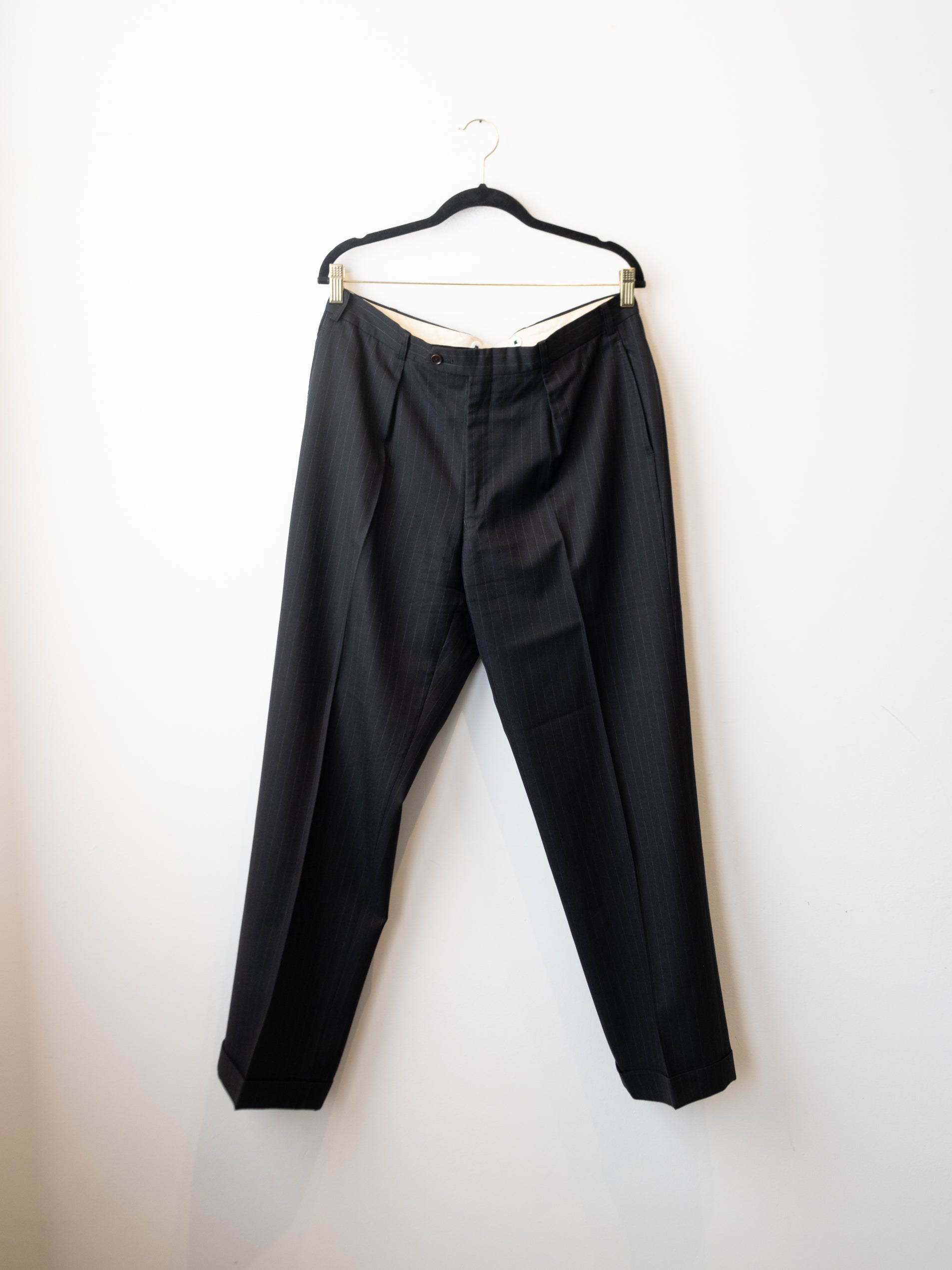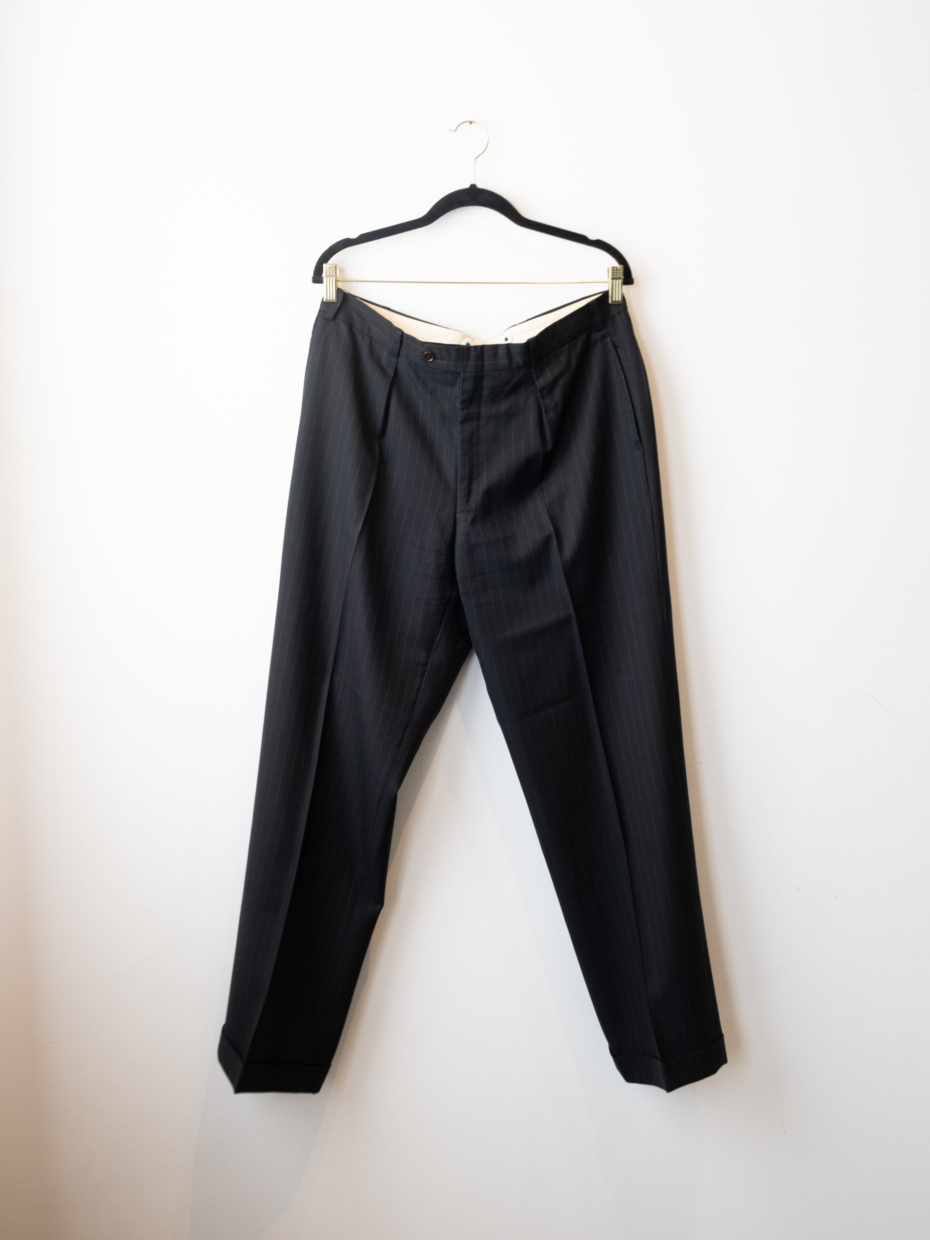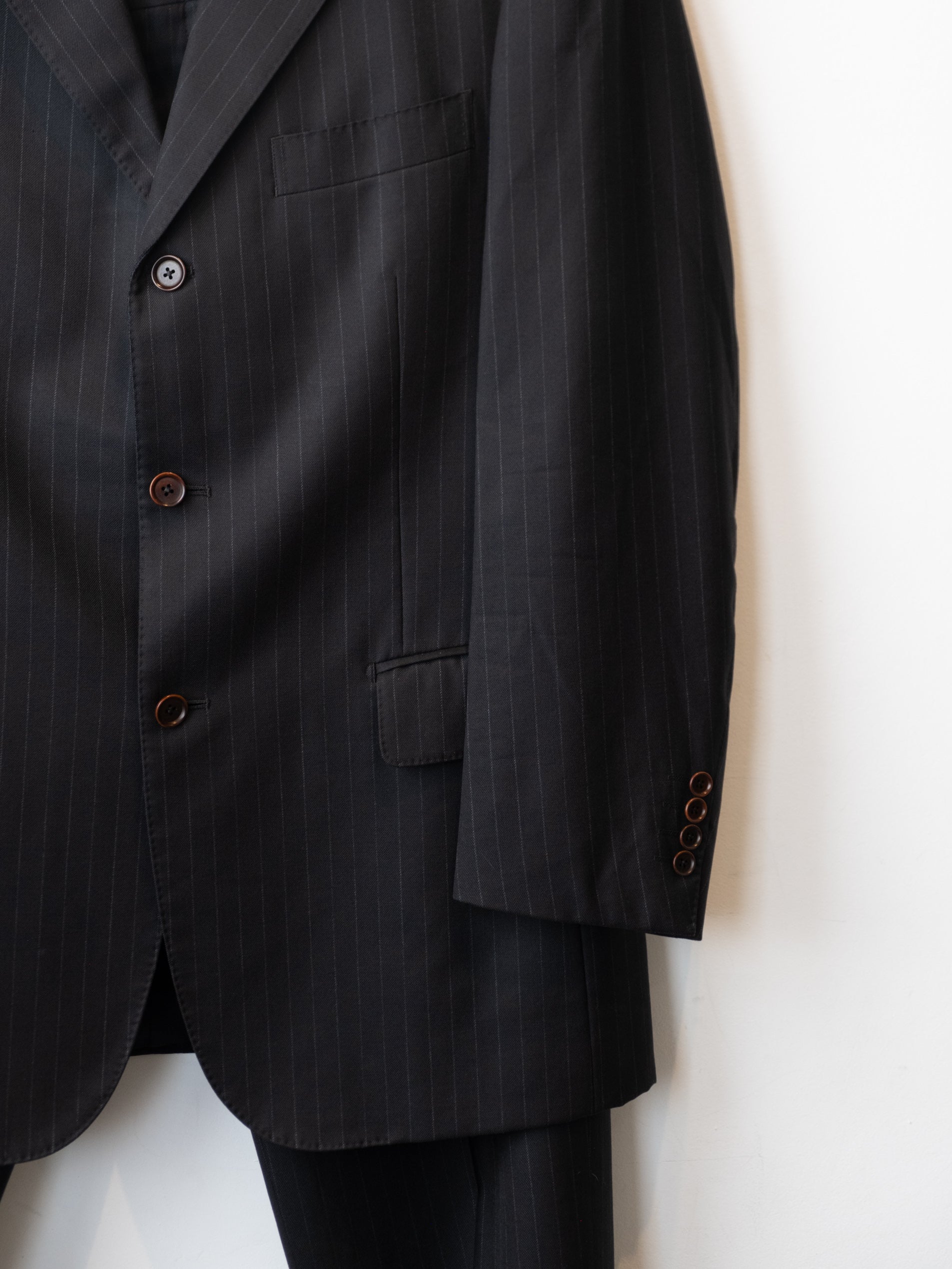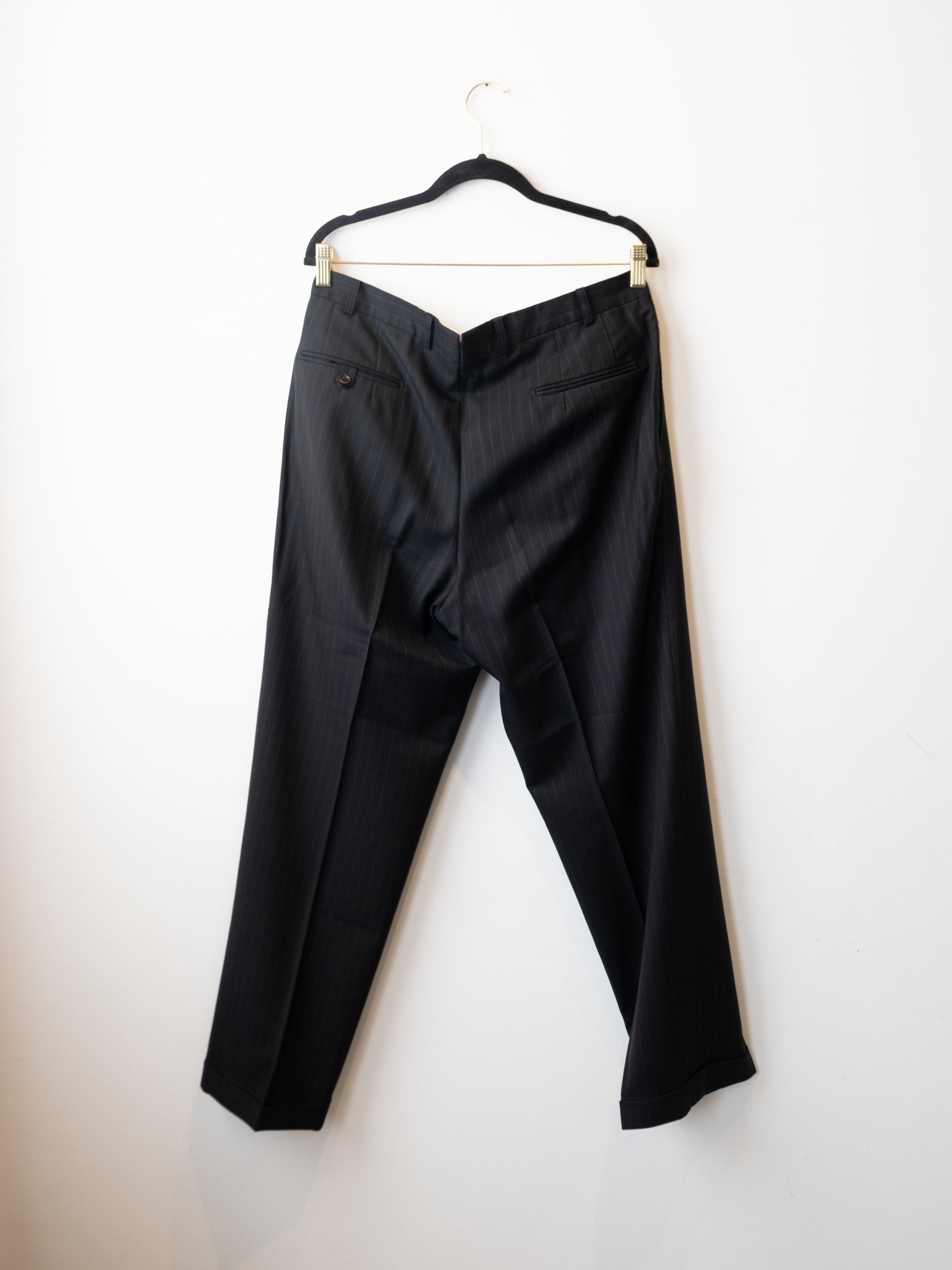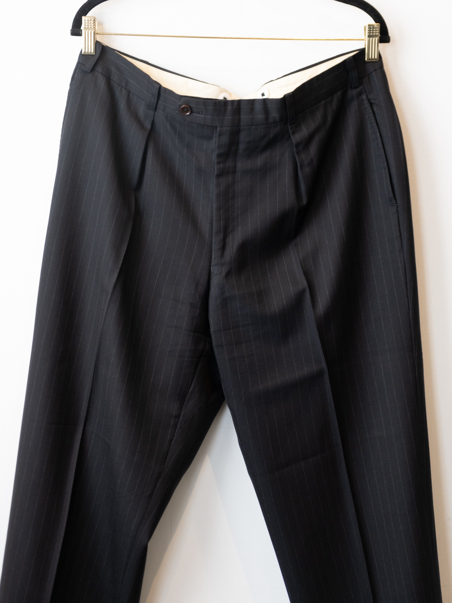 חליפה שני חלקים של בלייזר מחויט עם כפתיים מרופדות ומכנסיים מחויטים בצבע אפור פסים.