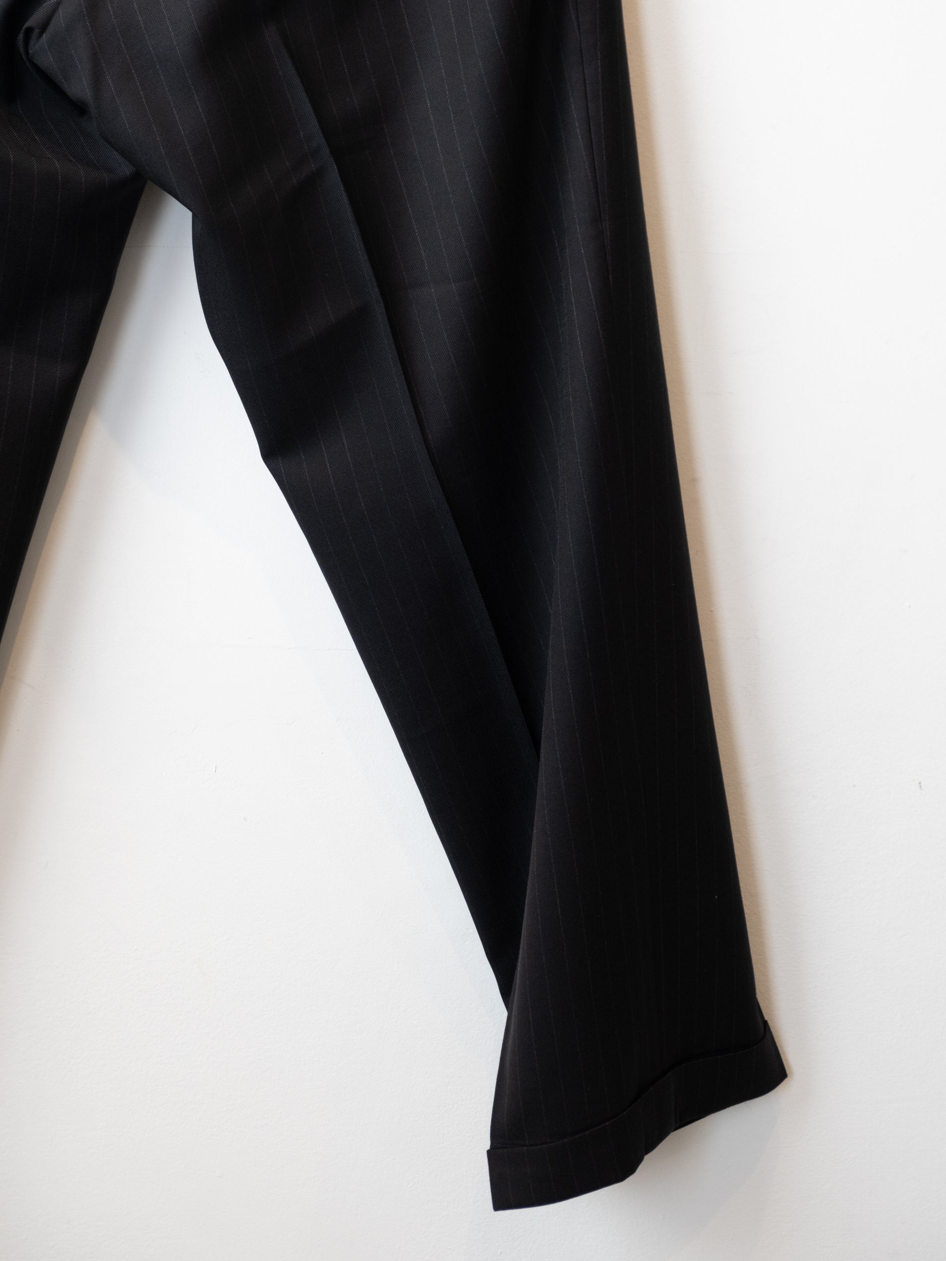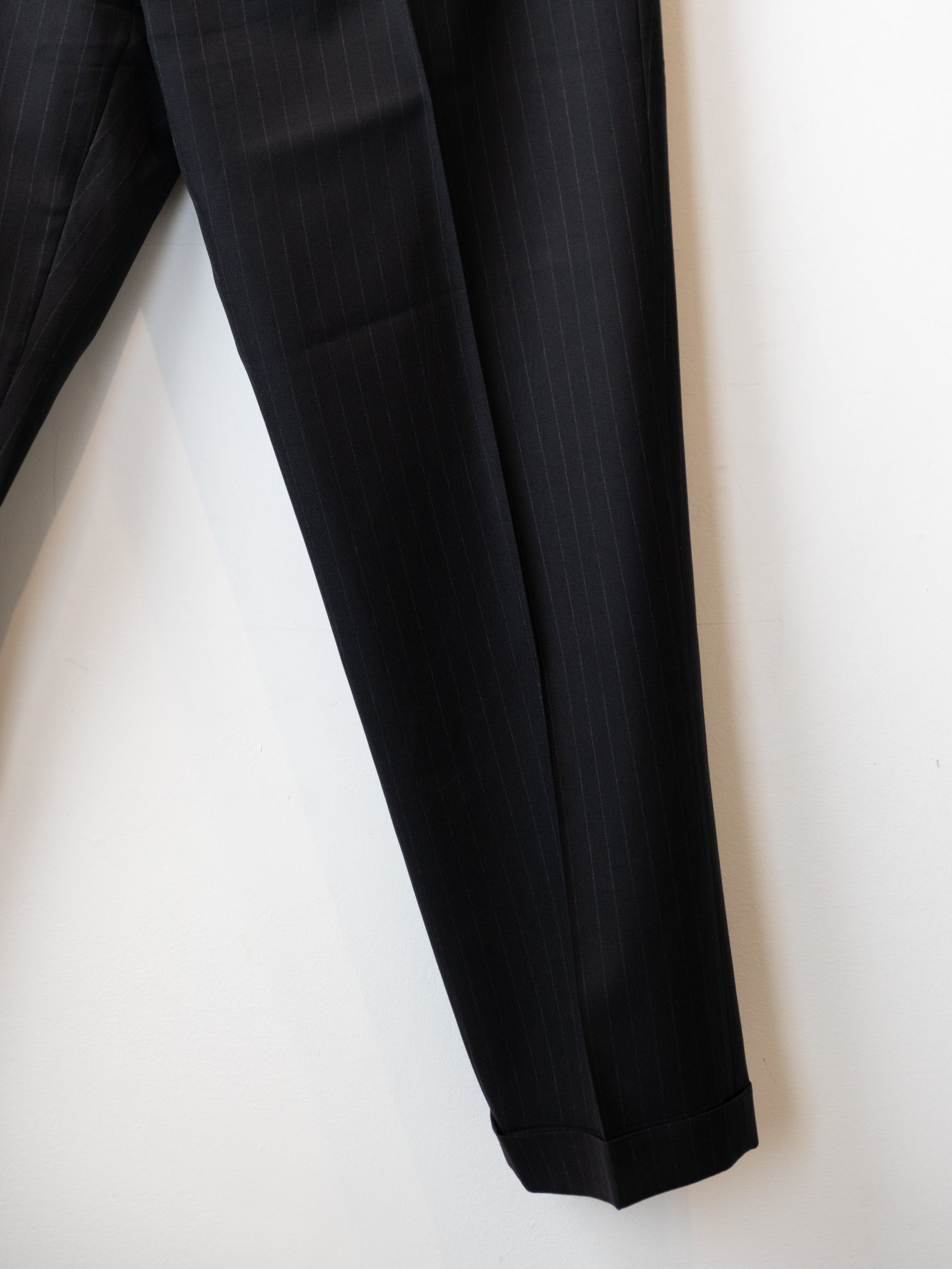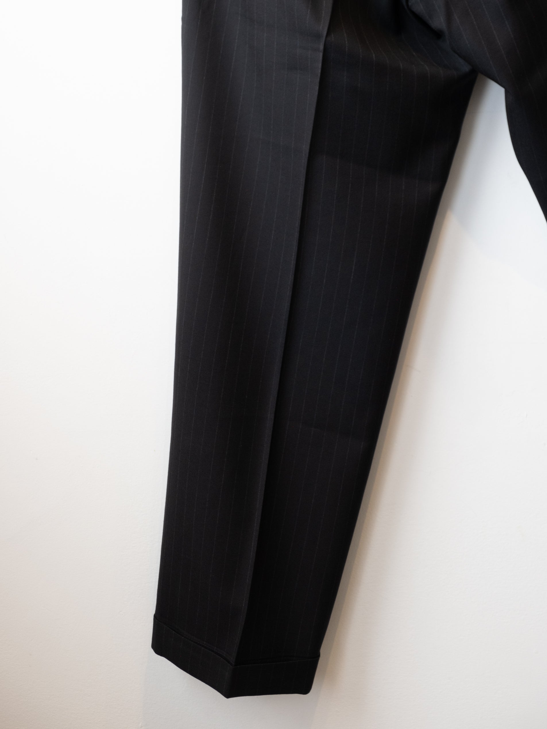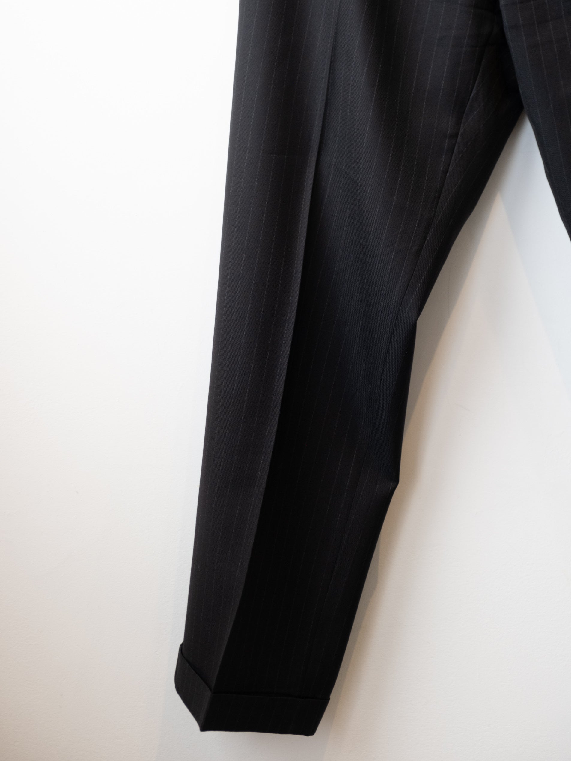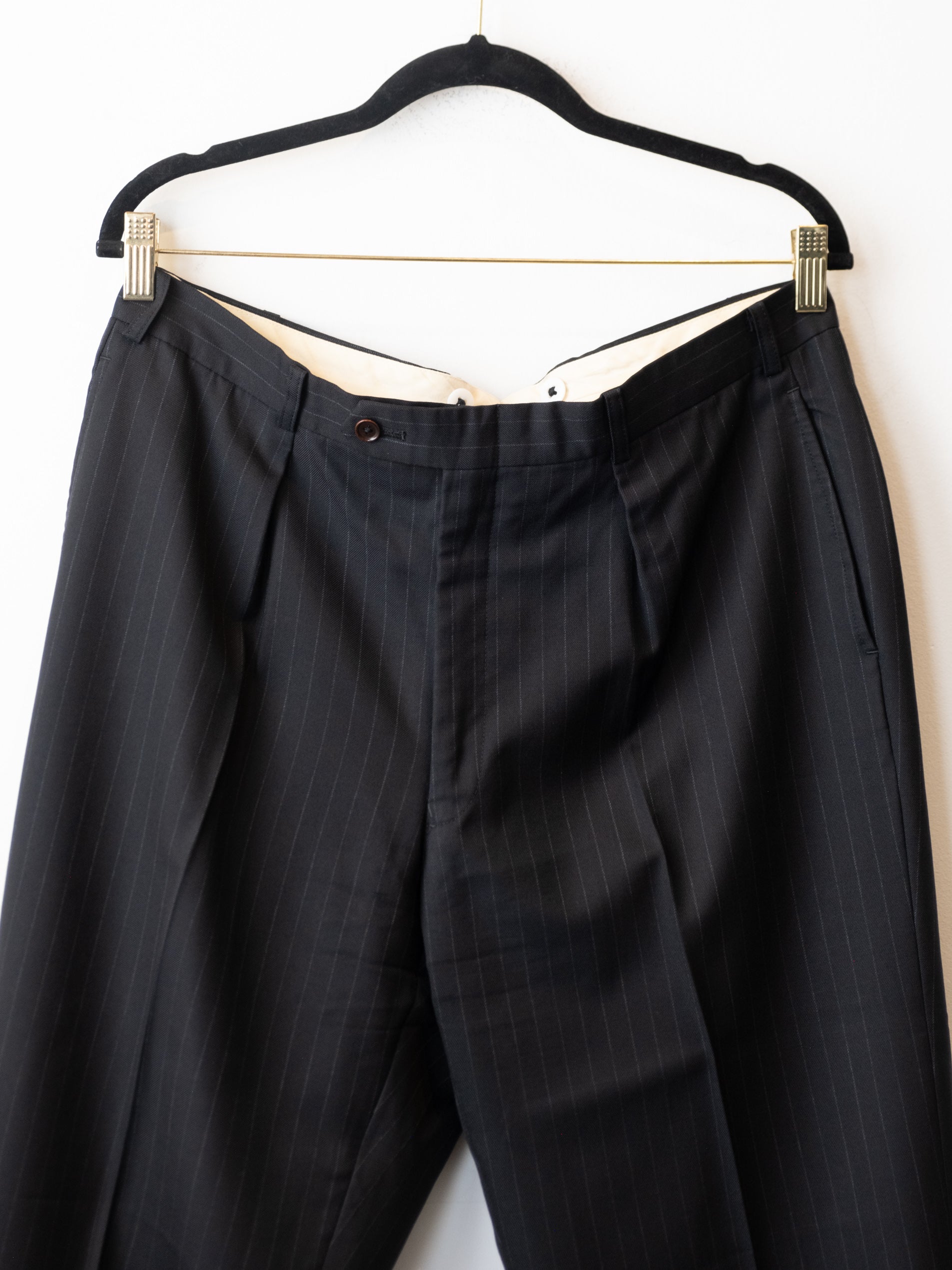 חליפה שני חלקים של בלייזר מחויט עם כפתיים מרופדות ומכנסיים מחויטים בצבע אפור פסים.