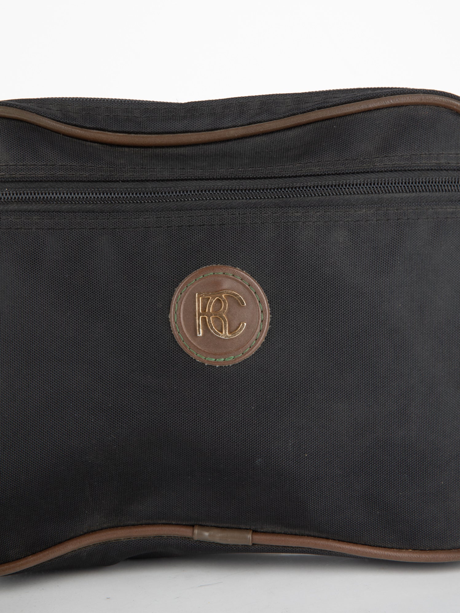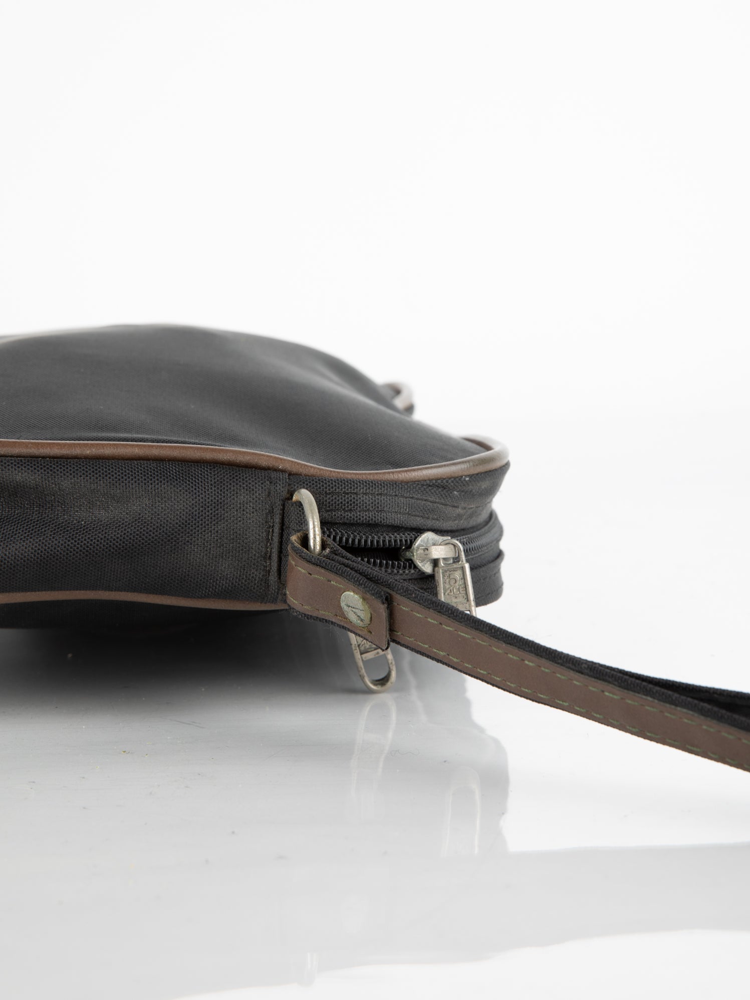 קלאץ׳ בצבע שחור העשוי מבד בשילוב של עור בצבע חום בעל ידית אחיזה הנסגר באמצעות רוכסן ודיטיילים מוזהבים.