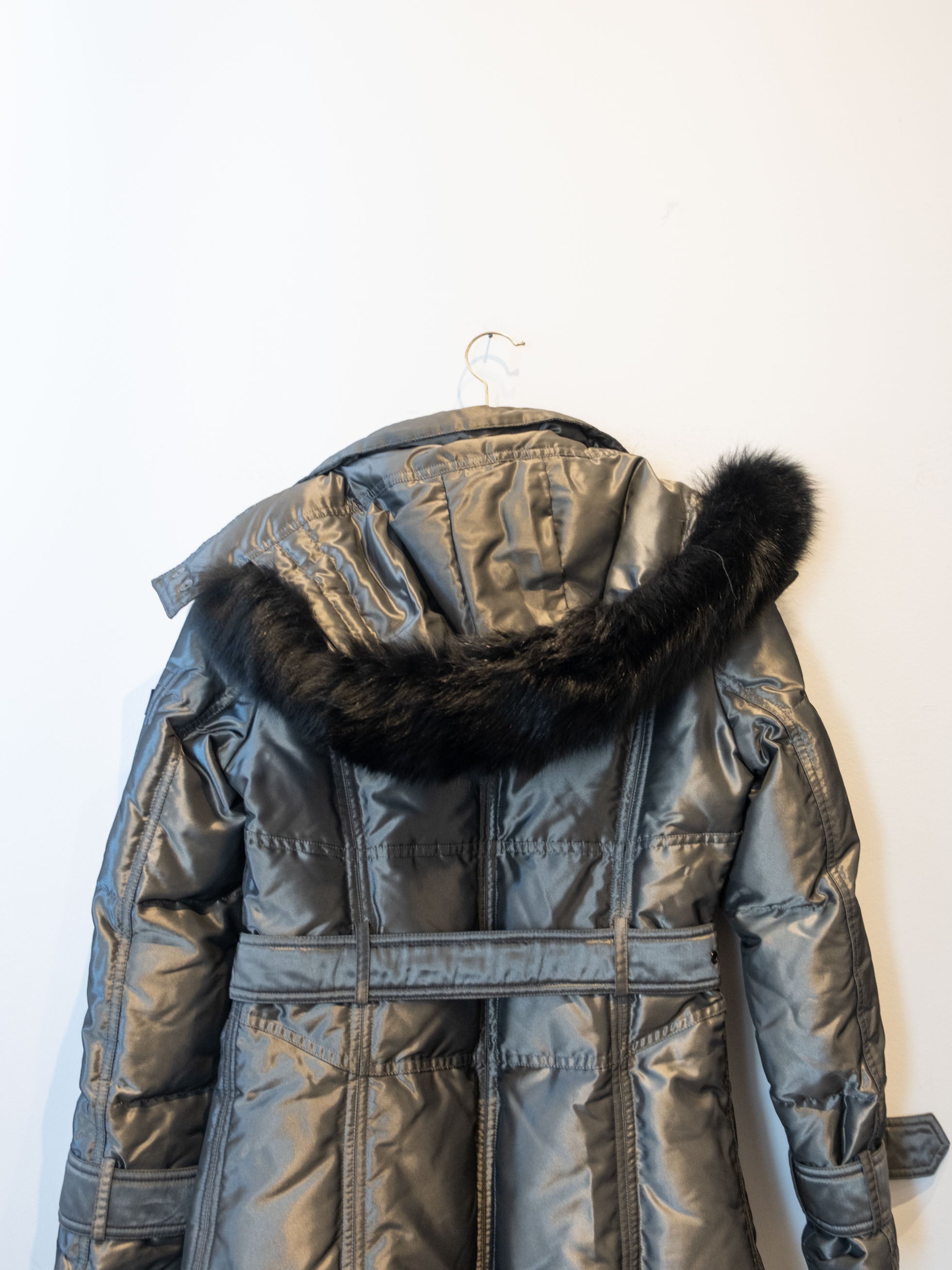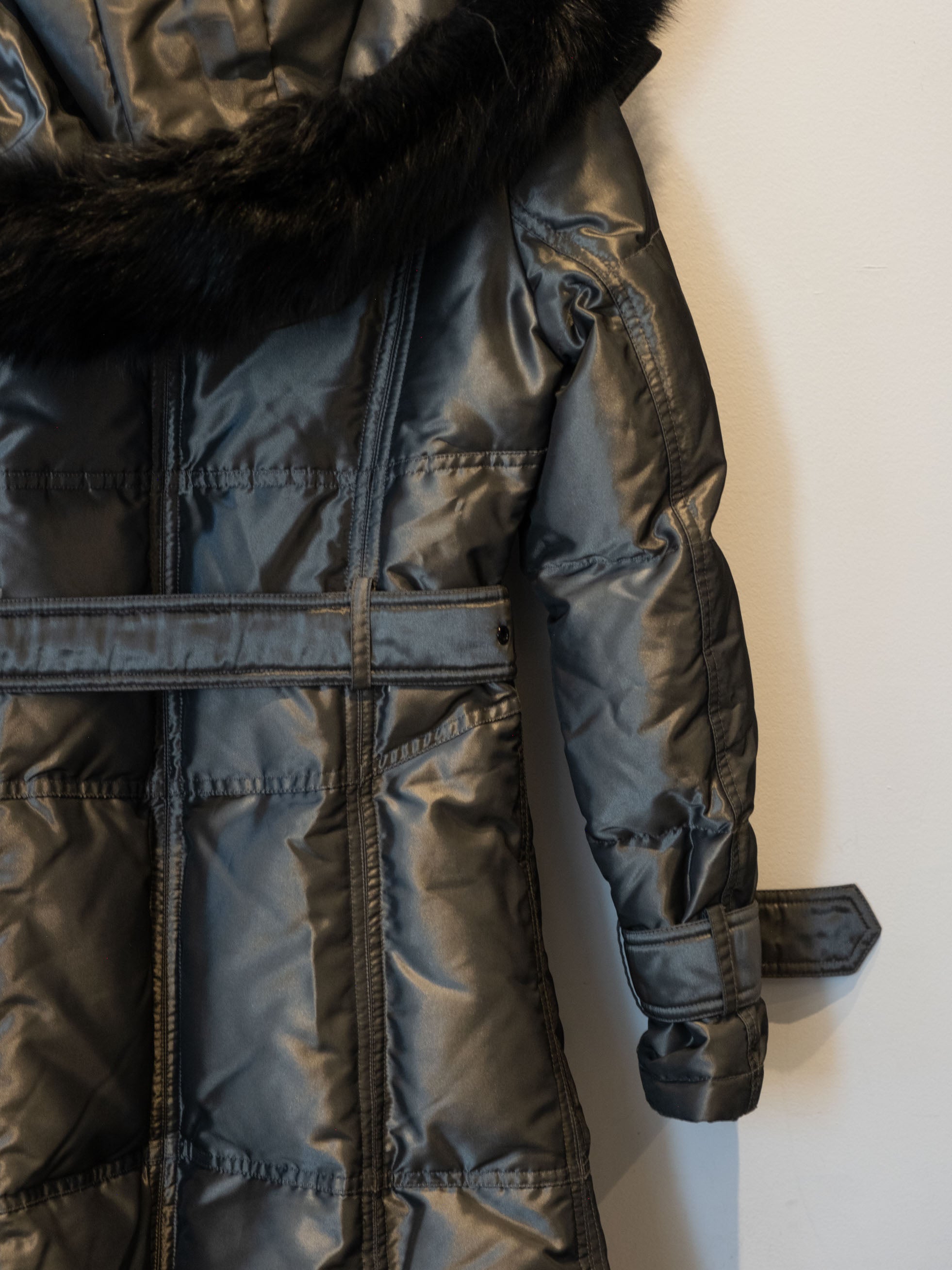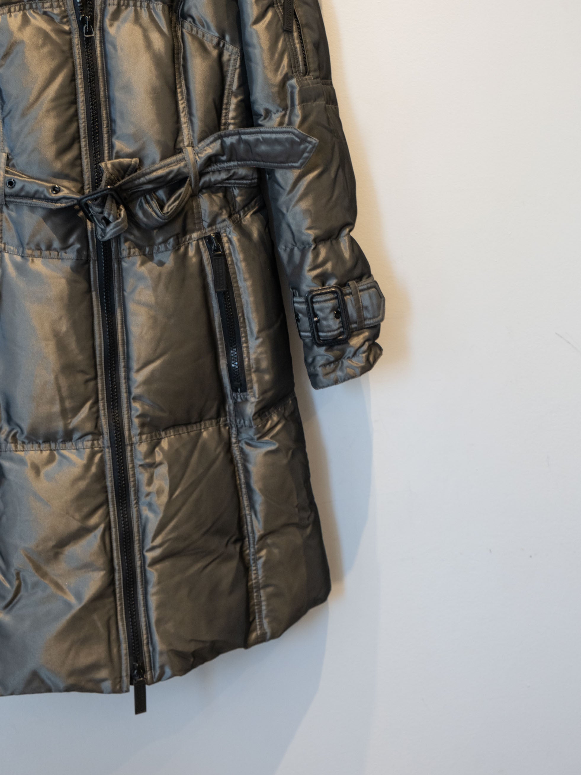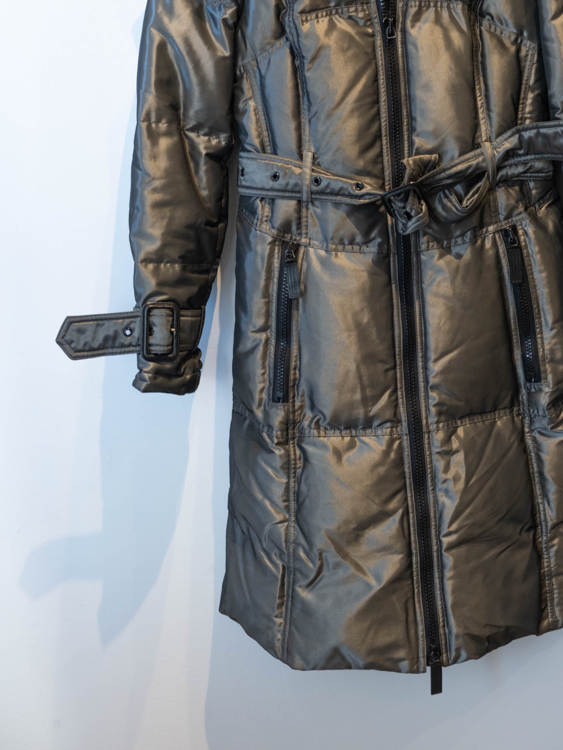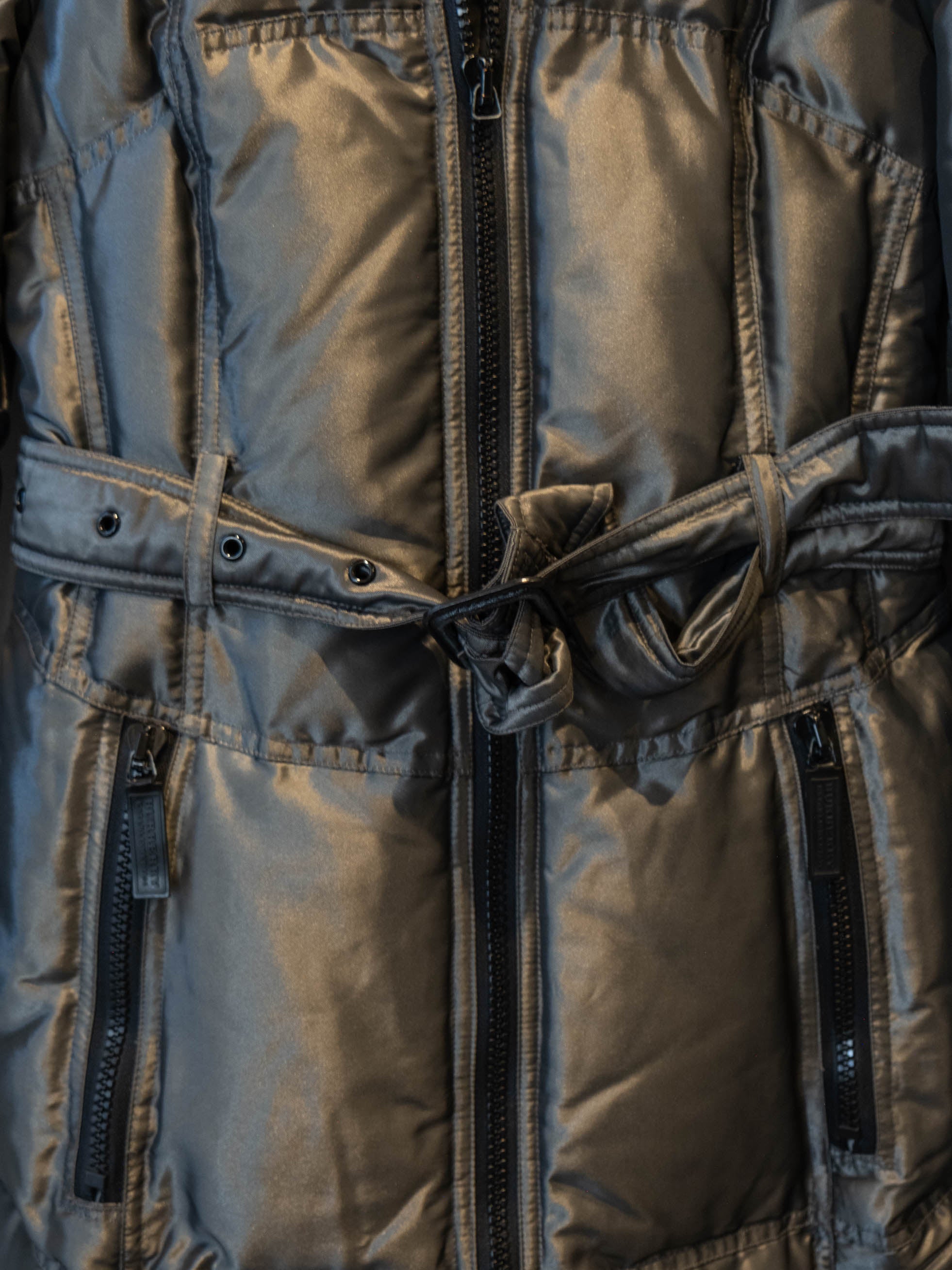 מעיל פוך בצבע כסוף כהה הנסגר באמצעות רוכסן וחגורה במותן, בעל שני כיסים הנסגרים באמצעות רוכסן וכיס נוסף על הכתף עם סגירה זהה.