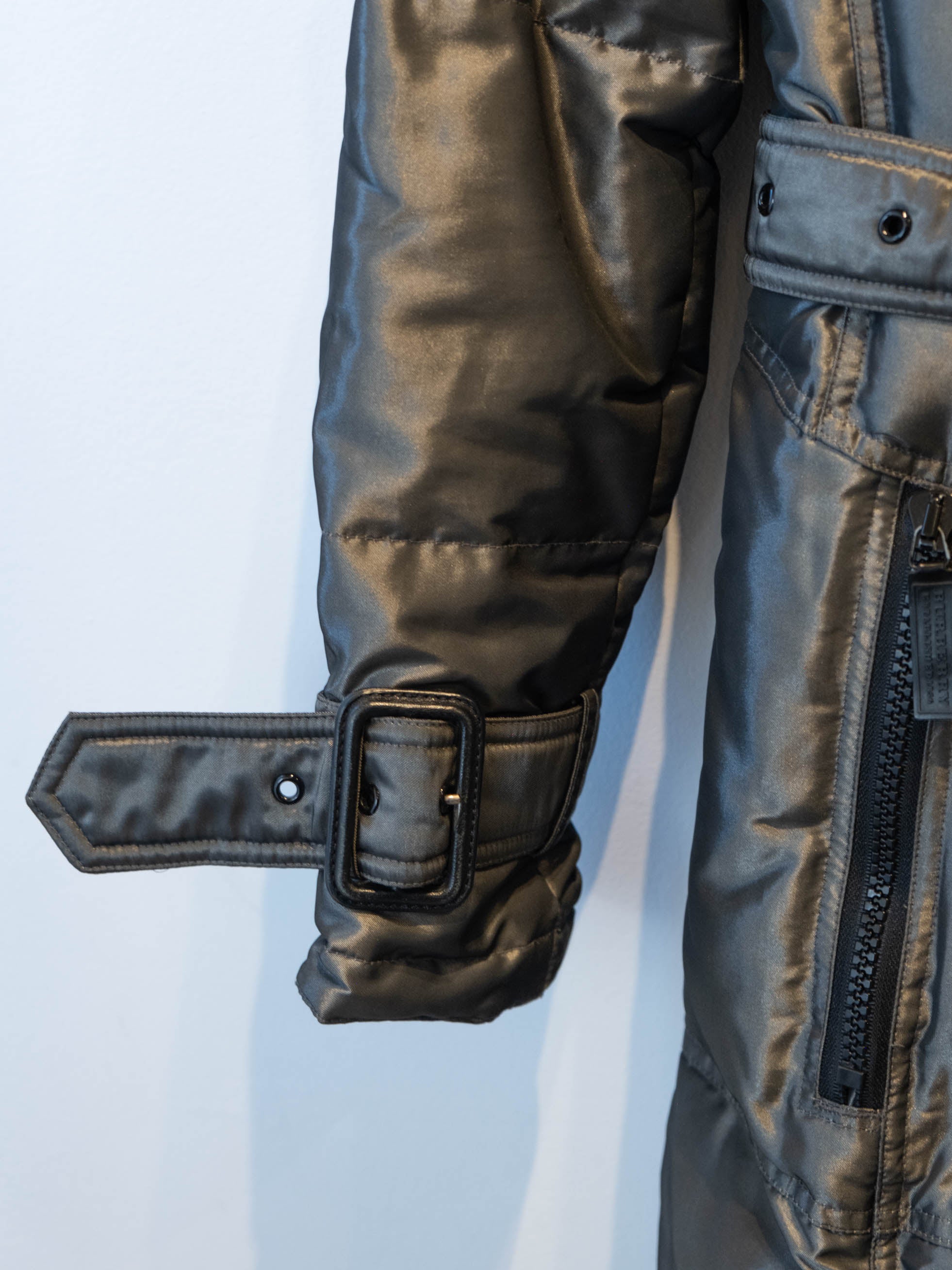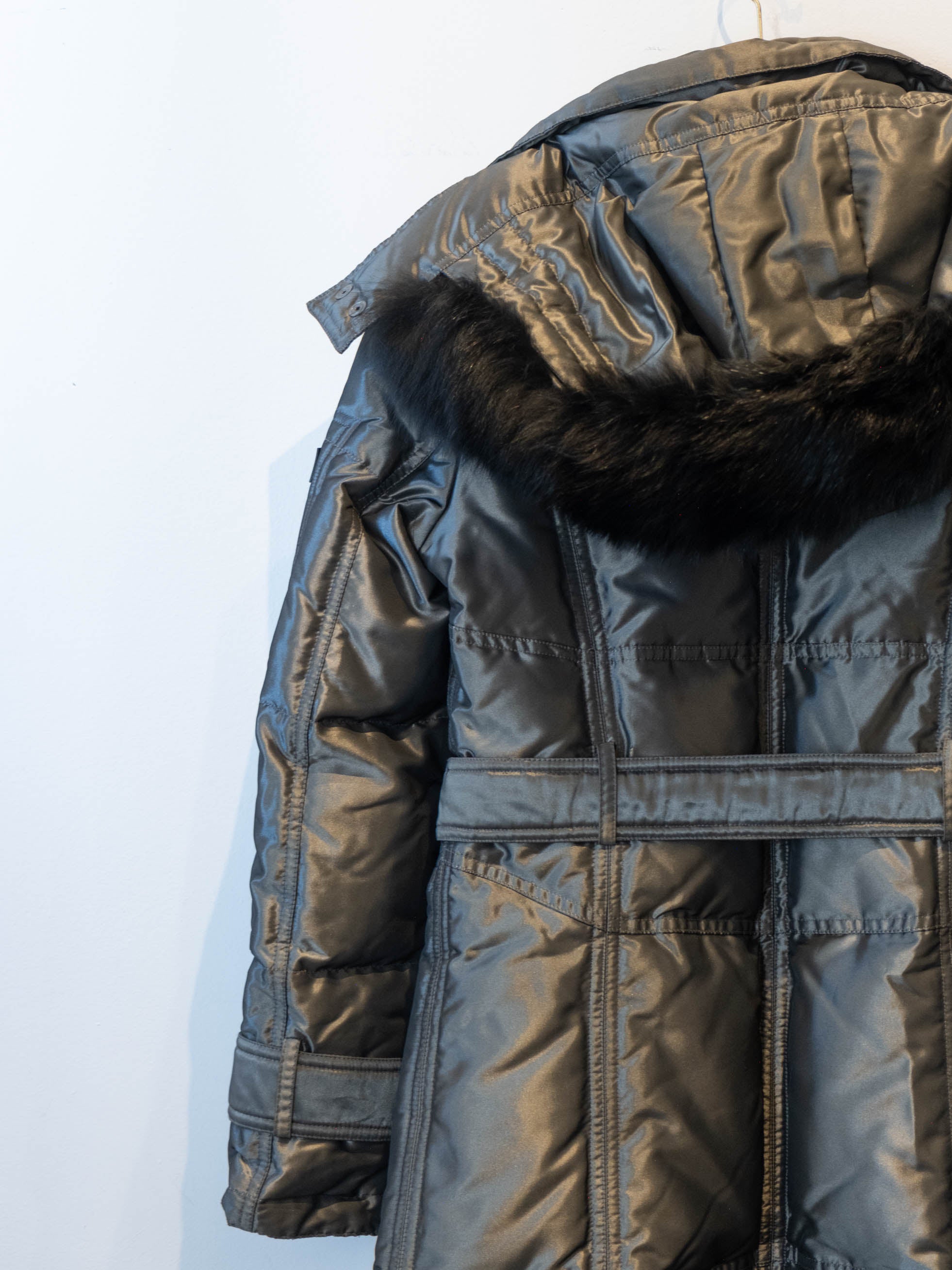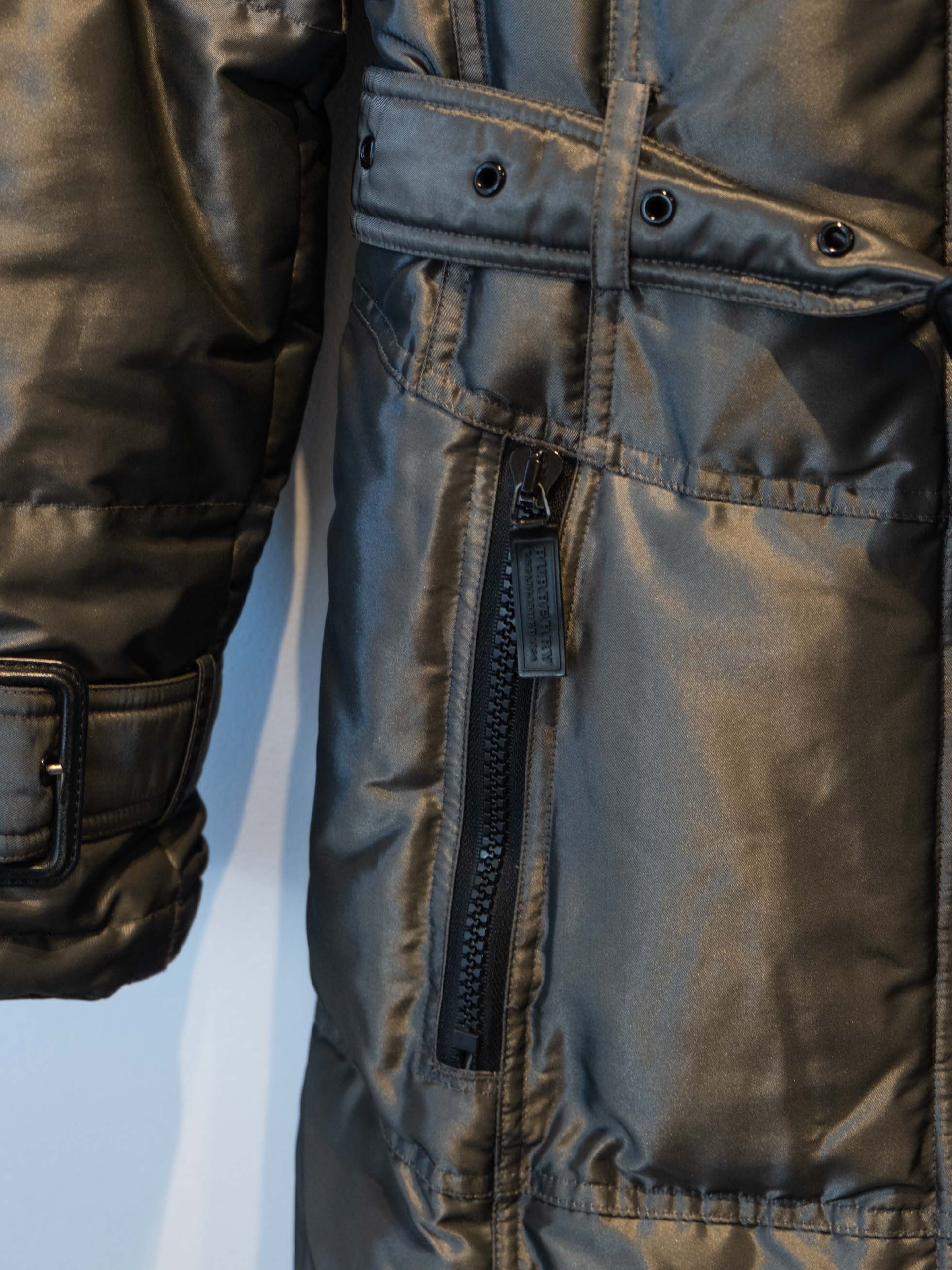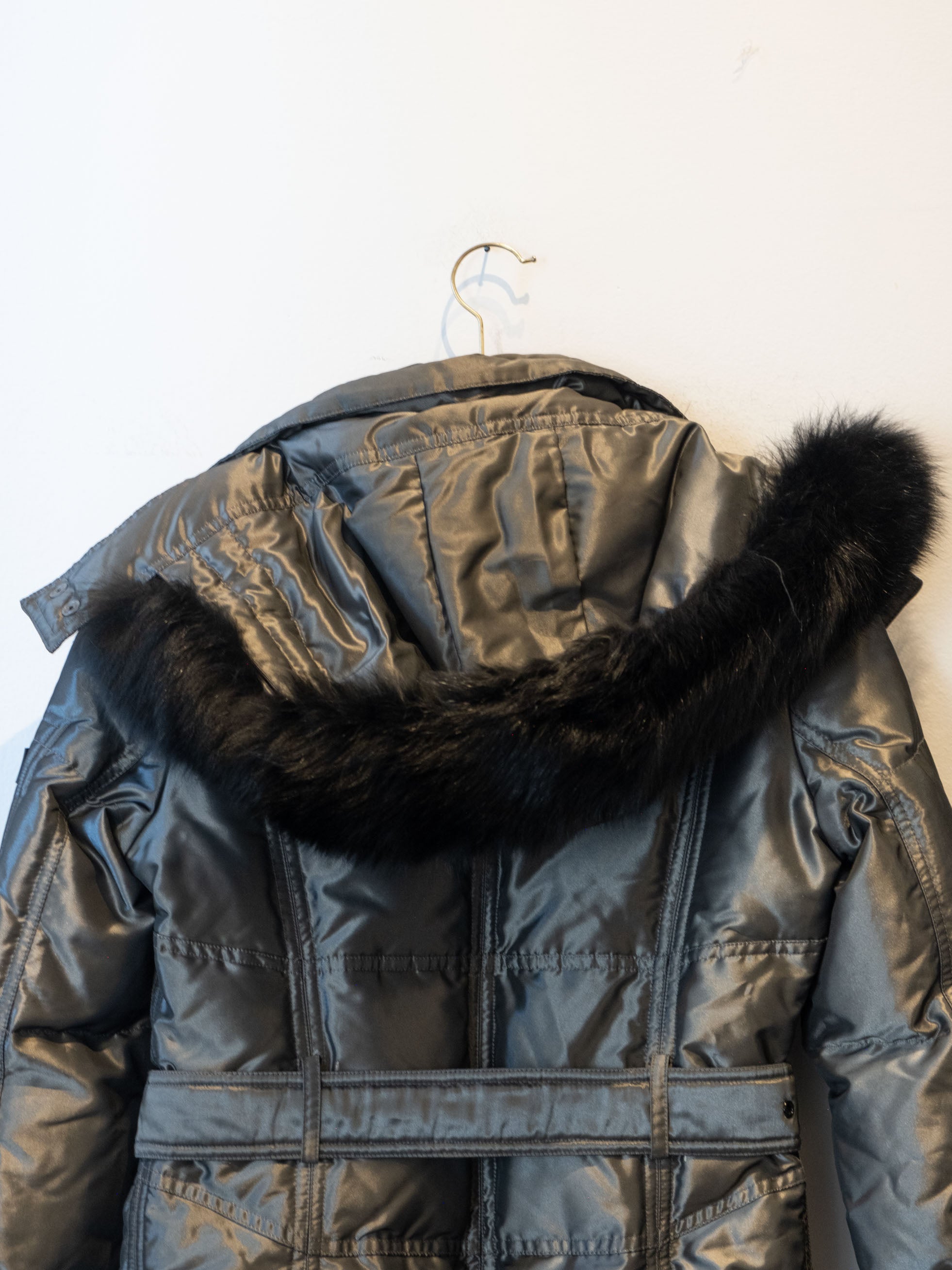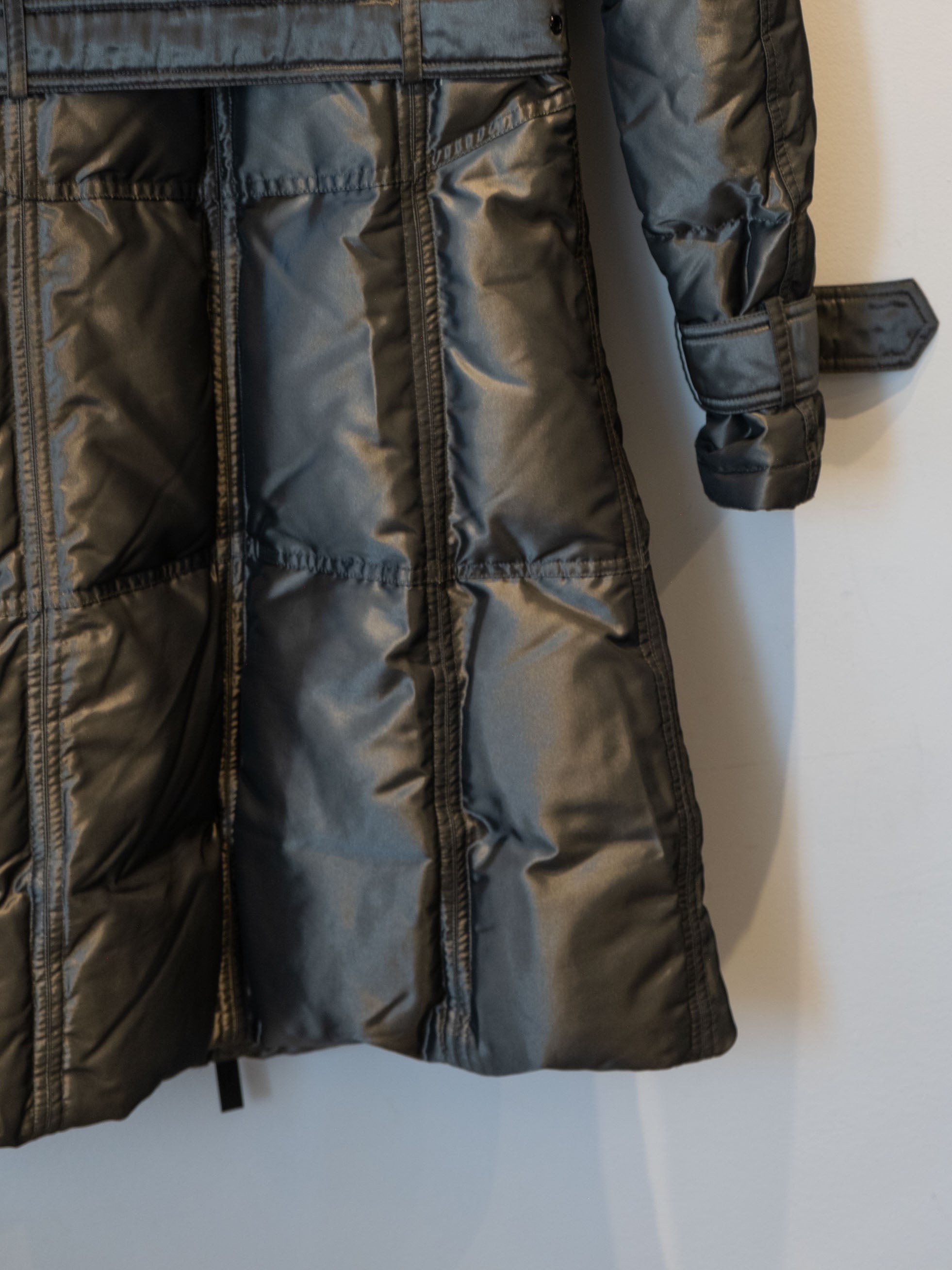 מעיל פוך בצבע כסוף כהה הנסגר באמצעות רוכסן וחגורה במותן, בעל שני כיסים הנסגרים באמצעות רוכסן וכיס נוסף על הכתף עם סגירה זהה.