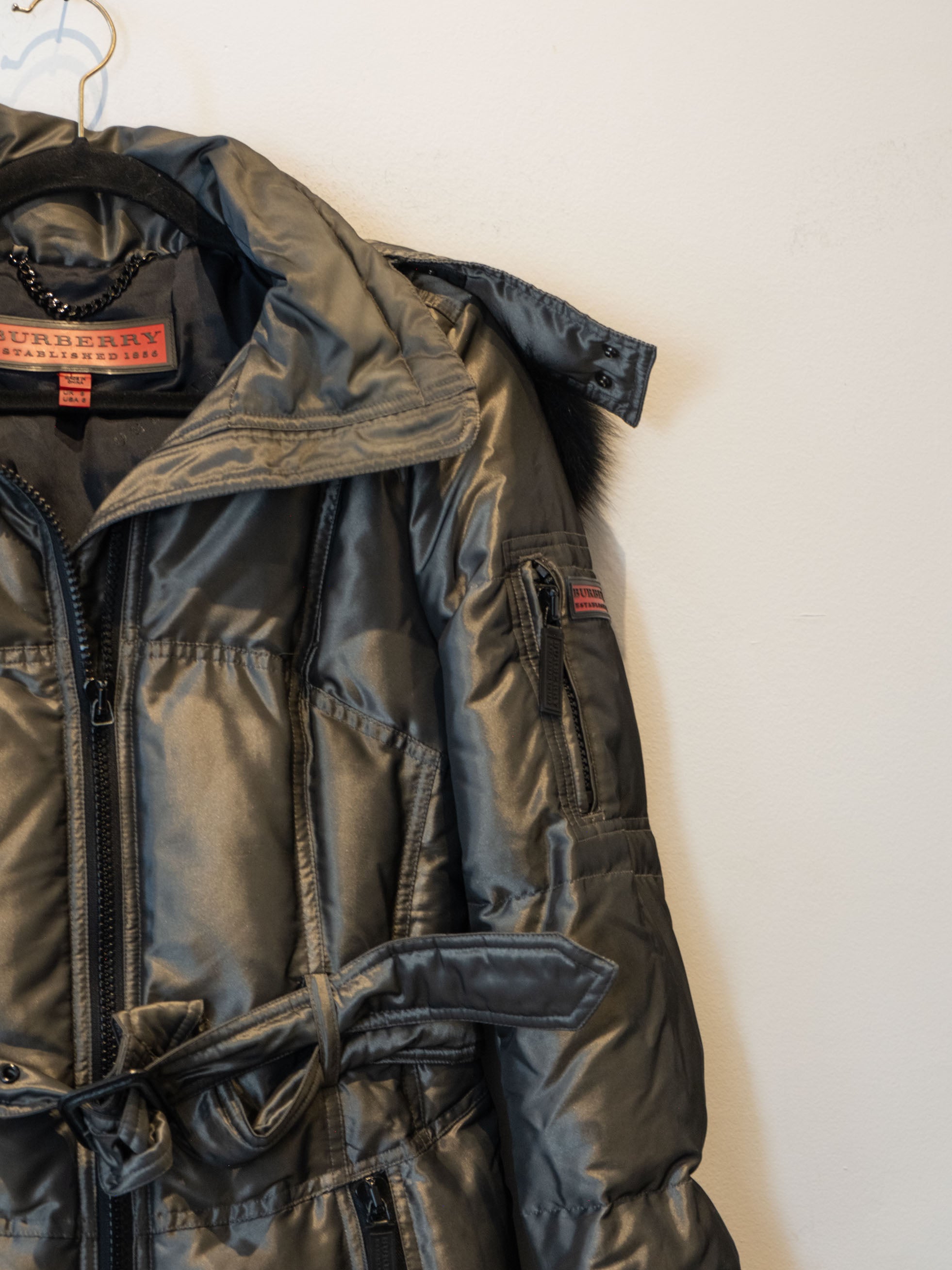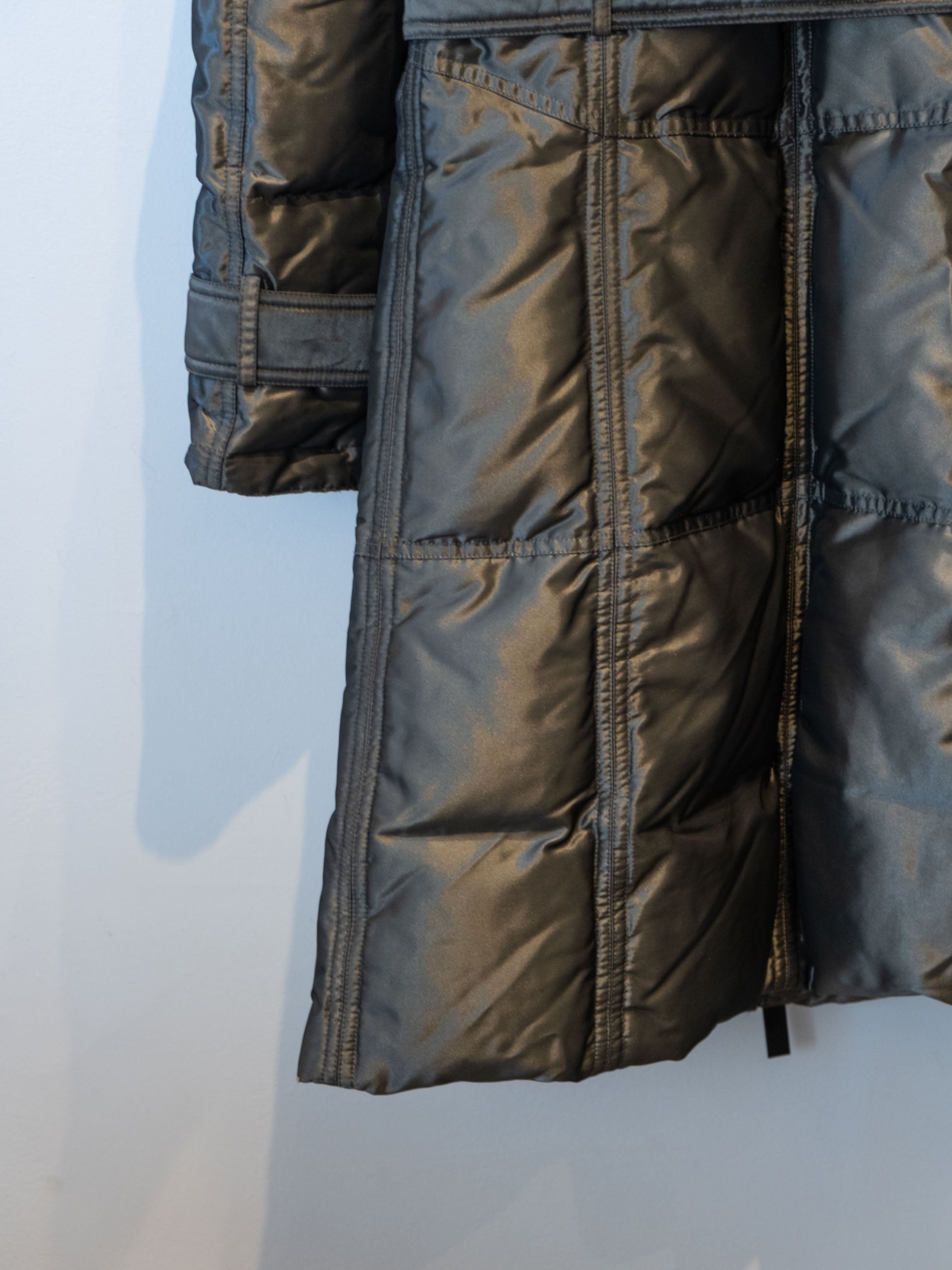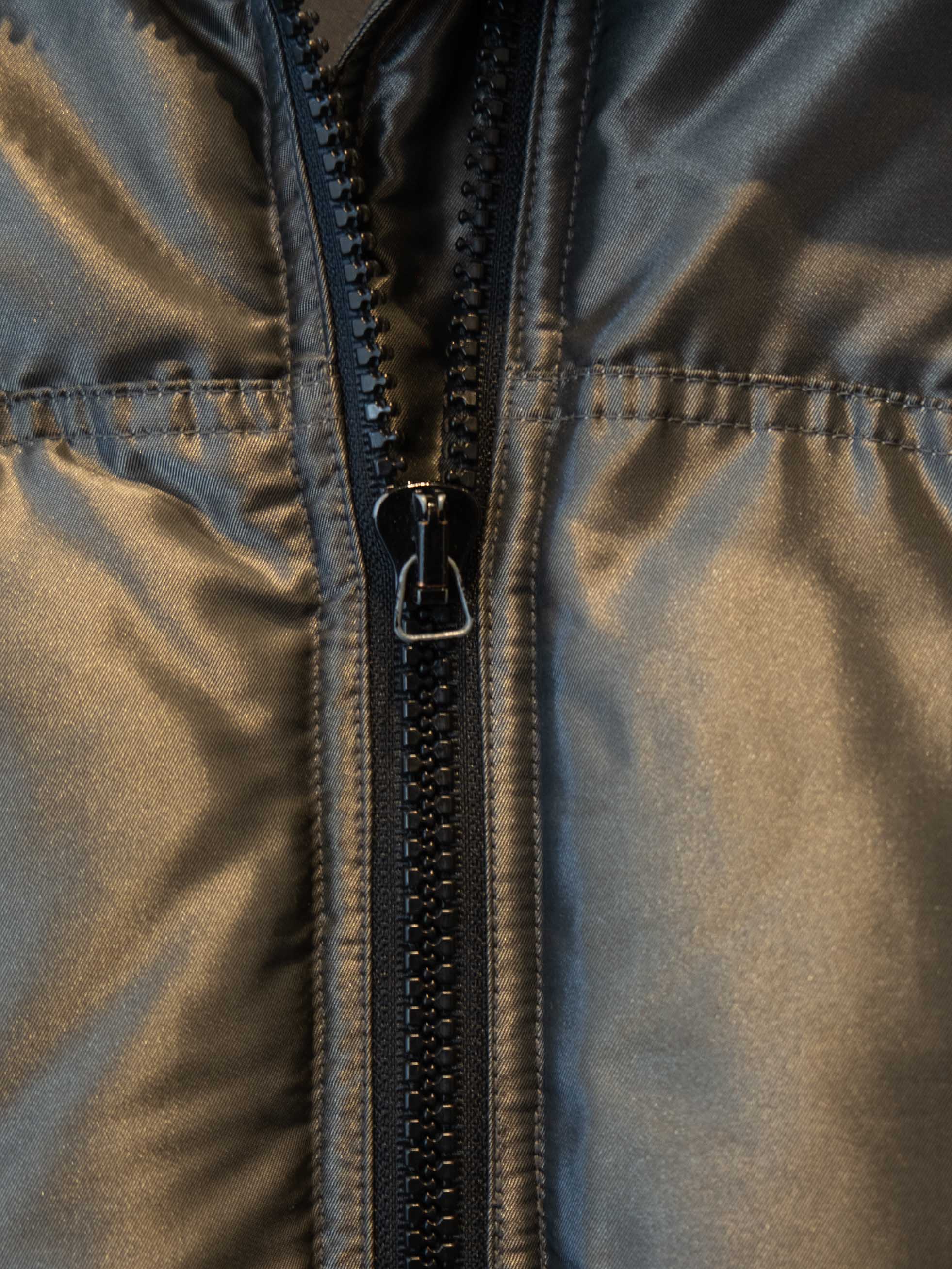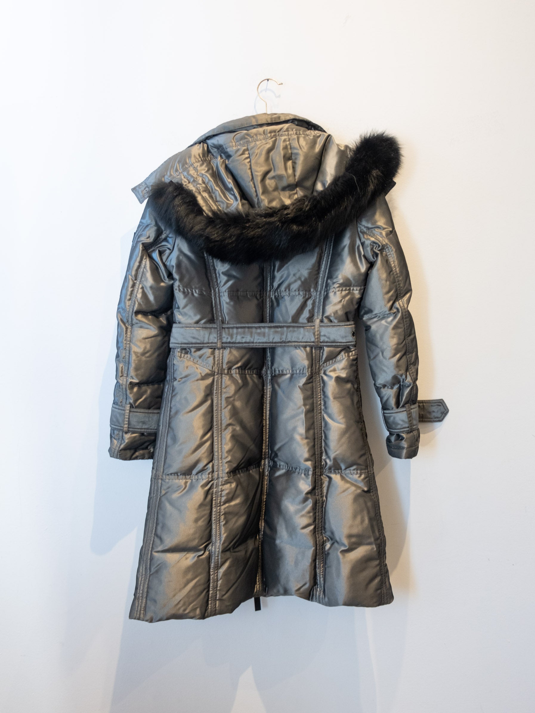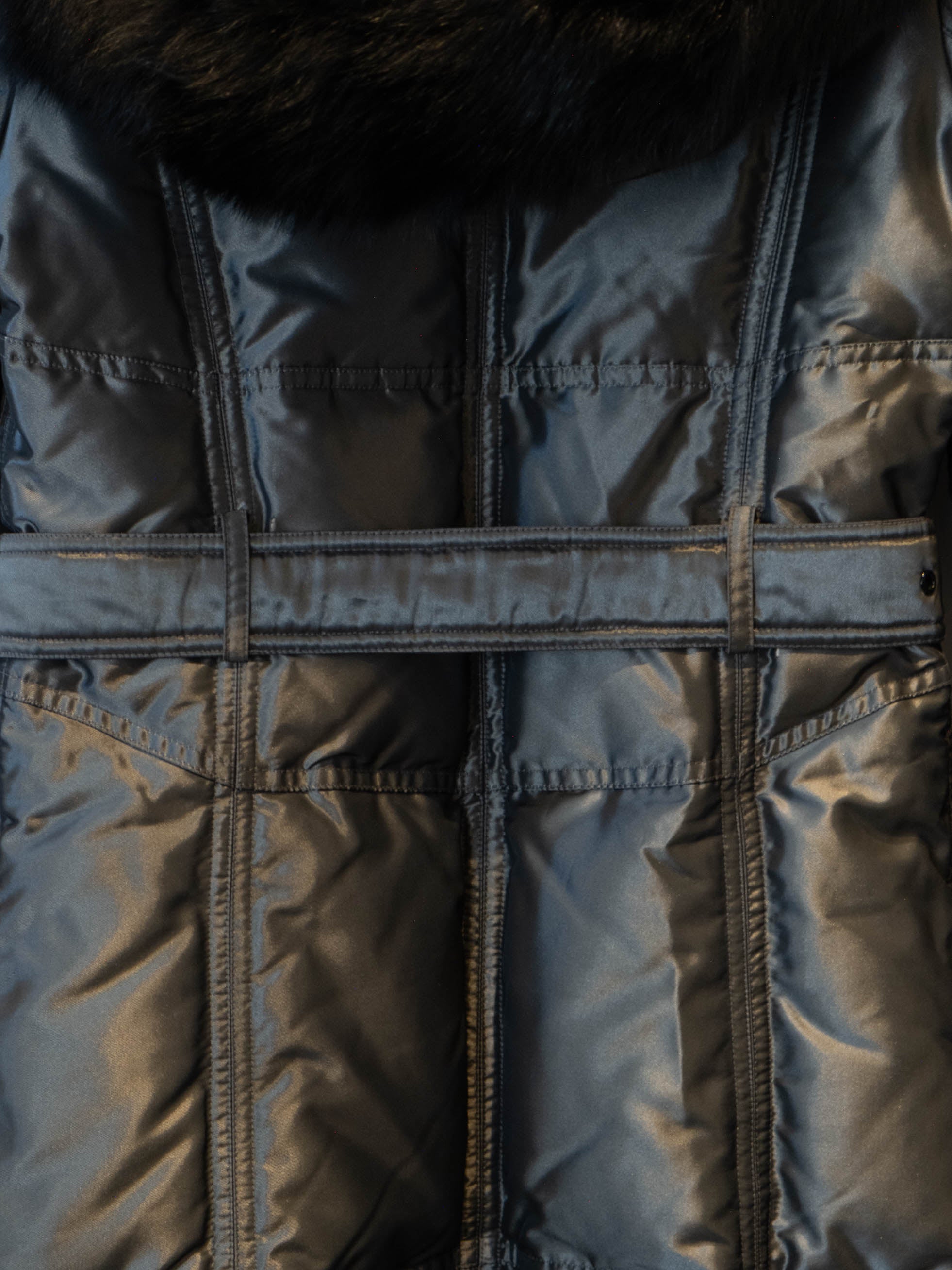 מעיל פוך בצבע כסוף כהה הנסגר באמצעות רוכסן וחגורה במותן, בעל שני כיסים הנסגרים באמצעות רוכסן וכיס נוסף על הכתף עם סגירה זהה.