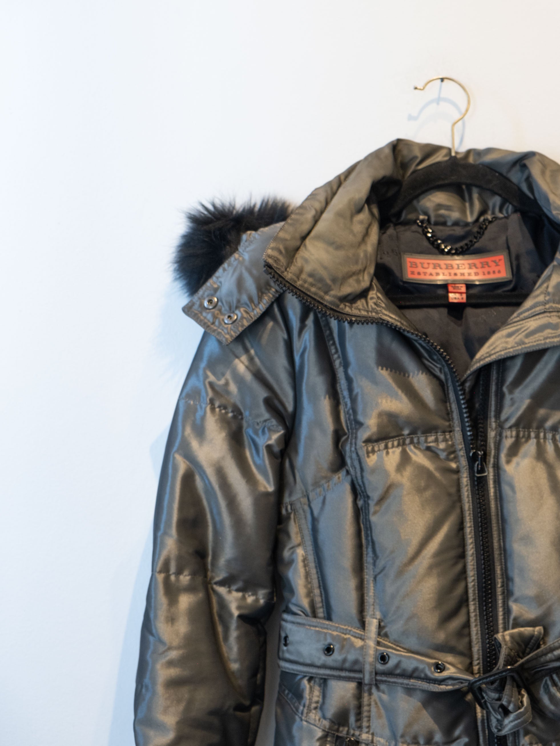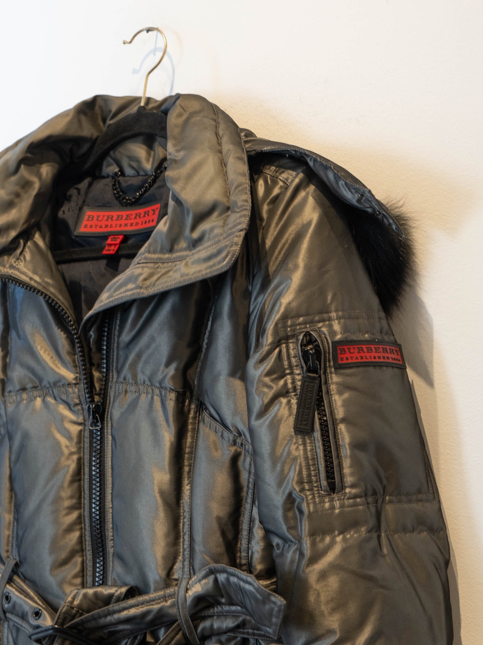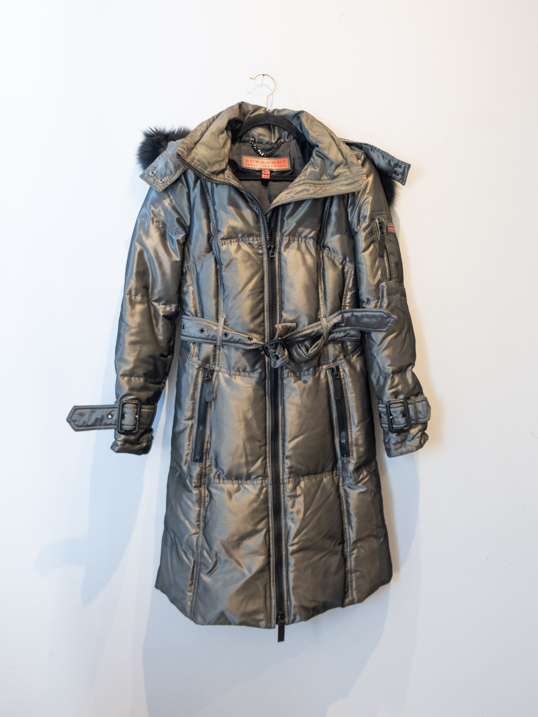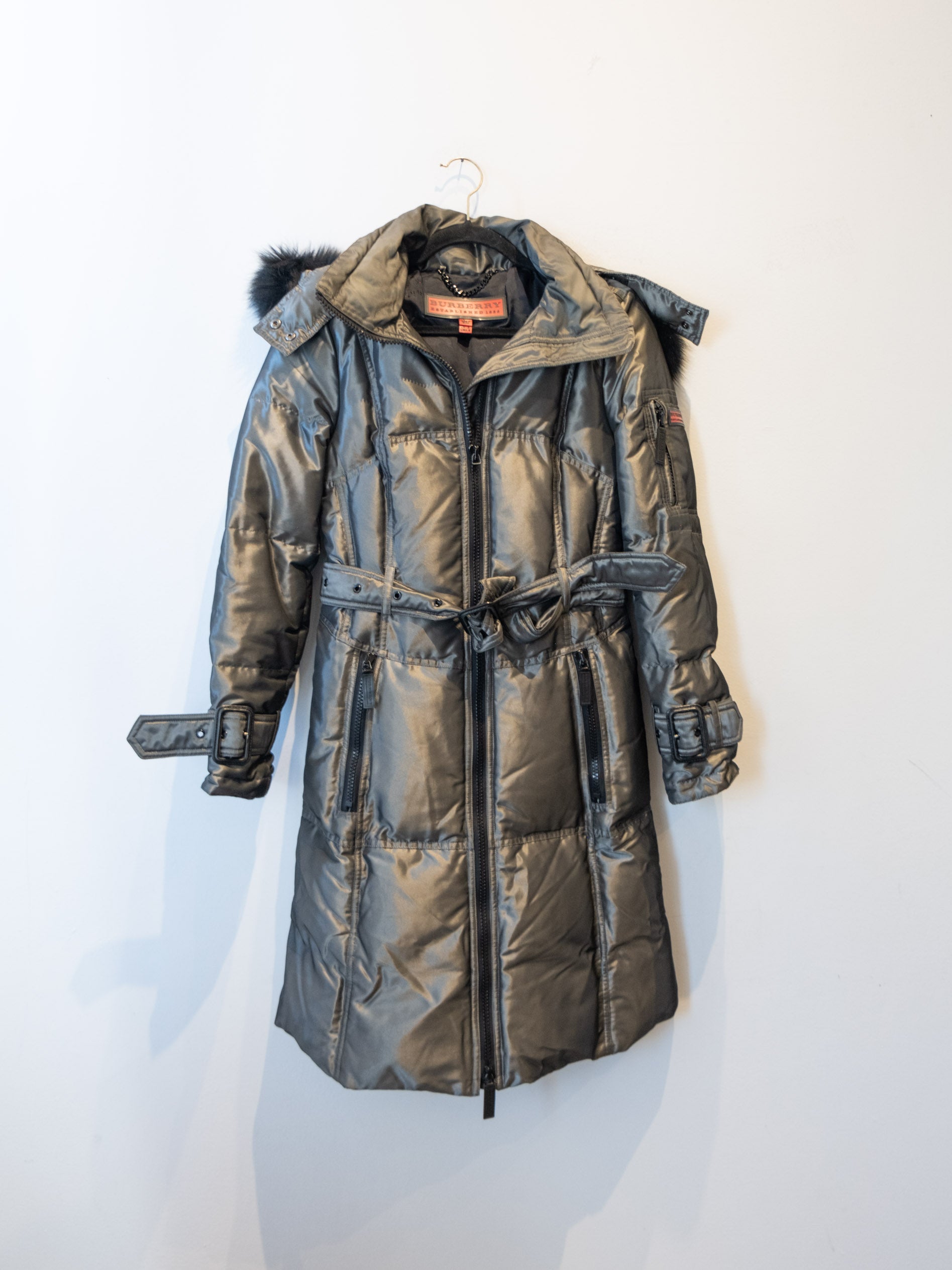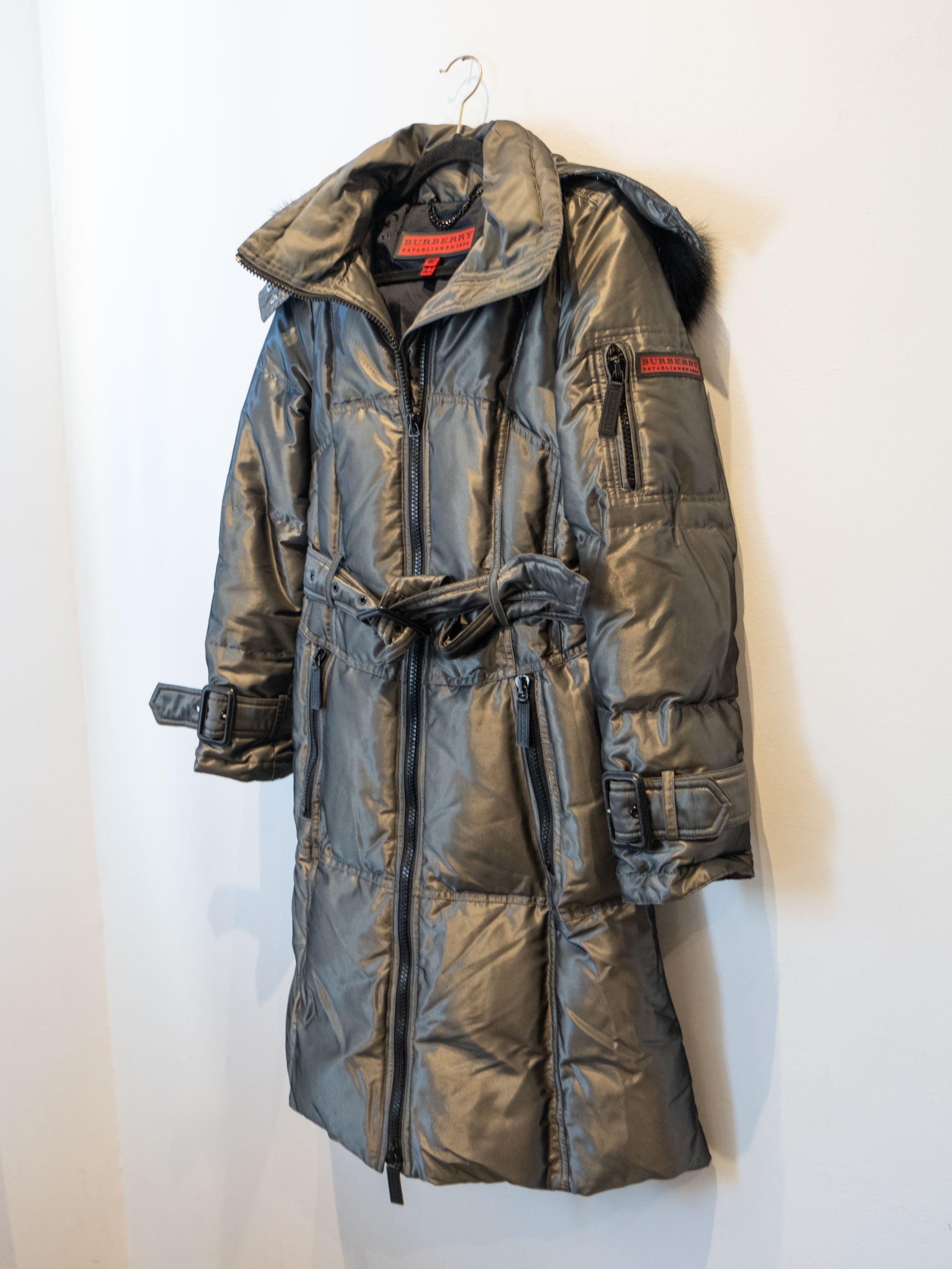 מעיל פוך בצבע כסוף כהה הנסגר באמצעות רוכסן וחגורה במותן, בעל שני כיסים הנסגרים באמצעות רוכסן וכיס נוסף על הכתף עם סגירה זהה.