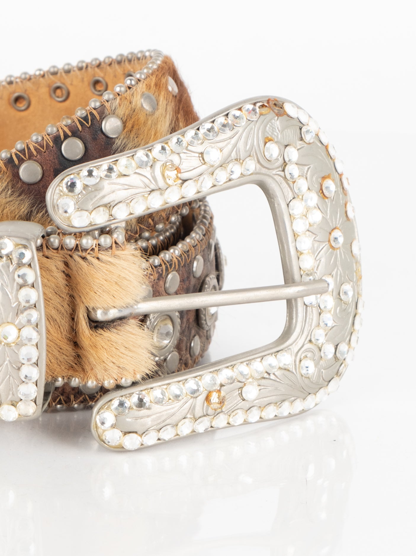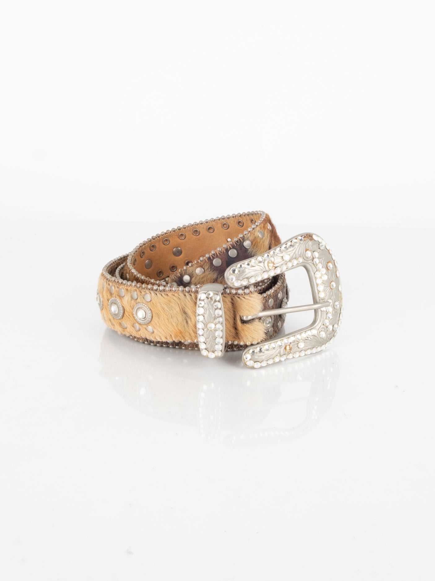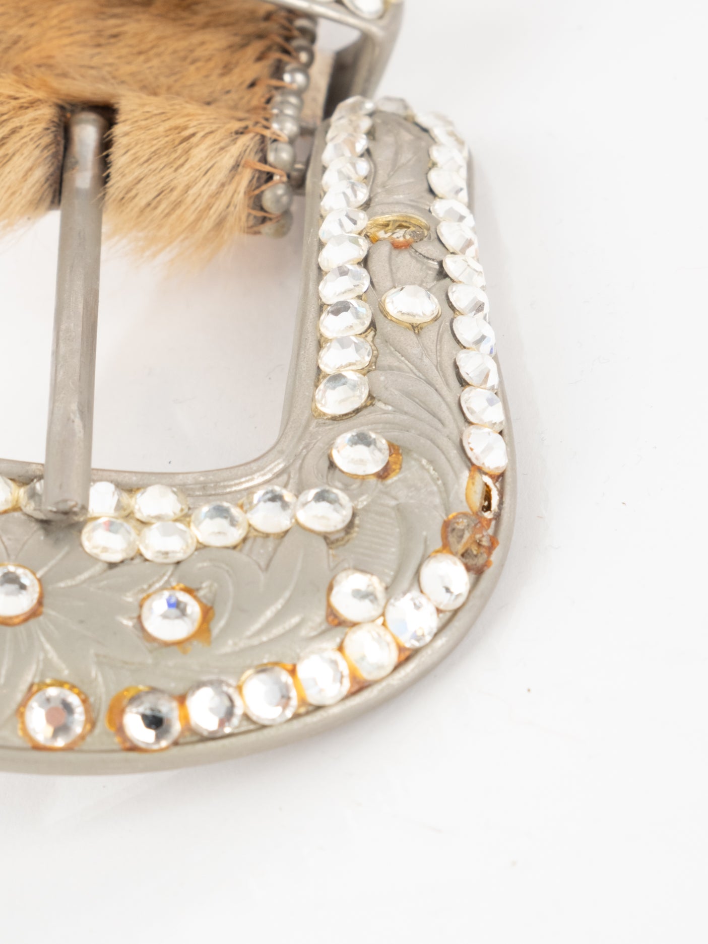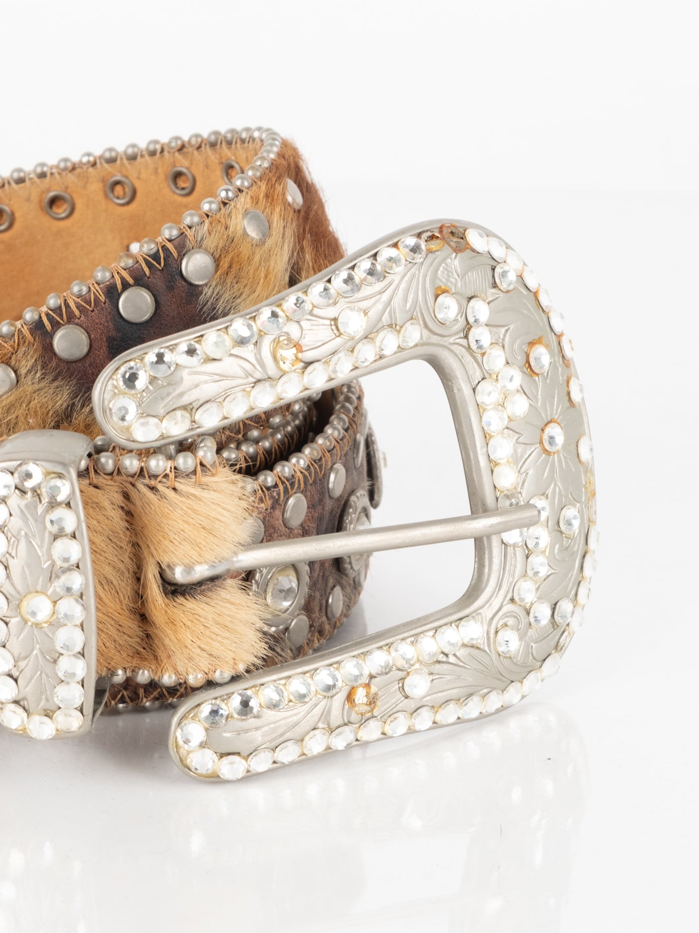 חגורה מסיבית וגדולה העשויה מעור בשילוב של פרווה בצבע חום, דיטיילים כסופים ואבנים.