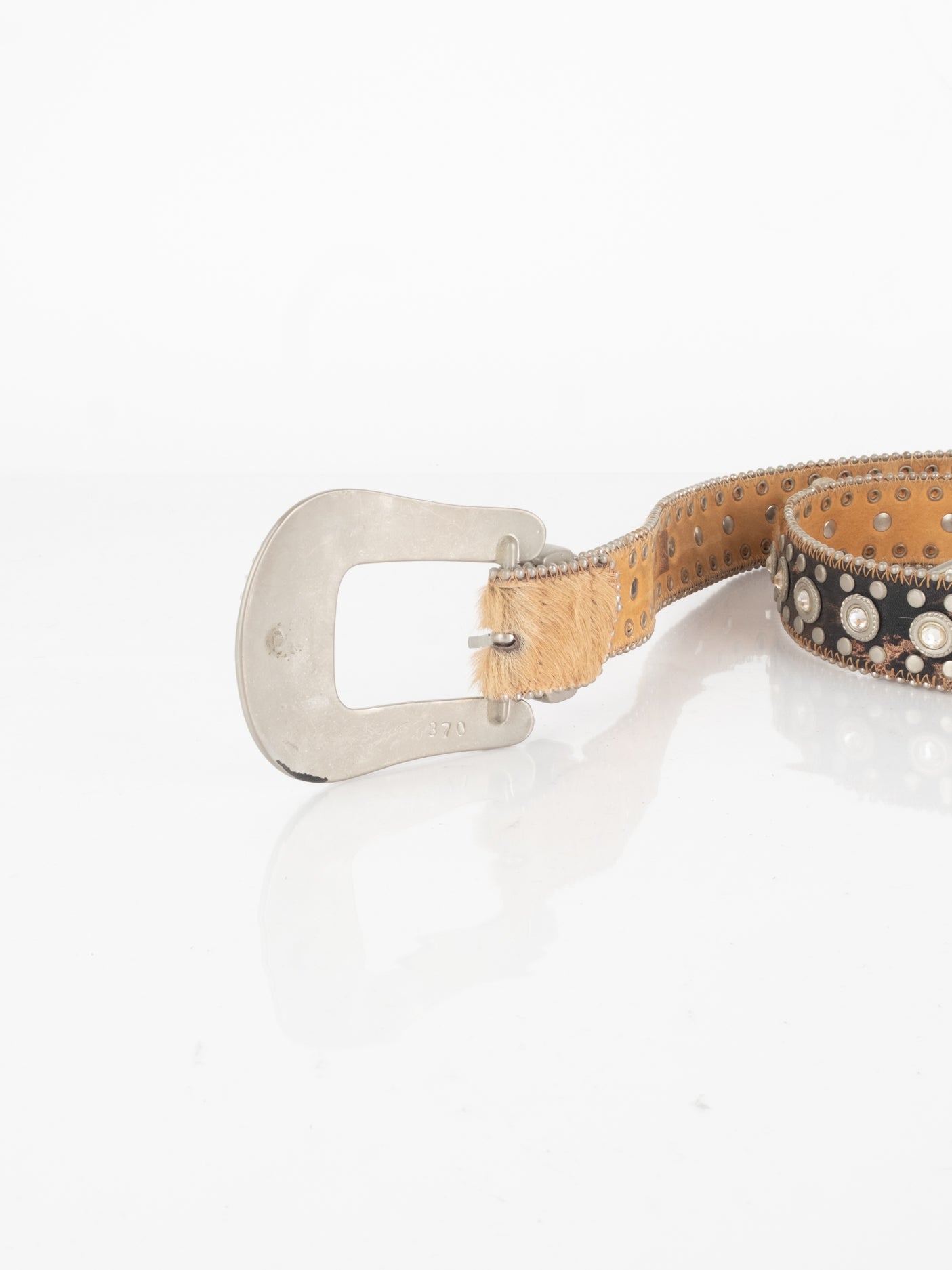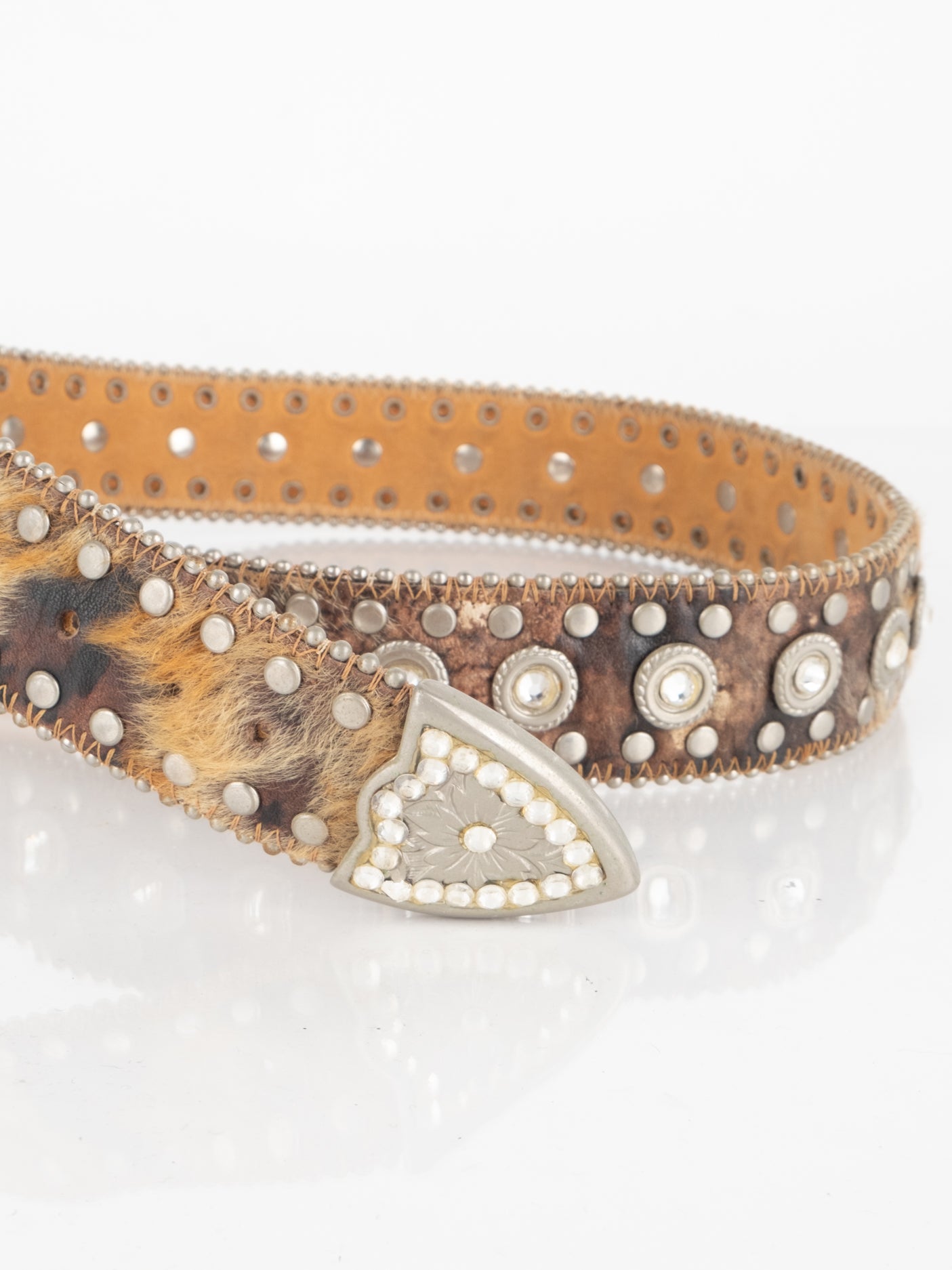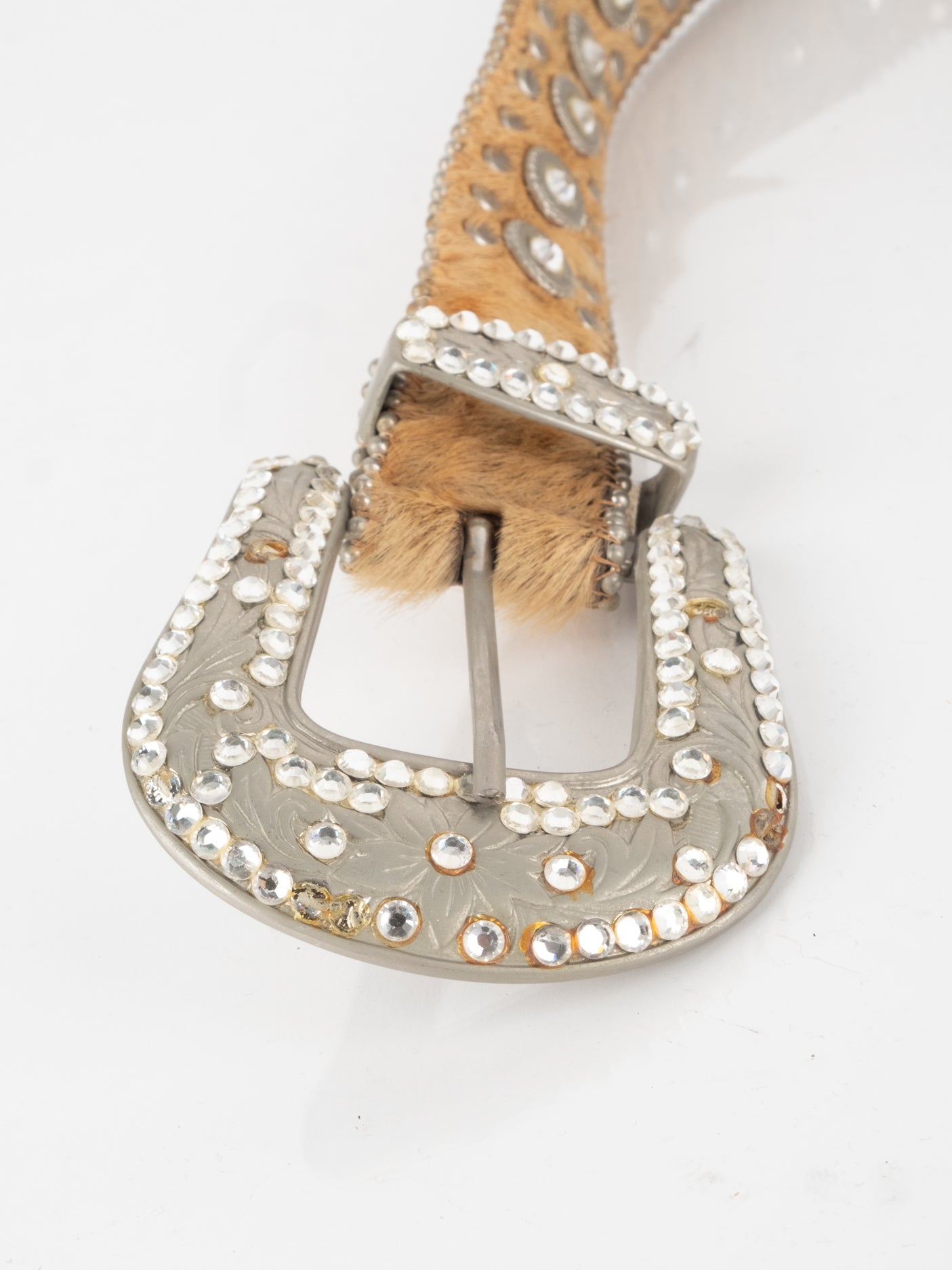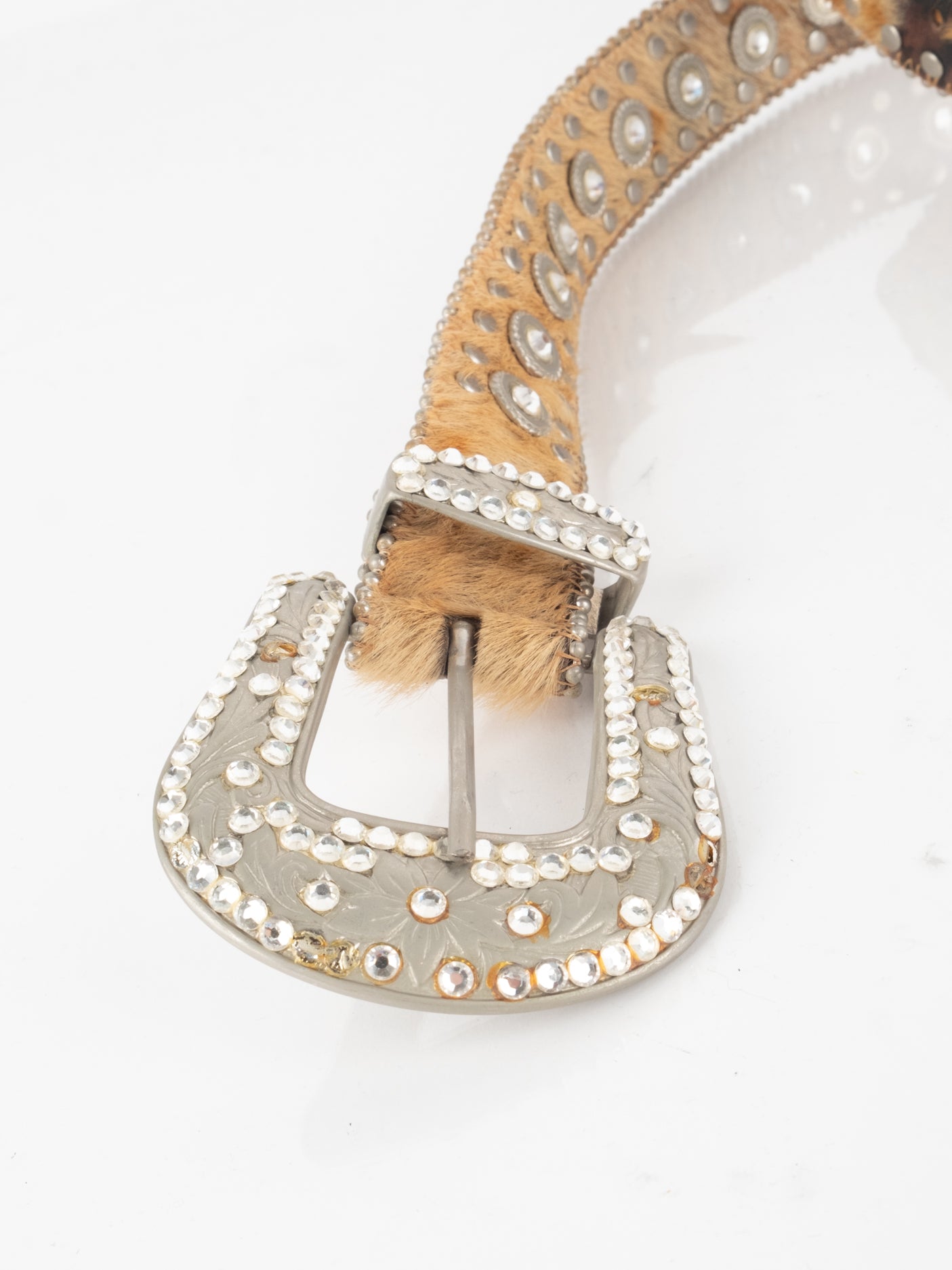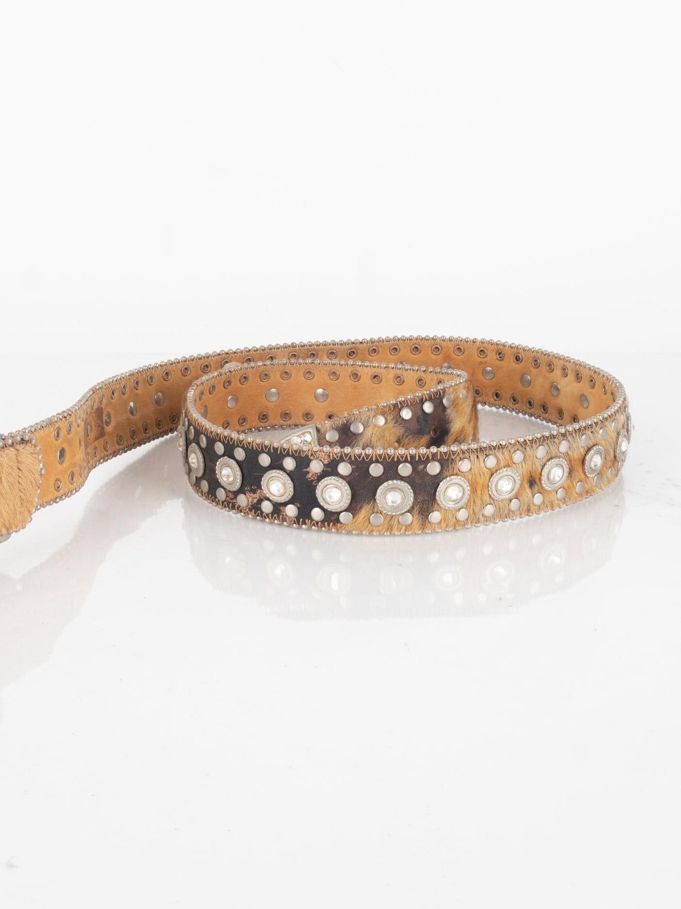 חגורה מסיבית וגדולה העשויה מעור בשילוב של פרווה בצבע חום, דיטיילים כסופים ואבנים.