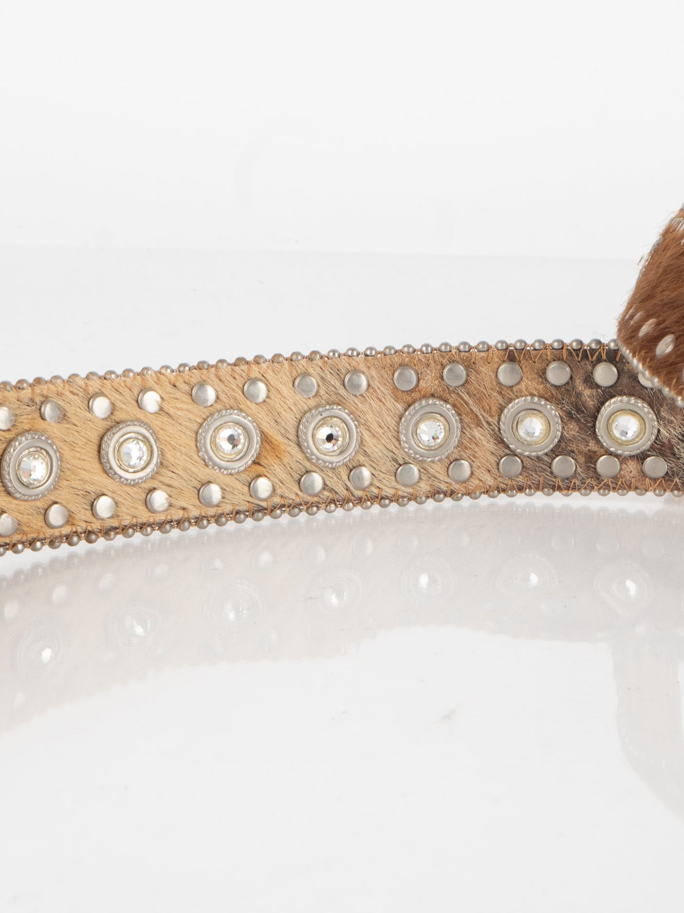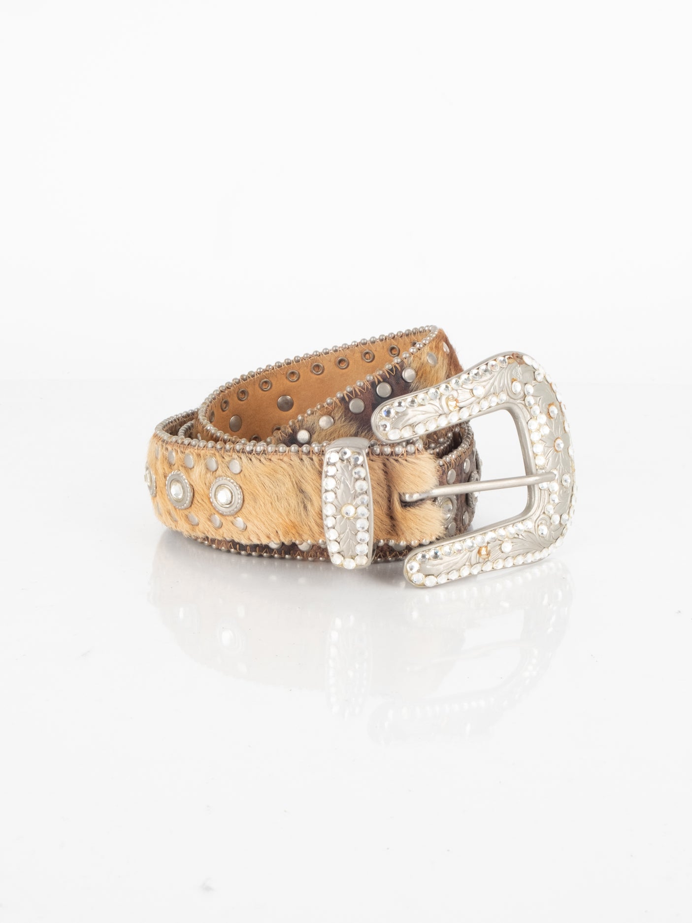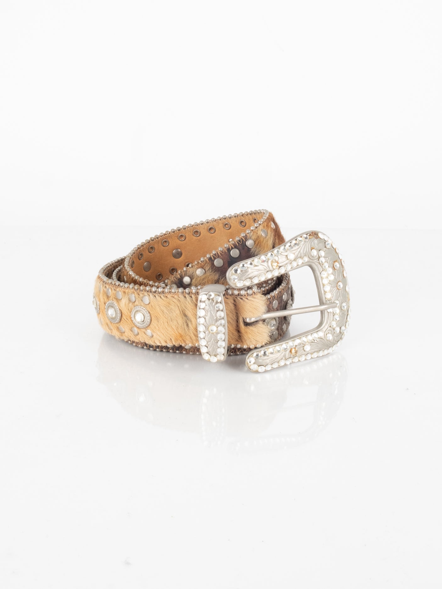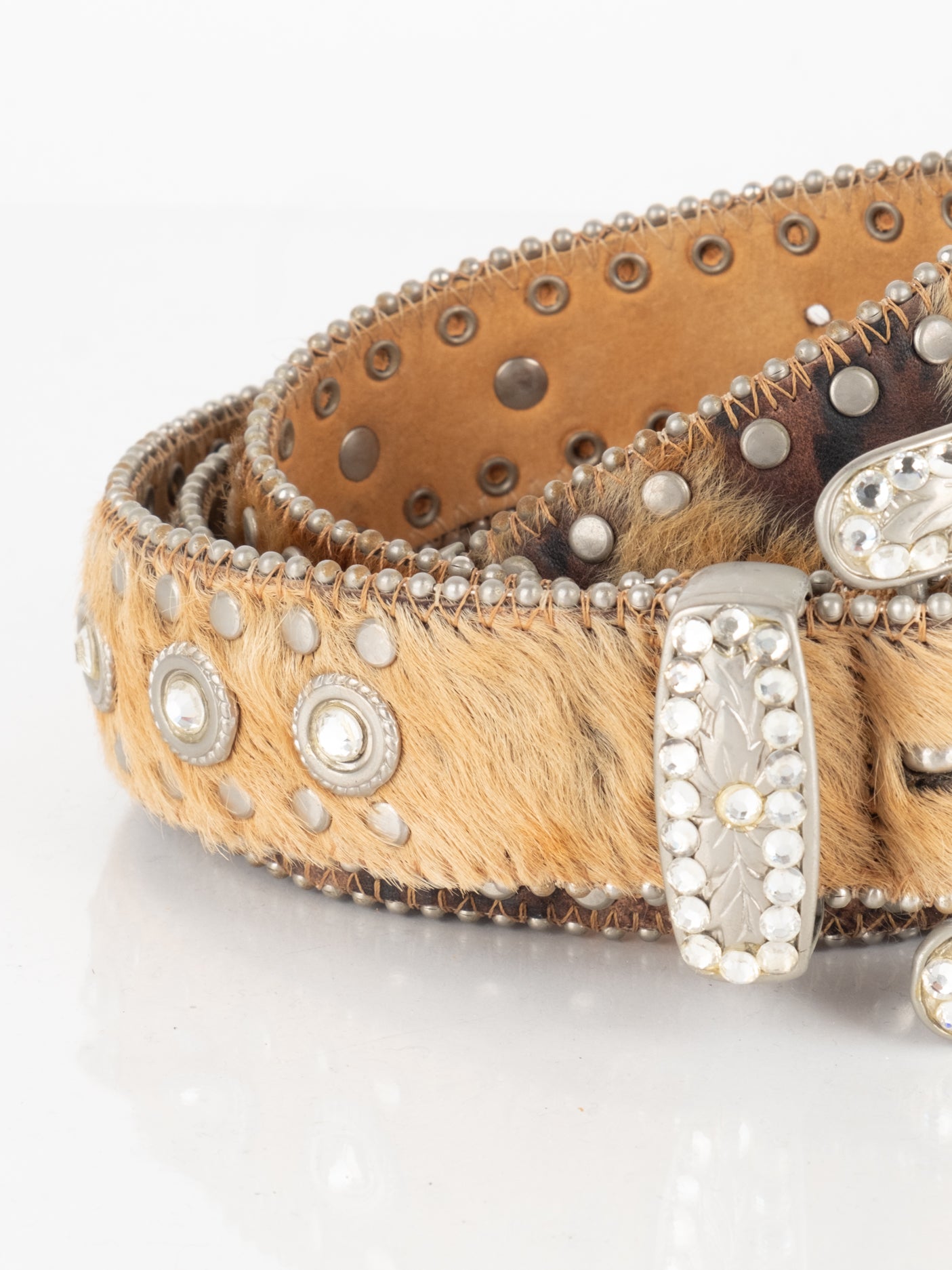 חגורה מסיבית וגדולה העשויה מעור בשילוב של פרווה בצבע חום, דיטיילים כסופים ואבנים.