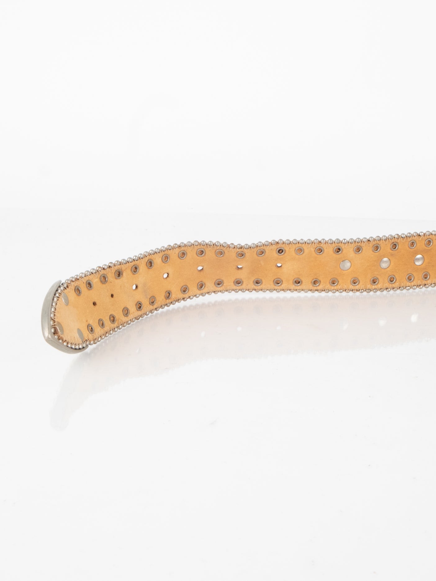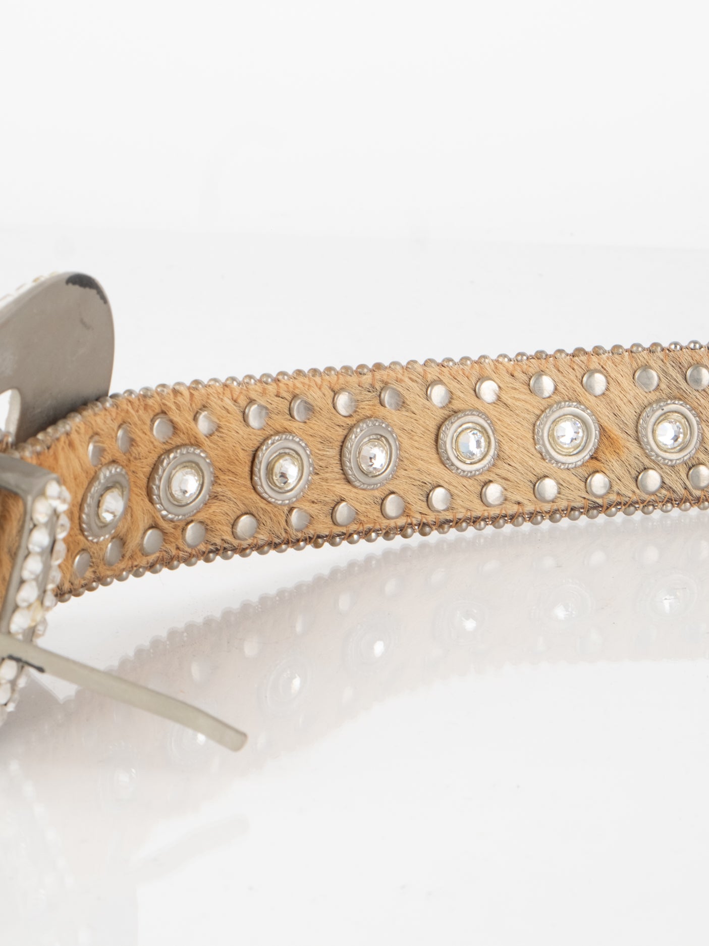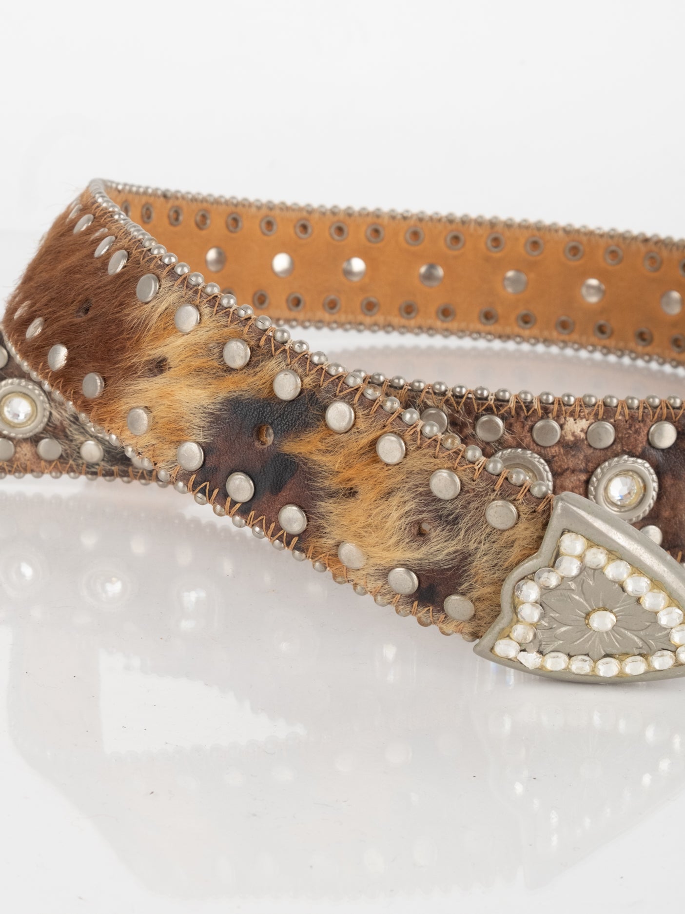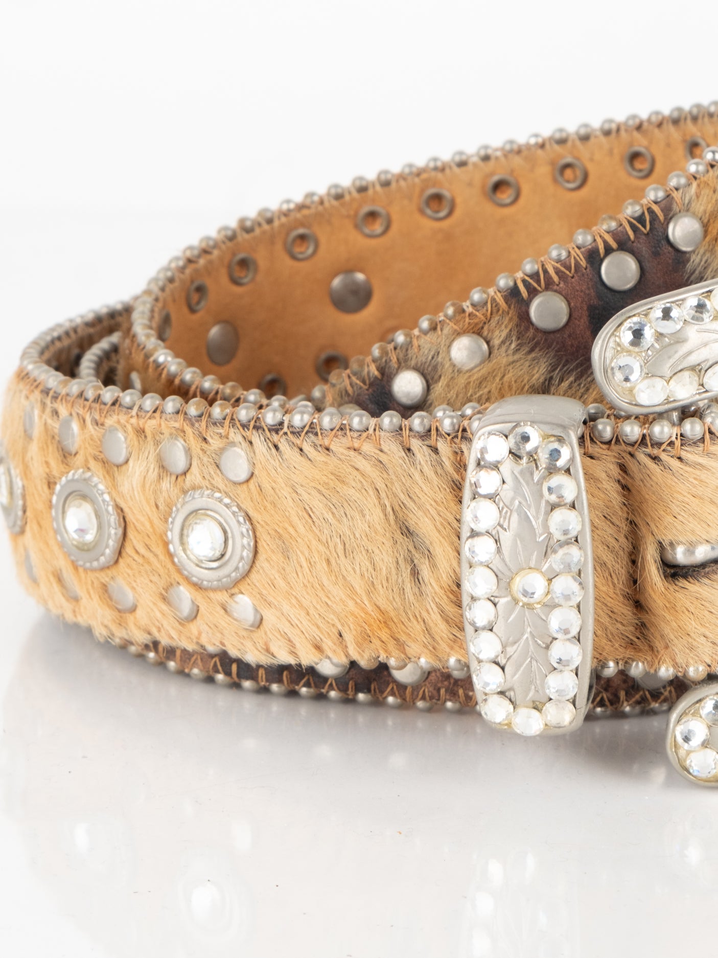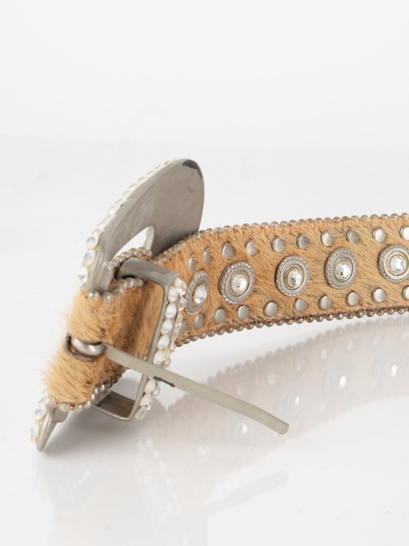 חגורה מסיבית וגדולה העשויה מעור בשילוב של פרווה בצבע חום, דיטיילים כסופים ואבנים.