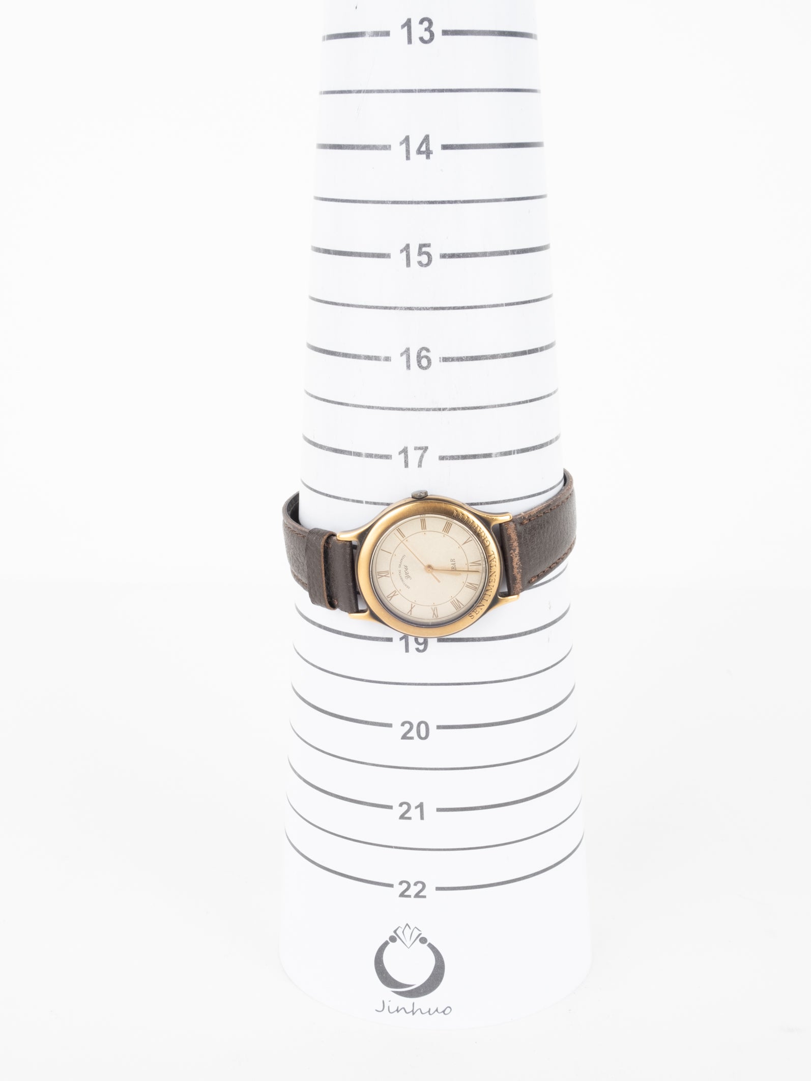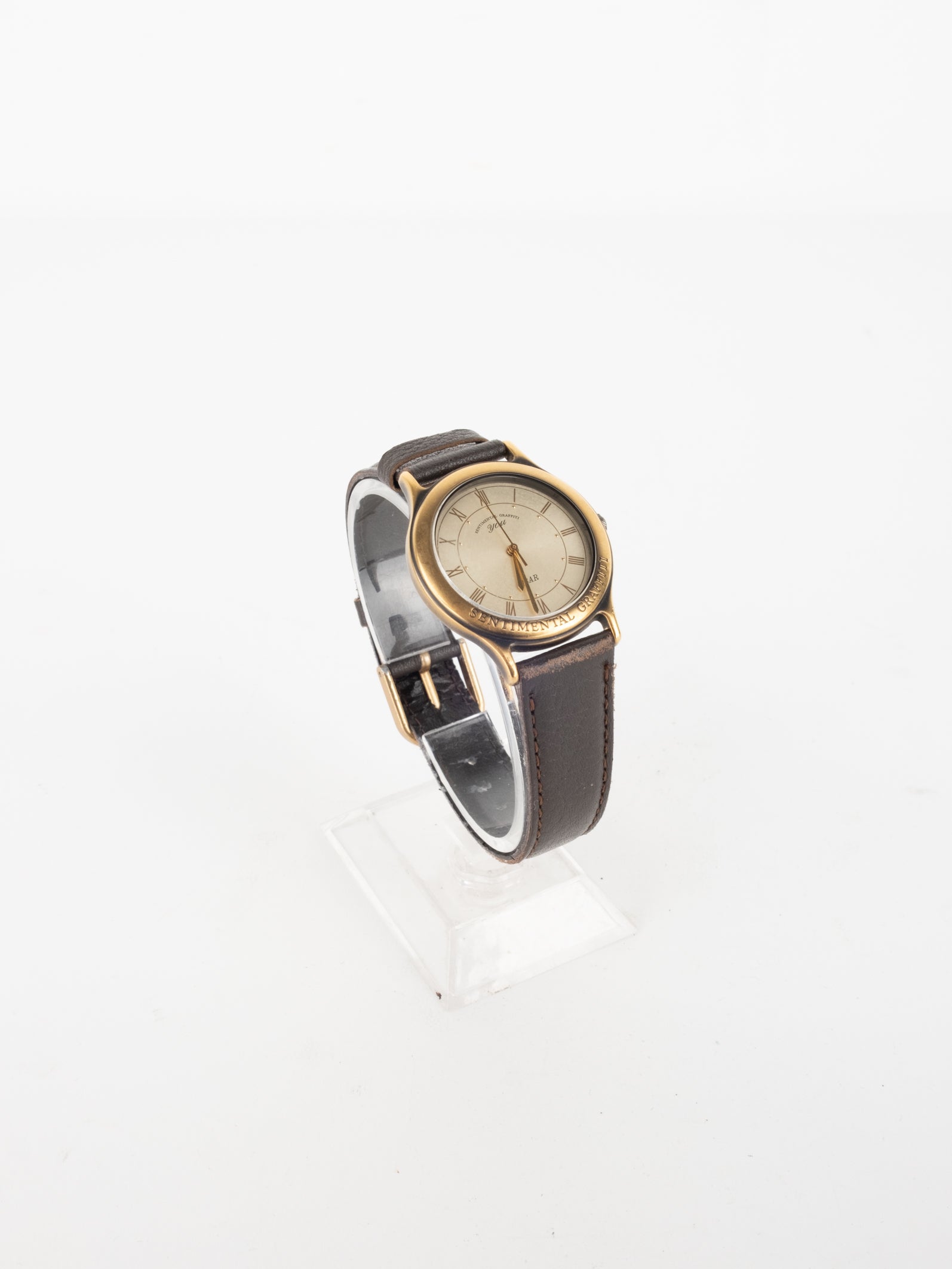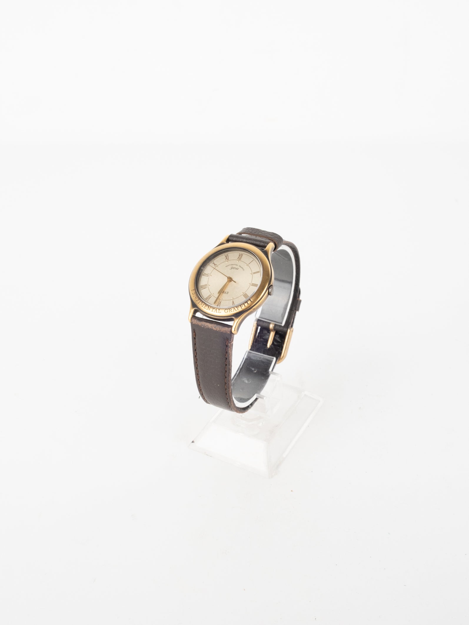 שעון קלאסי בעל פני שעון בצורה עגולה עם מסגרת מוזהבת, רקע בצבע זהה ומחוגים. שעון זה נסגר באמצעות רצועות העשויות מעור בצבע חום כהה שניתן לכוון.