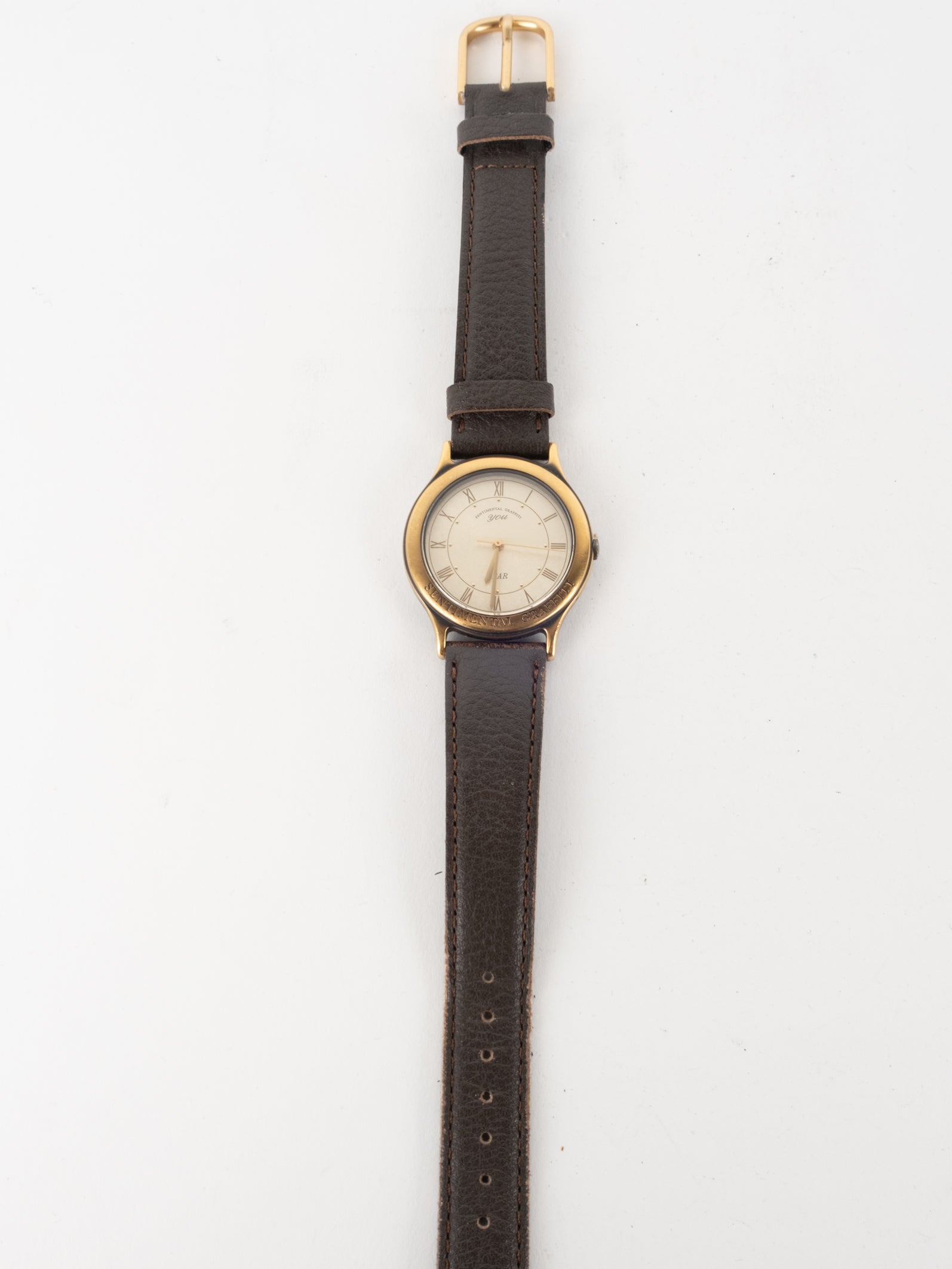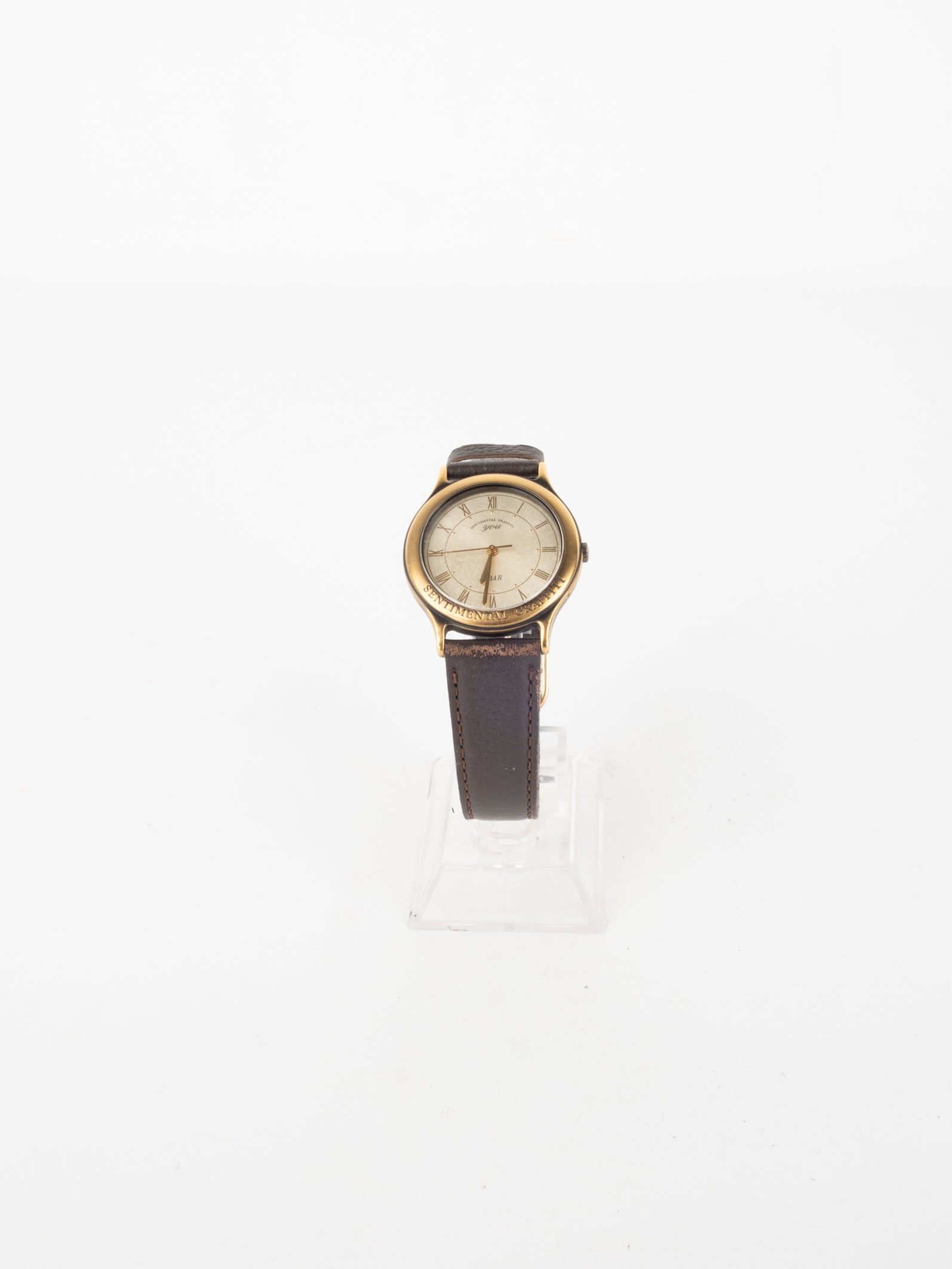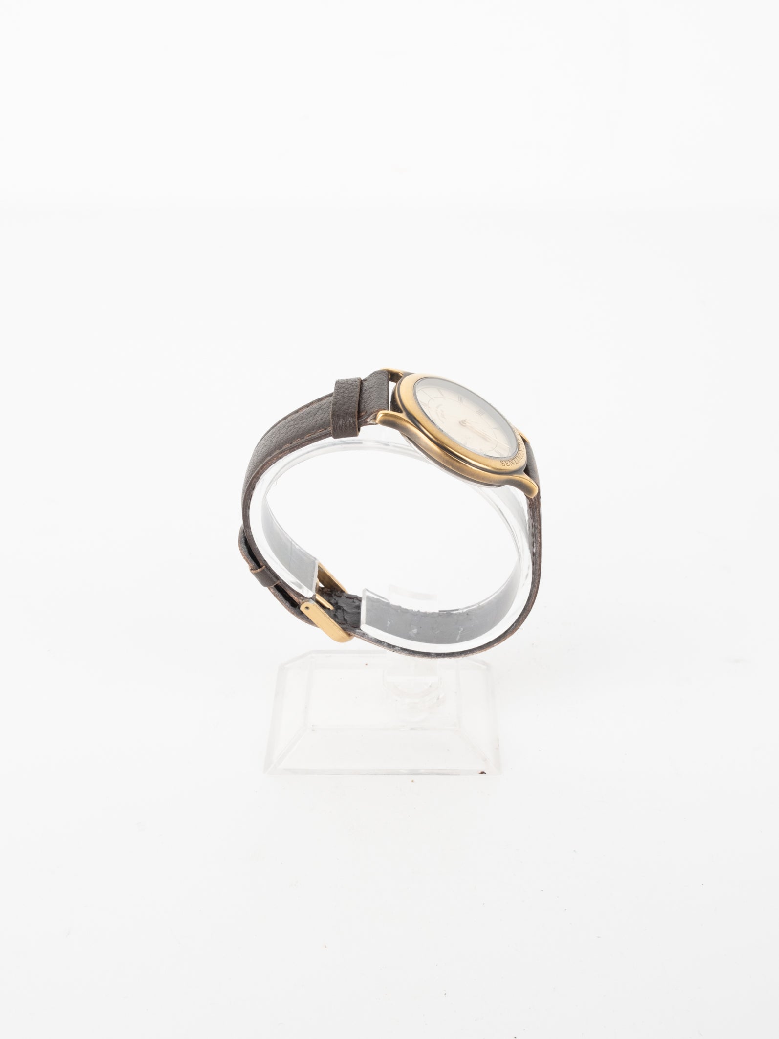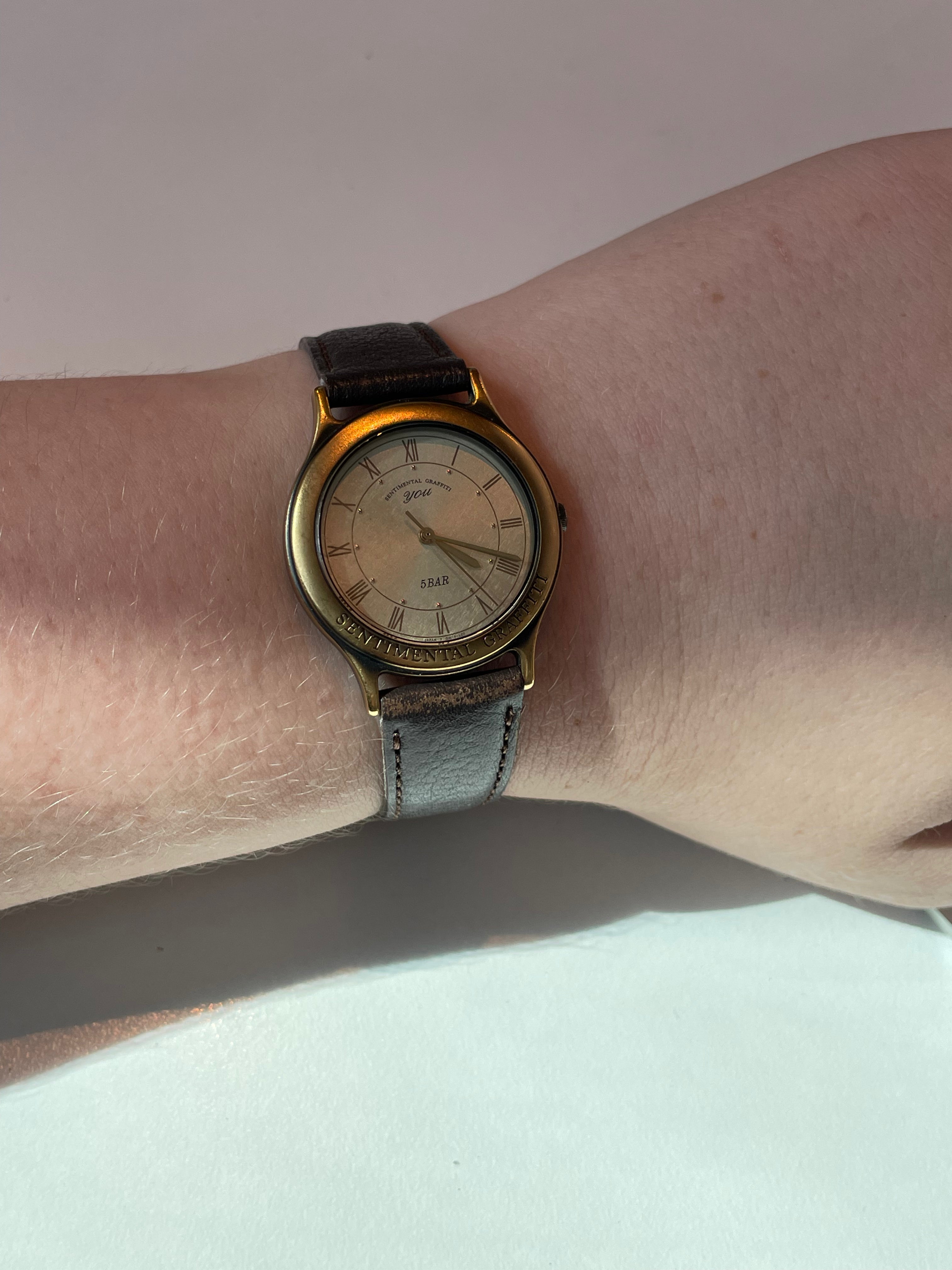 שעון קלאסי בעל פני שעון בצורה עגולה עם מסגרת מוזהבת, רקע בצבע זהה ומחוגים. שעון זה נסגר באמצעות רצועות העשויות מעור בצבע חום כהה שניתן לכוון.