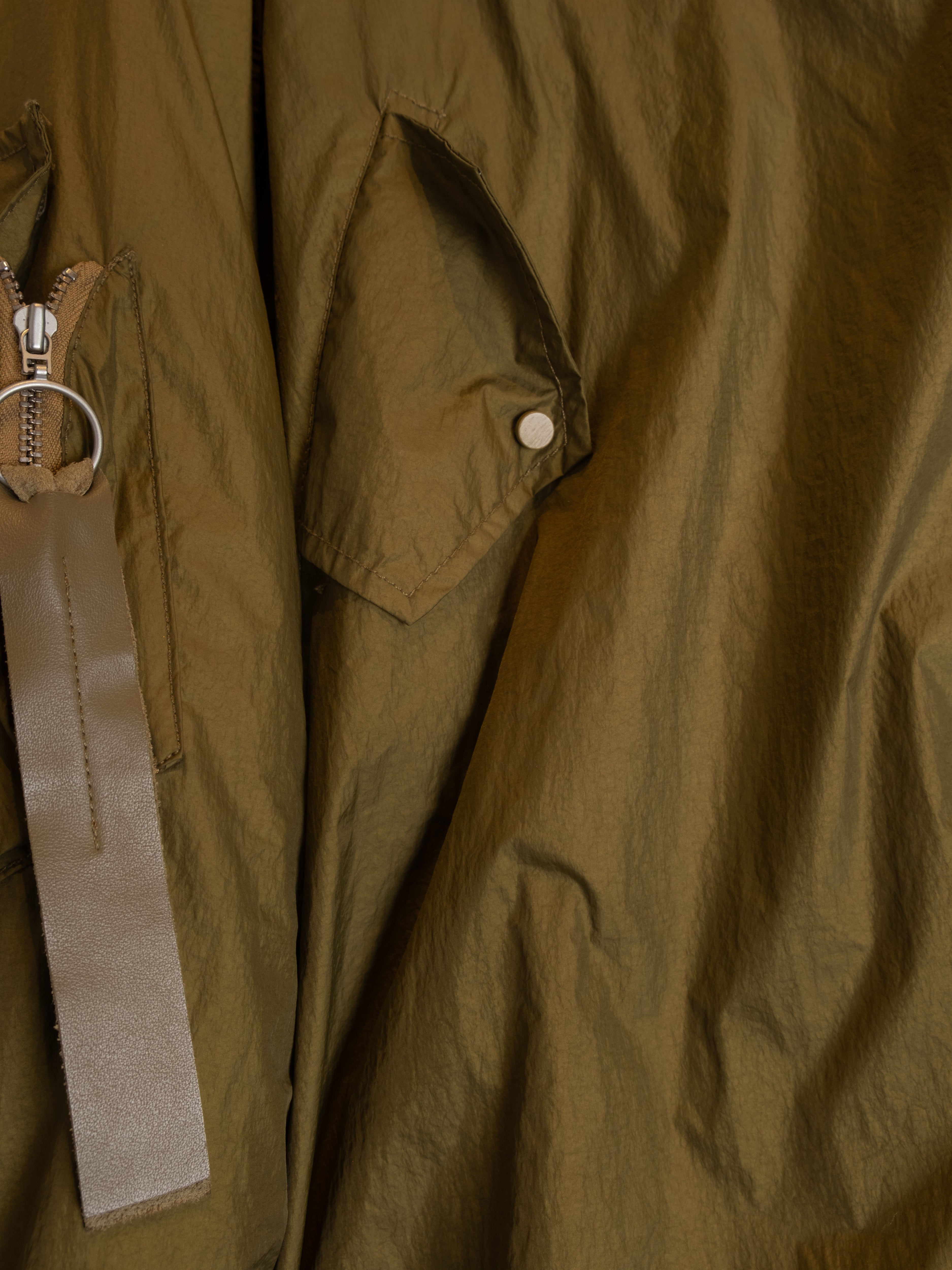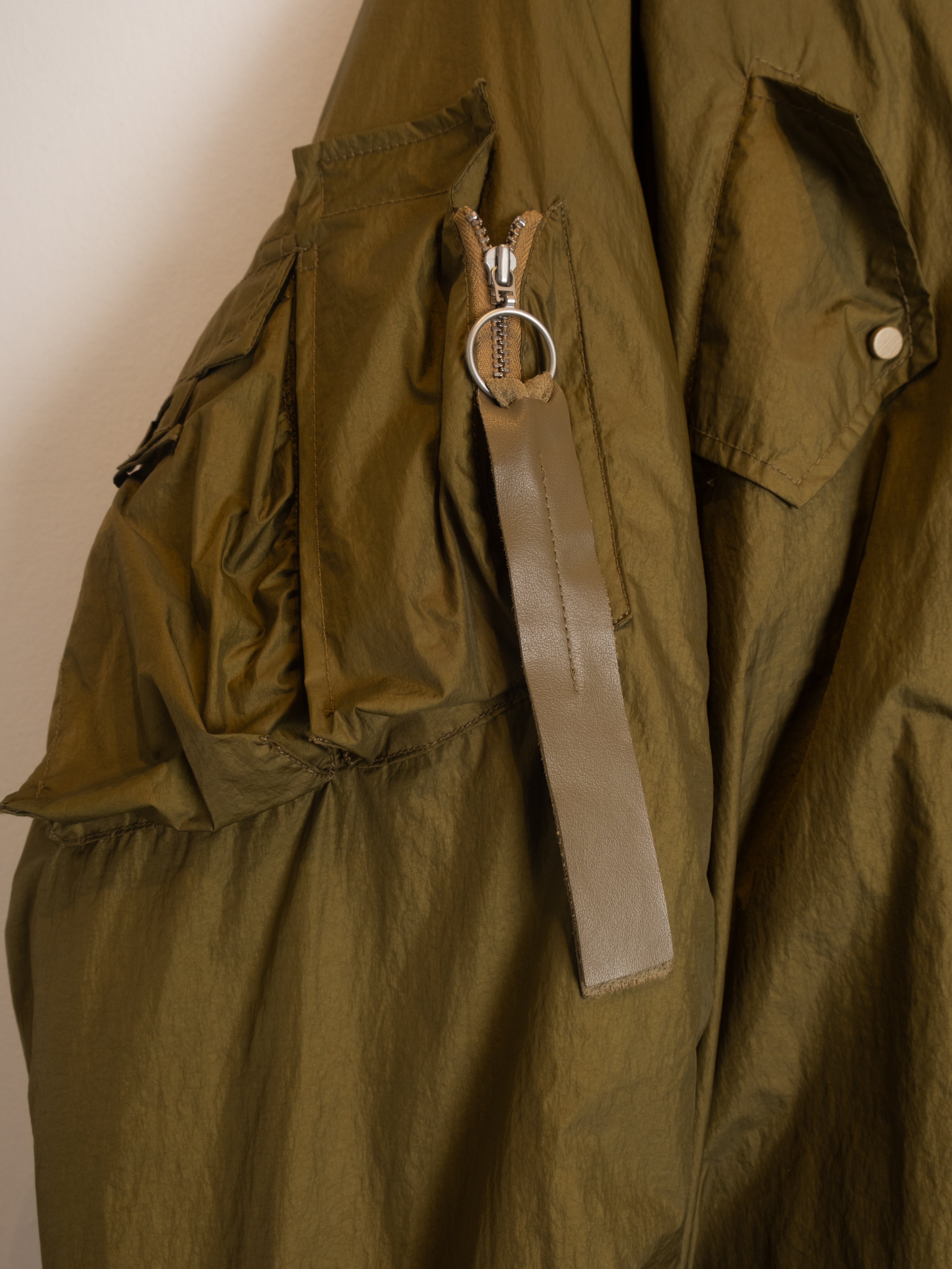• שרוולים רחבים עם כיסי צד ופרטי רוכסנים