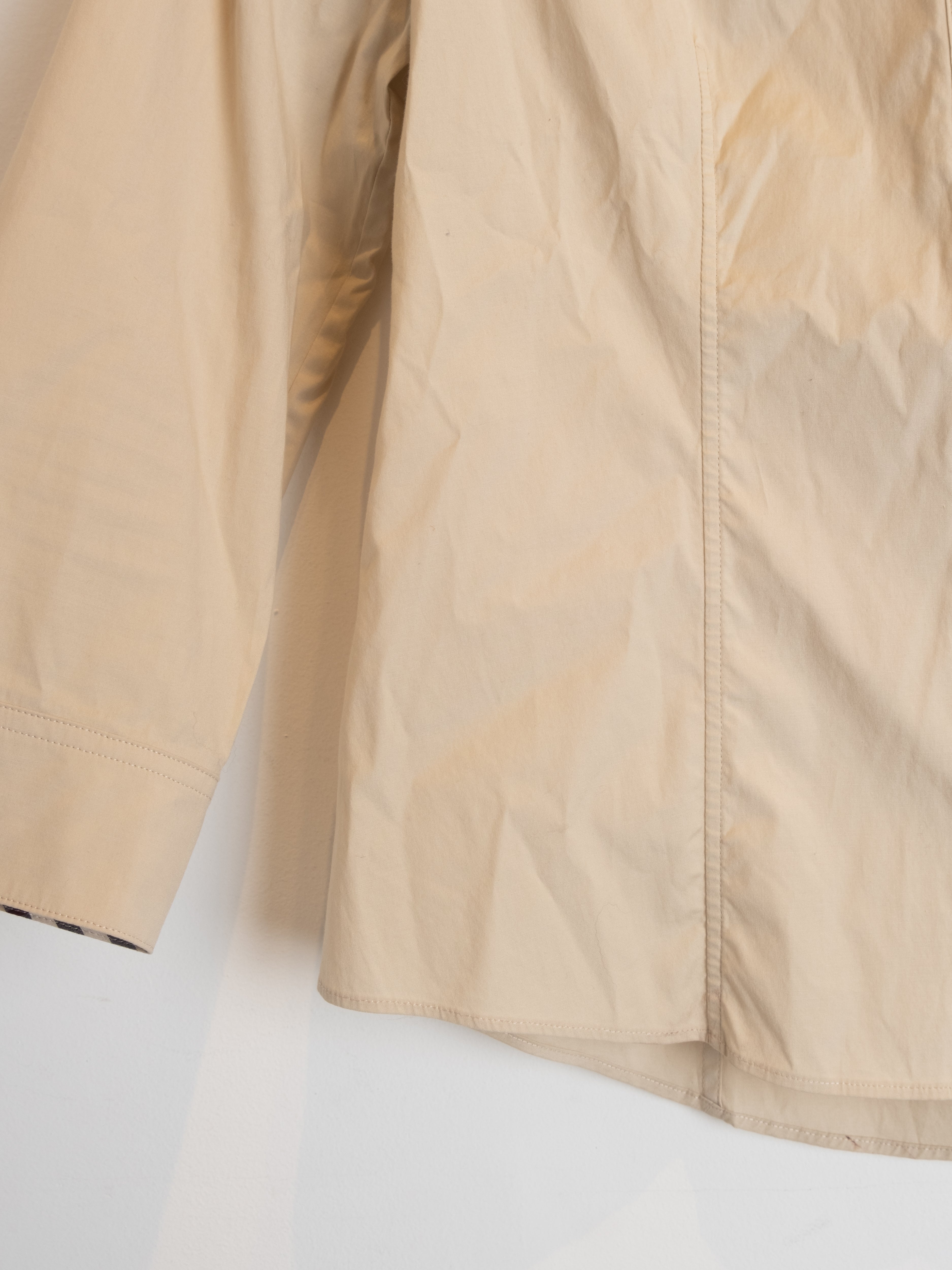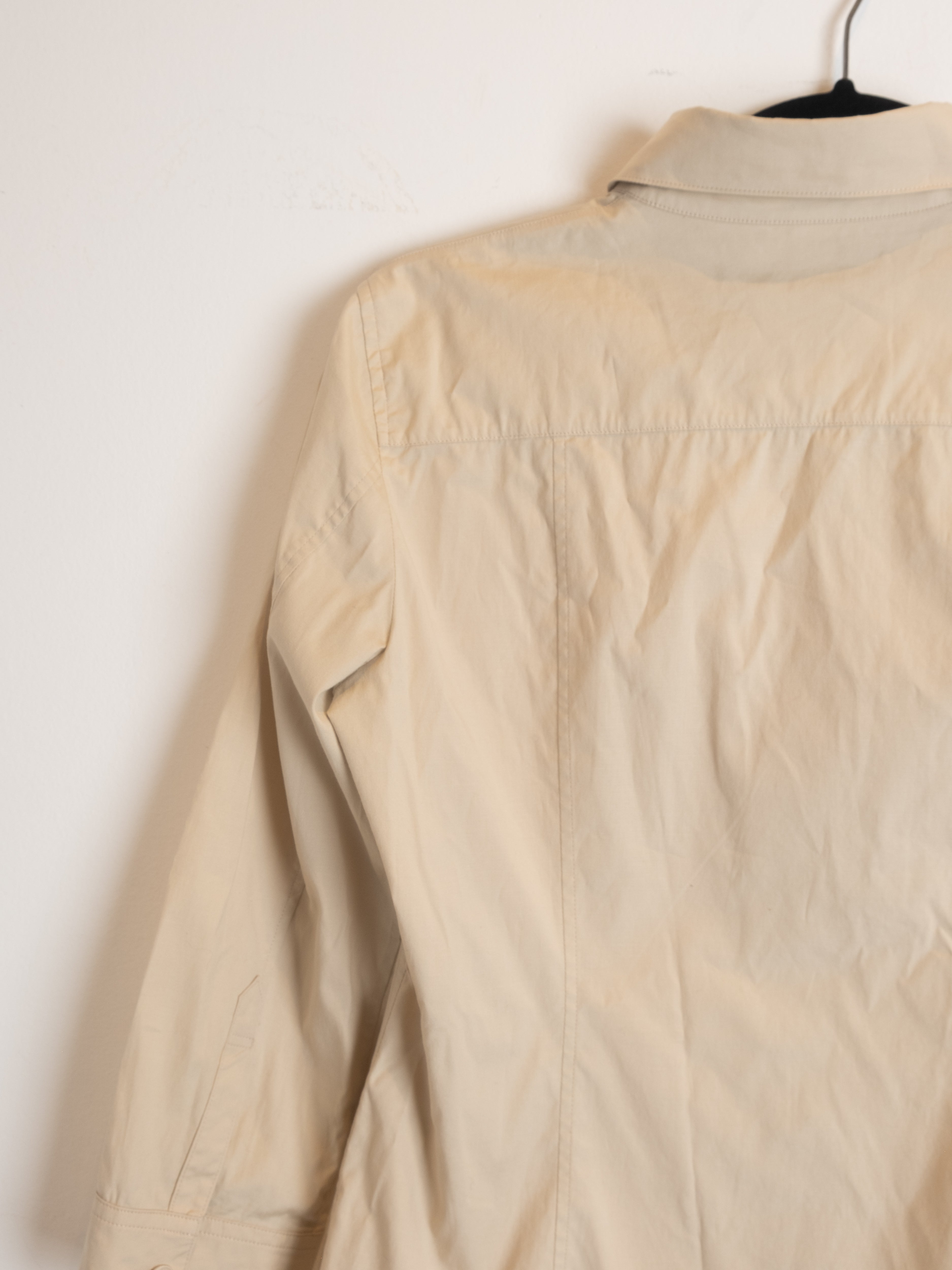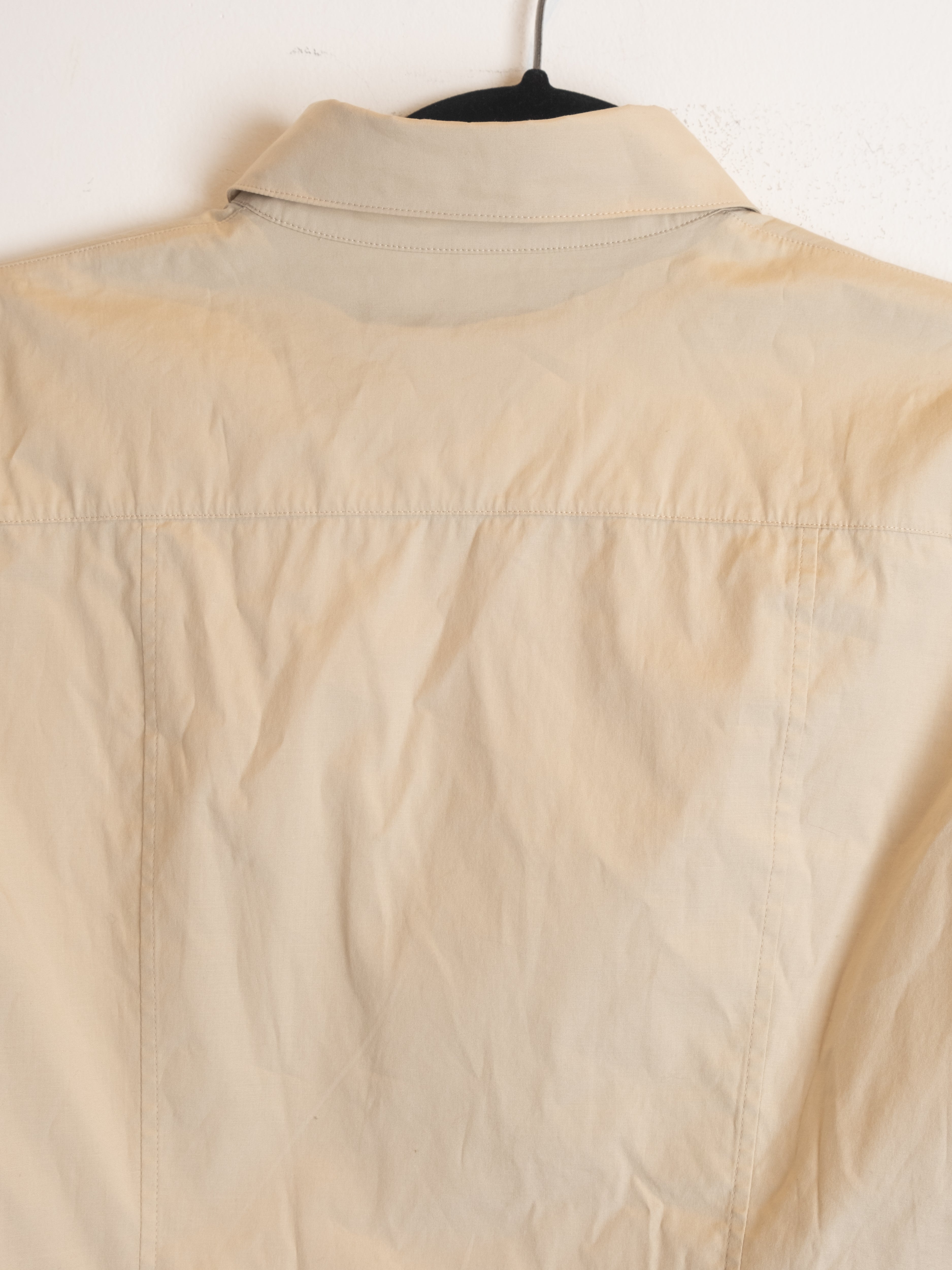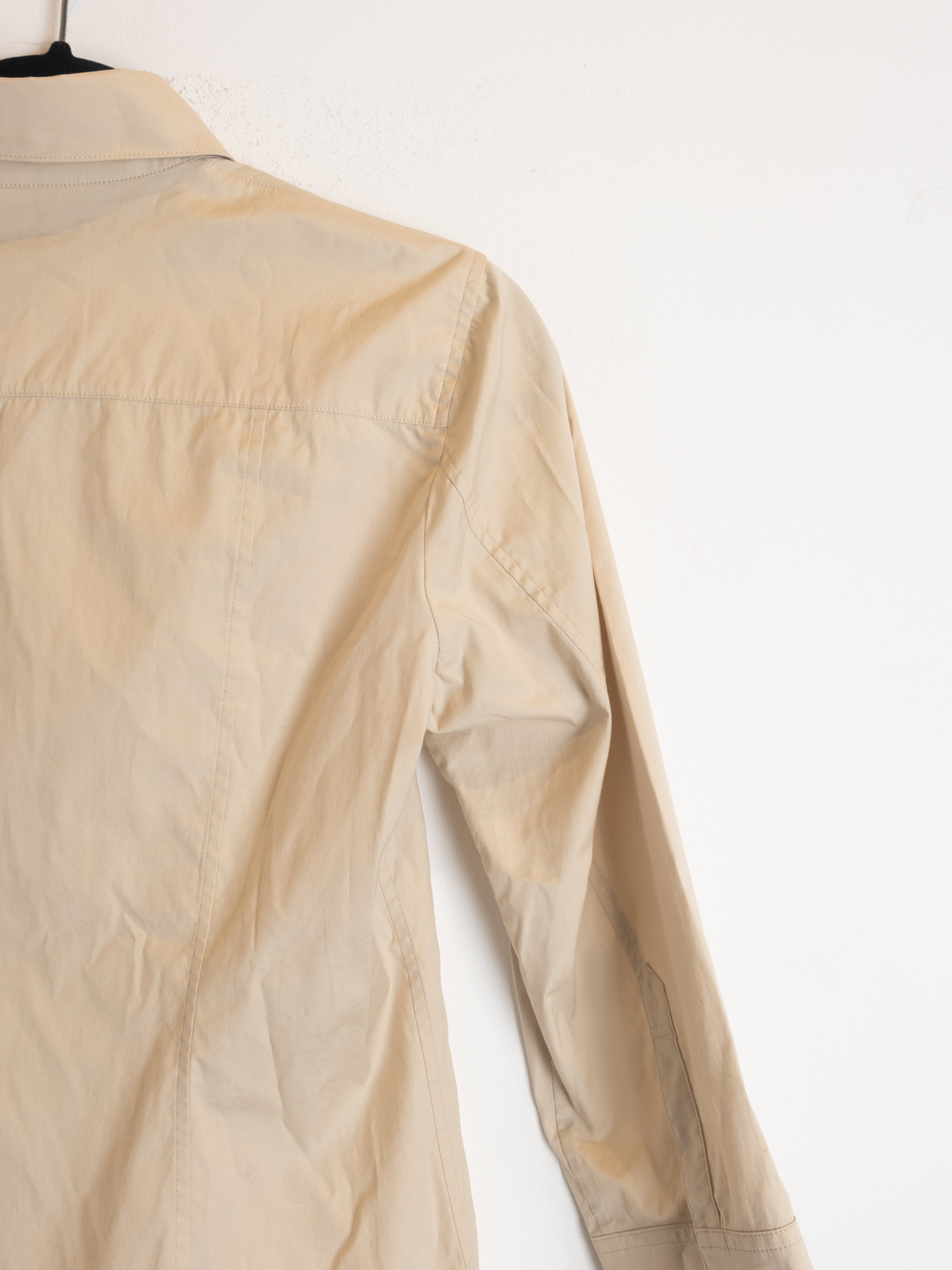 המעיל עשוי בד אריג קל בגוון חאקי.