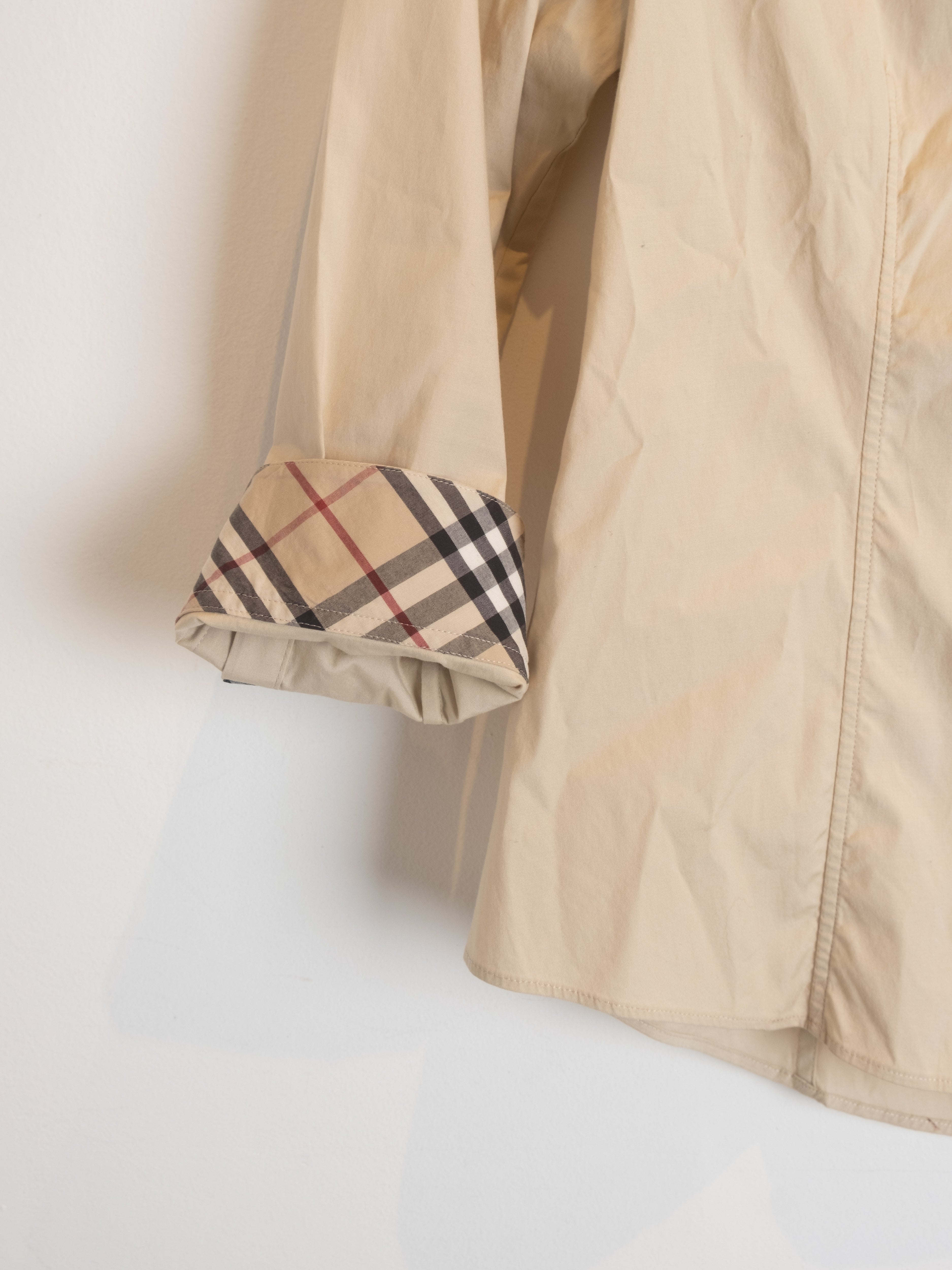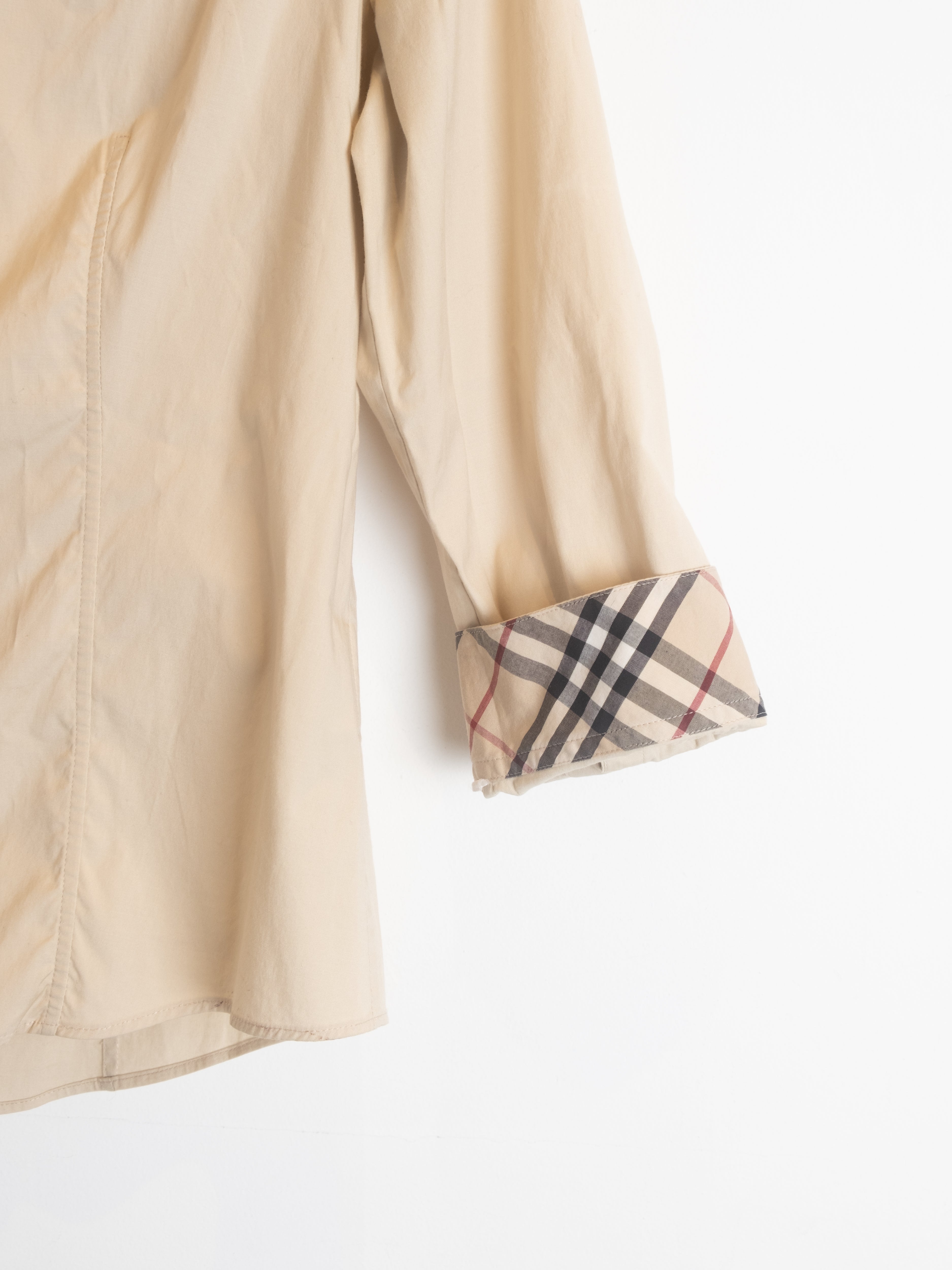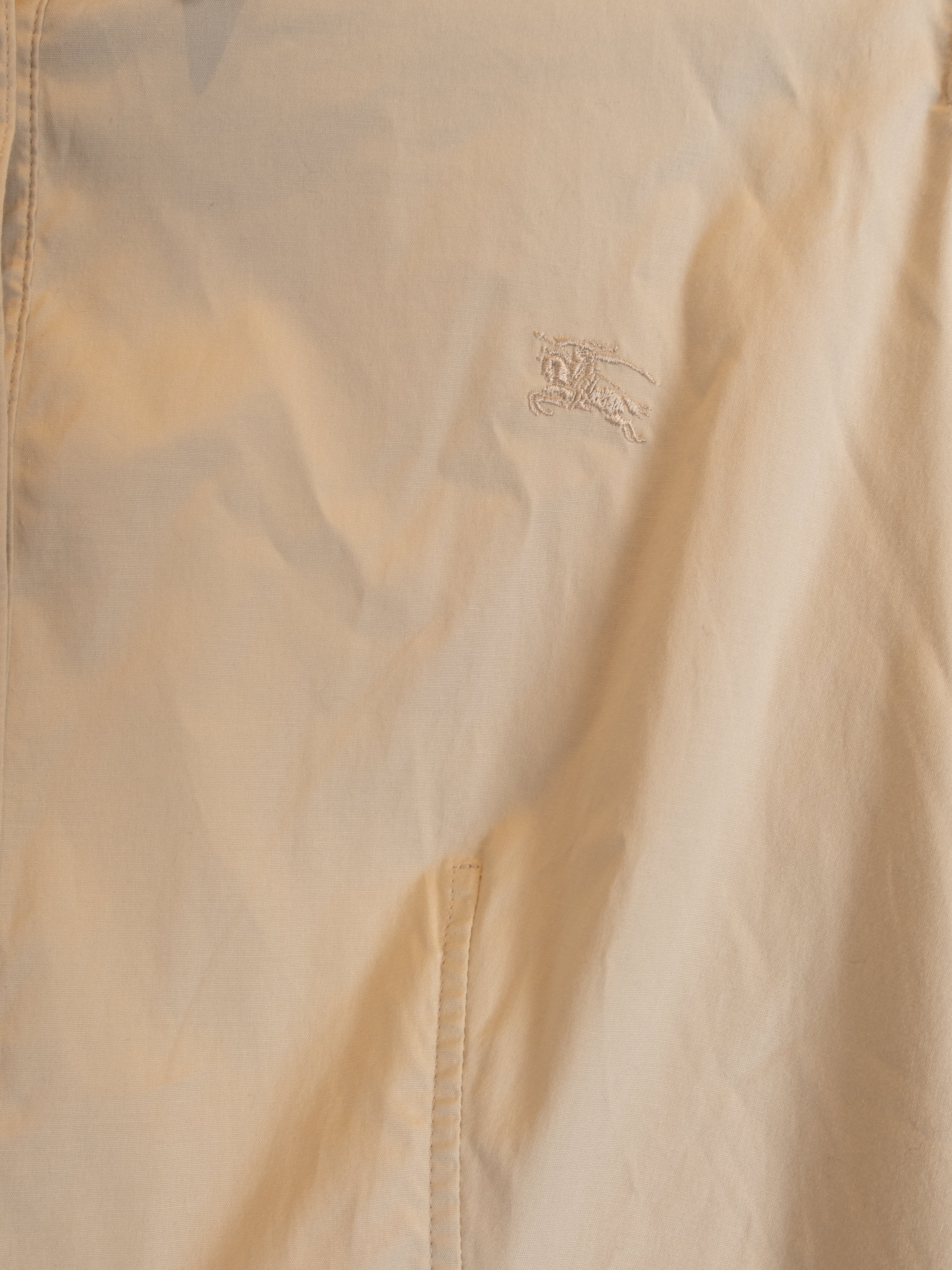 המעיל עשוי בד אריג קל בגוון חאקי.