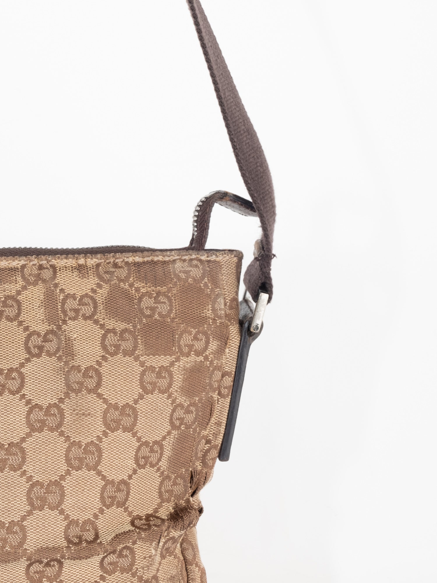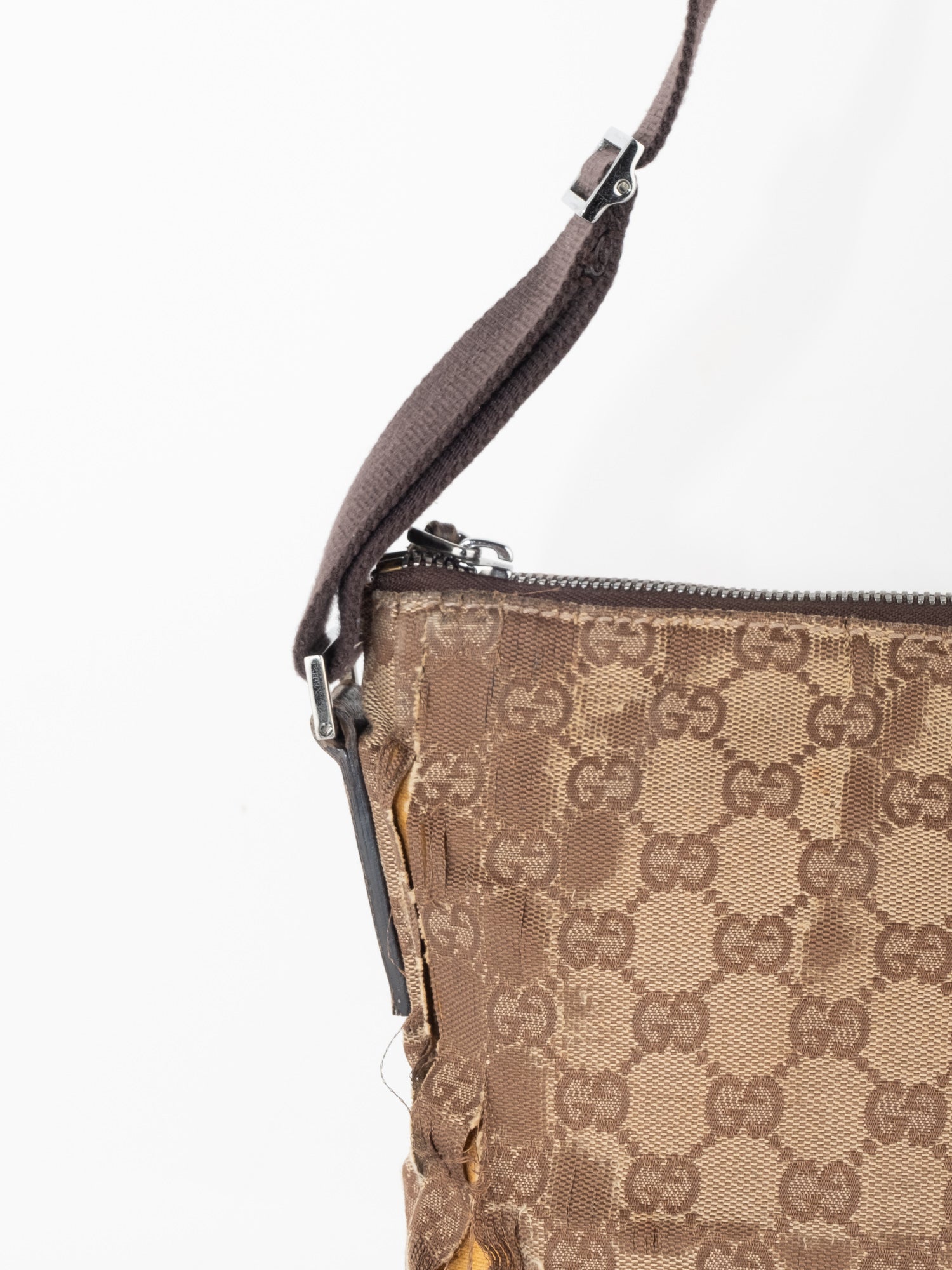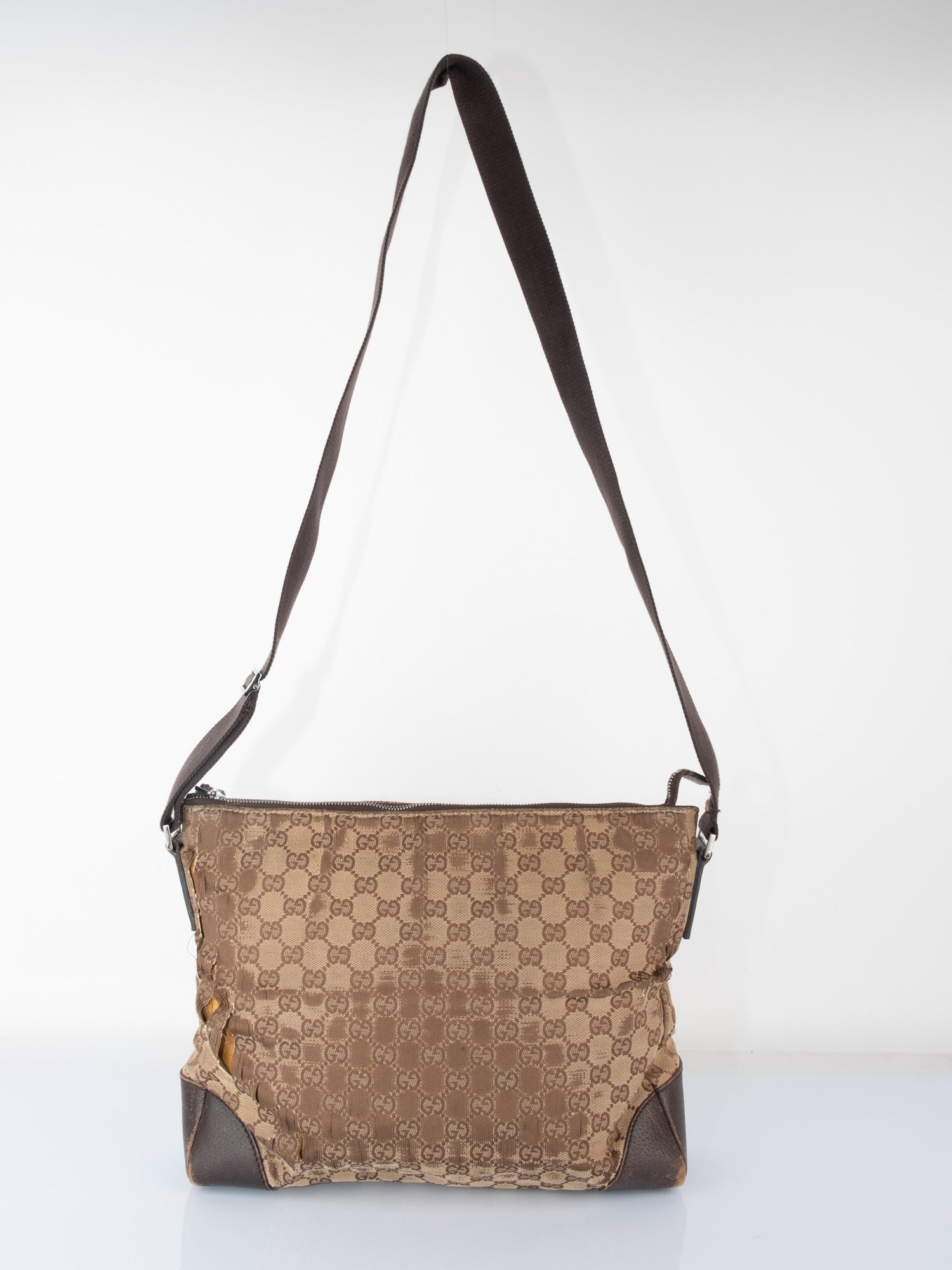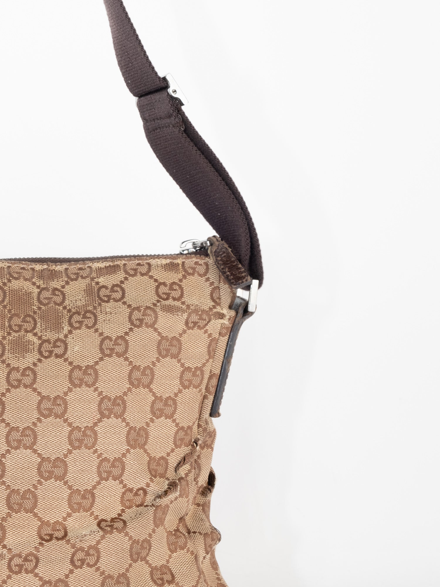 התיק עשוי קנבס בעיטור GG מונוגרמי עם רצועת עור כהה, סגירת רוכסן עליונה ותא פנימי מרופד. עיצוב צר וקל לנשיאה, מתאים לשימוש יומיומי או למראה קז׳ואלי אלגנטי.