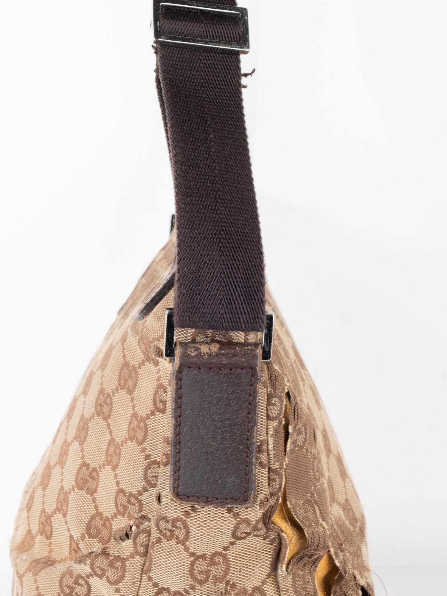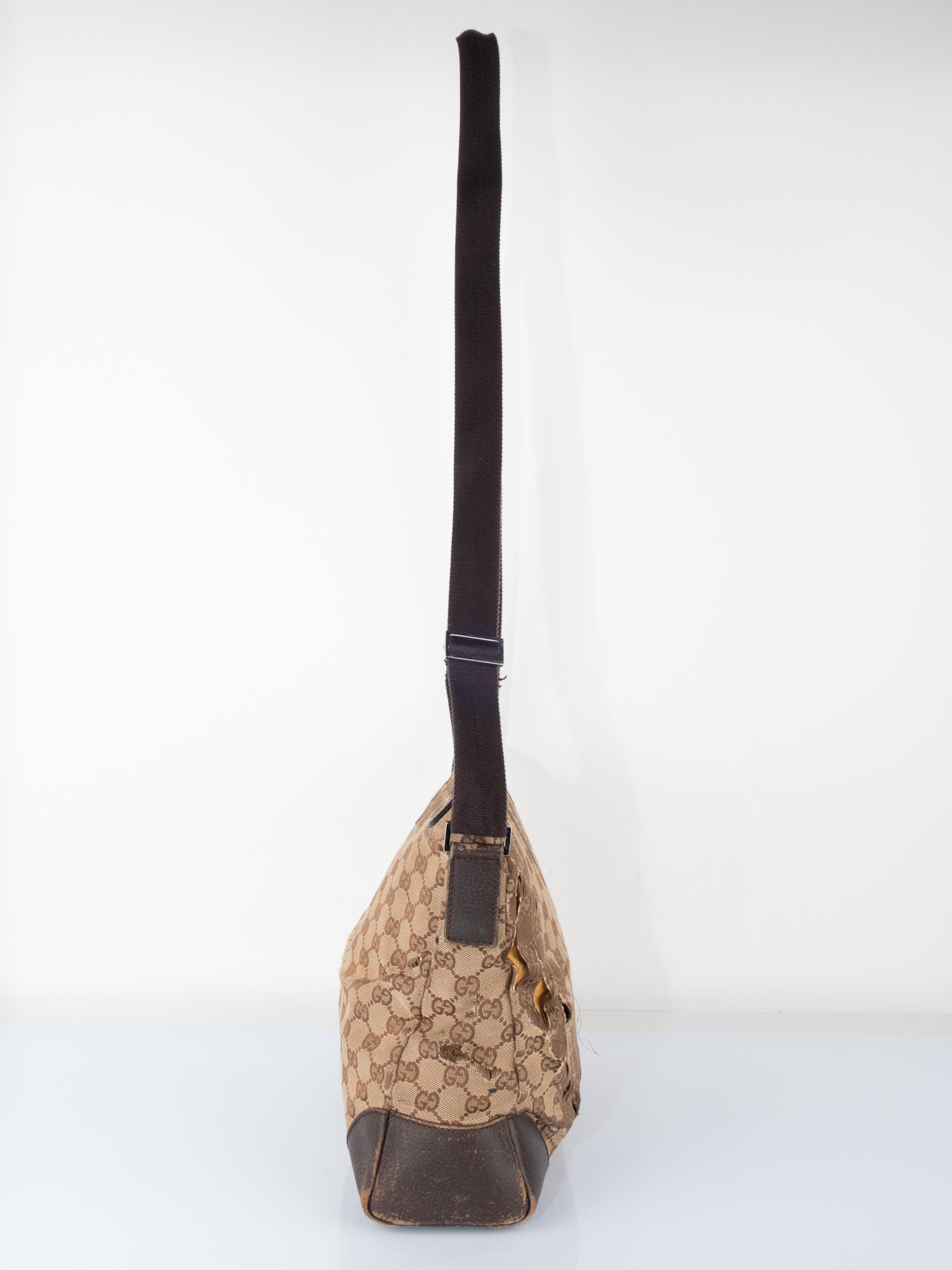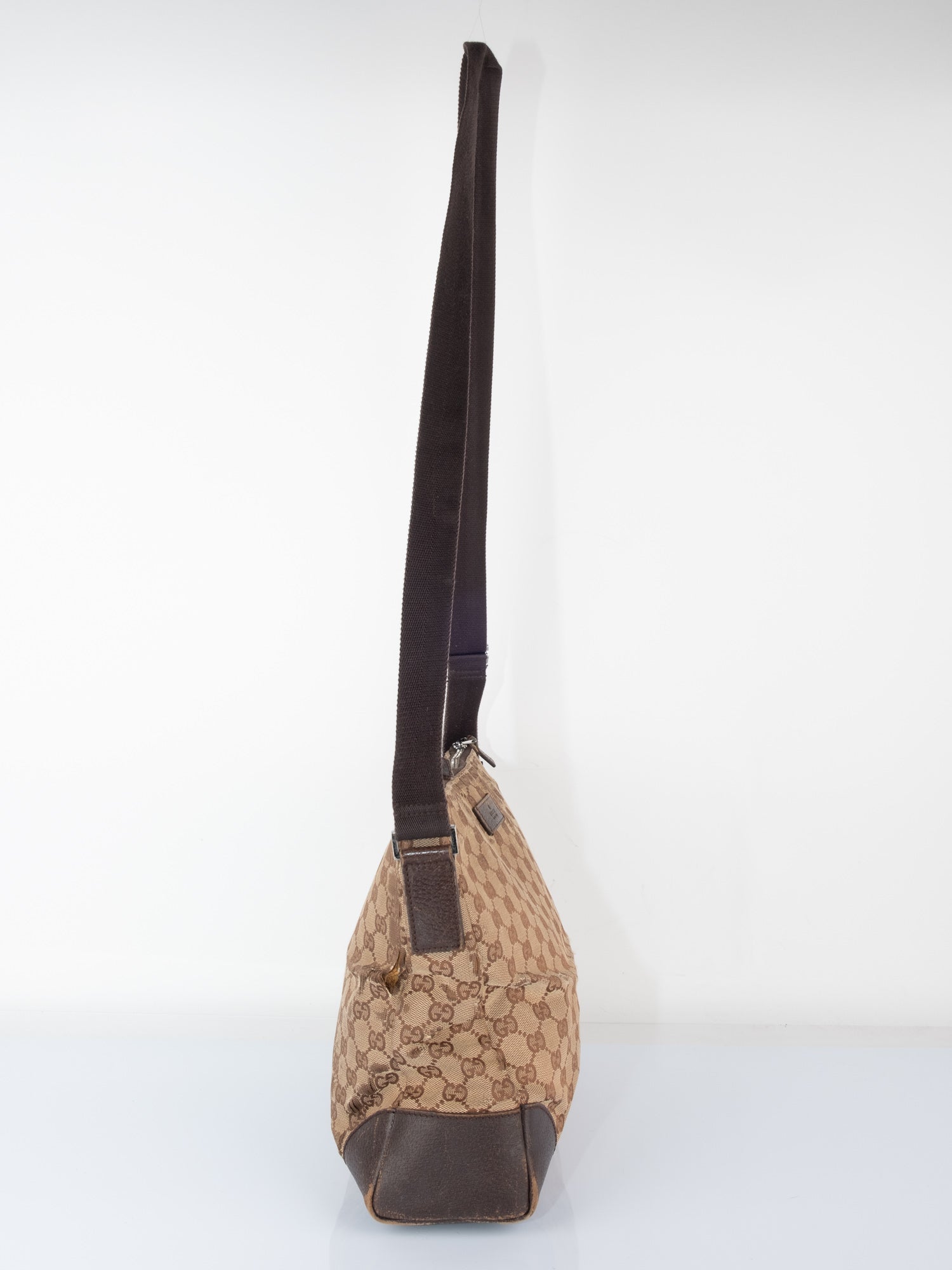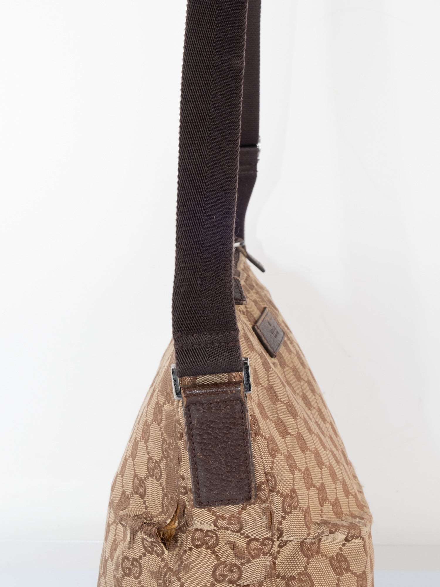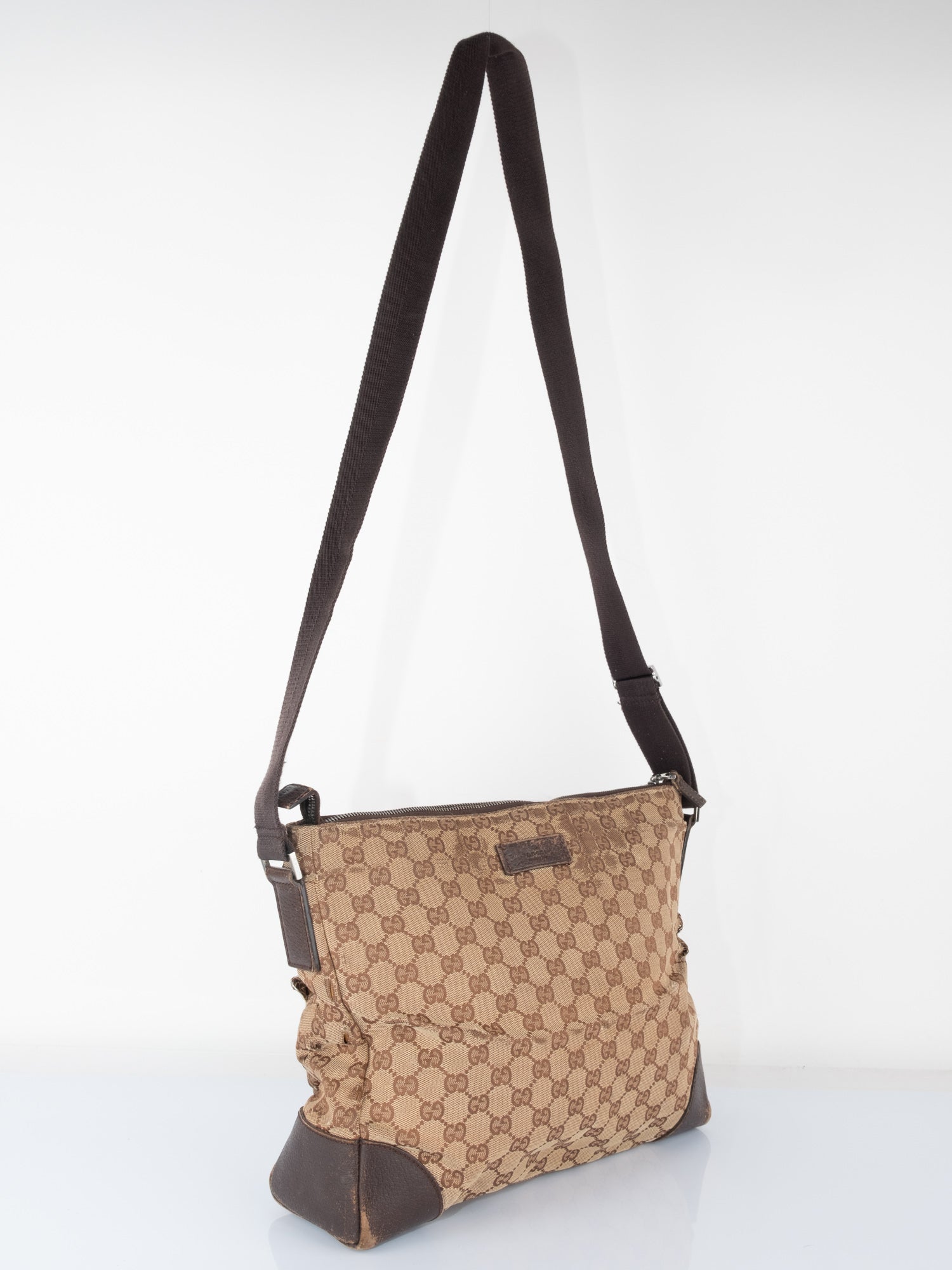 התיק עשוי קנבס בעיטור GG מונוגרמי עם רצועת עור כהה, סגירת רוכסן עליונה ותא פנימי מרופד. עיצוב צר וקל לנשיאה, מתאים לשימוש יומיומי או למראה קז׳ואלי אלגנטי.