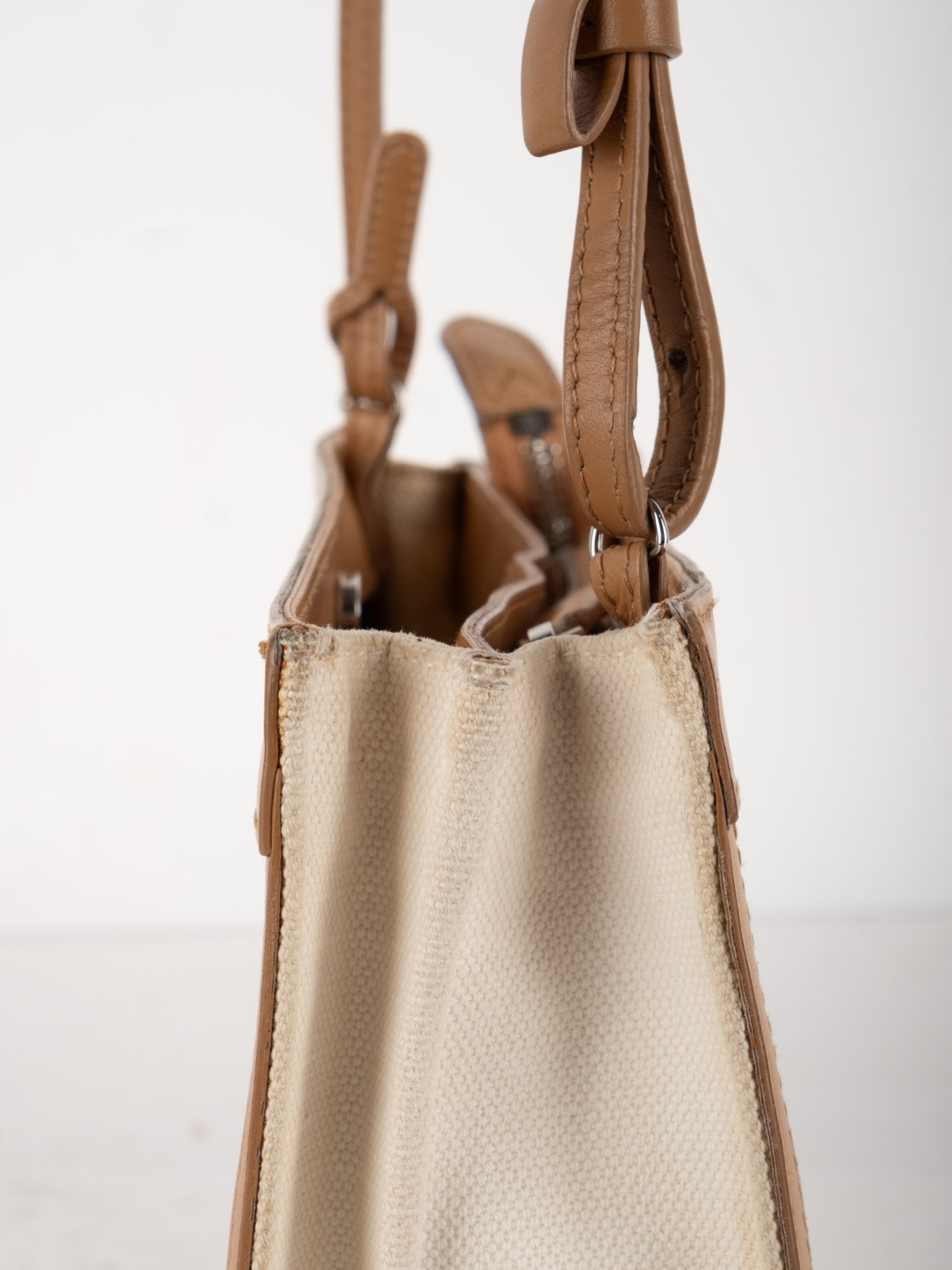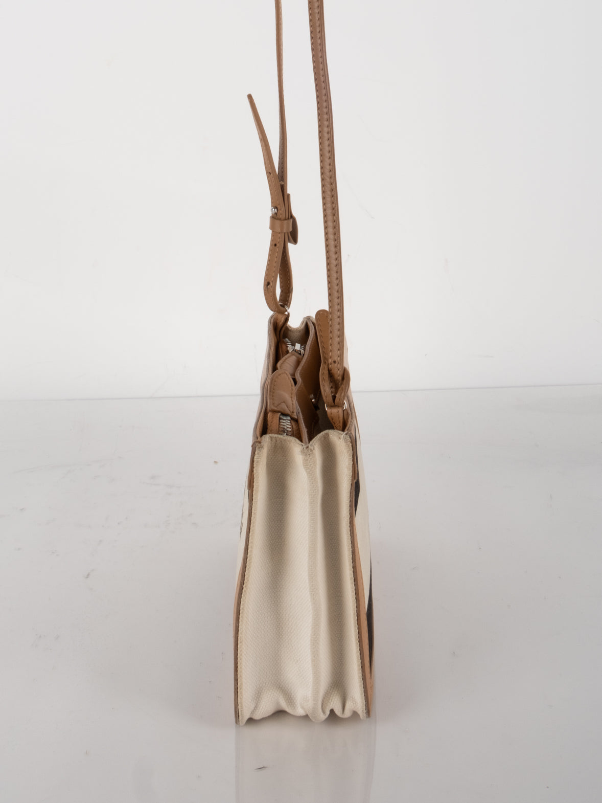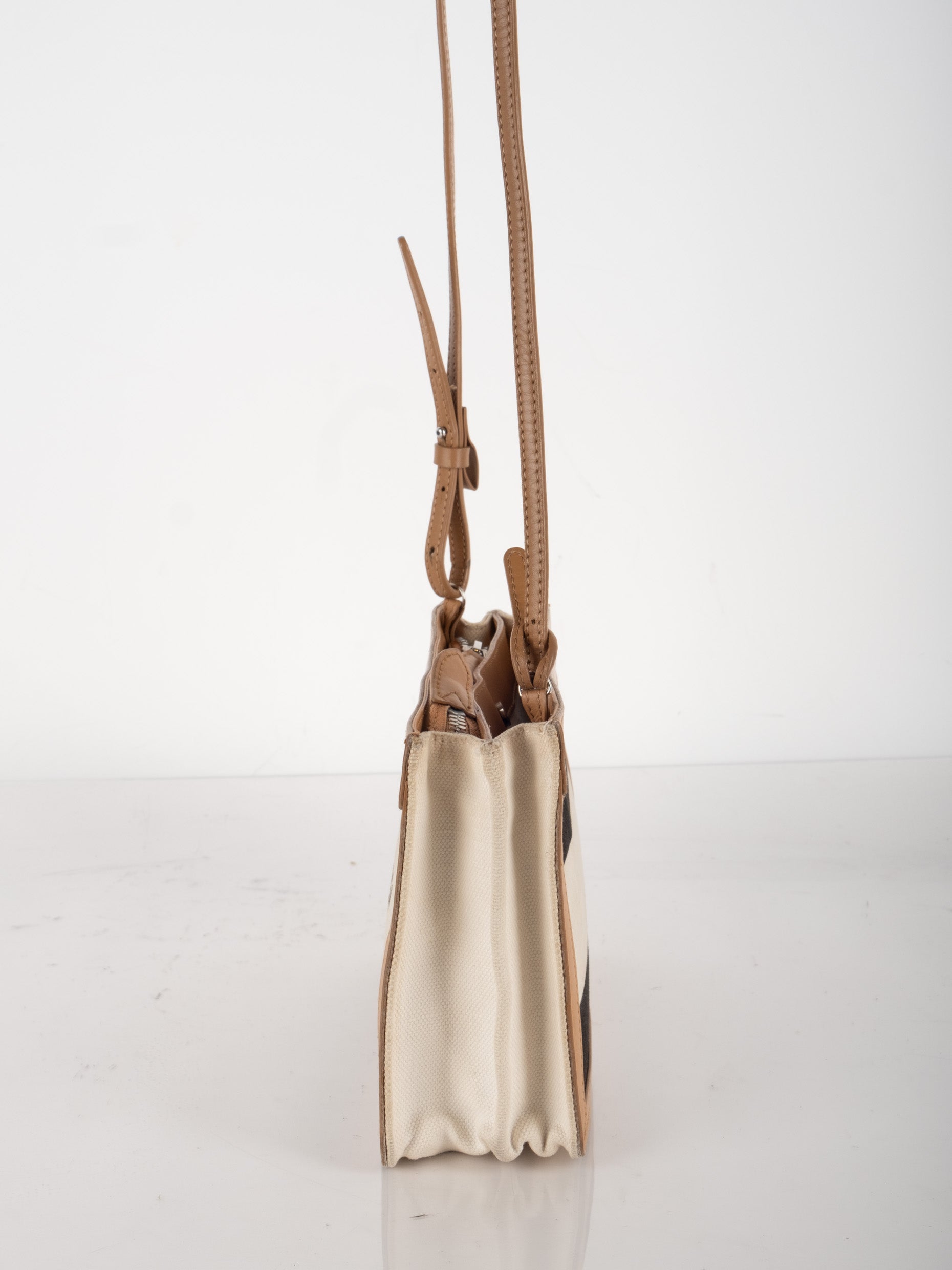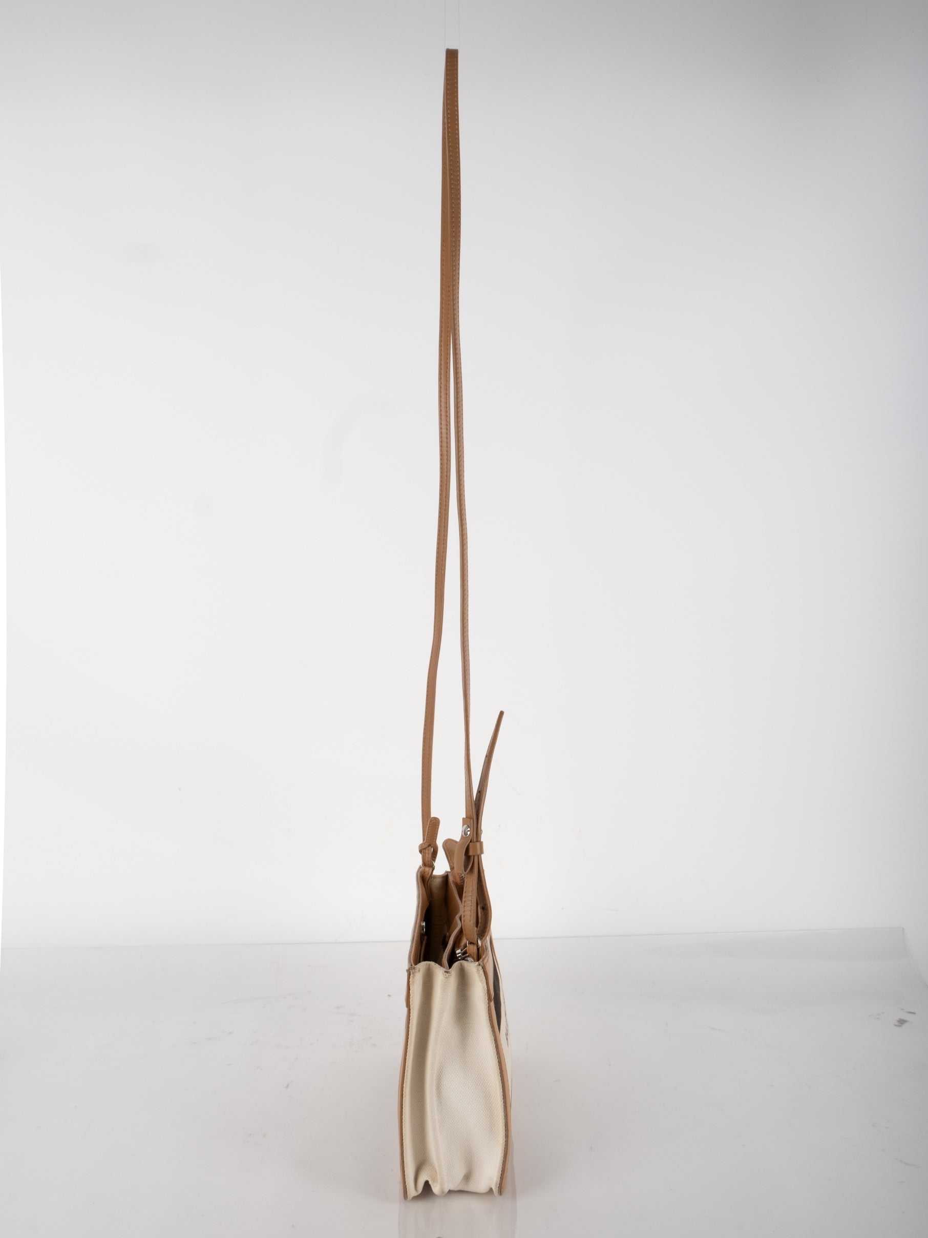 תיק כתף (מתאים לקרוסבודי) העשוי מקנבס בצבע בז׳ בשילוב של עור בצבע קאמל, בעל רצועה ארוכה דקה שניתן לכוון או להוציא באמצעות דיטיילים כסופים במידת הצורך. תיק זה בעל שני תאים מרכזיים כאשר הראשון נסגר באמצעות רוכסן ועוד תא פנימי ללא סגירה בתוכו ותא נוסף נסגר באמצעות כפתור תיק-תק כסוף.