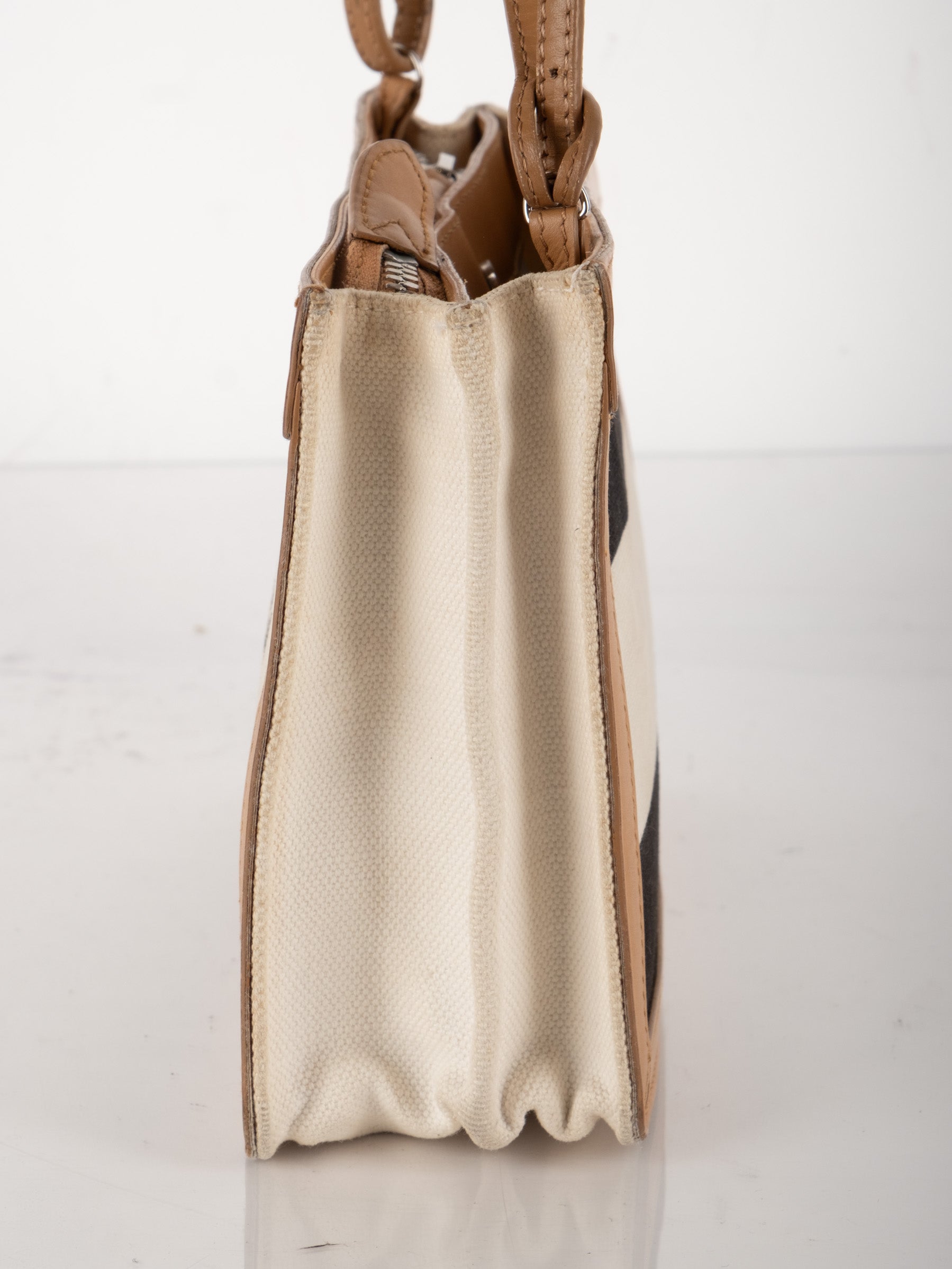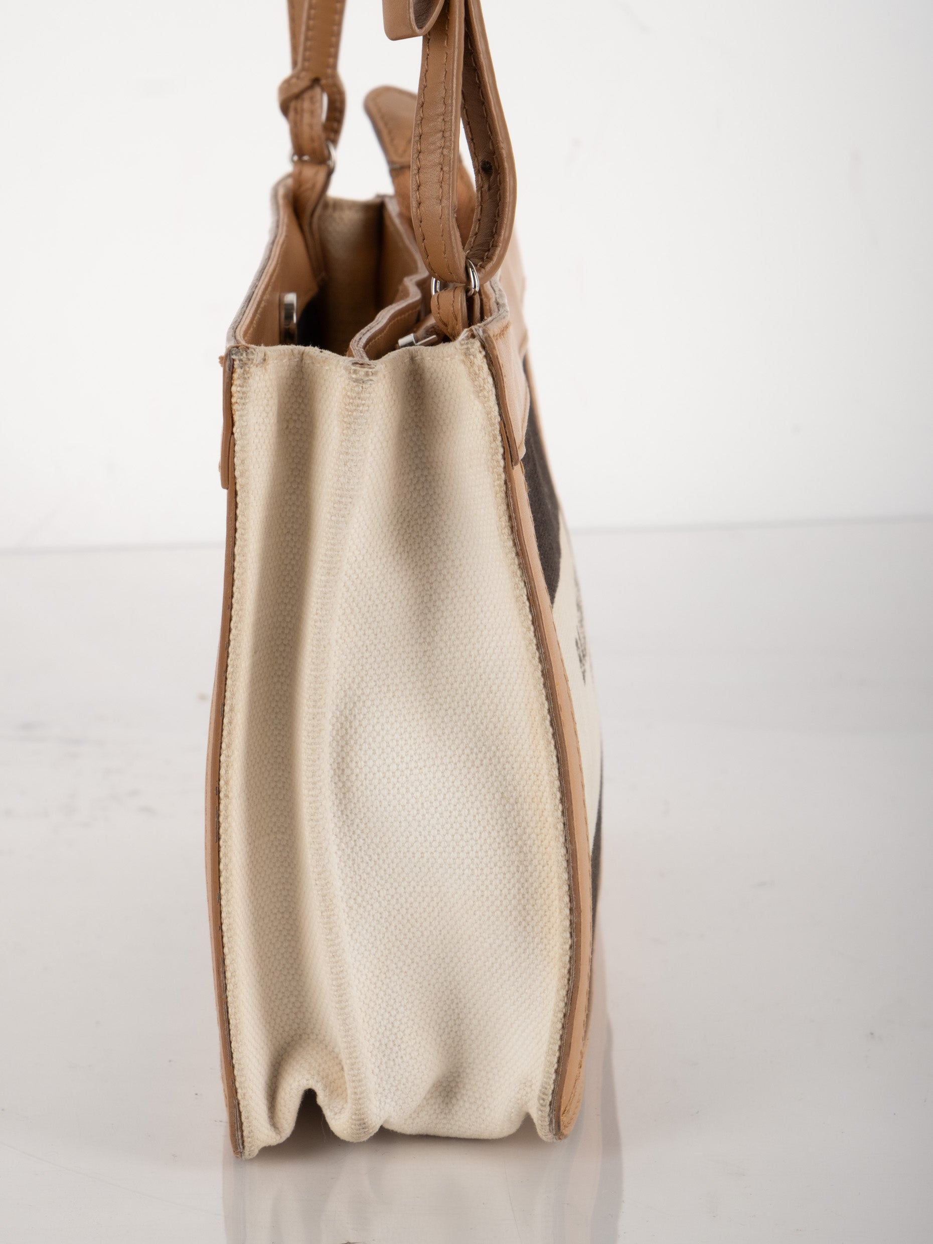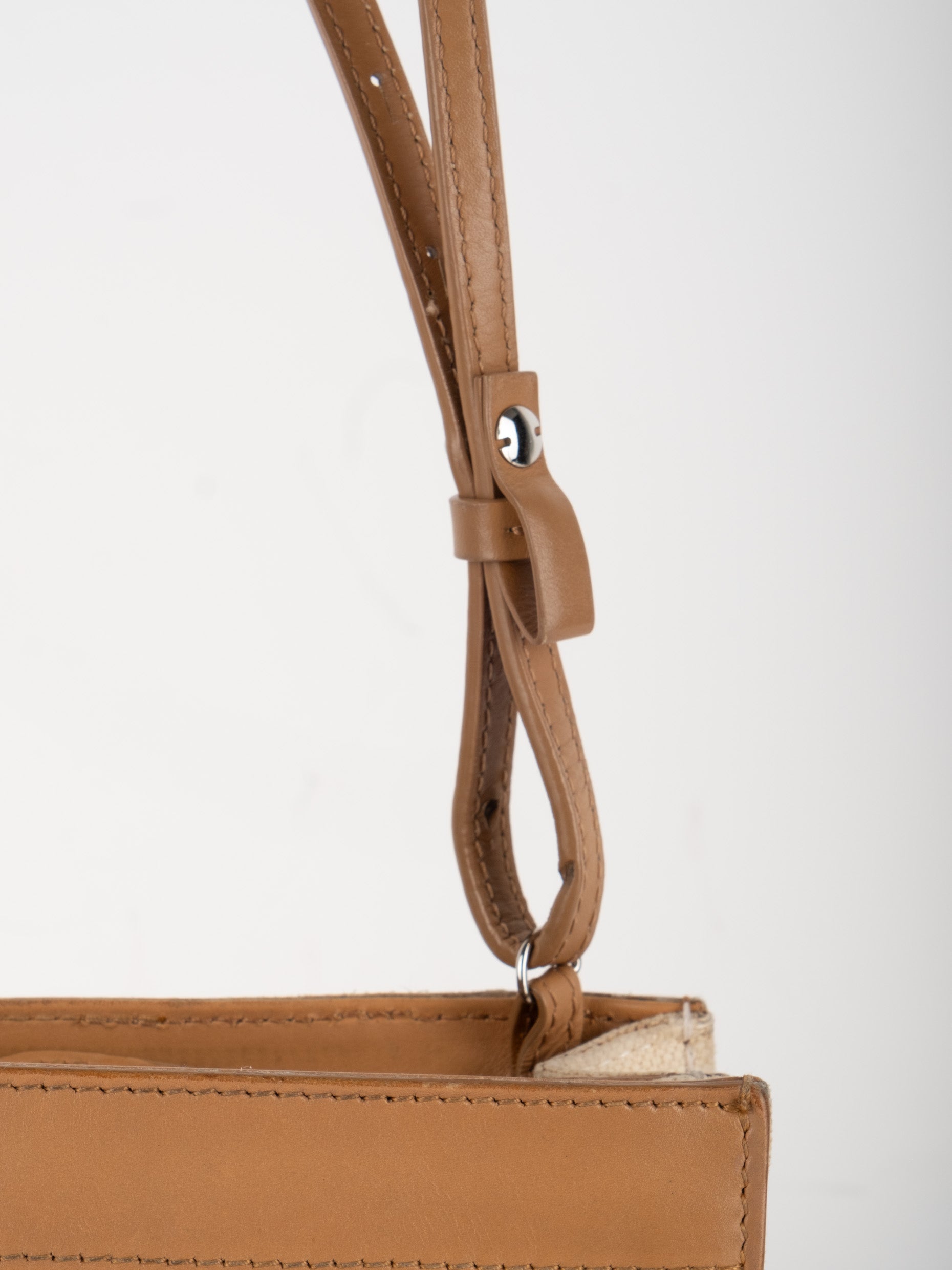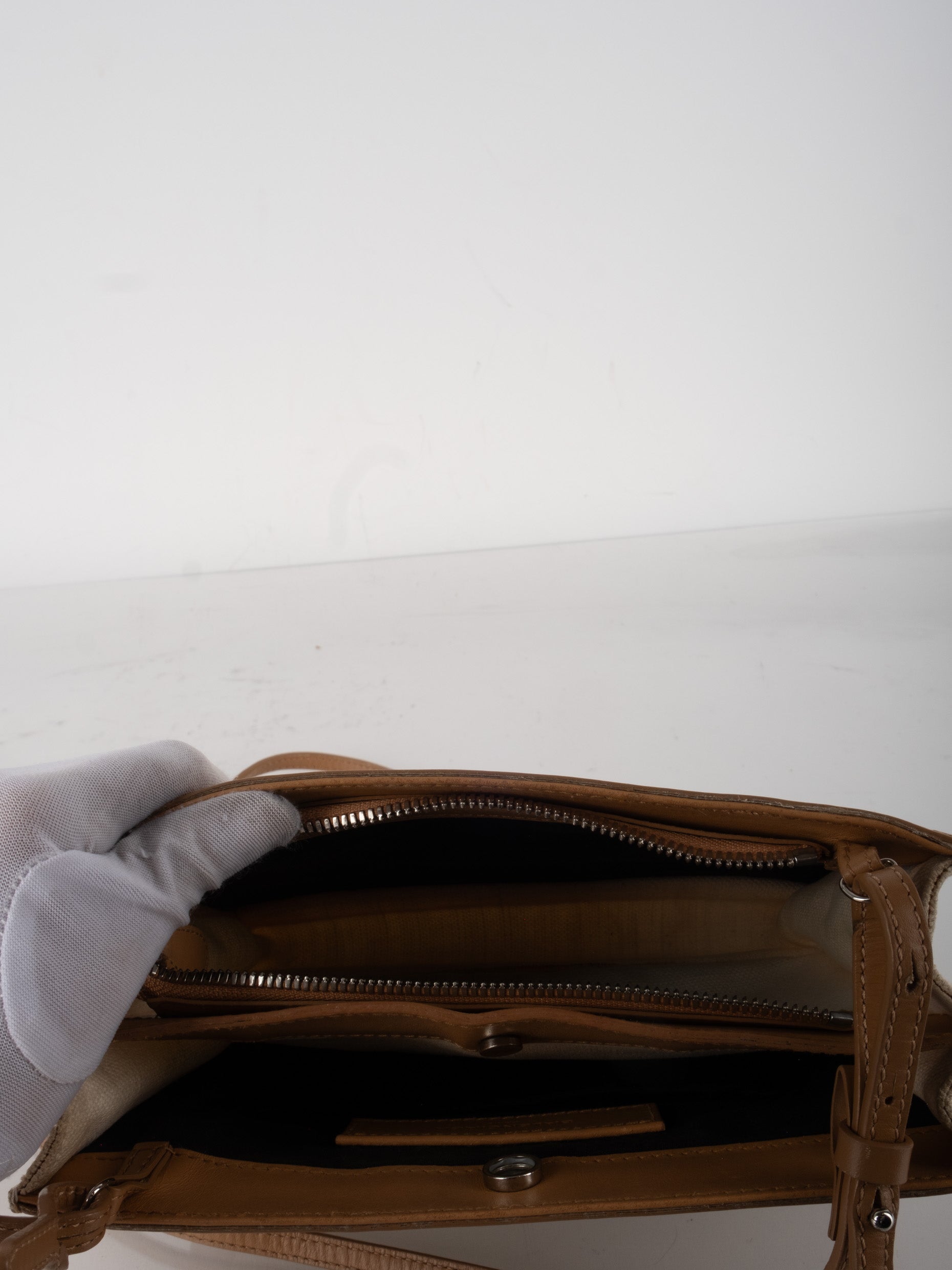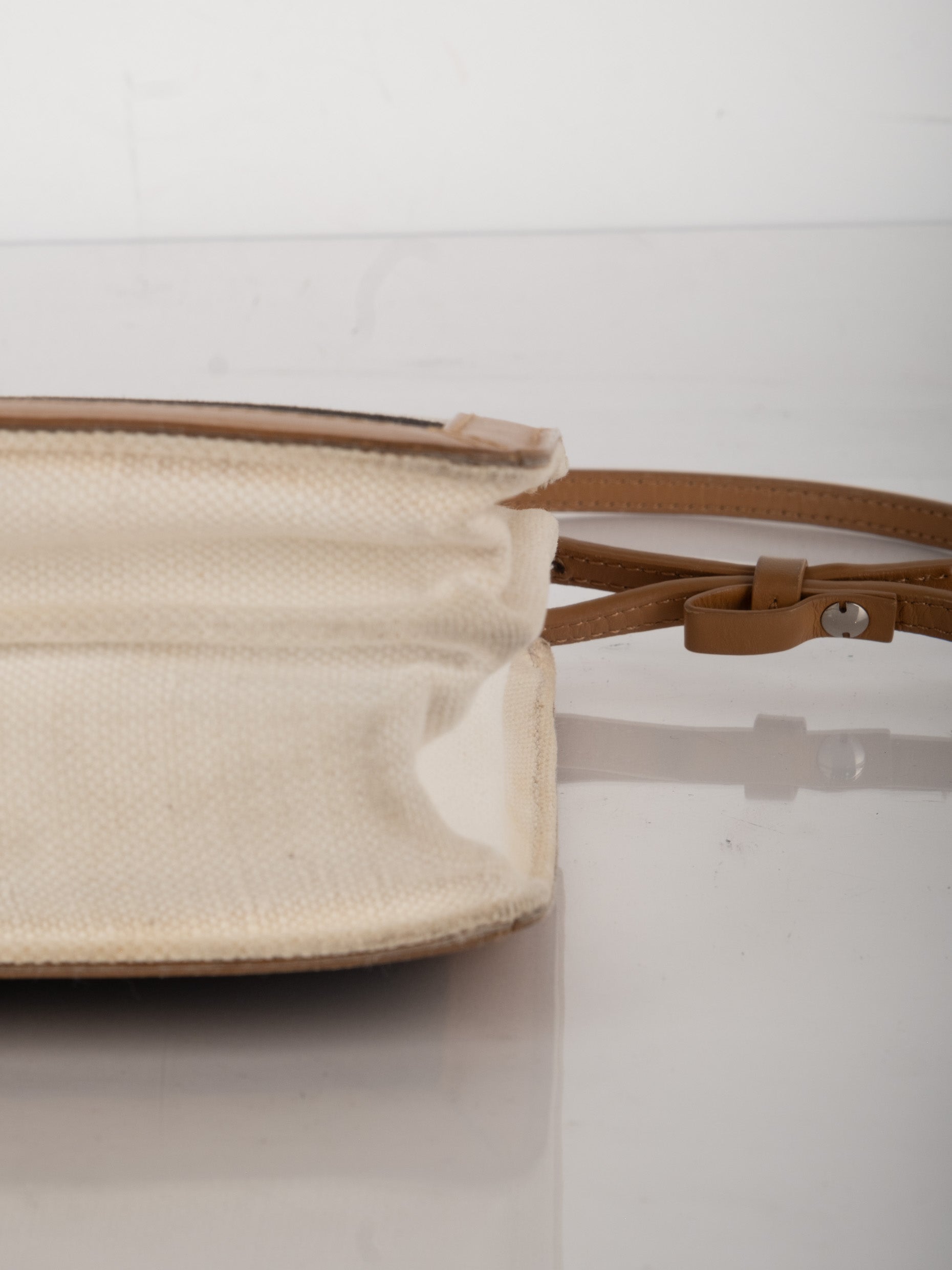 תיק כתף (מתאים לקרוסבודי) העשוי מקנבס בצבע בז׳ בשילוב של עור בצבע קאמל, בעל רצועה ארוכה דקה שניתן לכוון או להוציא באמצעות דיטיילים כסופים במידת הצורך. תיק זה בעל שני תאים מרכזיים כאשר הראשון נסגר באמצעות רוכסן ועוד תא פנימי ללא סגירה בתוכו ותא נוסף נסגר באמצעות כפתור תיק-תק כסוף.