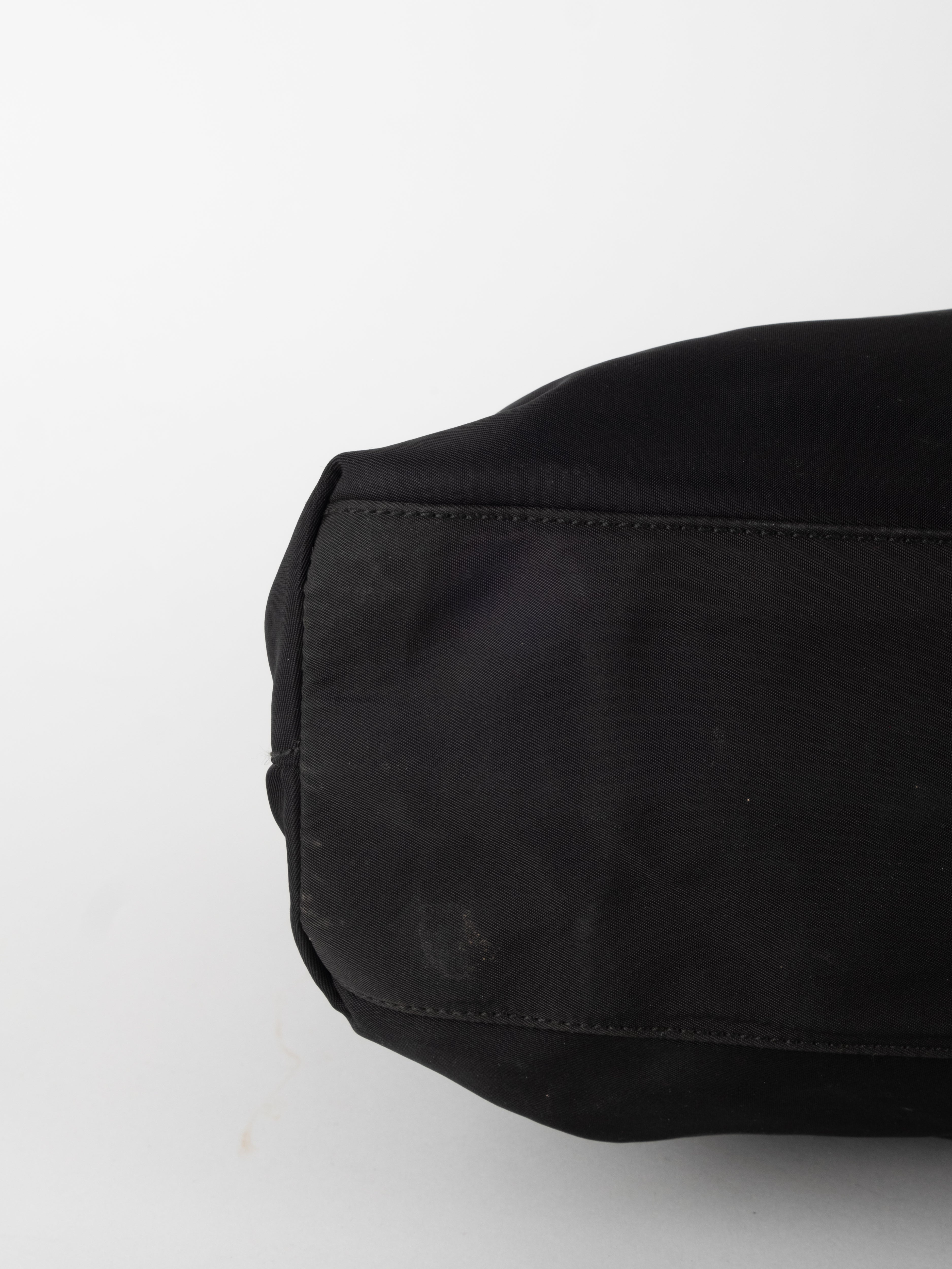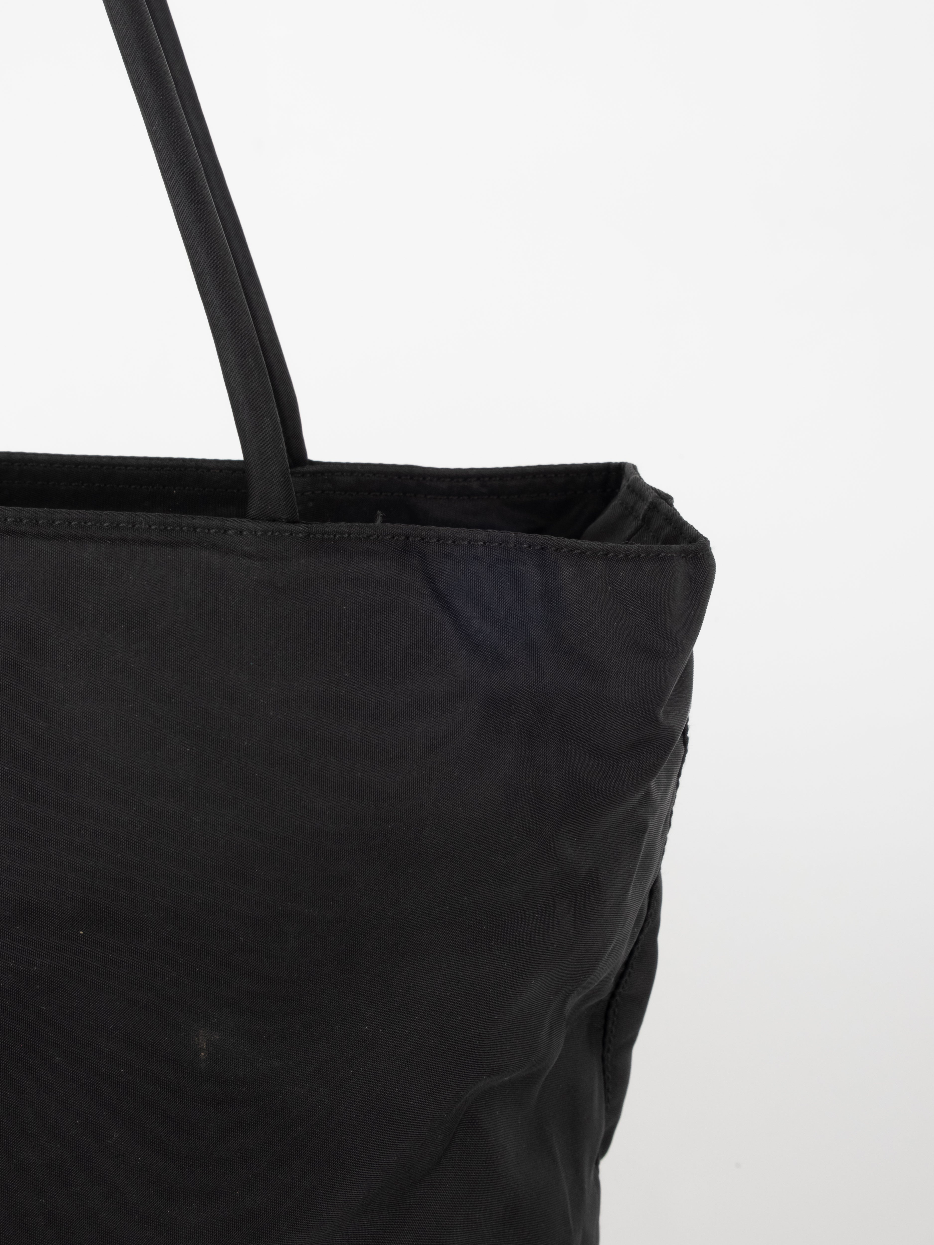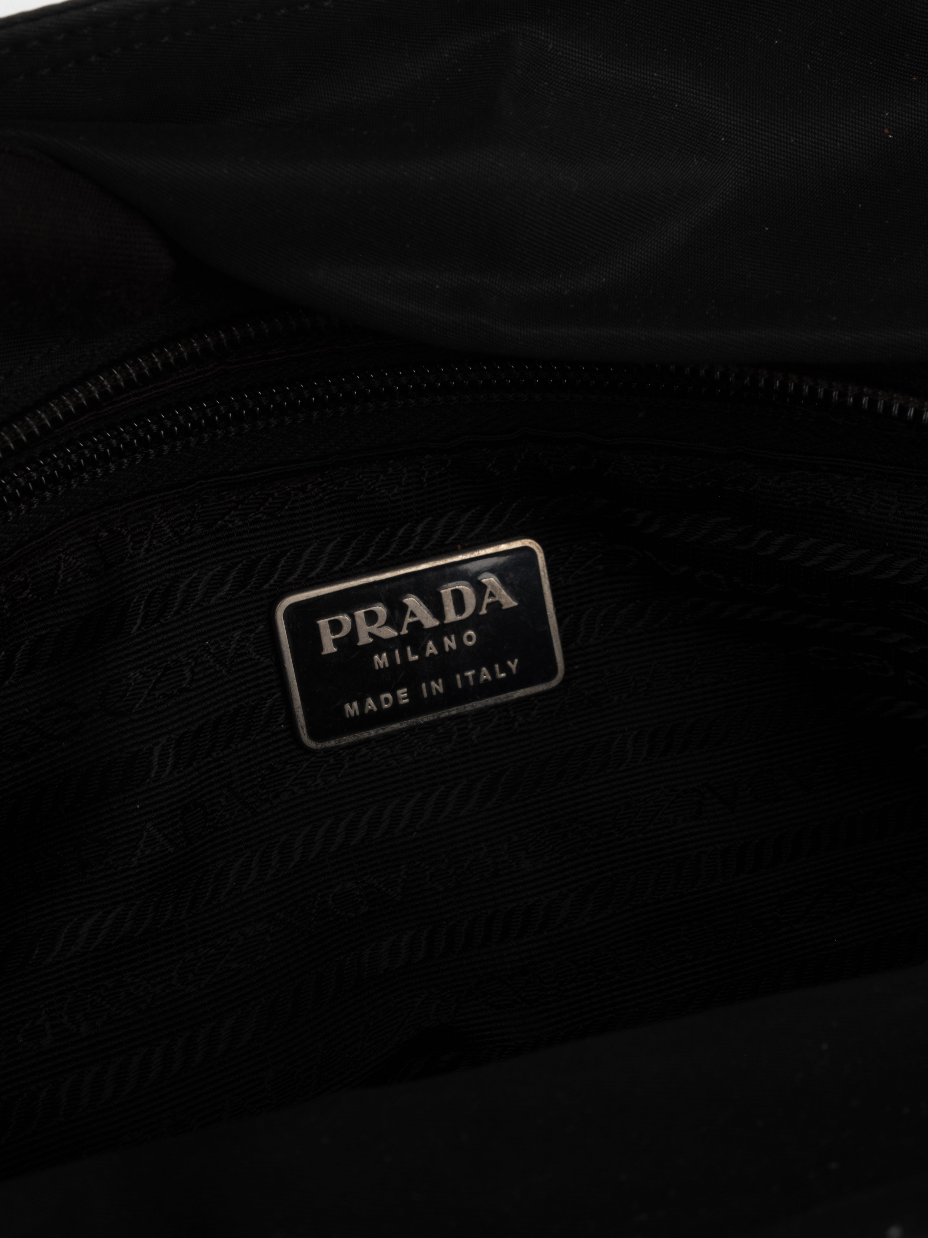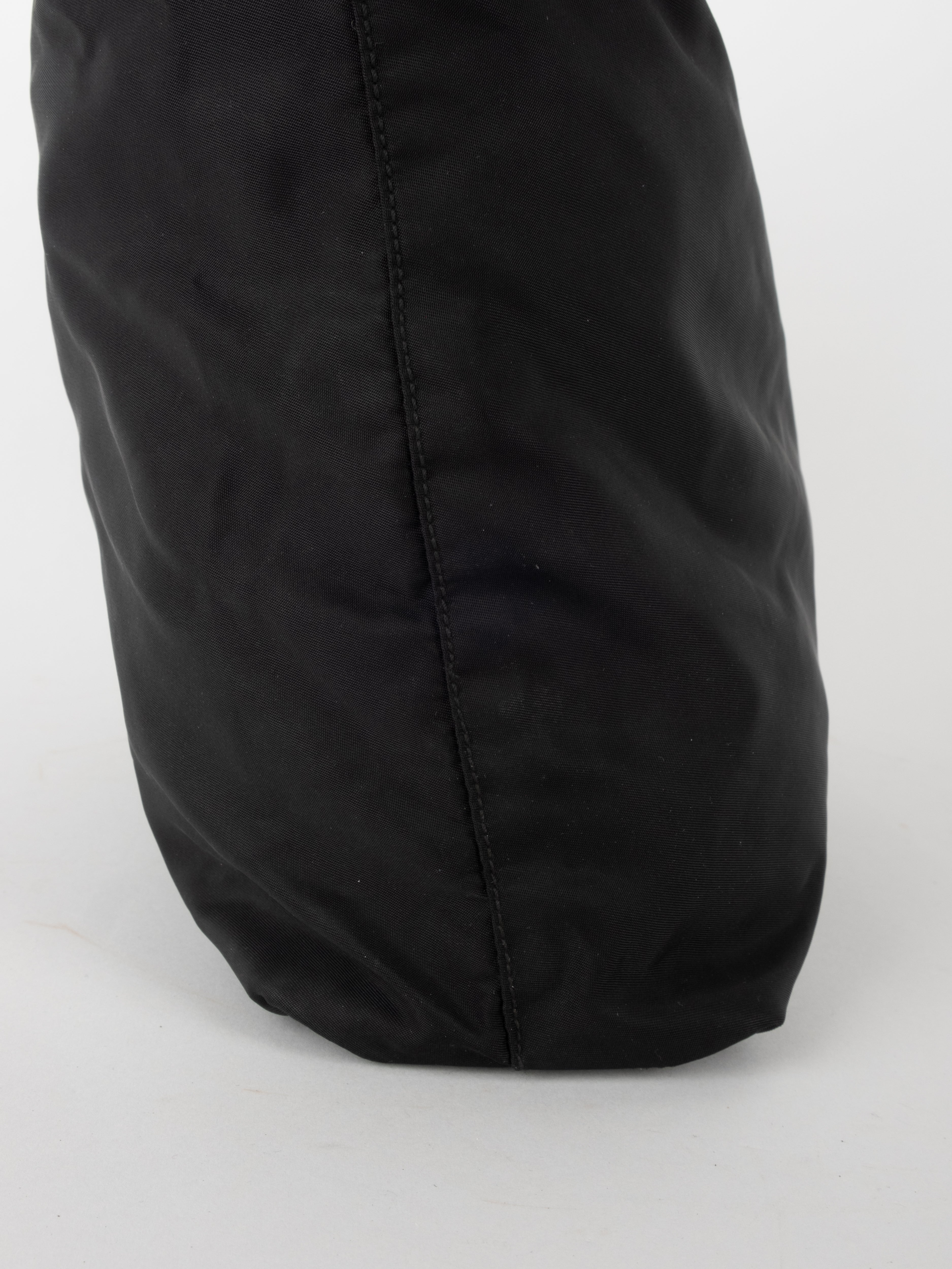 התיק עשוי בד ניילון בצבע שחור, עם ידיות נשיאה מבד תואם, סגירת רוכסן עליונה ותא פנימי מרווח. הלוגו המשולש של פראדה מופיע בחזית.