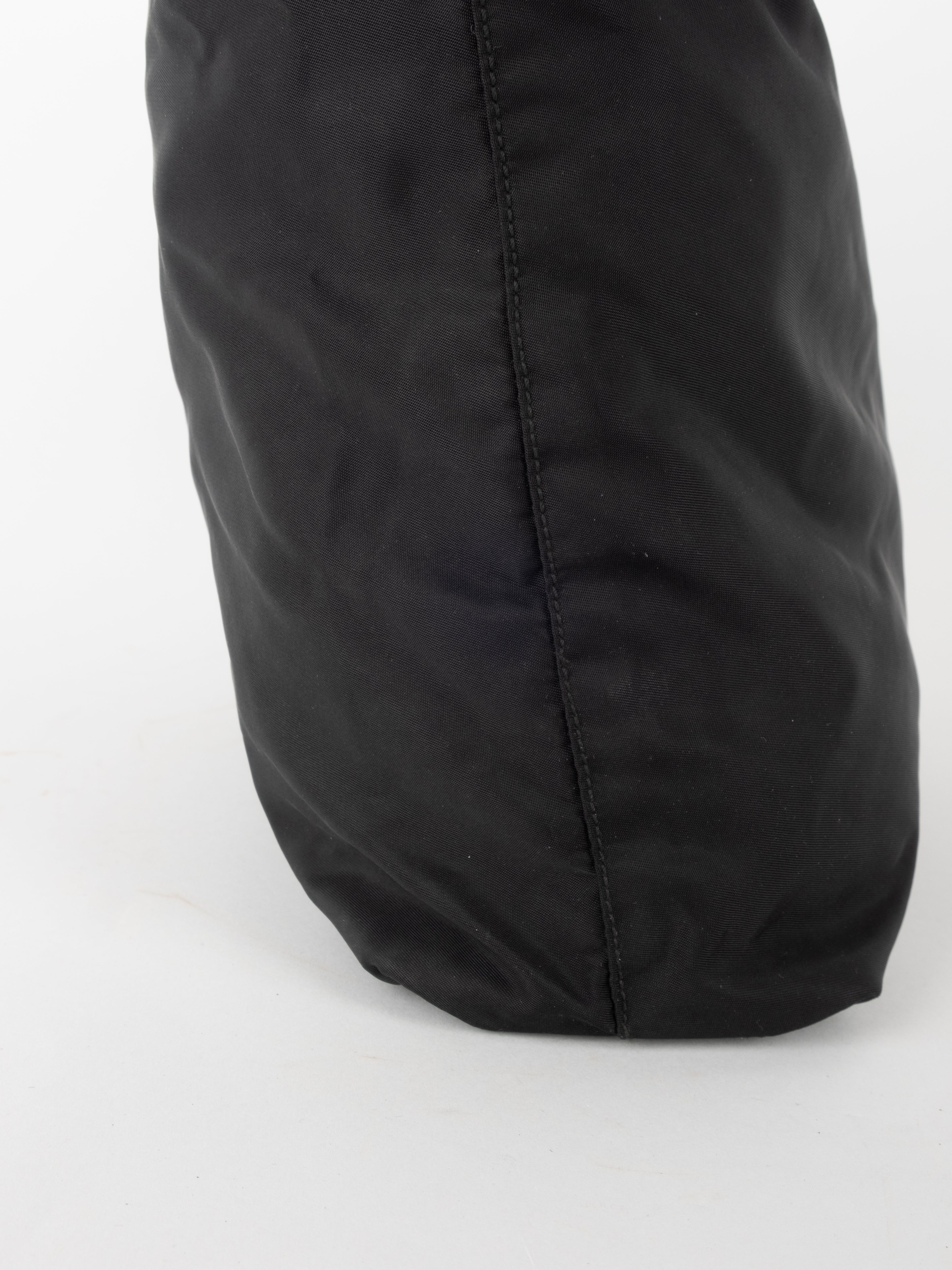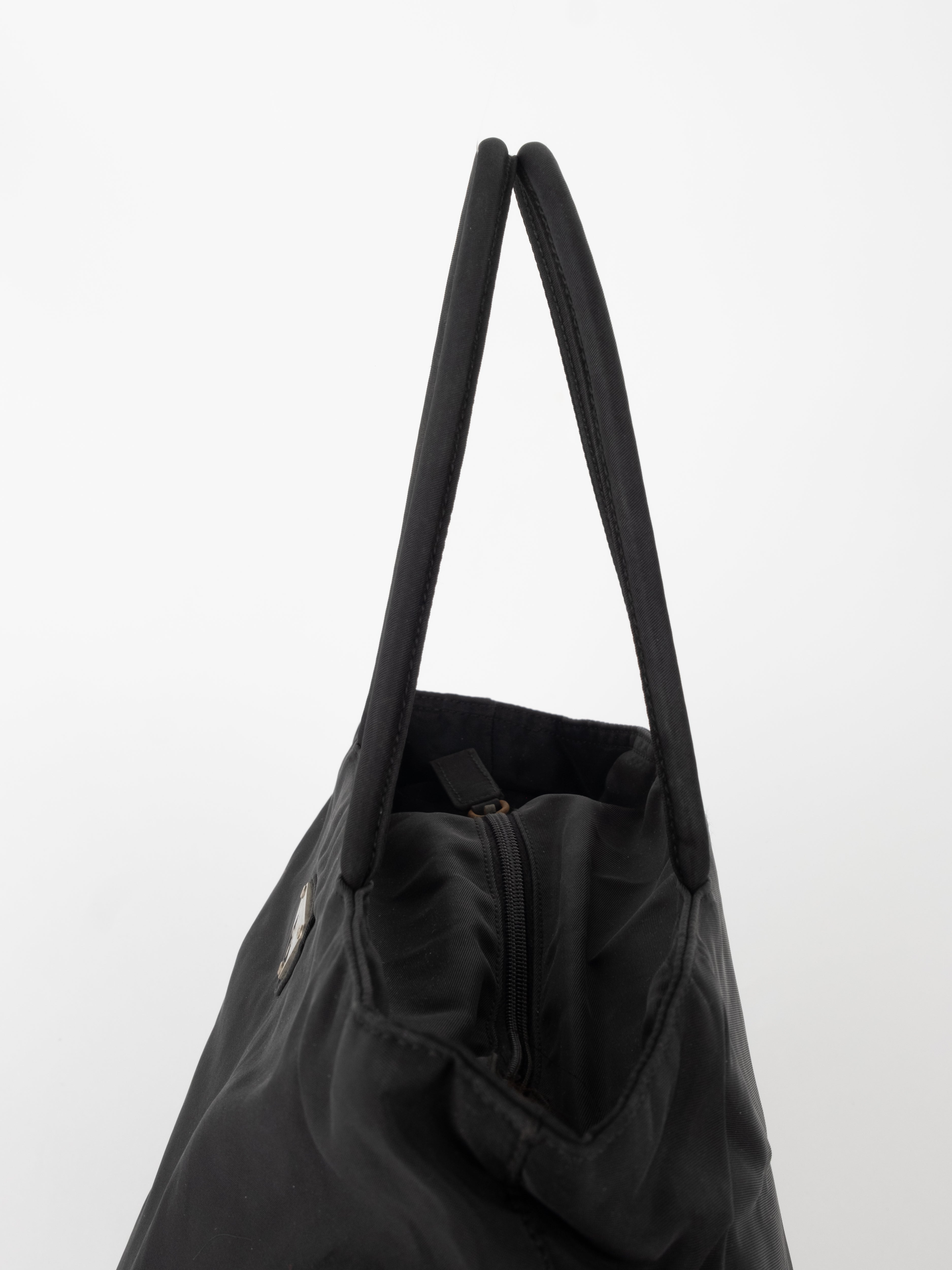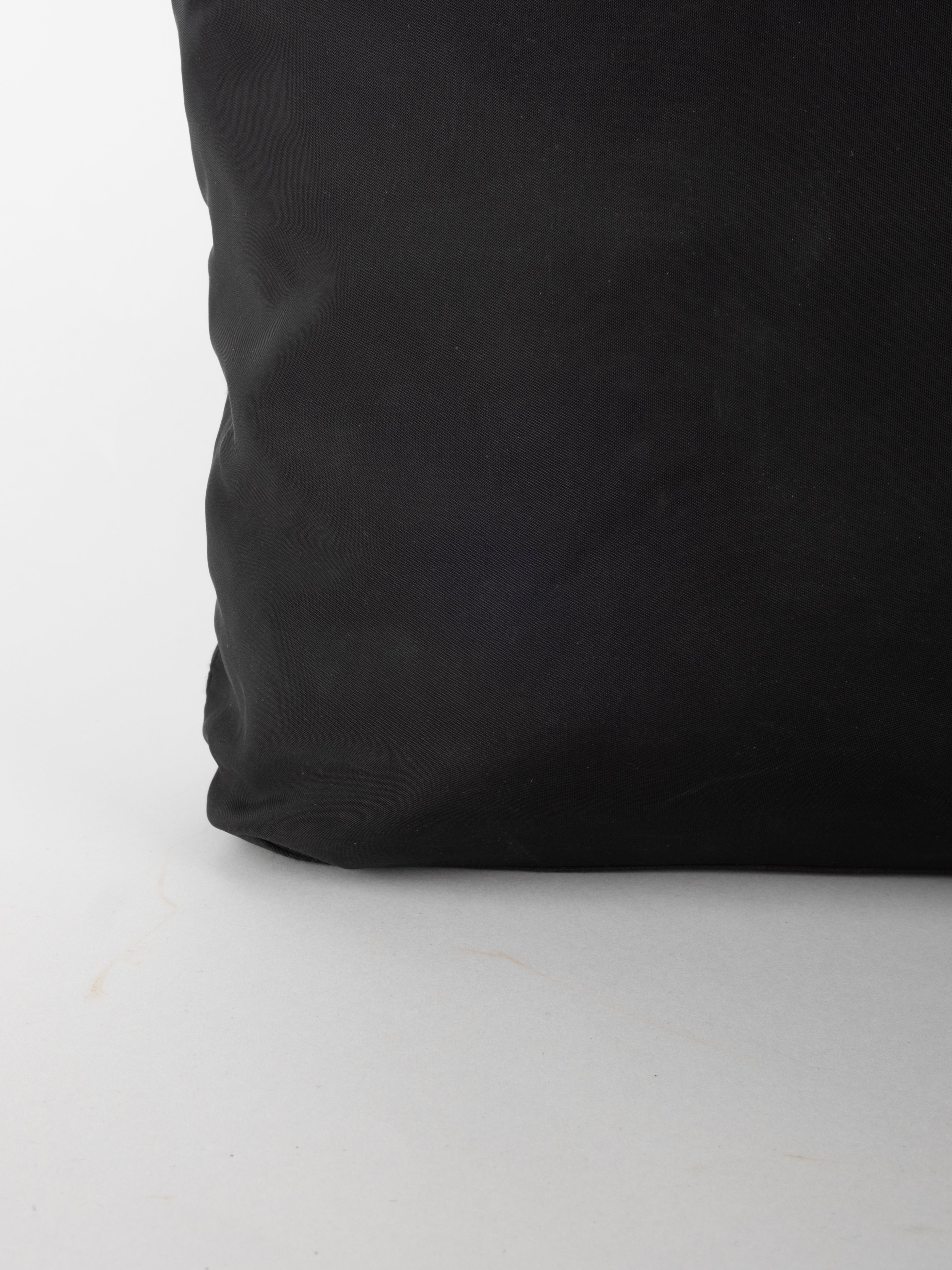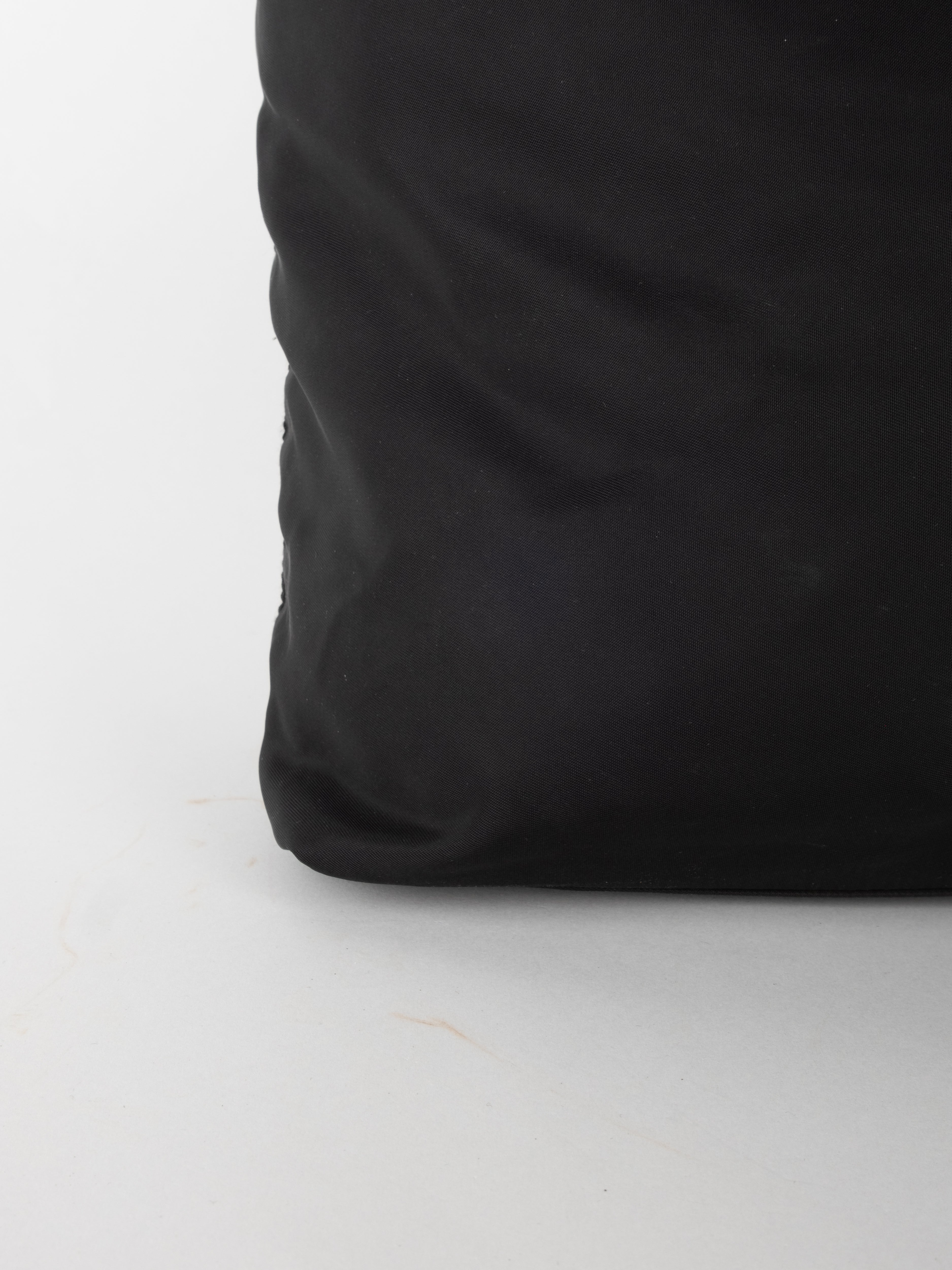 התיק עשוי בד ניילון בצבע שחור, עם ידיות נשיאה מבד תואם, סגירת רוכסן עליונה ותא פנימי מרווח. הלוגו המשולש של פראדה מופיע בחזית.