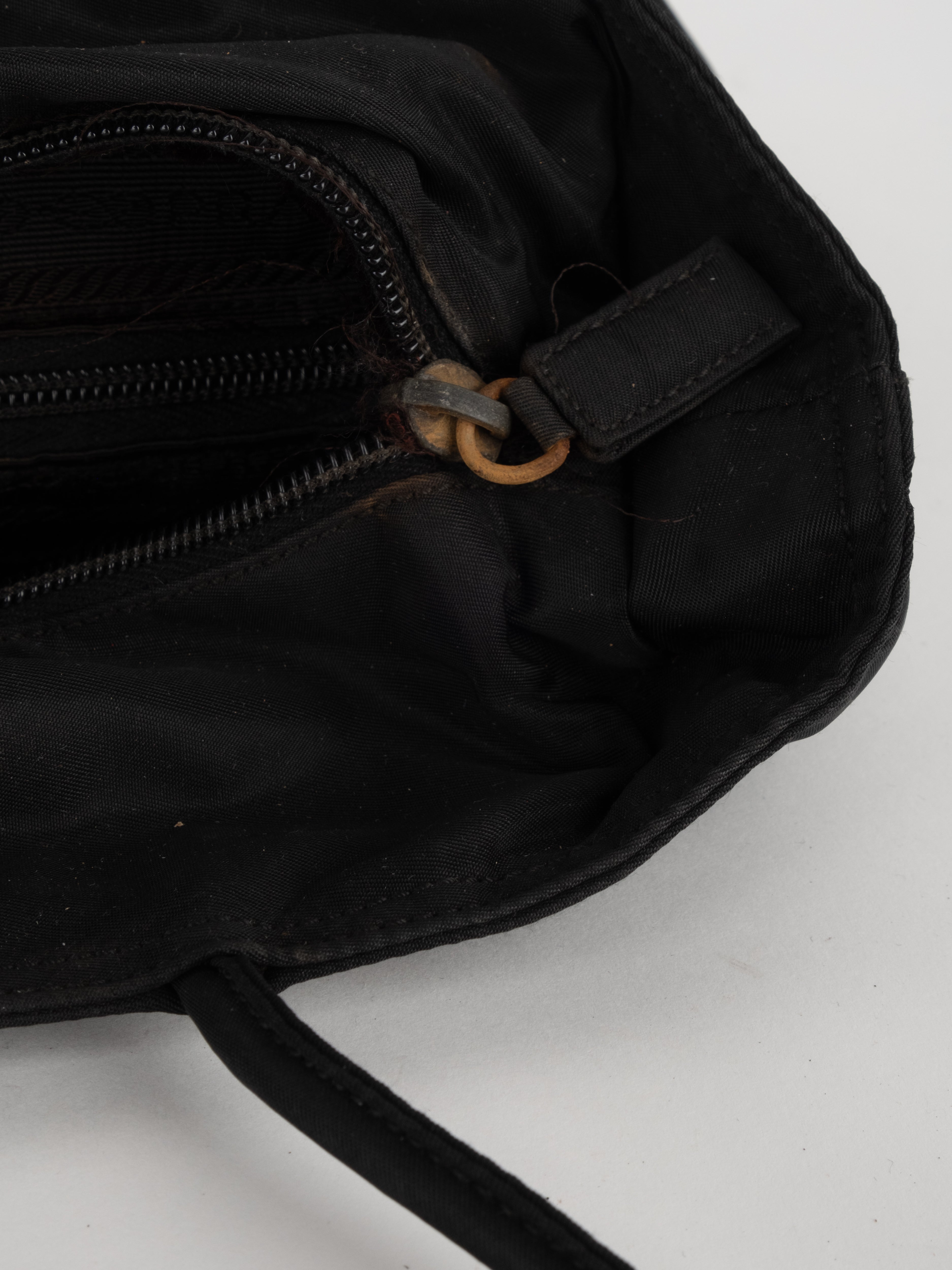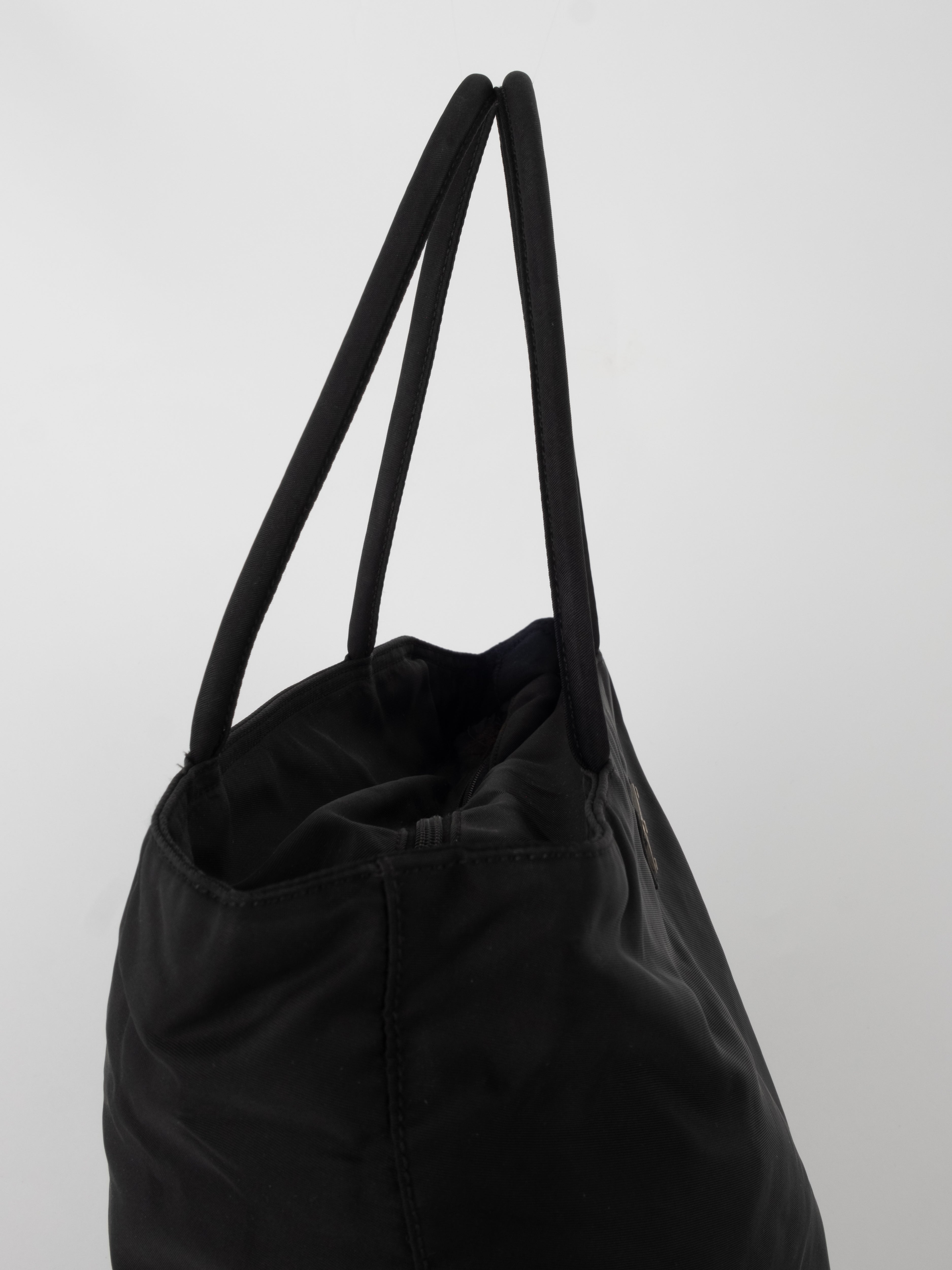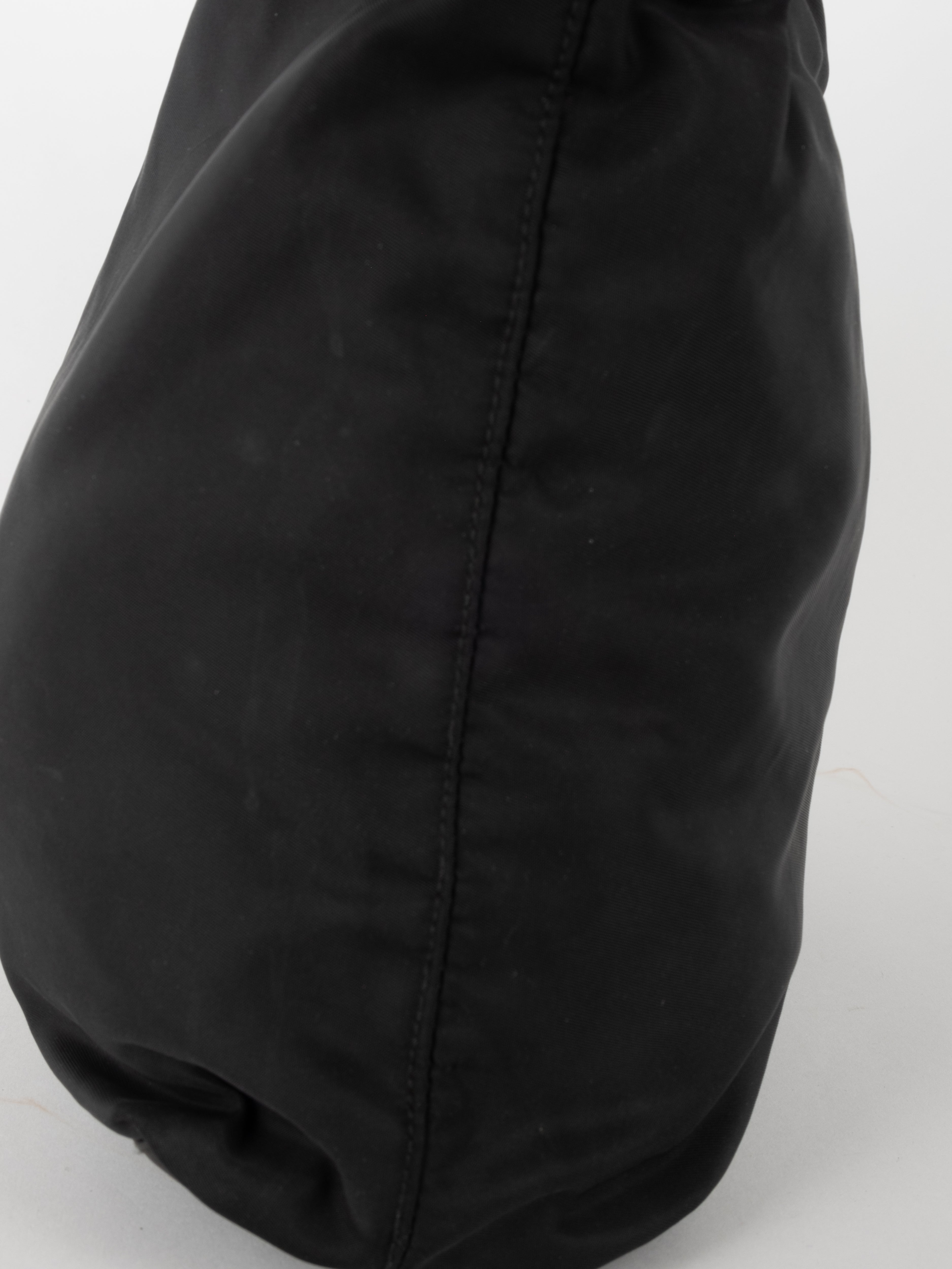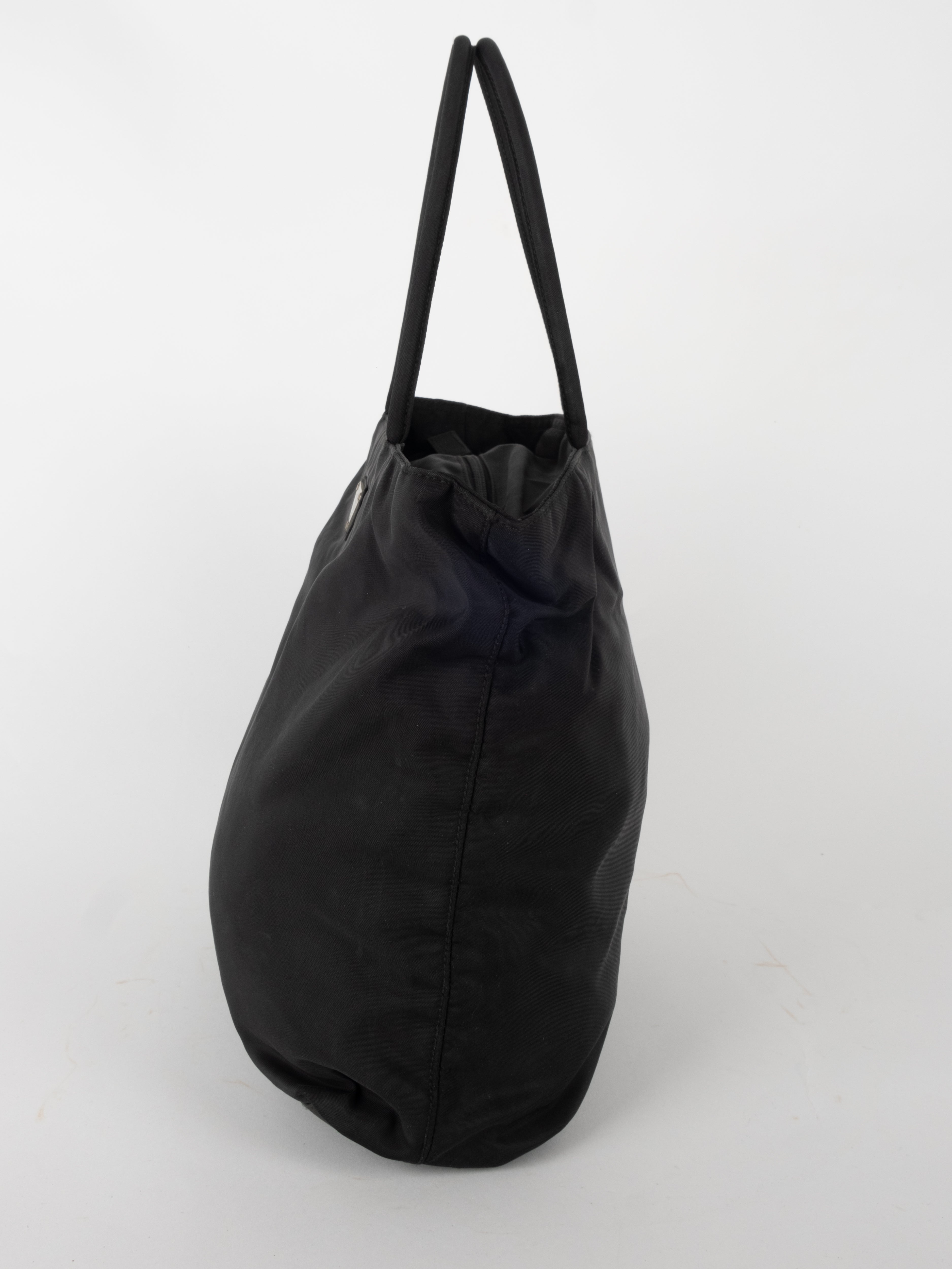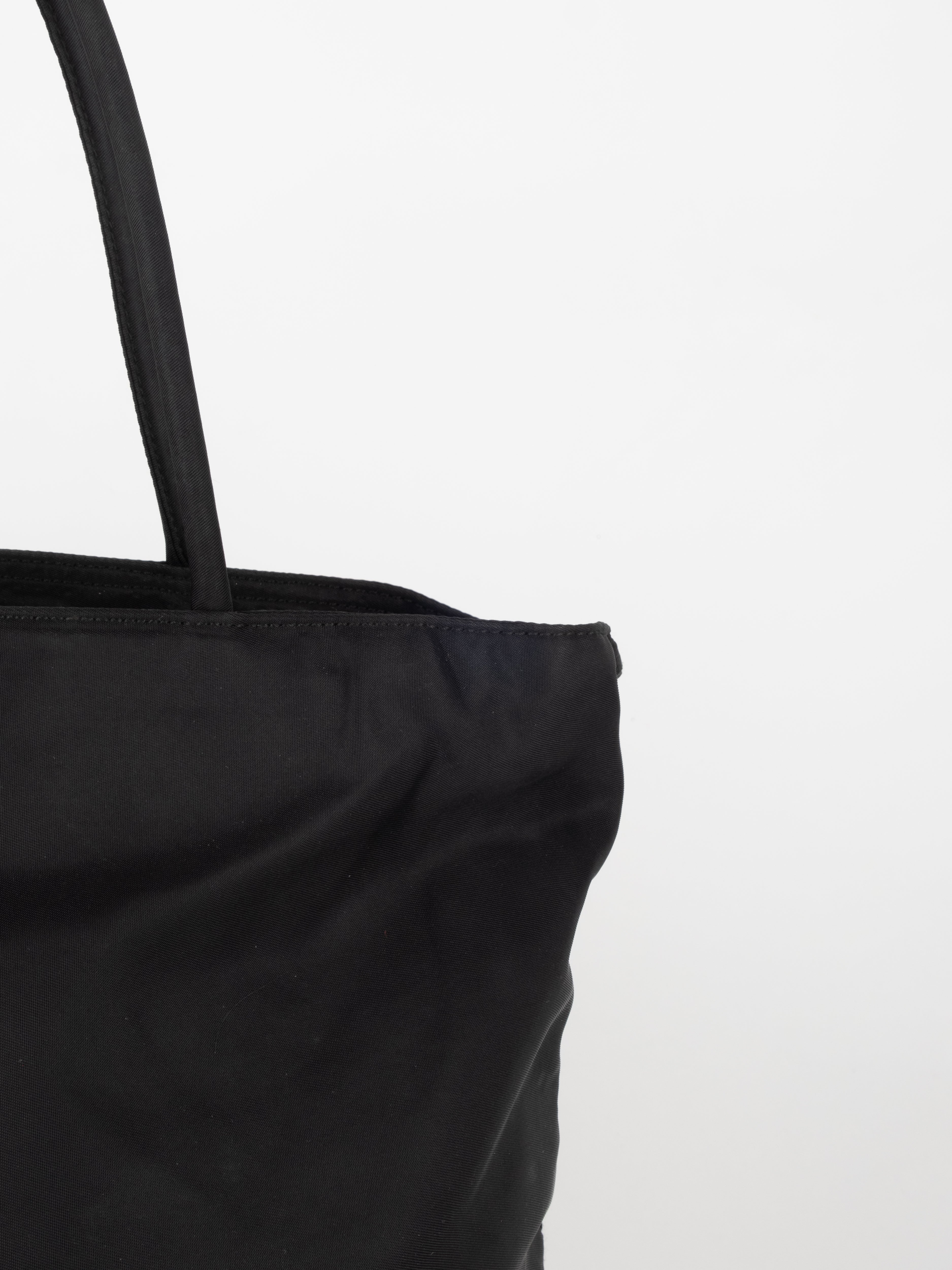 התיק עשוי בד ניילון בצבע שחור, עם ידיות נשיאה מבד תואם, סגירת רוכסן עליונה ותא פנימי מרווח. הלוגו המשולש של פראדה מופיע בחזית.