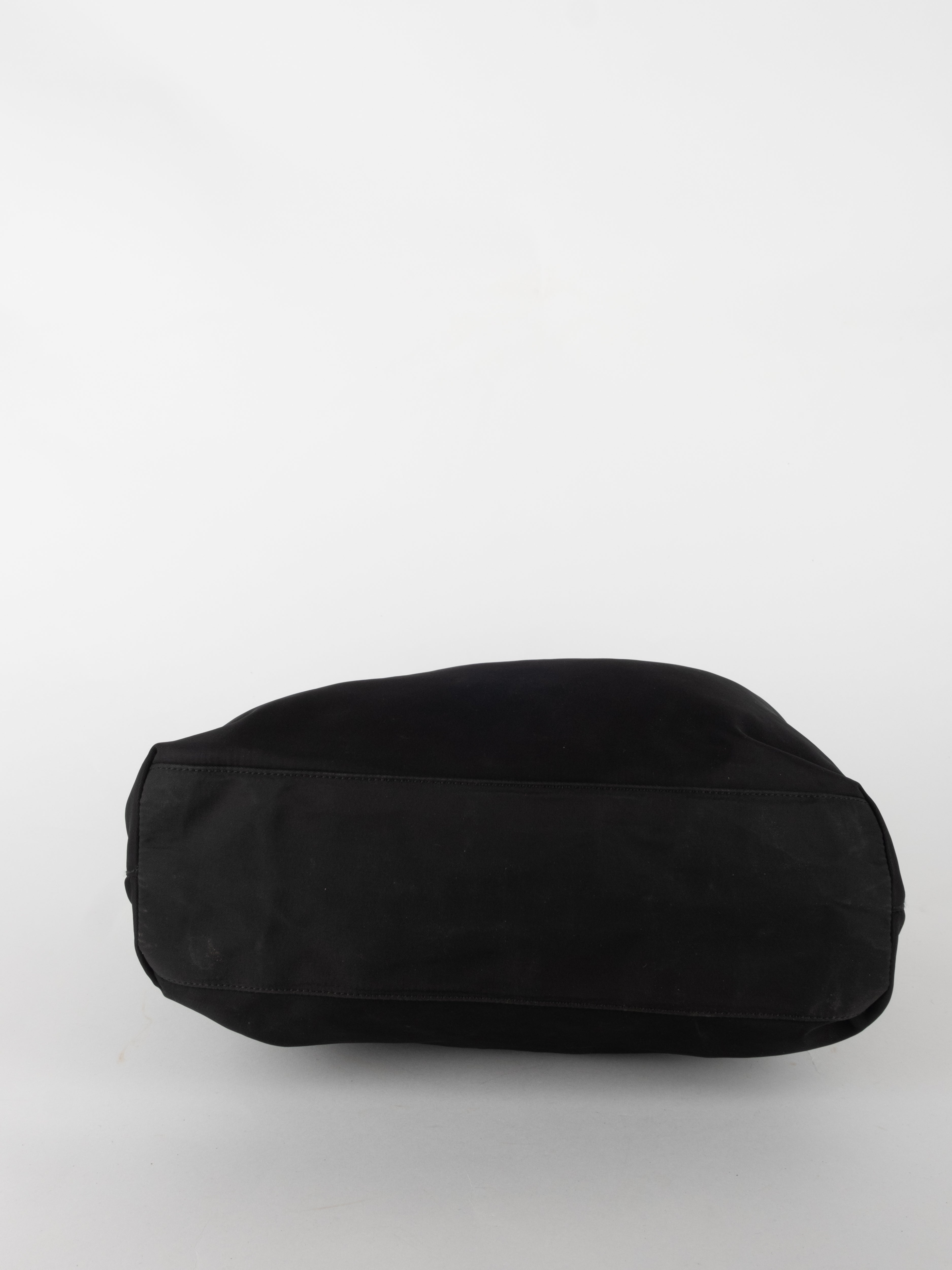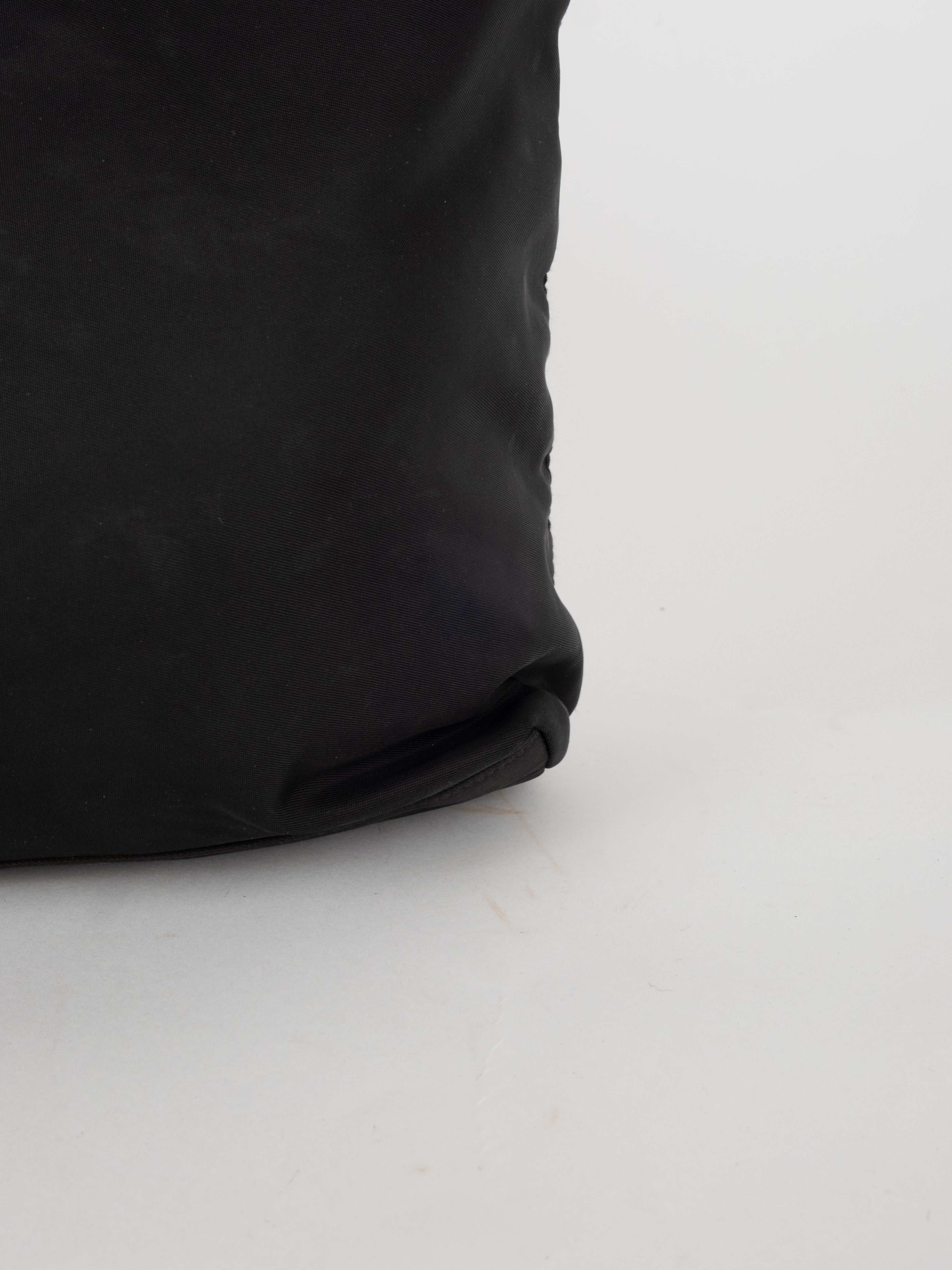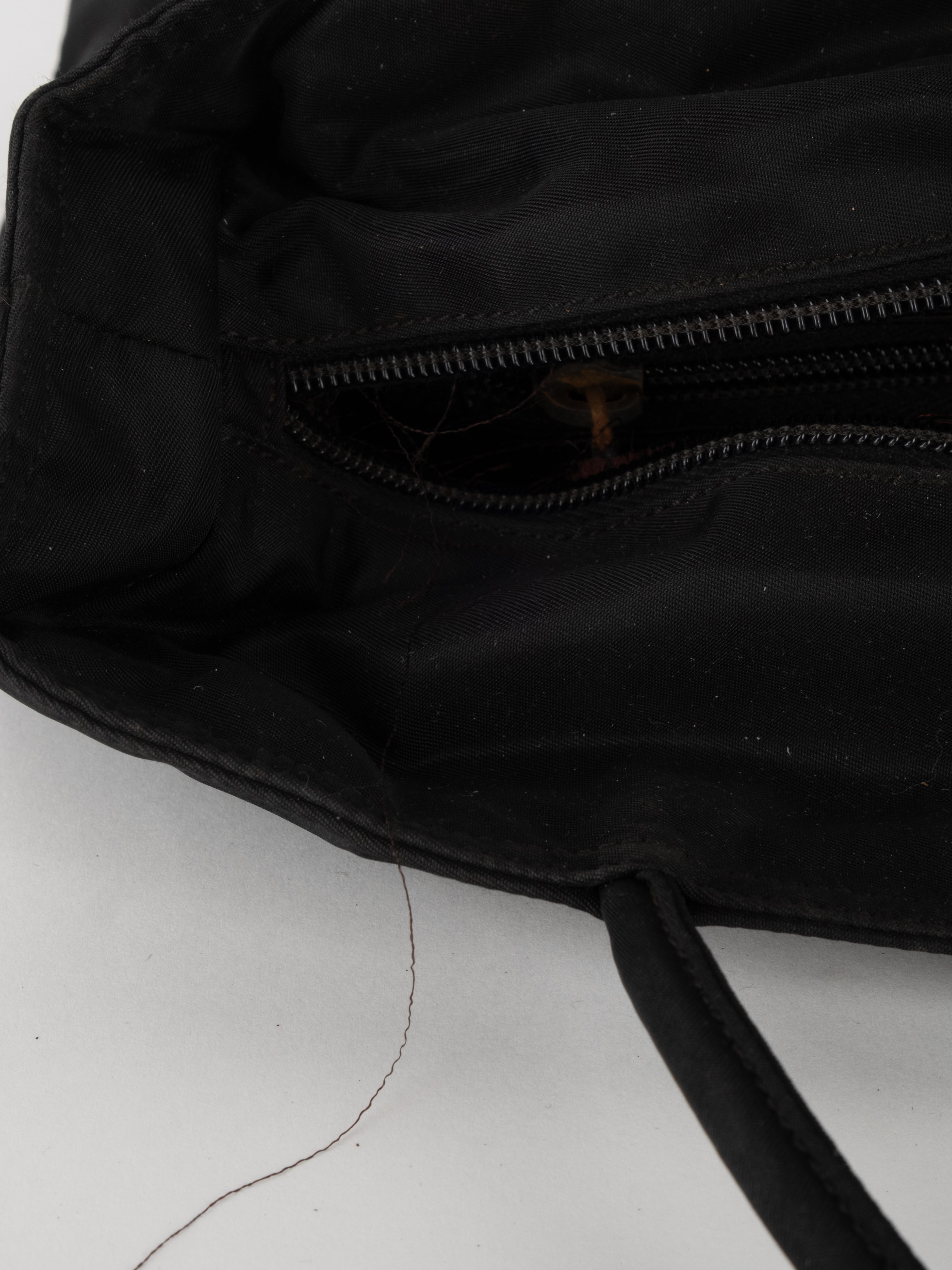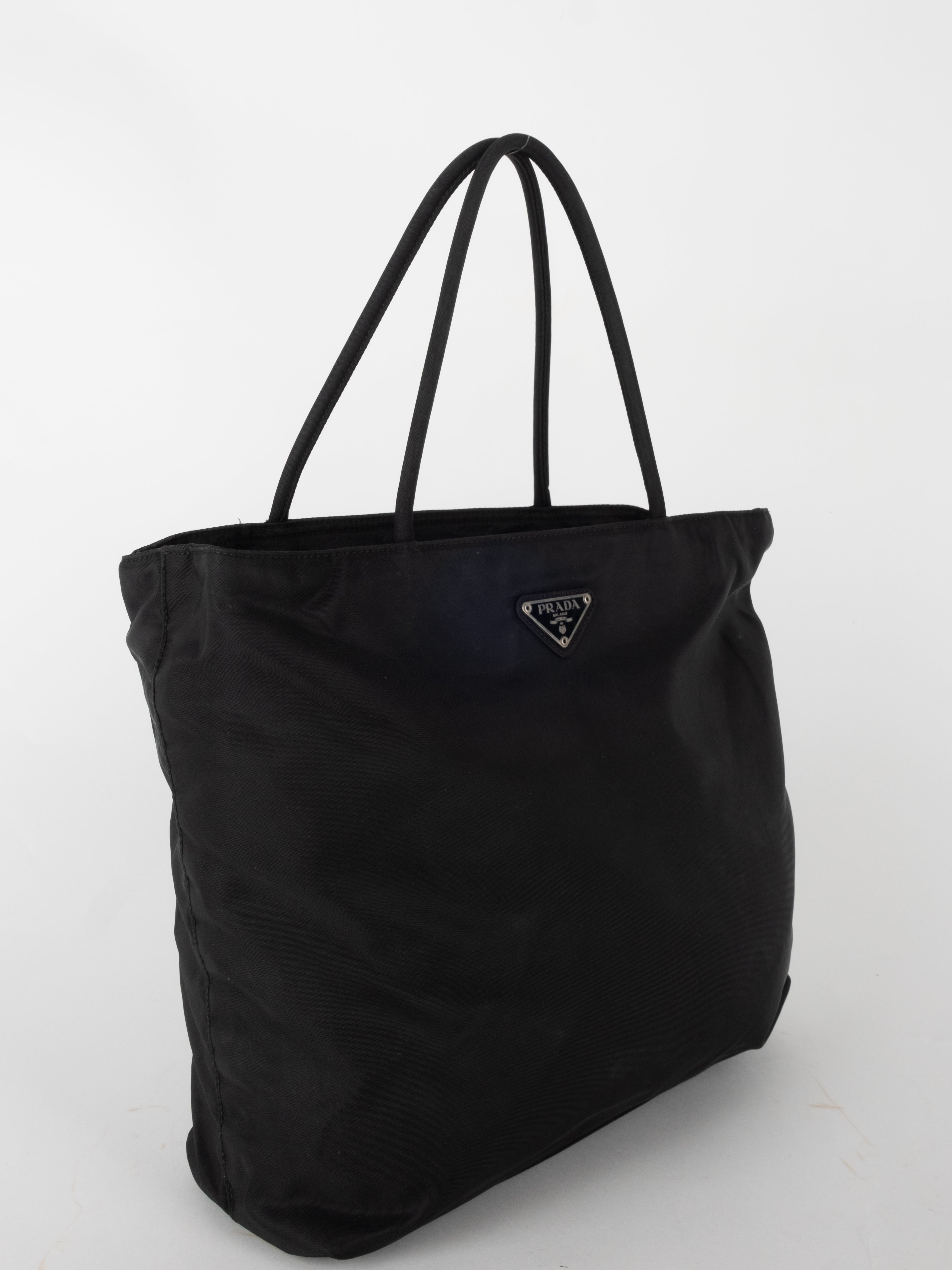 התיק עשוי בד ניילון בצבע שחור, עם ידיות נשיאה מבד תואם, סגירת רוכסן עליונה ותא פנימי מרווח. הלוגו המשולש של פראדה מופיע בחזית.
