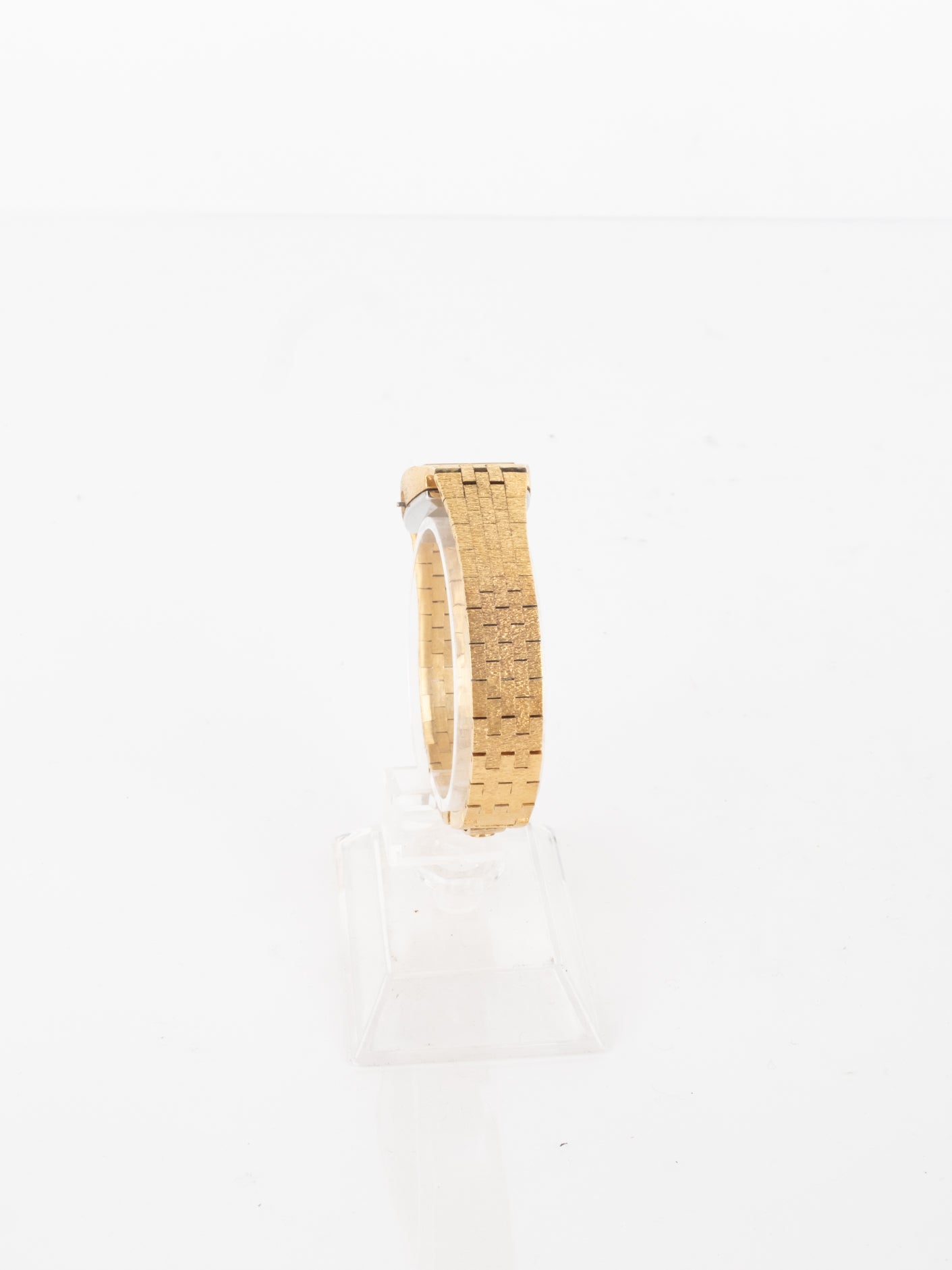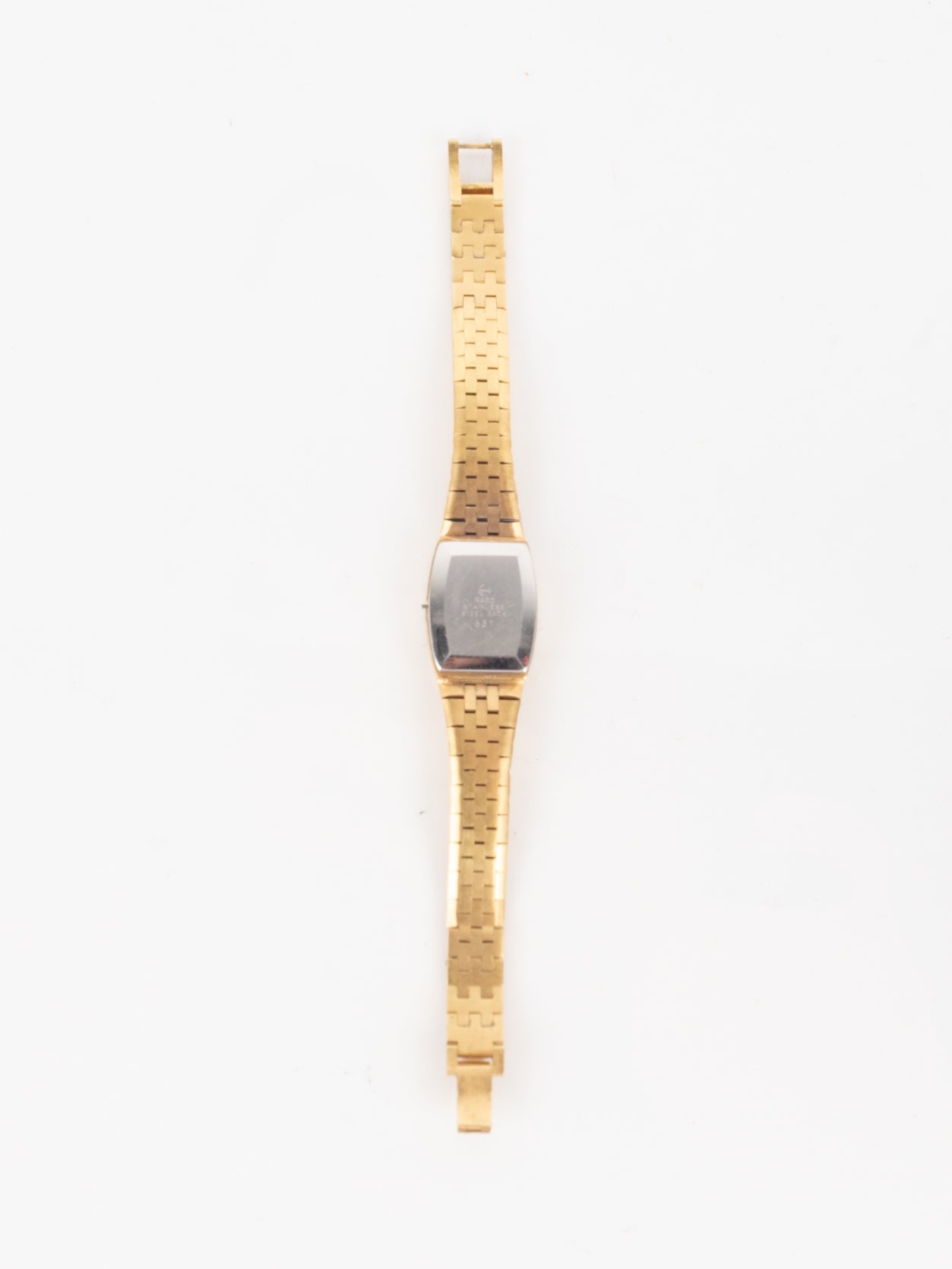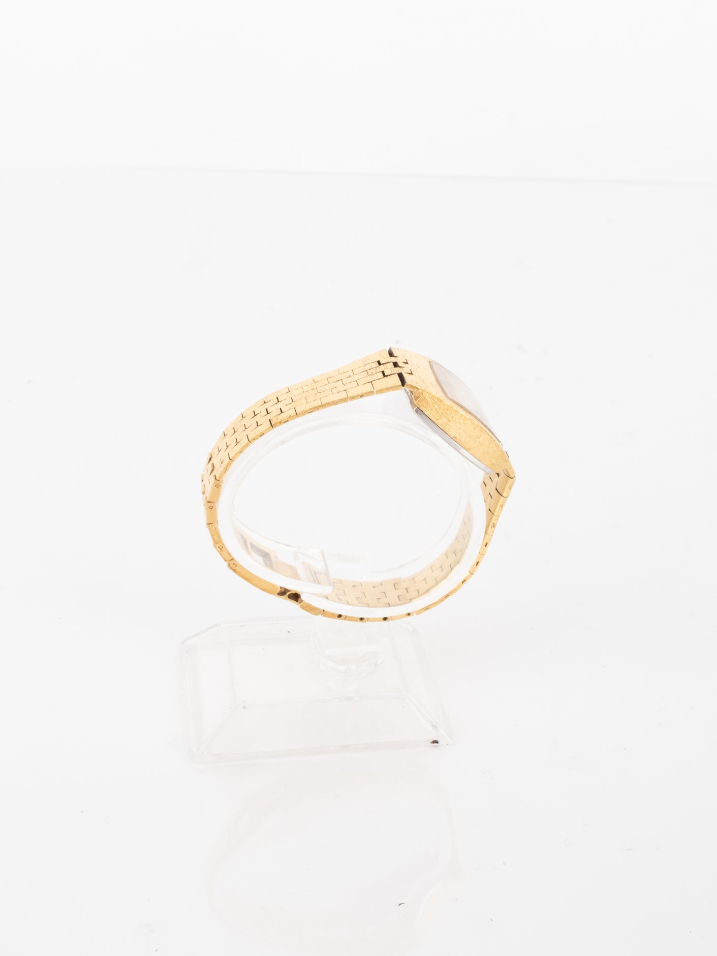 שעון קלאסי בצבע זהב בעל פני שעון בצורה מרובעת עם רקע בצבע זהה ומחוגים. שעון זה נסגר באמצעות סוגר ממותג.