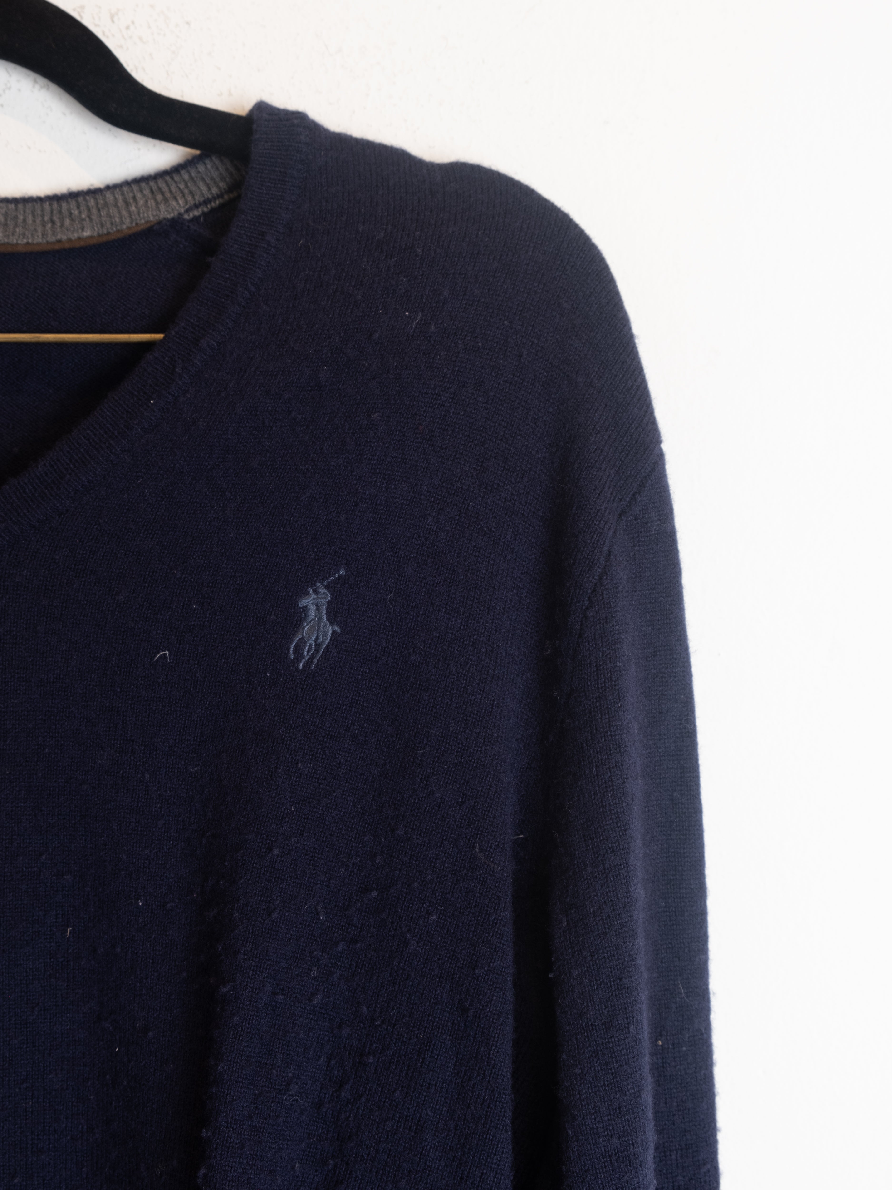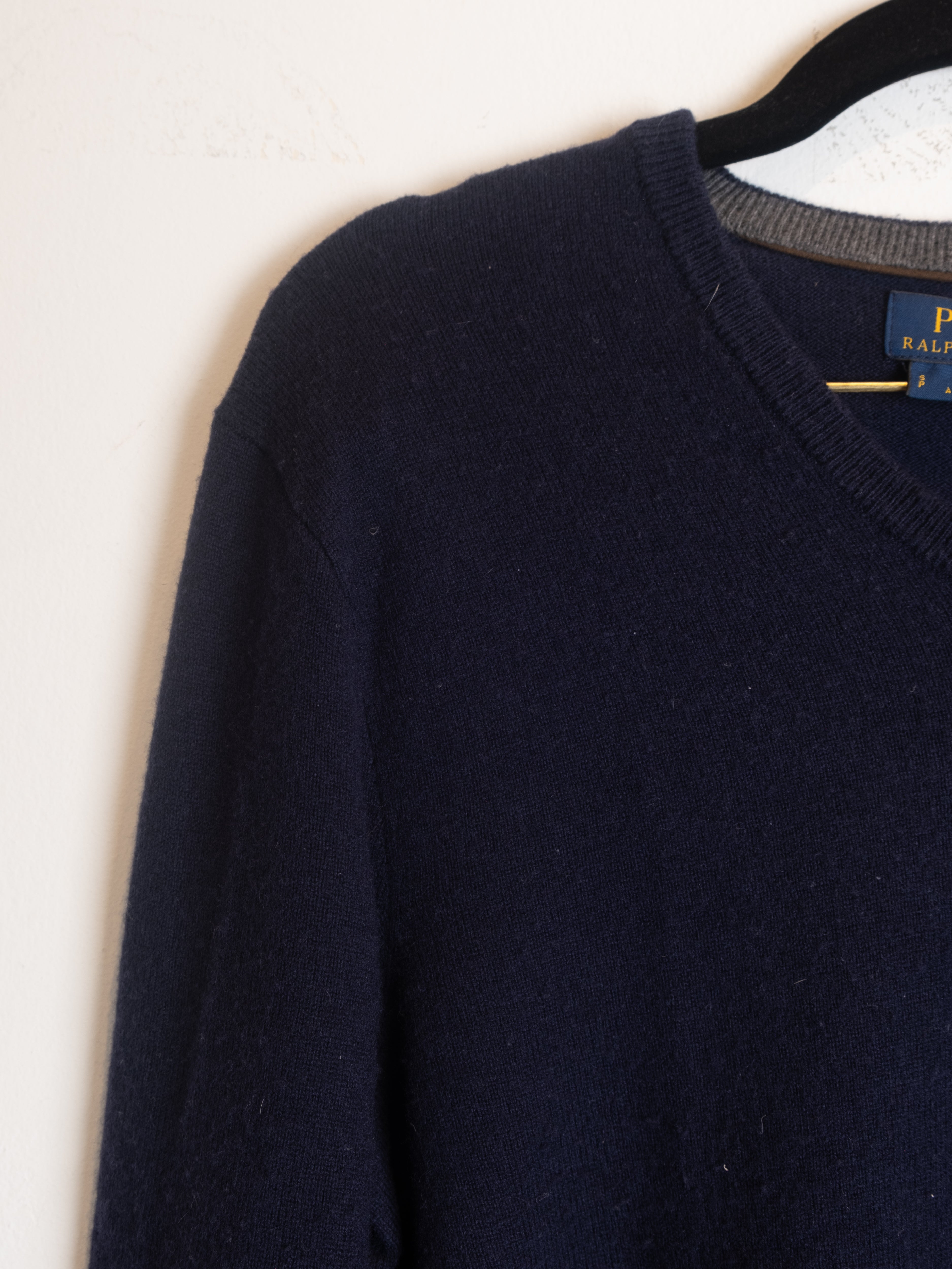 View Similar Productsסוודר וינטג' יד שנייה של פולו ראלף לורן, בצבע כחול נייבי עמוק ובגזרת V קלאסית ומדויקת. הסוודר עשוי צמר רך בעל נוכחות יוקרתית, ומתאפיין במראה נקי, אלגנטי ועל־זמני. הלוגו הרקום בטון־על־טון מעניק מראה מתוחכם ושקט. פריט חם, איכותי ובלתי מתאמץ — כזה שמשתלב בקלות בכל מלתחה.