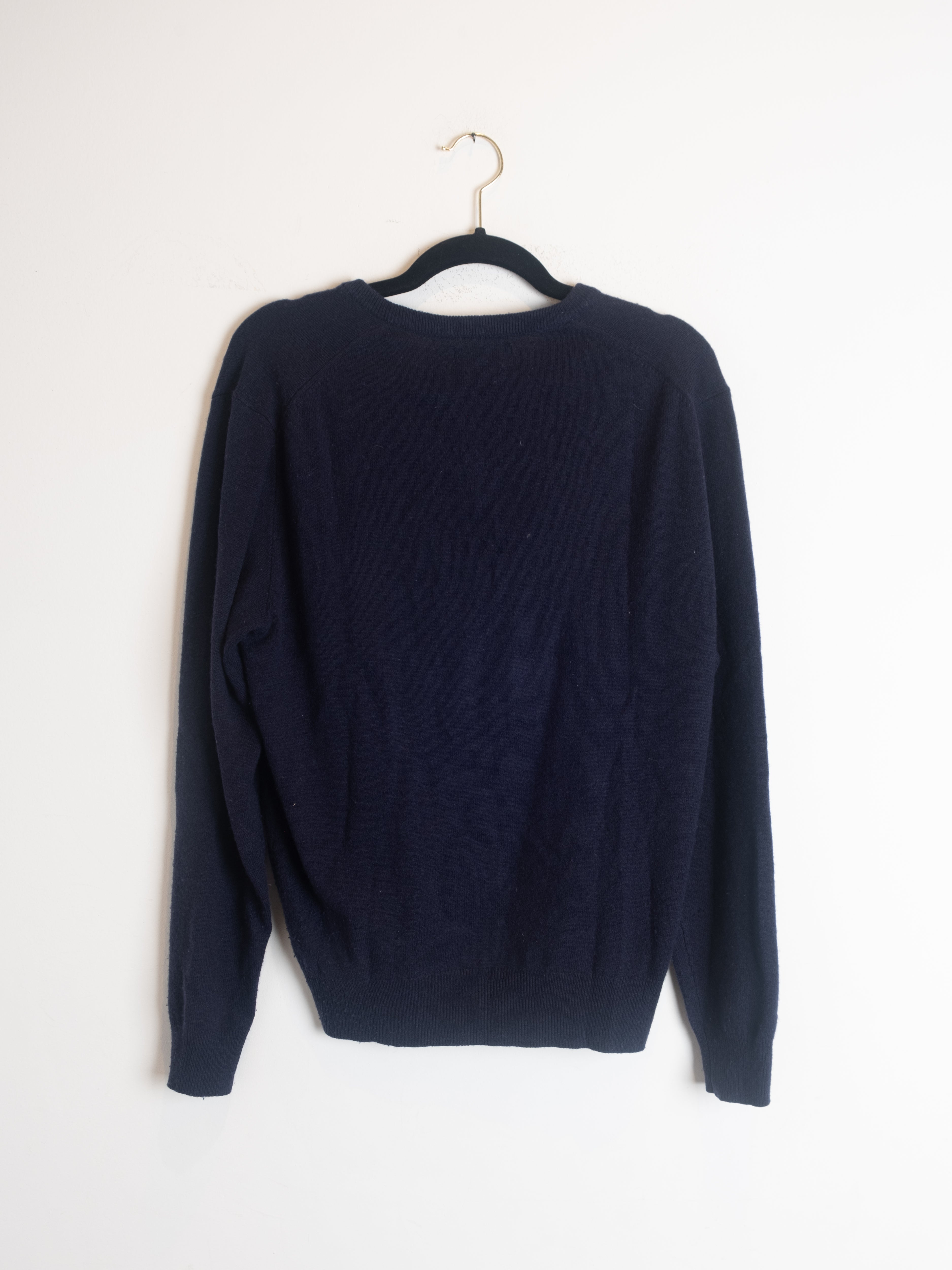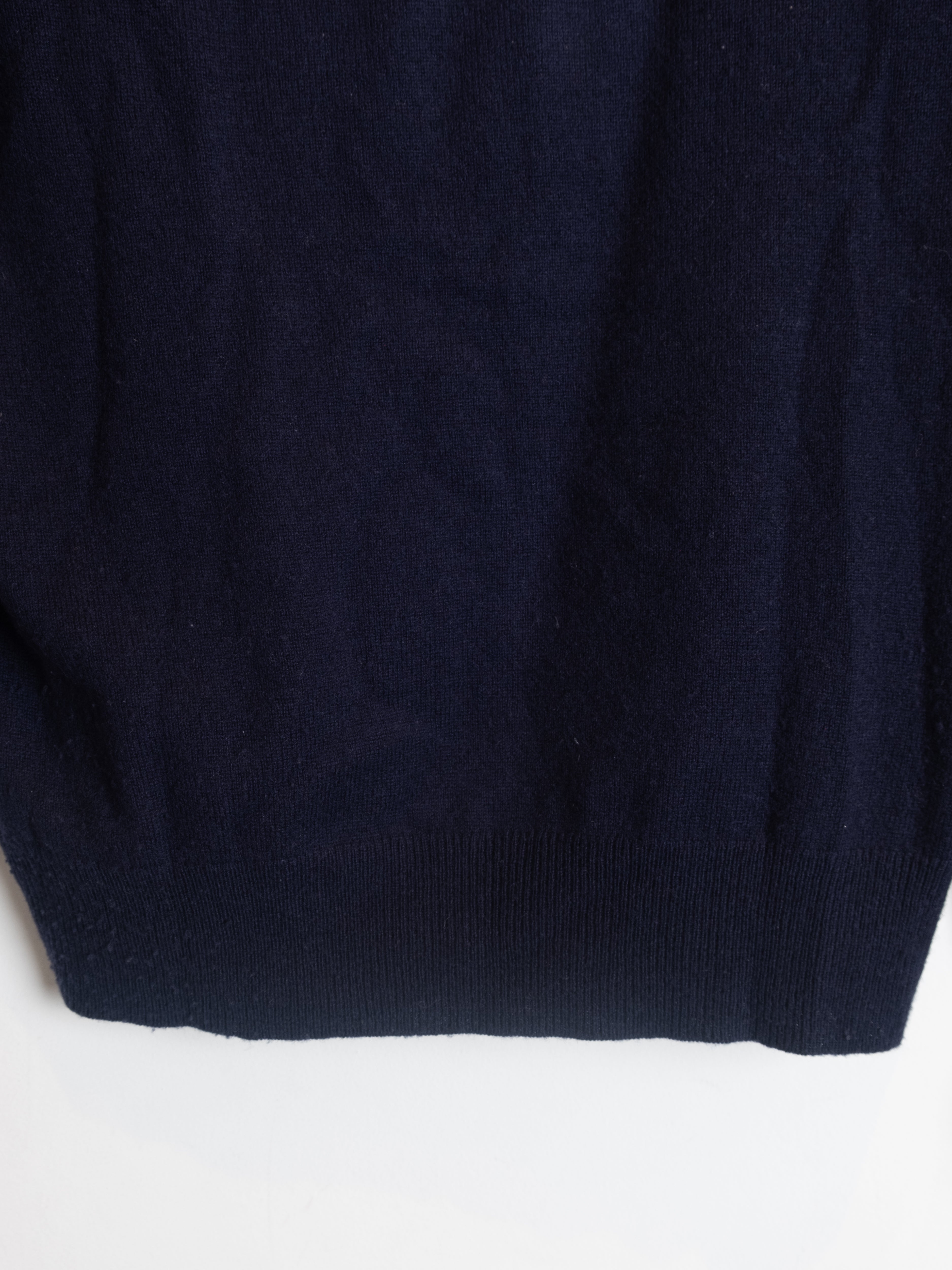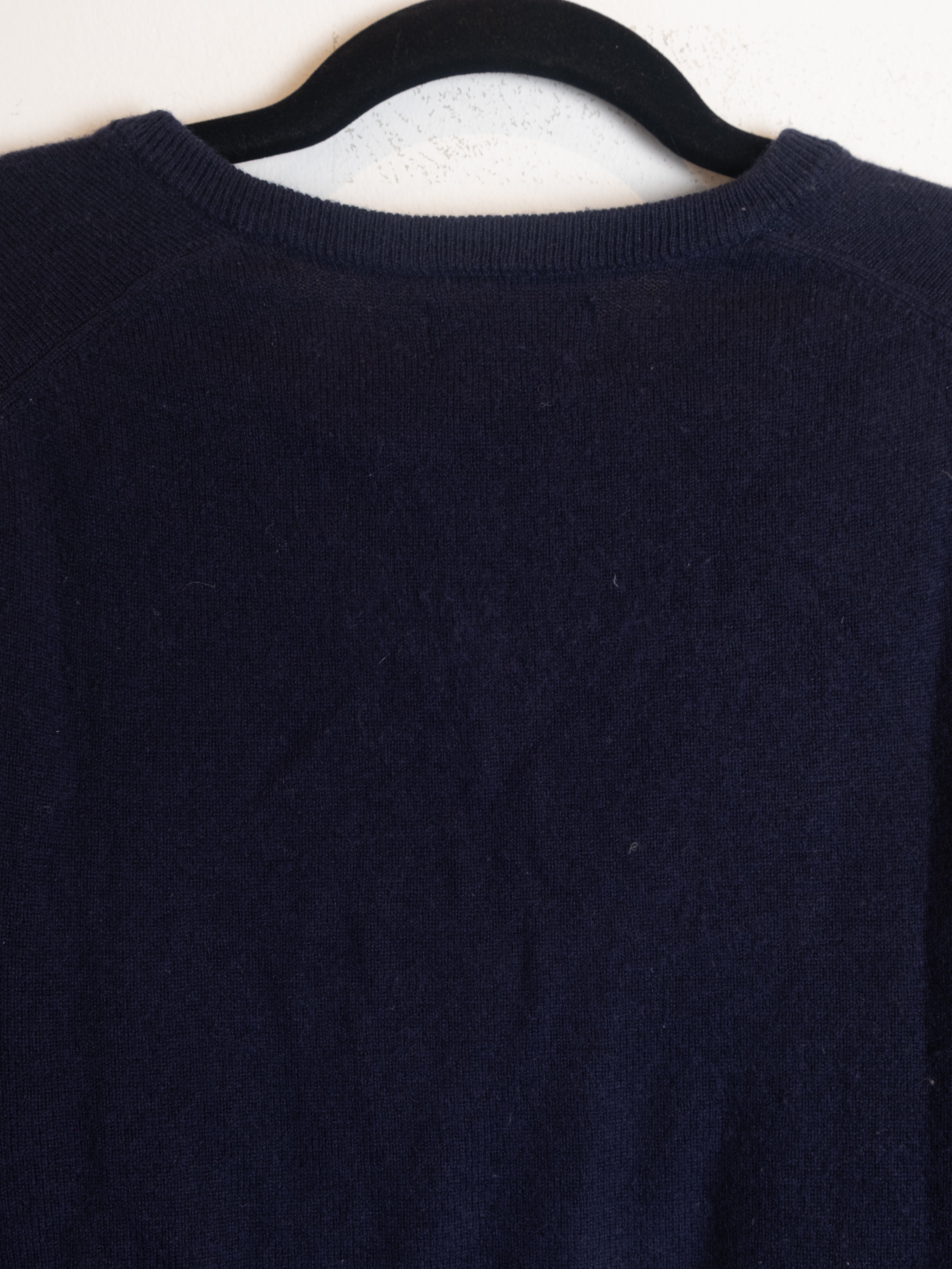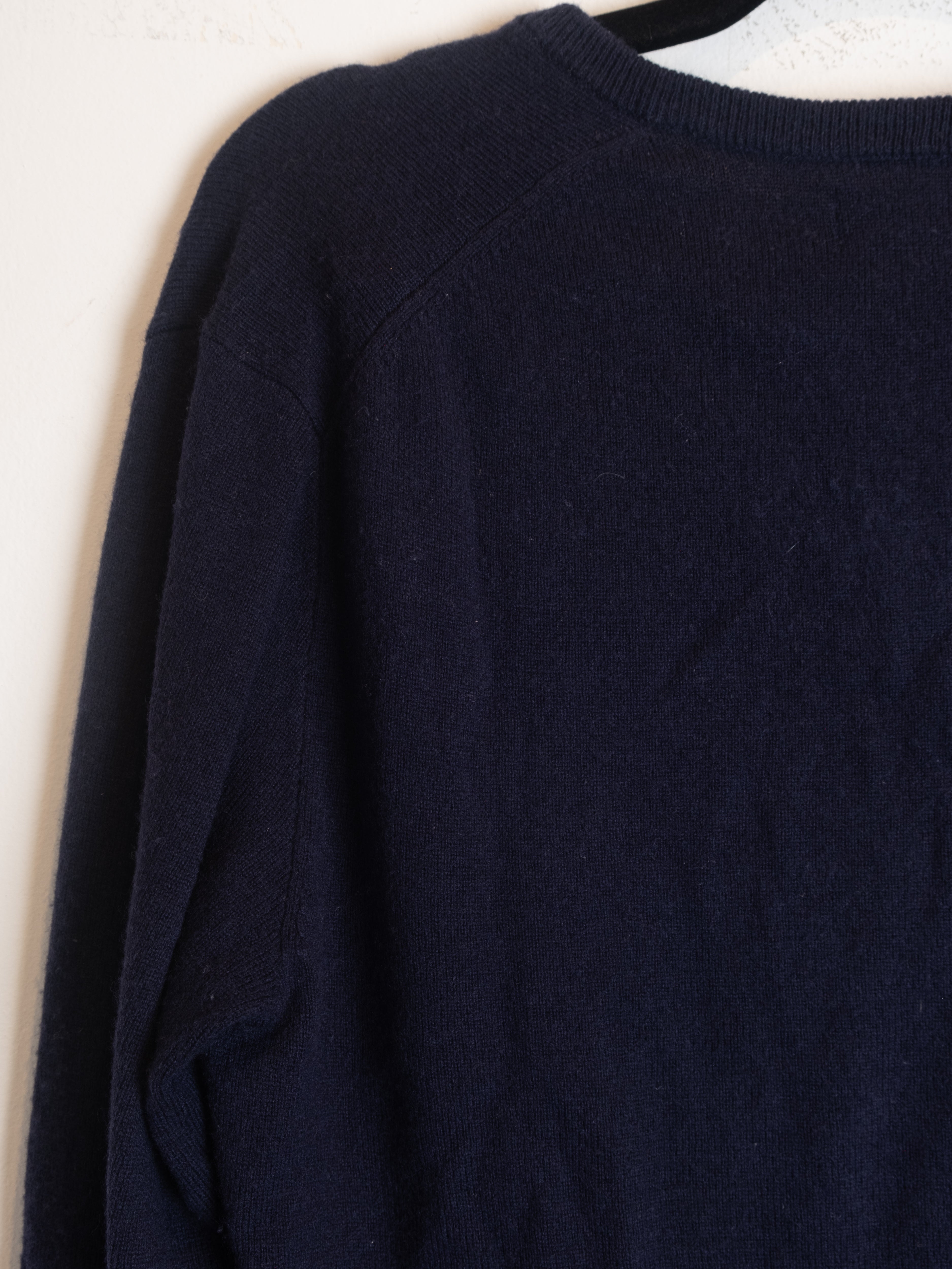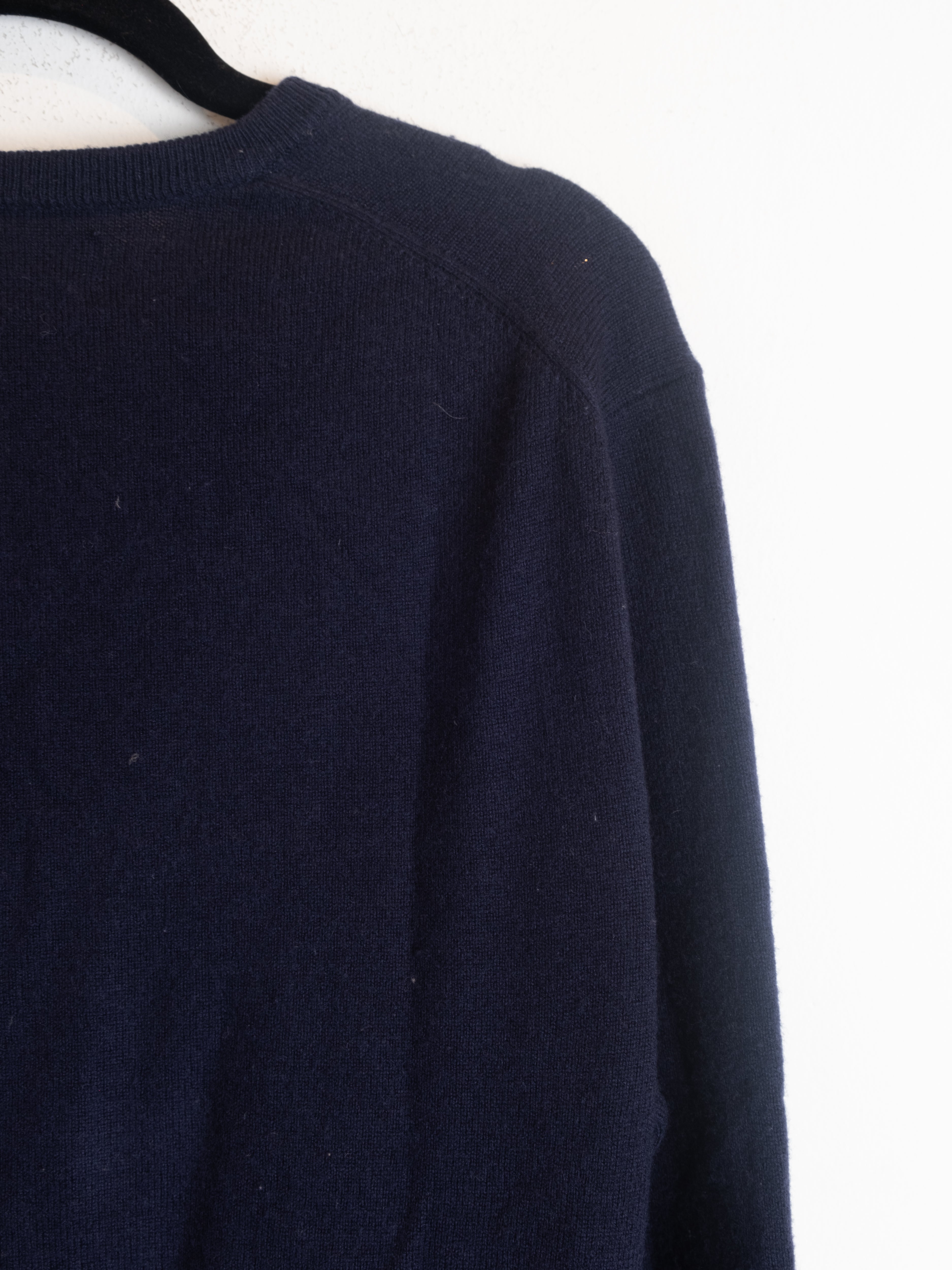 הסוודר עשוי צמר רך בצבע נייבי. גזרת V נקייה, שרוולים ארוכים, סיומי ריב עדינים ולוגו רקום בצד שמאל. בד נעים ומלטף המתאים ליום־יום וללבוש אלגנטי יותר.
