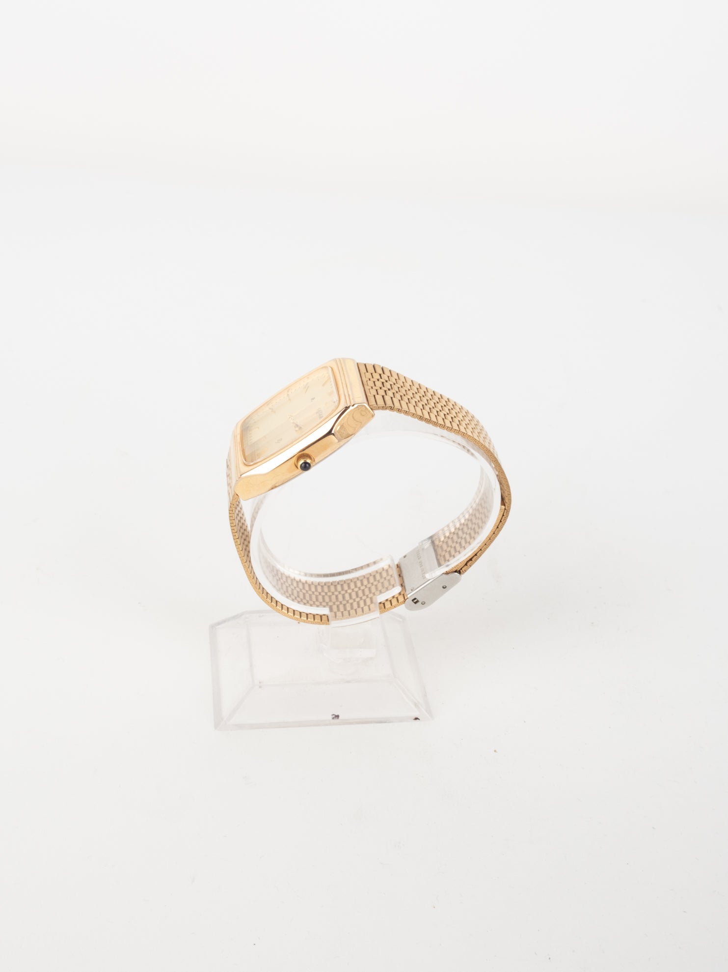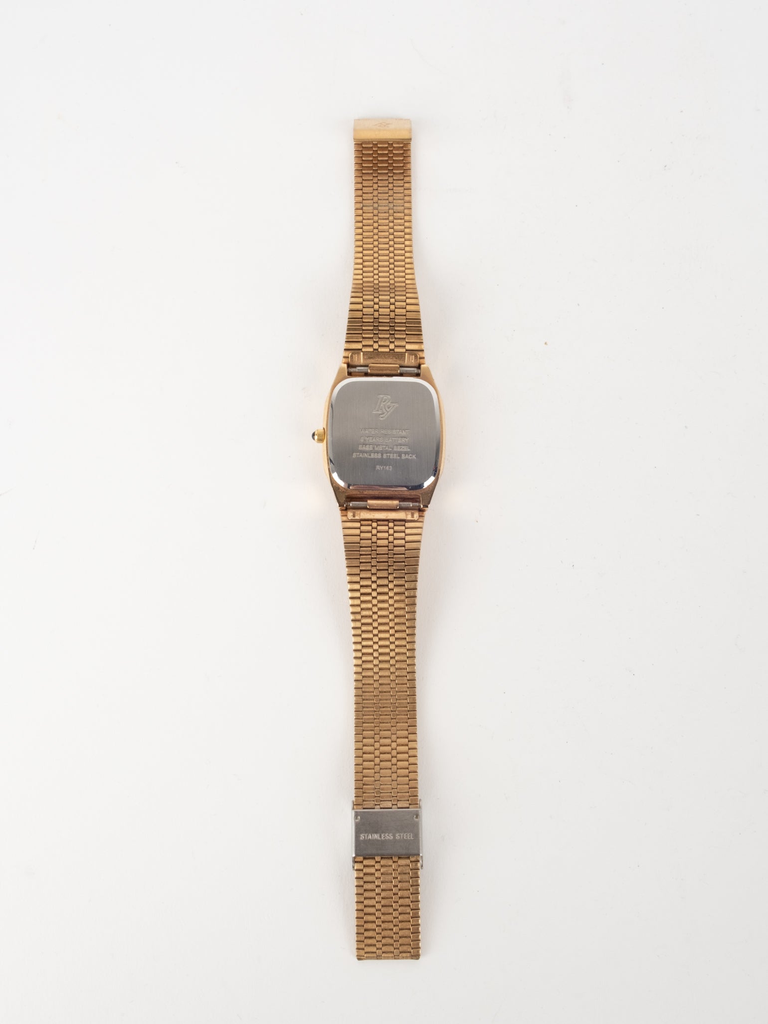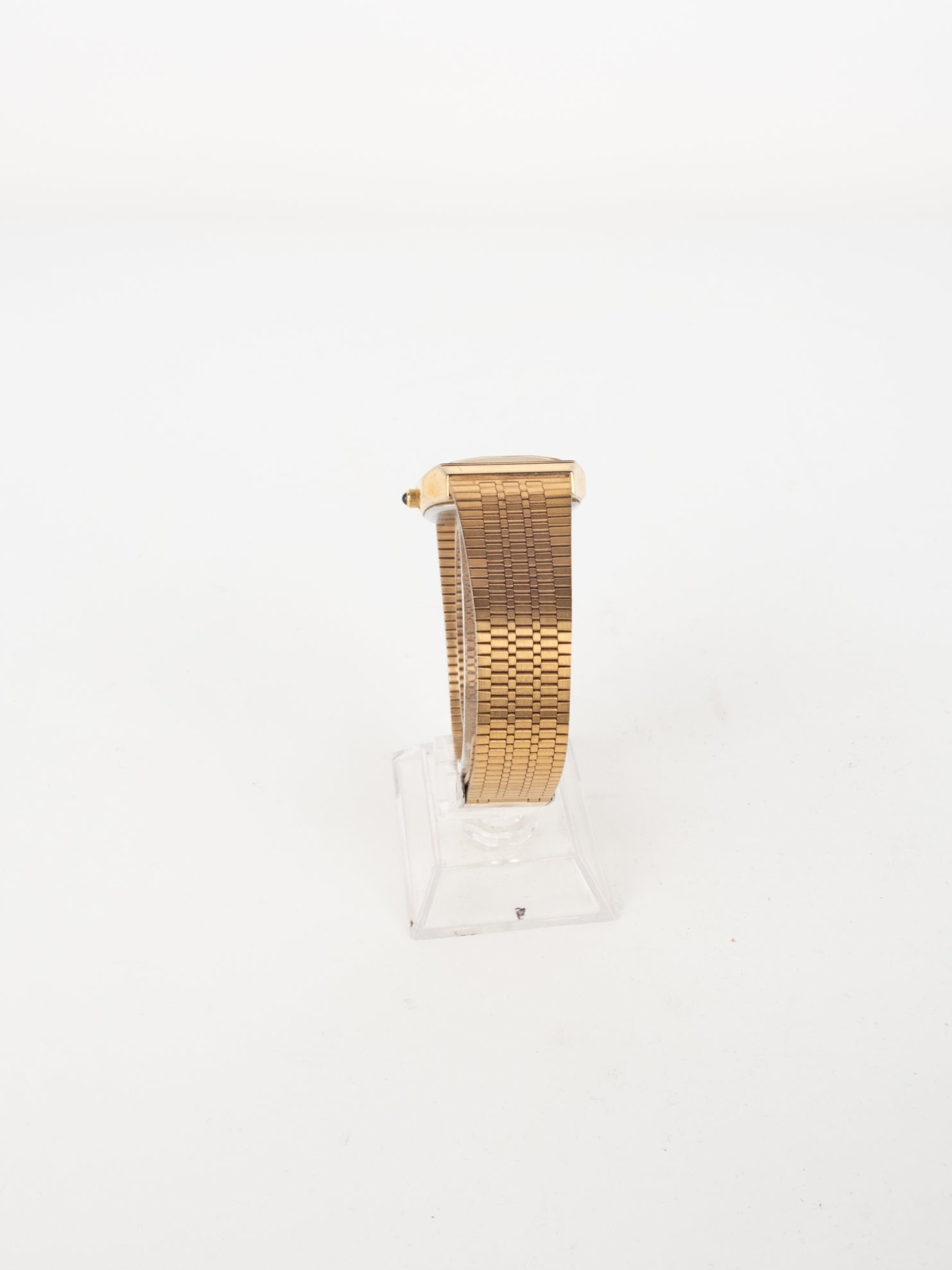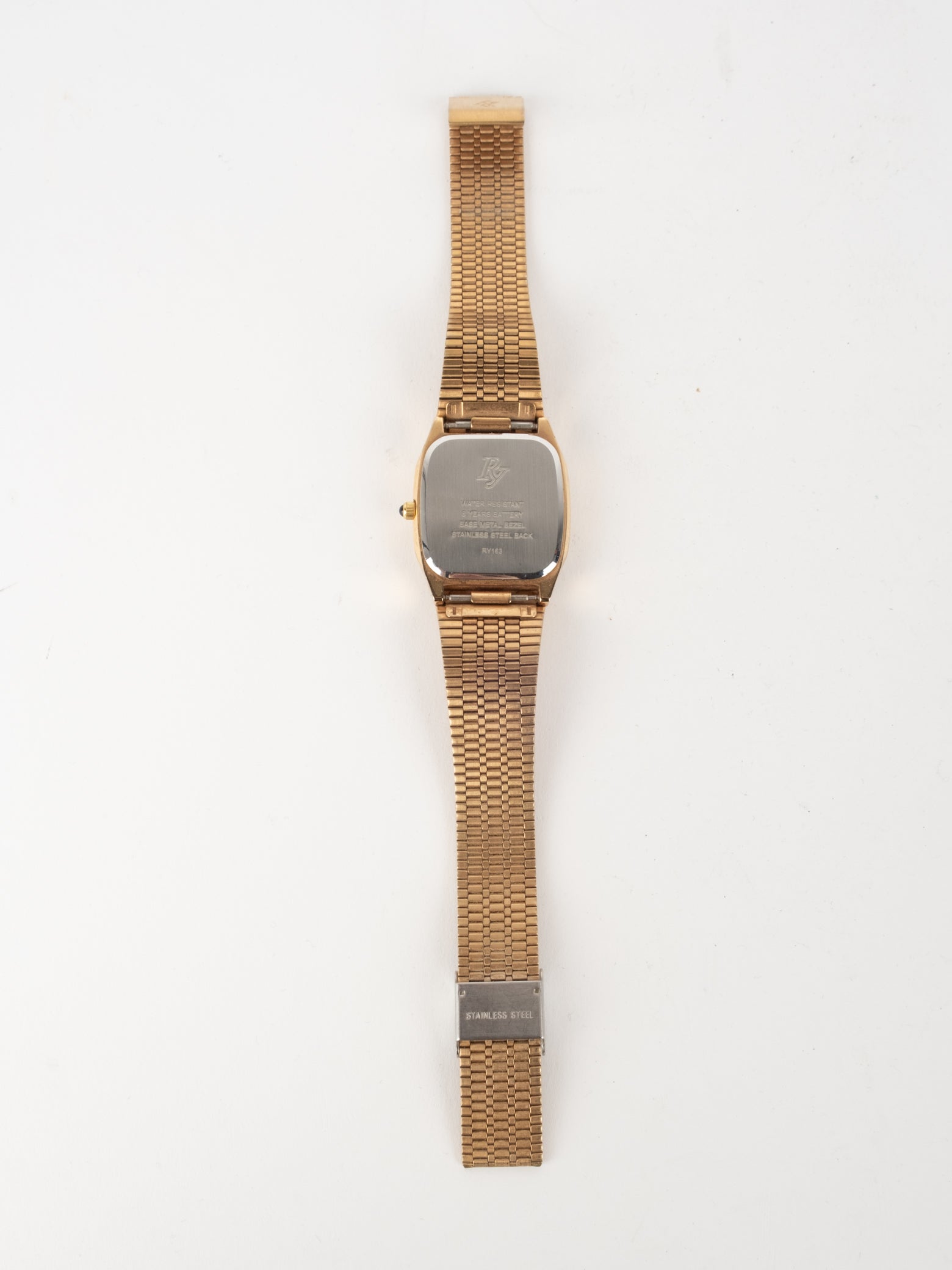 שעון מהמם בצבע זהב בעל פני שעון בצורה מרובעת עם רקע בצבע זהה ומחוגים. שעון זה נסגר באמצעות סוגר ממותג.