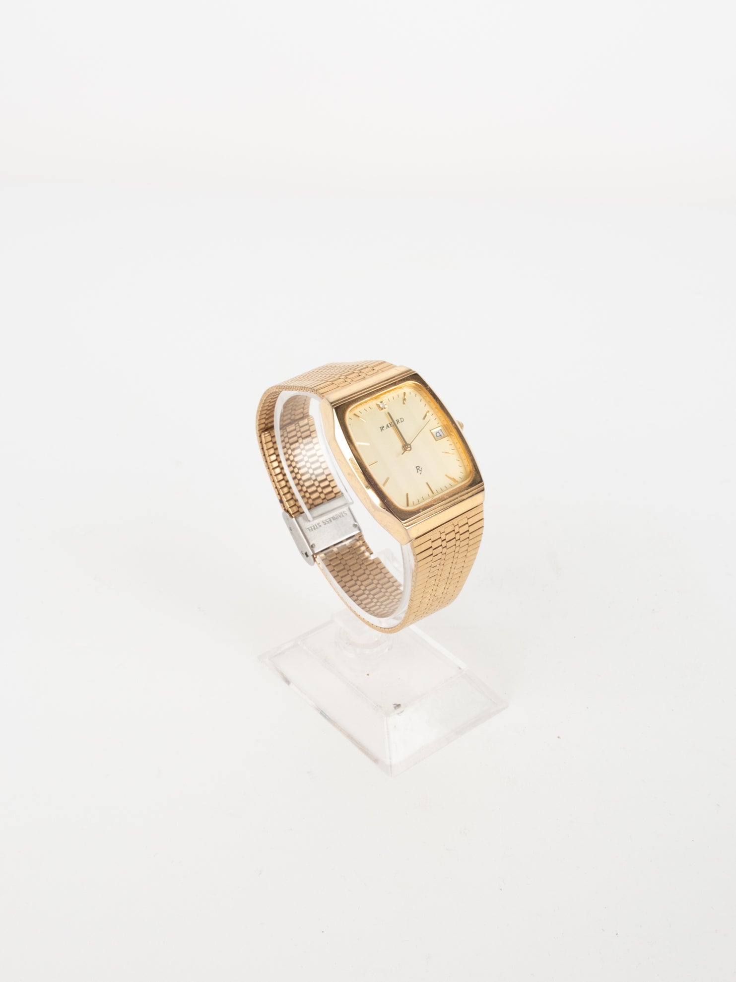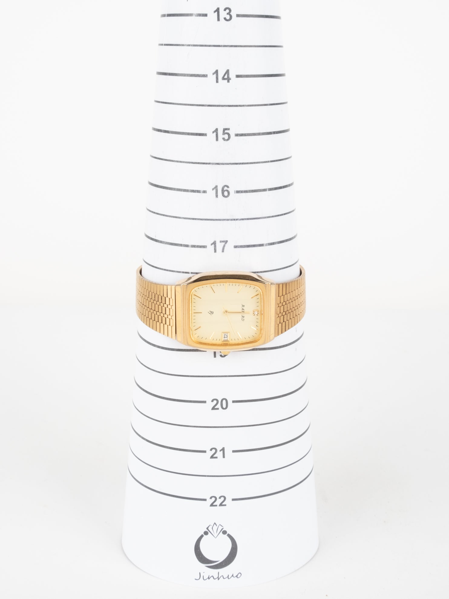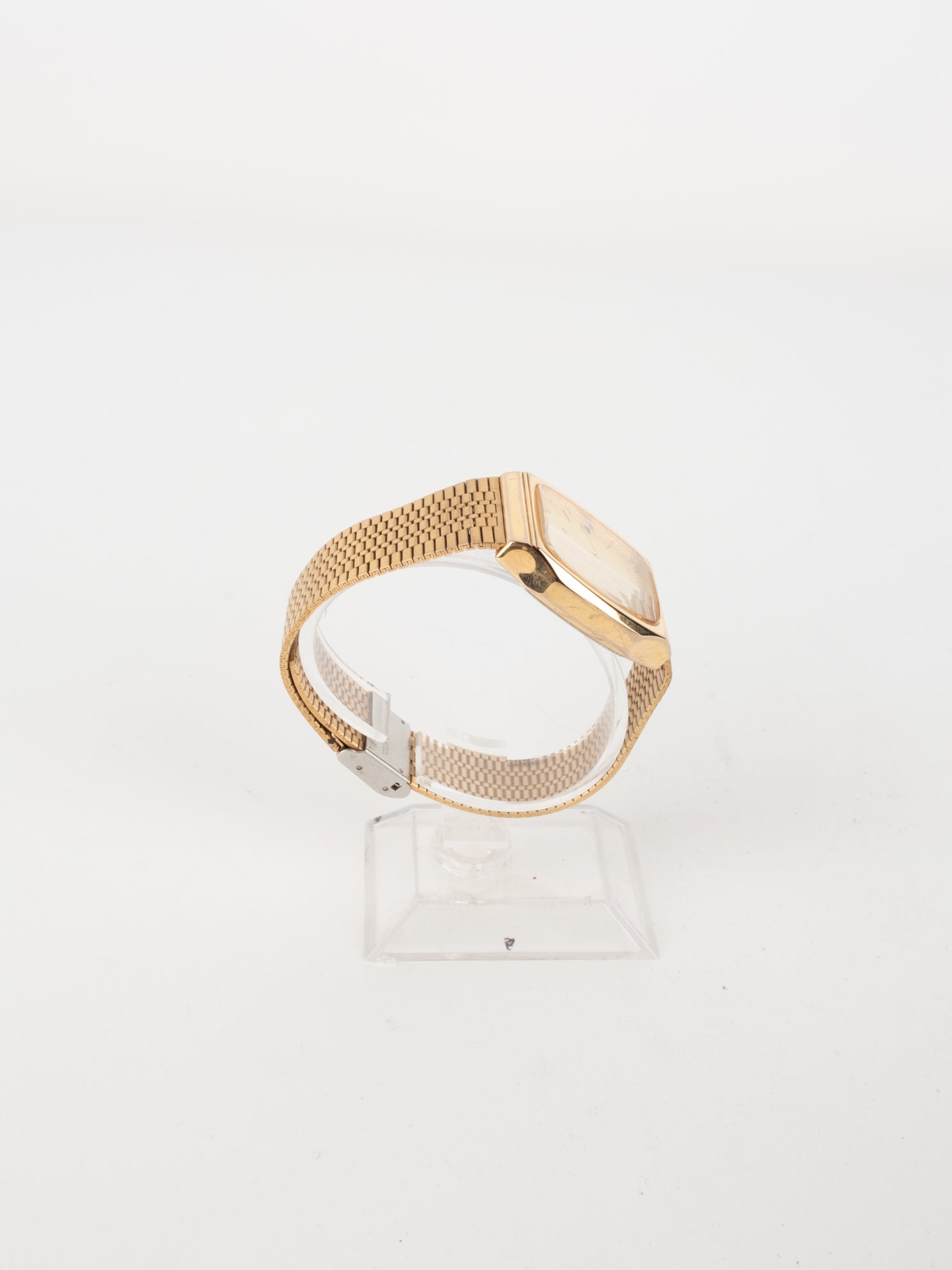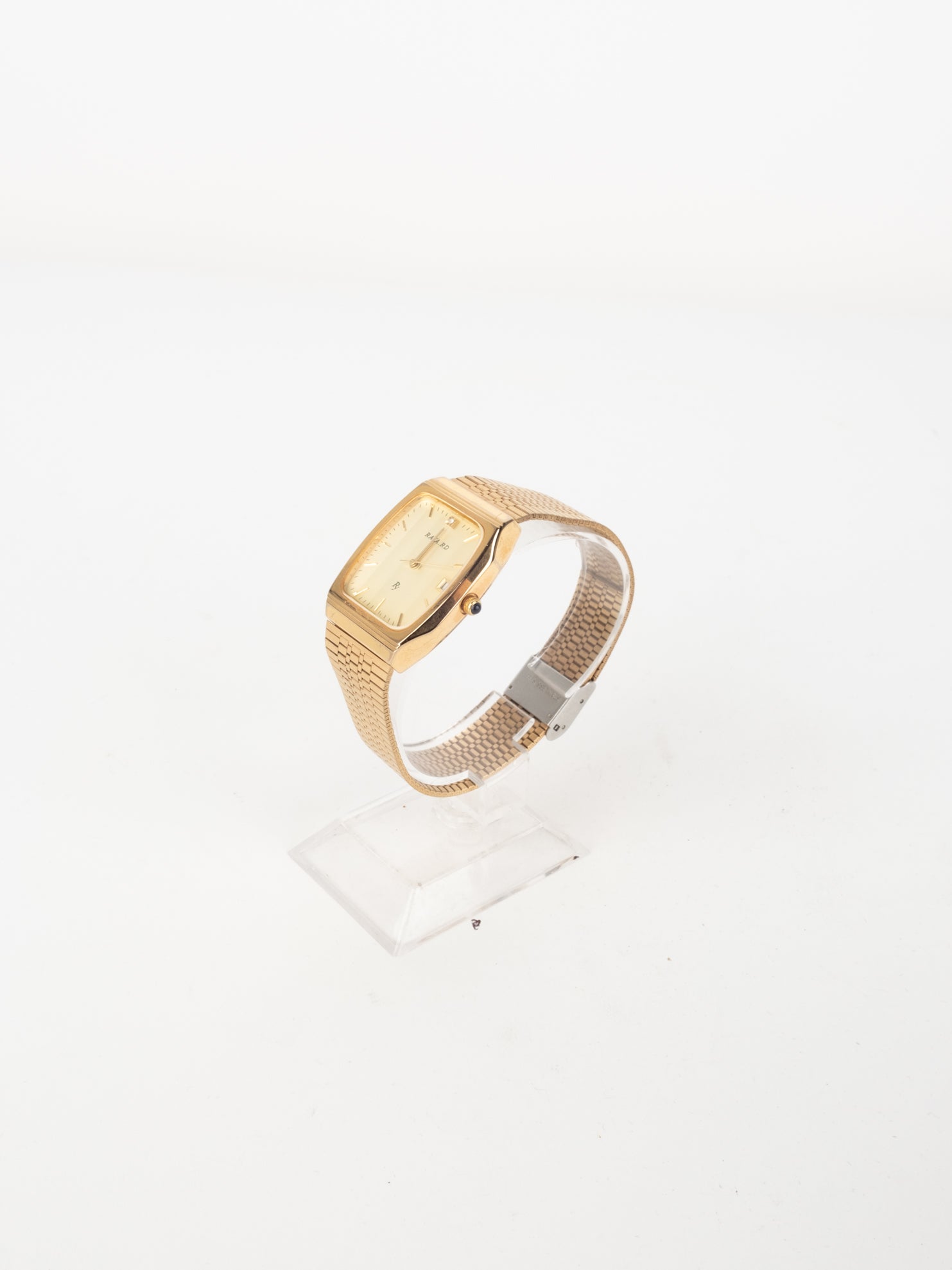 שעון מהמם בצבע זהב בעל פני שעון בצורה מרובעת עם רקע בצבע זהה ומחוגים. שעון זה נסגר באמצעות סוגר ממותג.