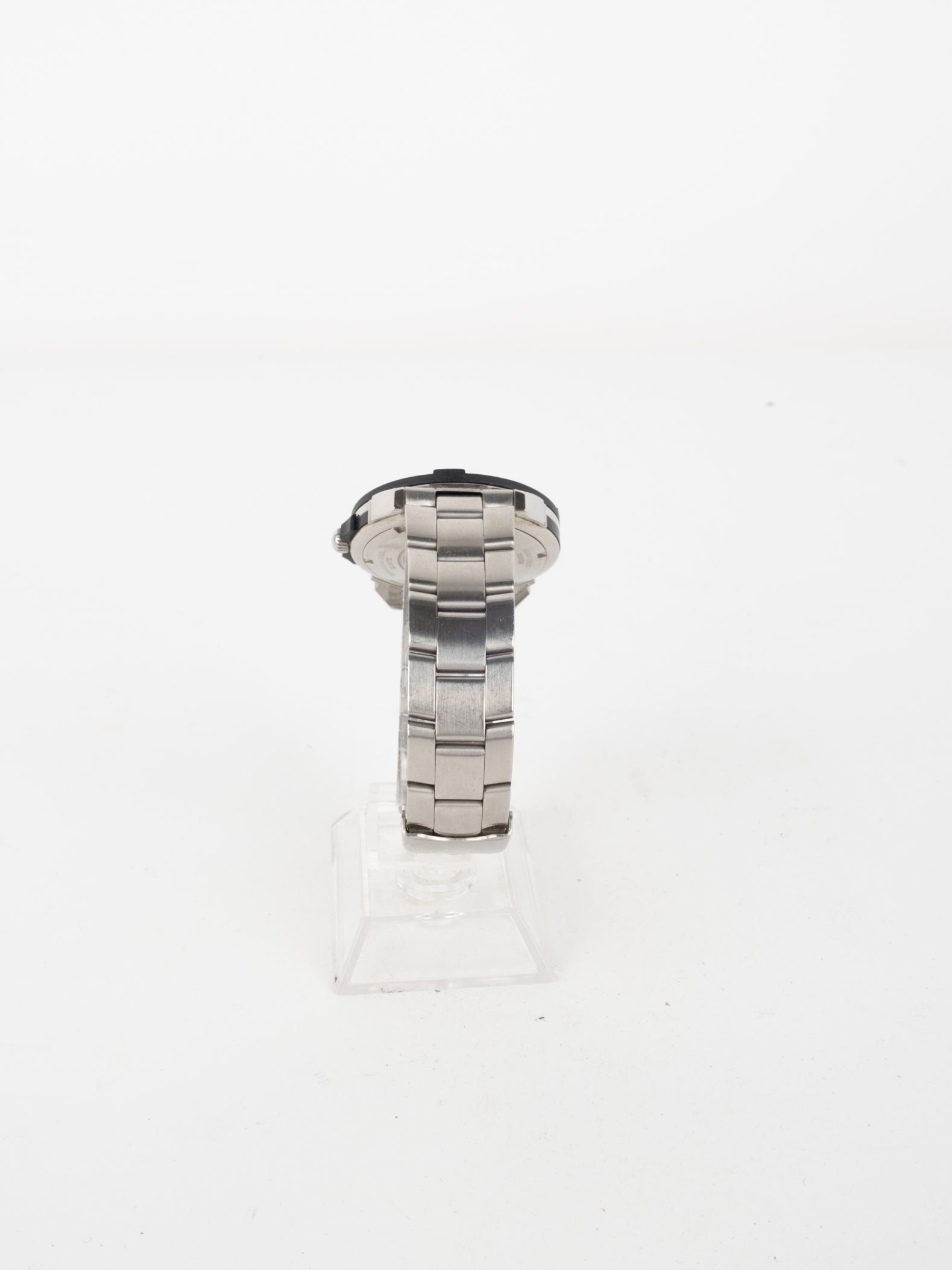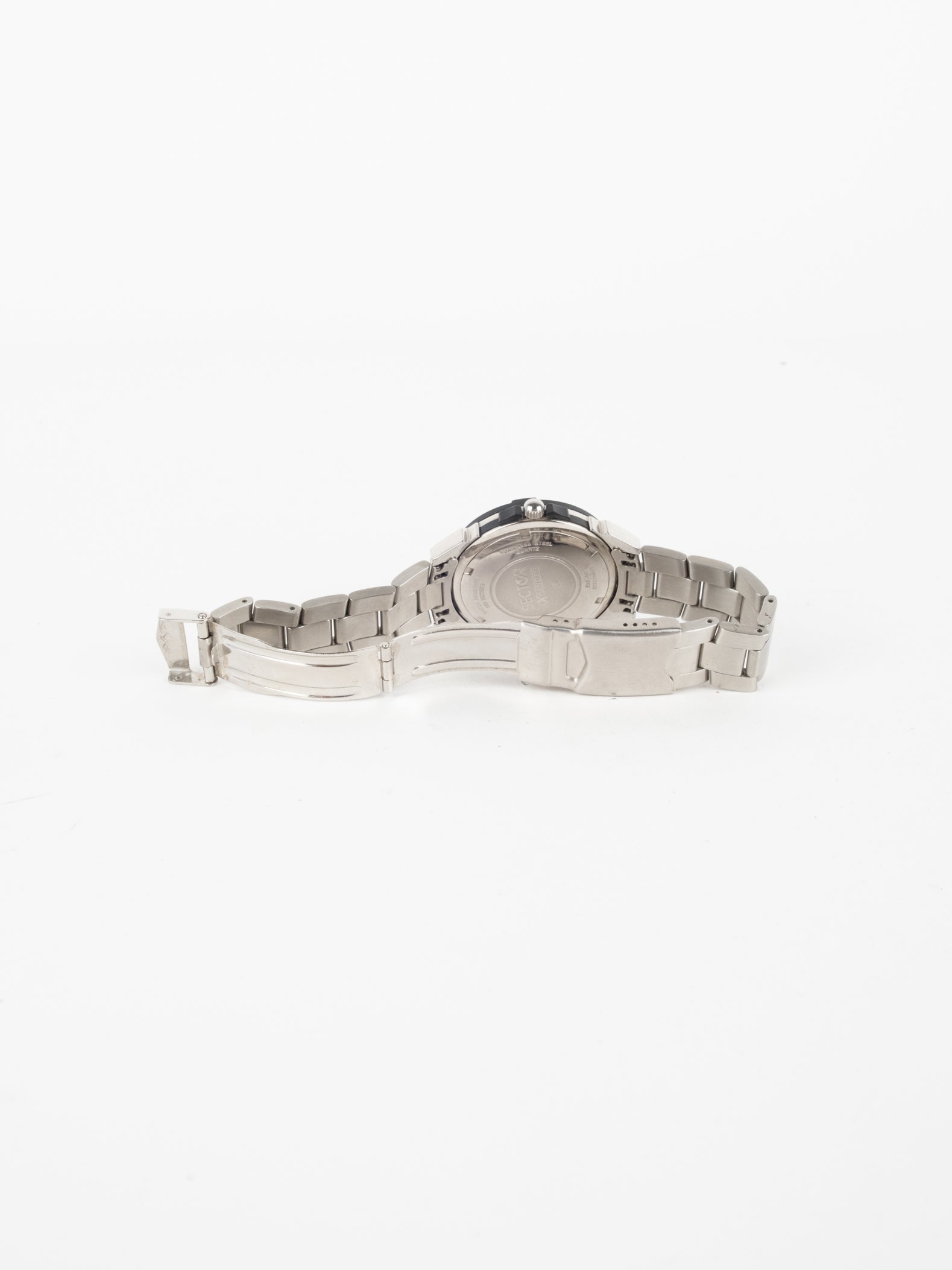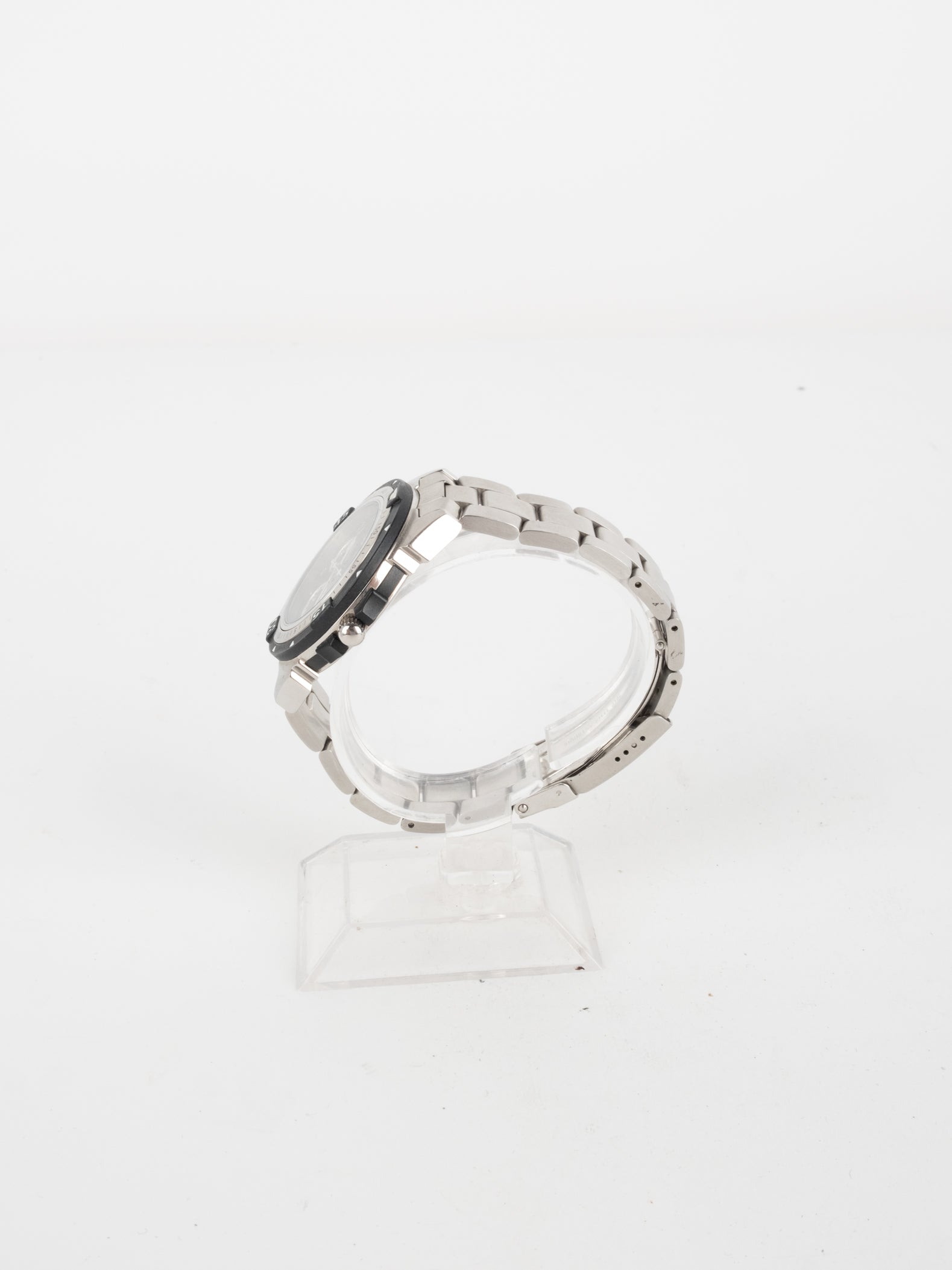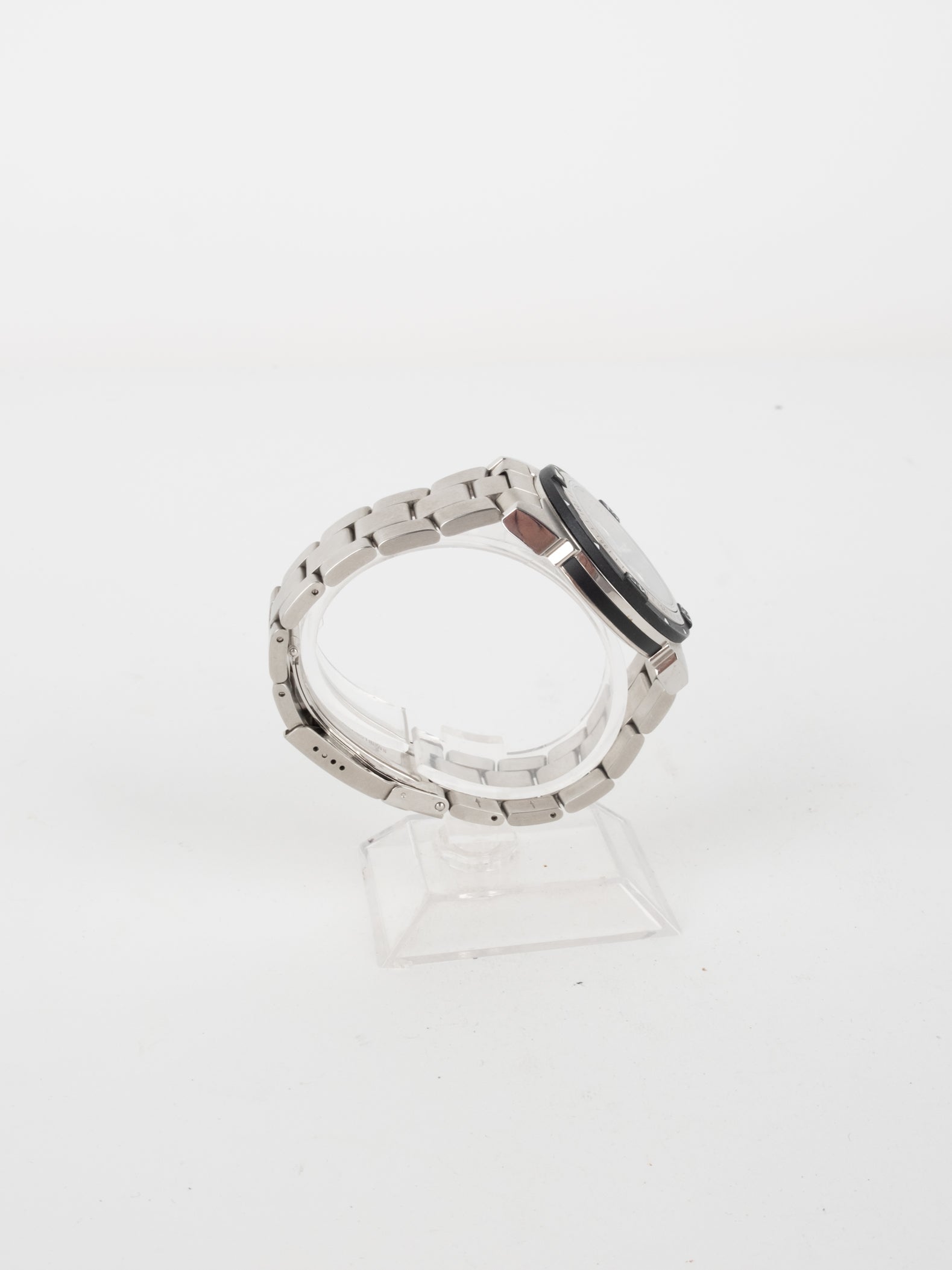 שעון ספורטיבי בצבע כסוף בעל פני שעון בצורה עגולה עם רקע שחור ומחוגים. שעון זה נסגר באמצעות סוגר ממותג.