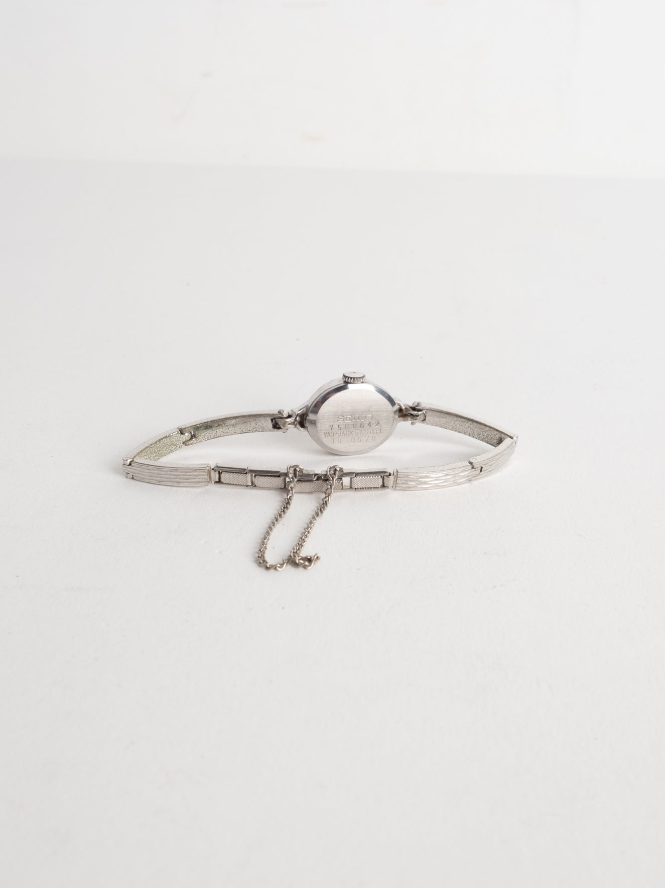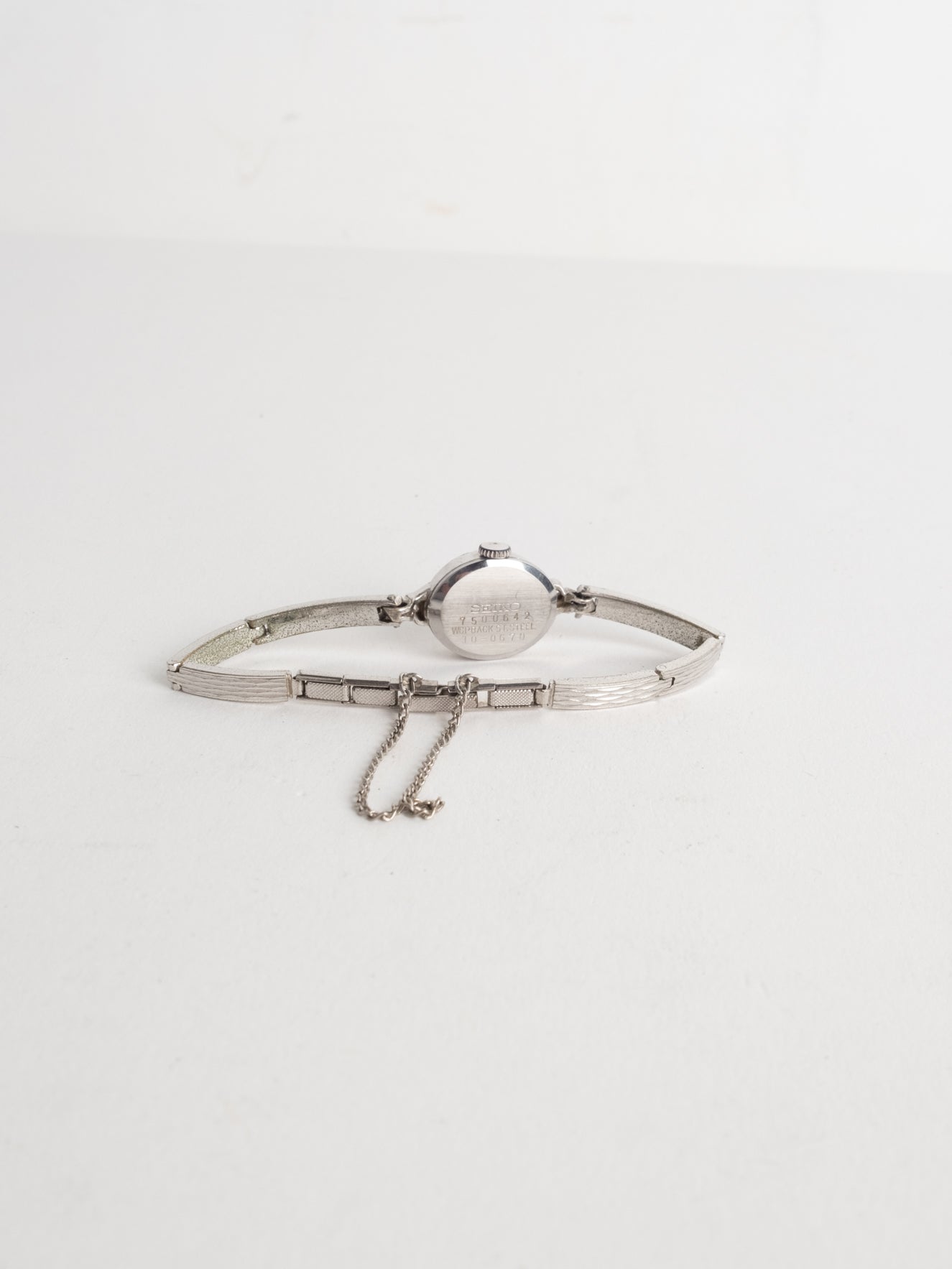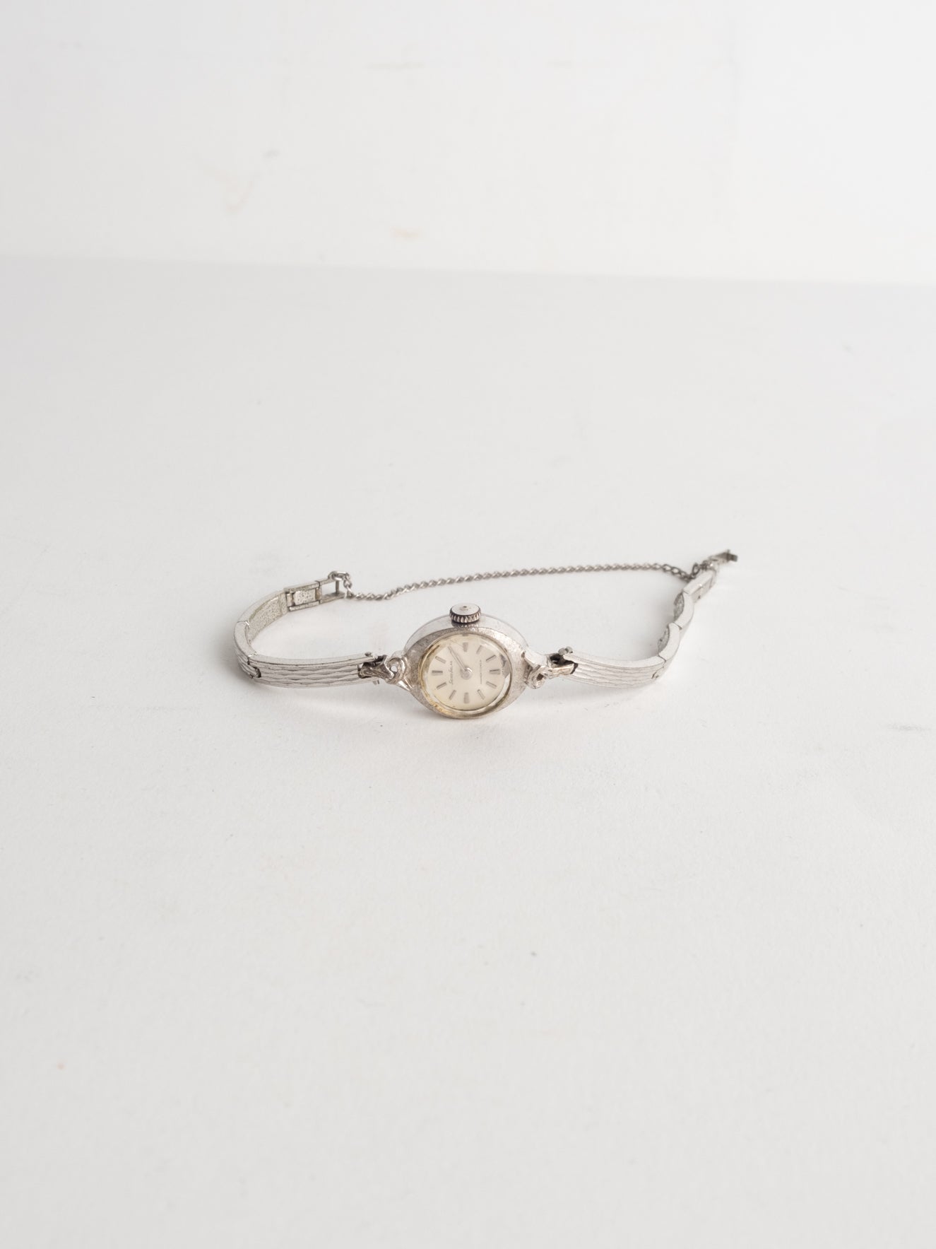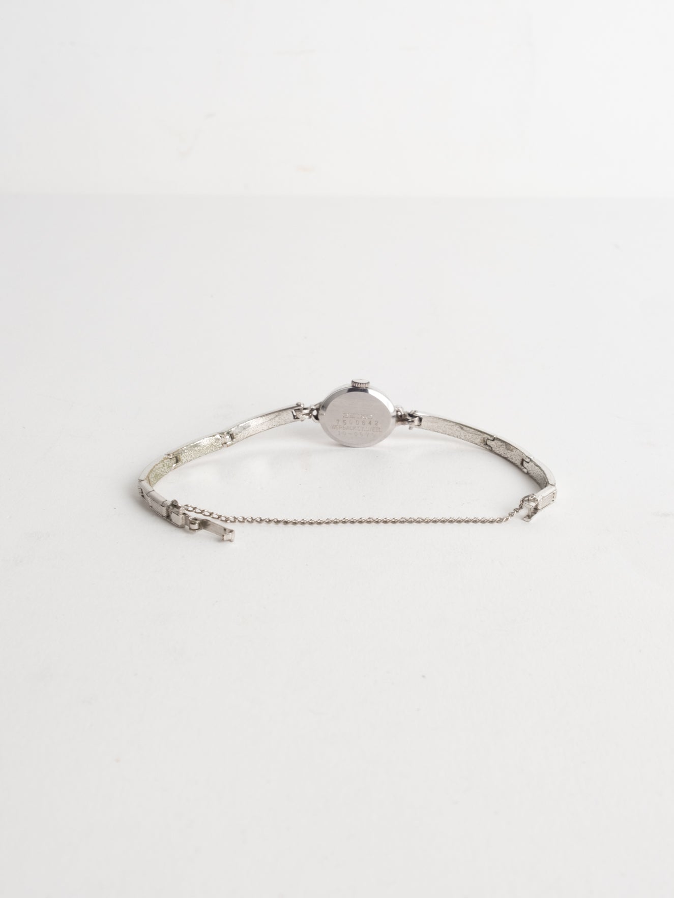 שעון עדין וקטן בצבע כסוף בעל פני שעון בצורה עגולה עם רקע לבן ומחוגים. שעון זה נסגר באמצעות סוגר ממותג. ישנה שרשרת בטיחות השומרת על השעון מנפילה מהיד.