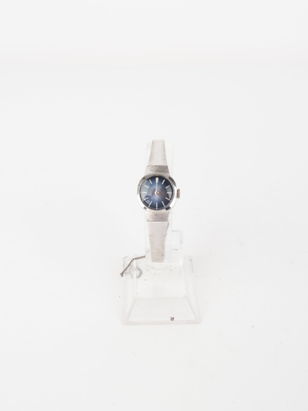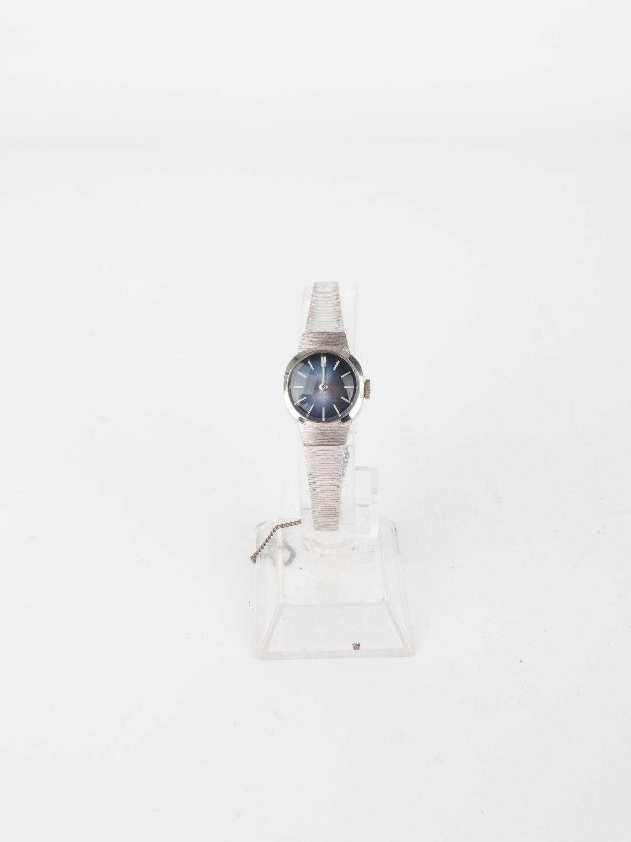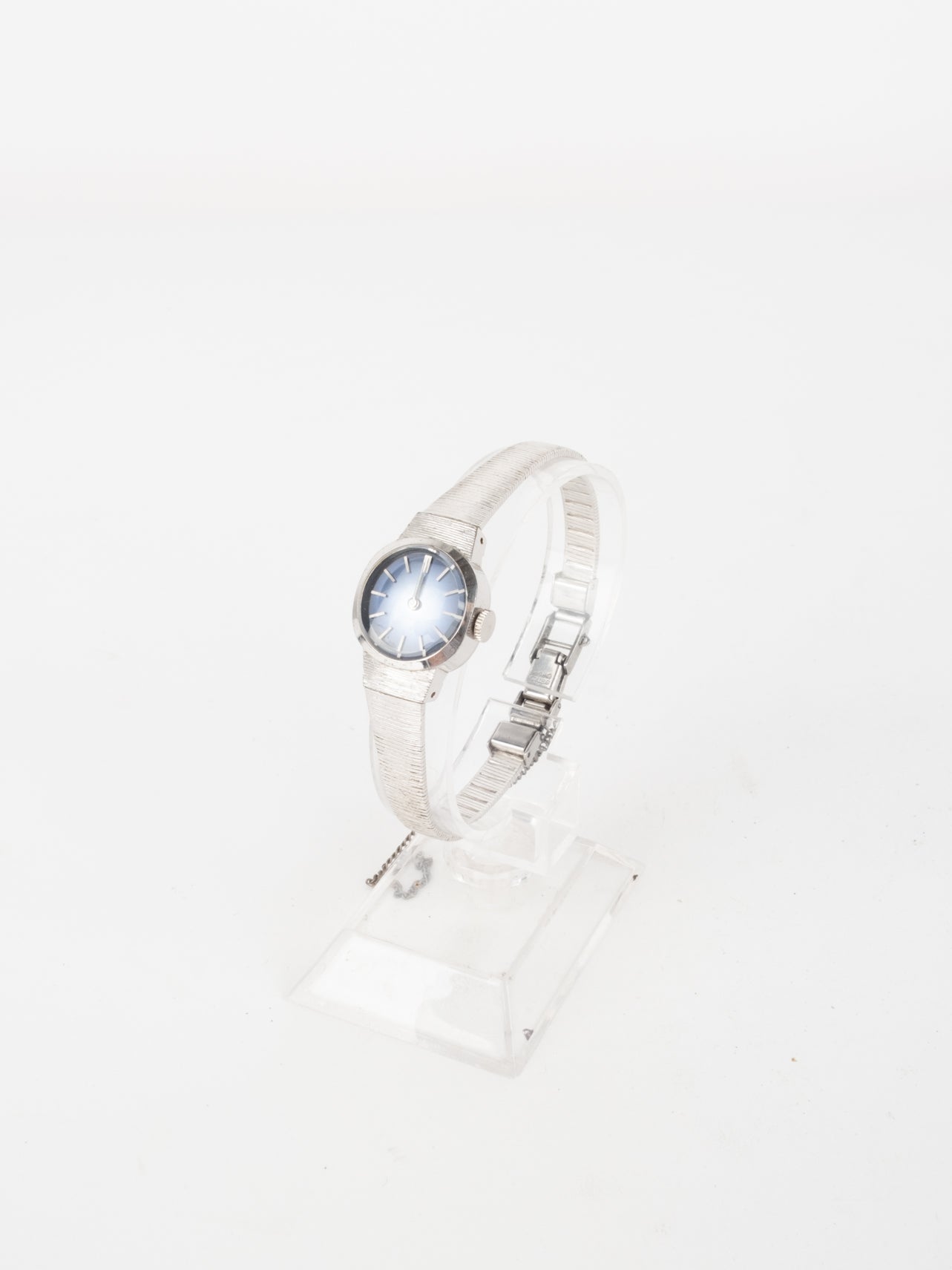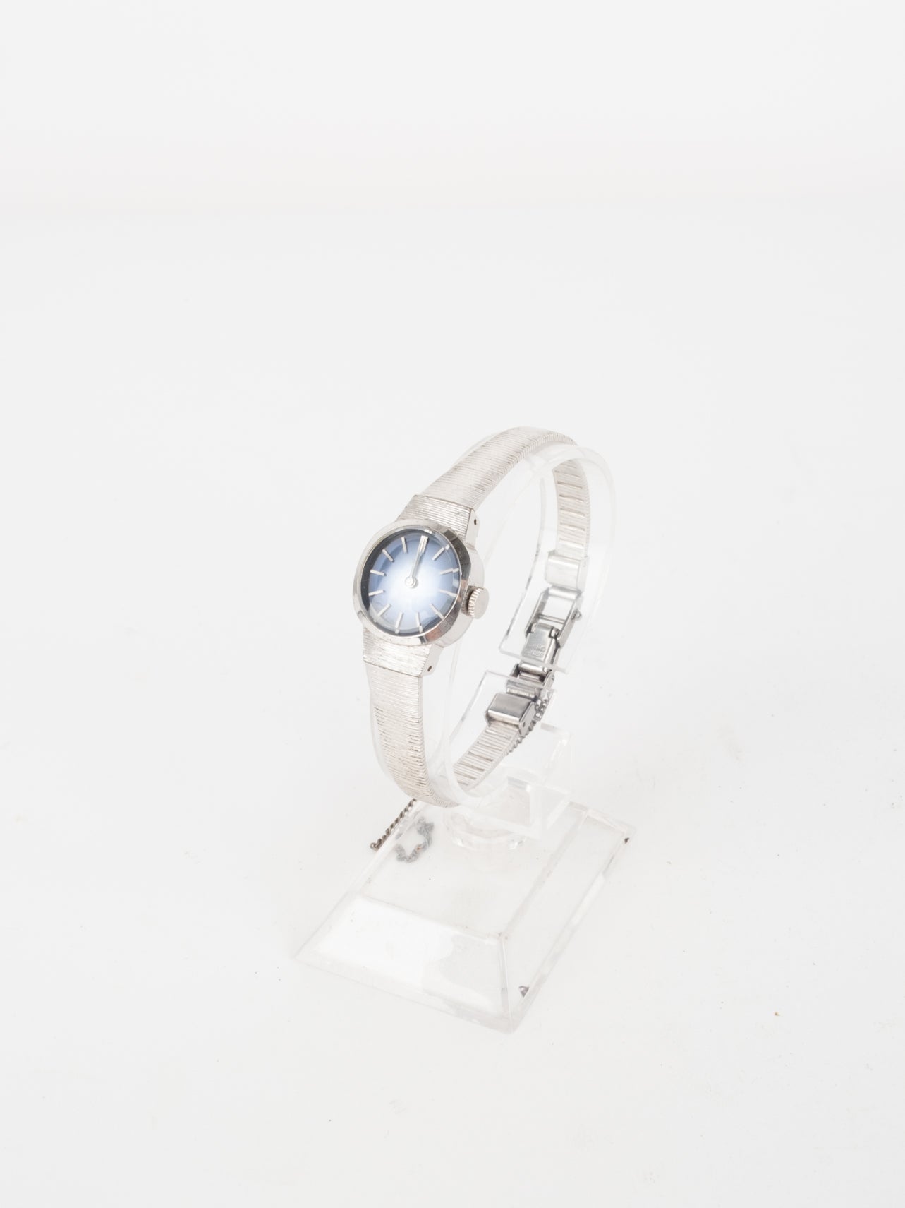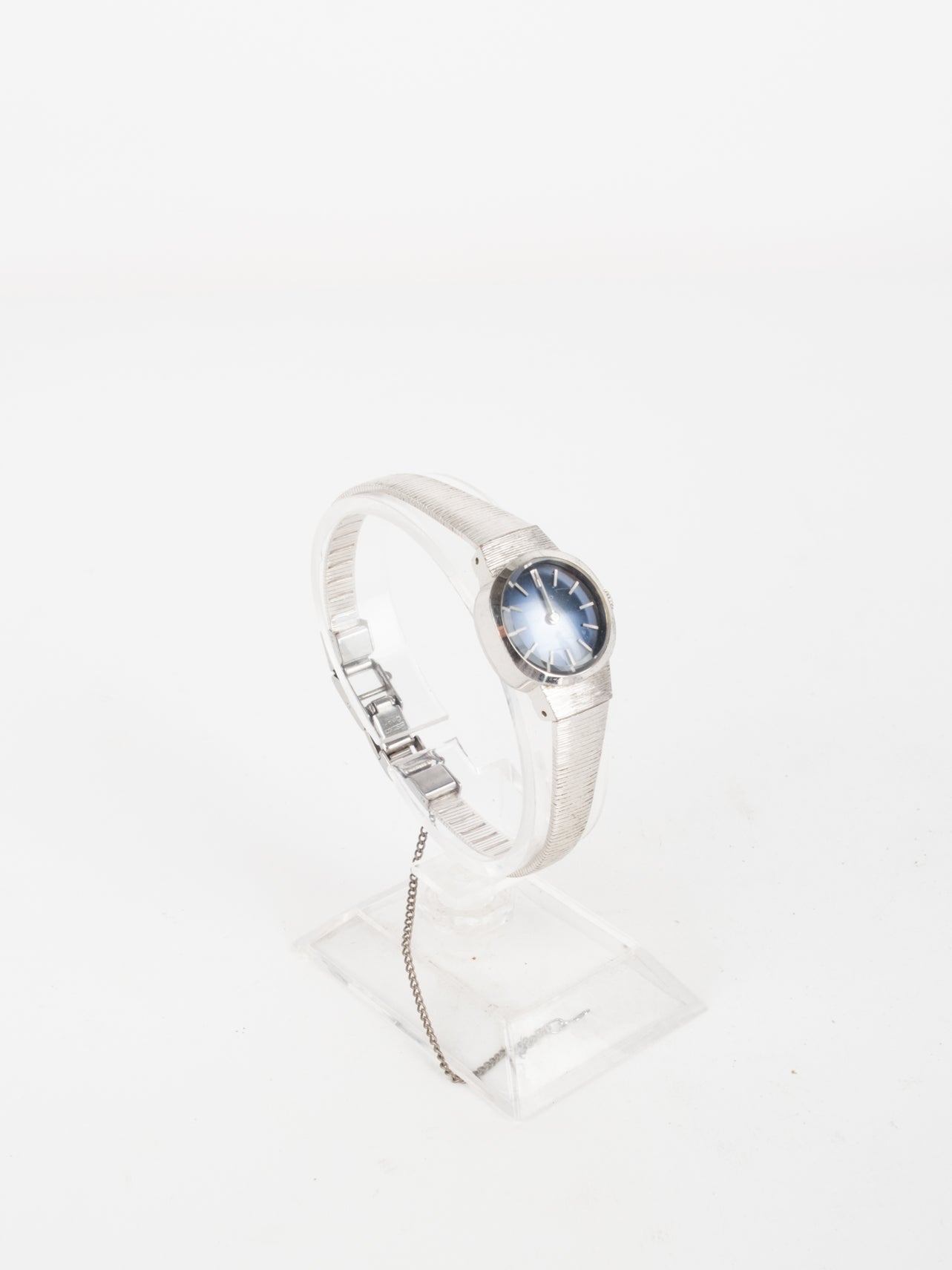 שעון קטן ואלגנטי בצבע כסוף בעל פני שעון בצורה עגולה עם רקע כחול ומחוגים. שעון זה נסגר באמצעות סוגר ממותג.