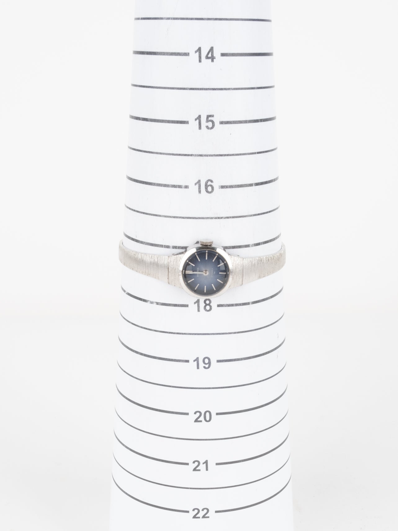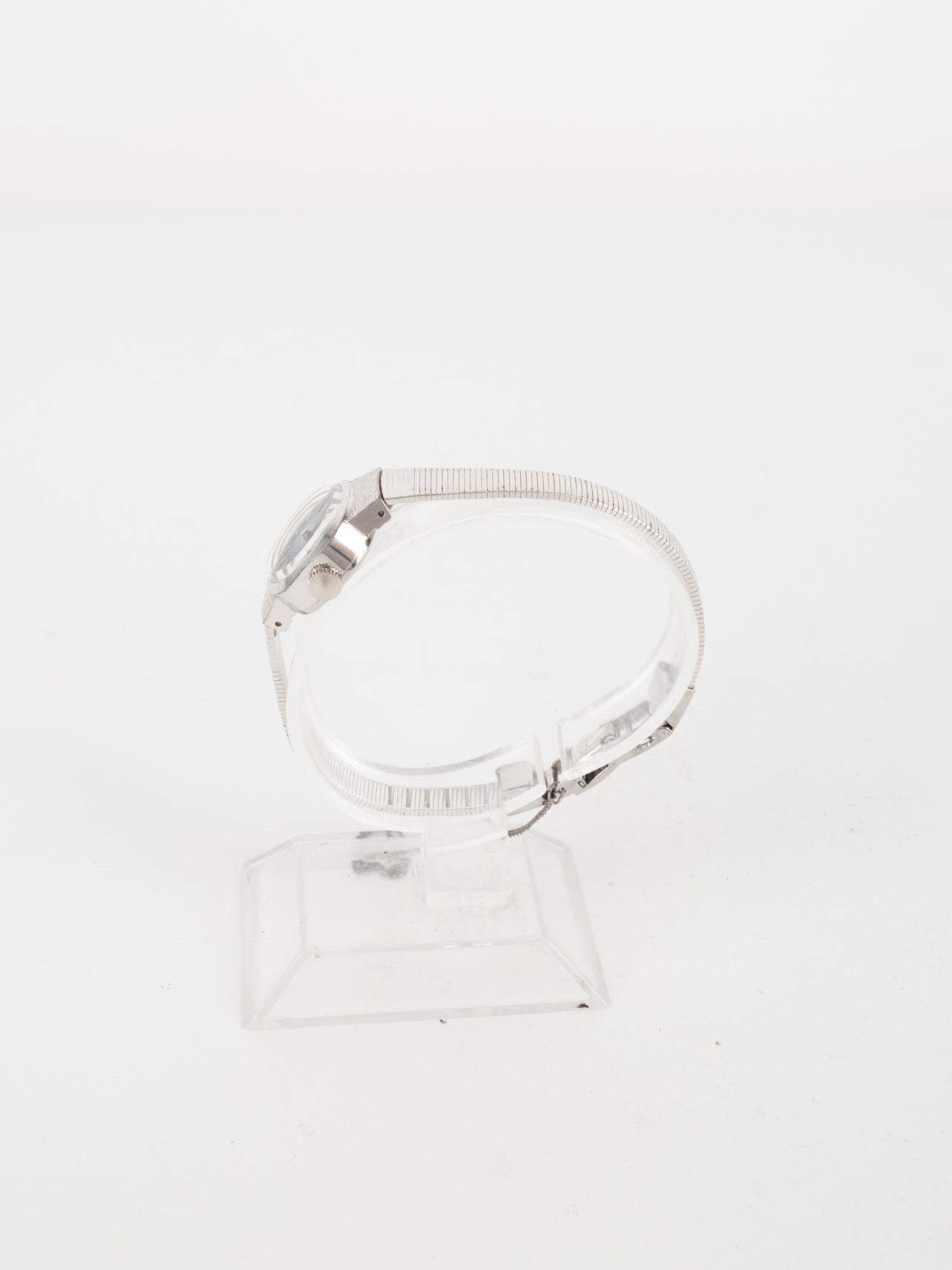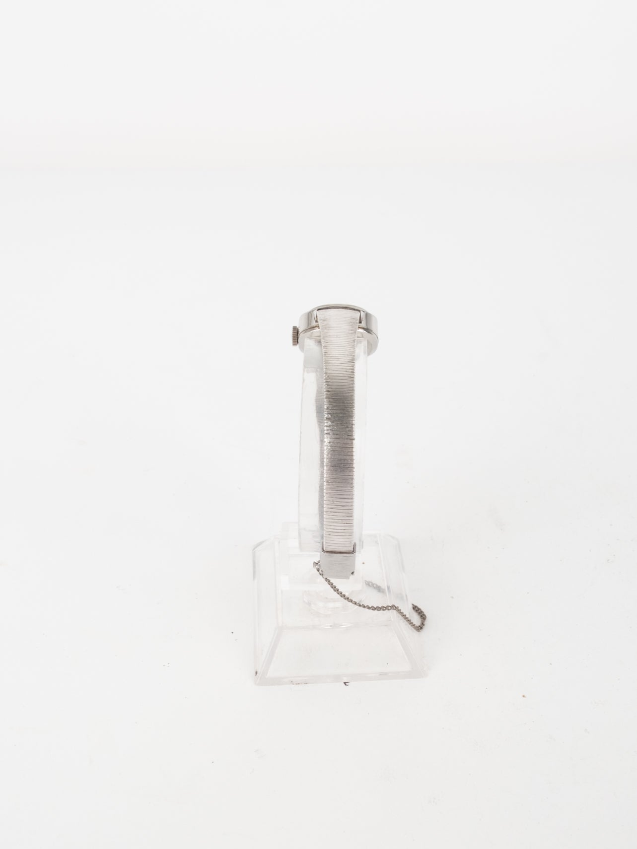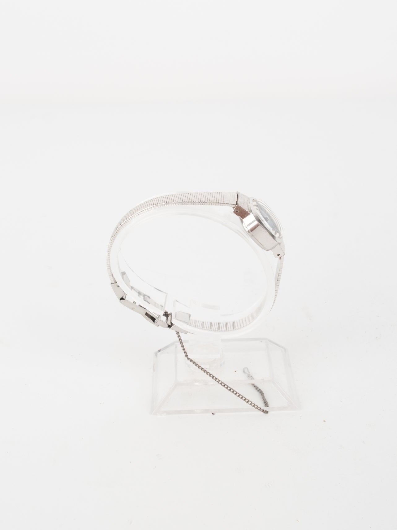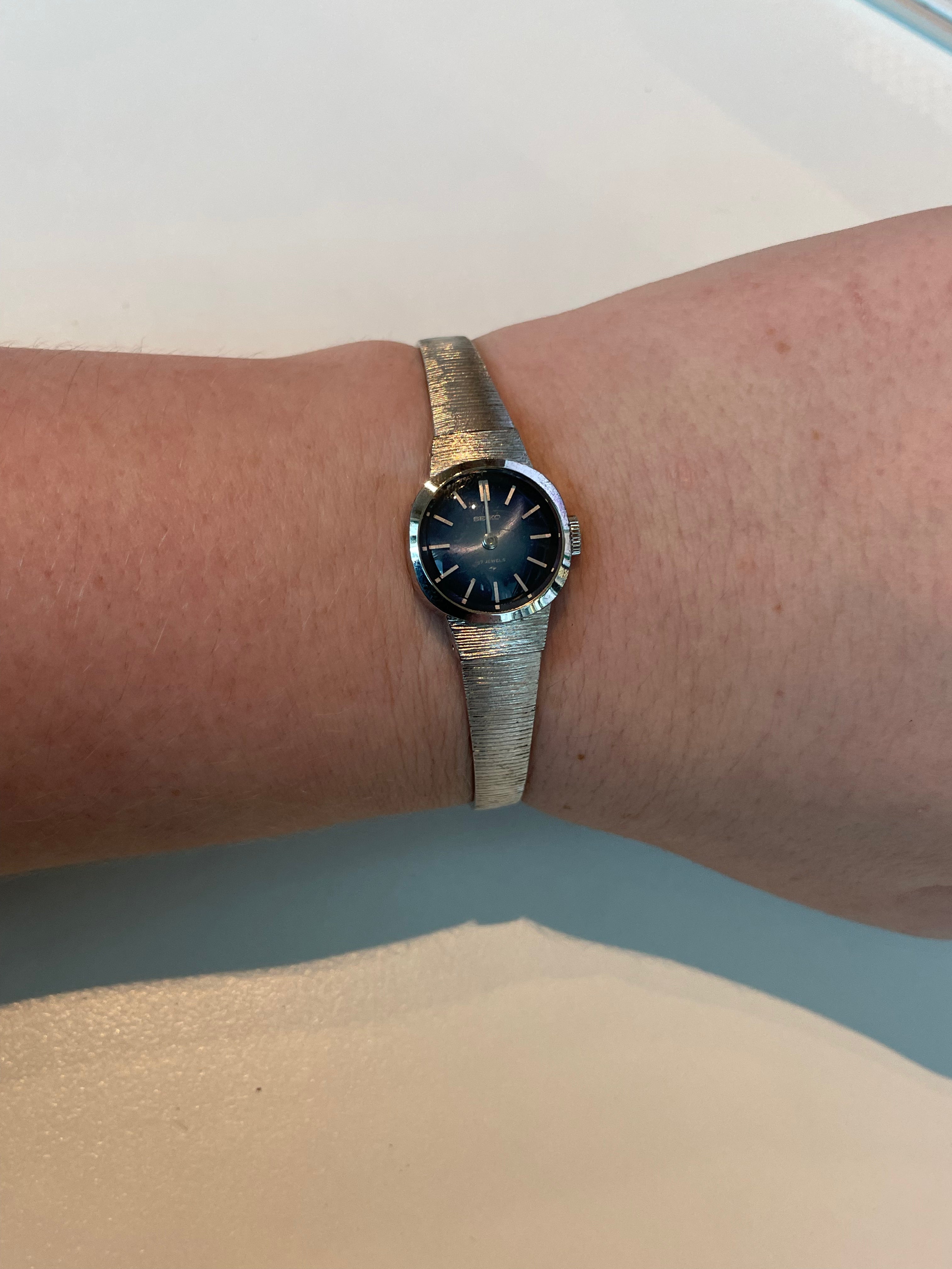 שעון קטן ואלגנטי בצבע כסוף בעל פני שעון בצורה עגולה עם רקע כחול ומחוגים. שעון זה נסגר באמצעות סוגר ממותג.
