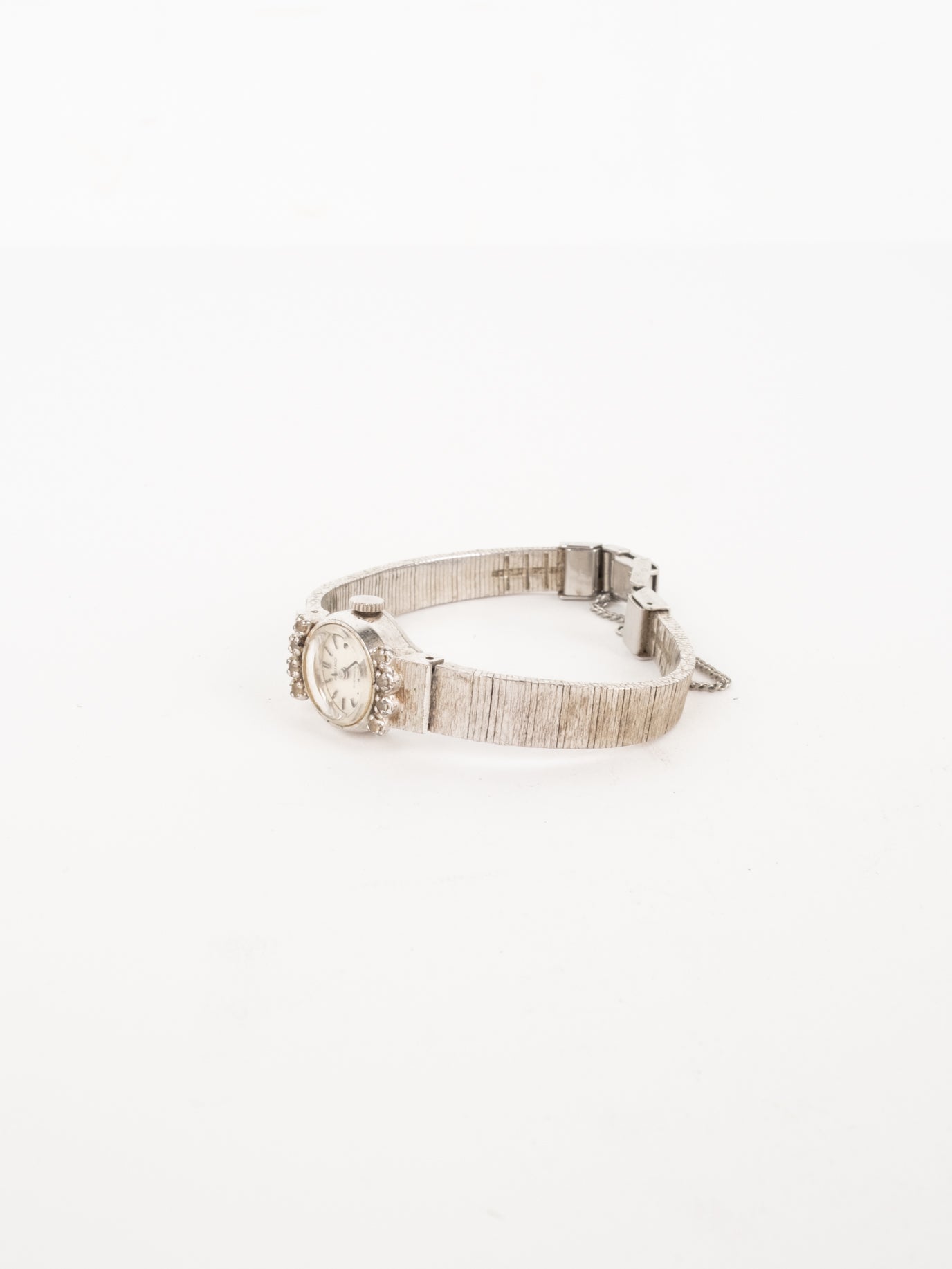 שעון קטן ואלגנטי בצבע כסוף בעל פני שעון בצורה עגולה עם רקע לבן ומחוגים. שעון זה נסגר באמצעות סוגר ממותג. ישנה שרשרת בטיחות השומרת על השעון מנפילה מהיד.