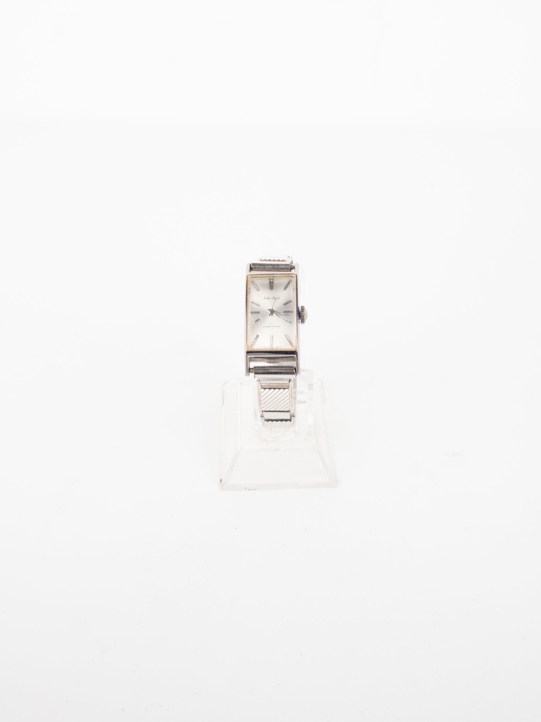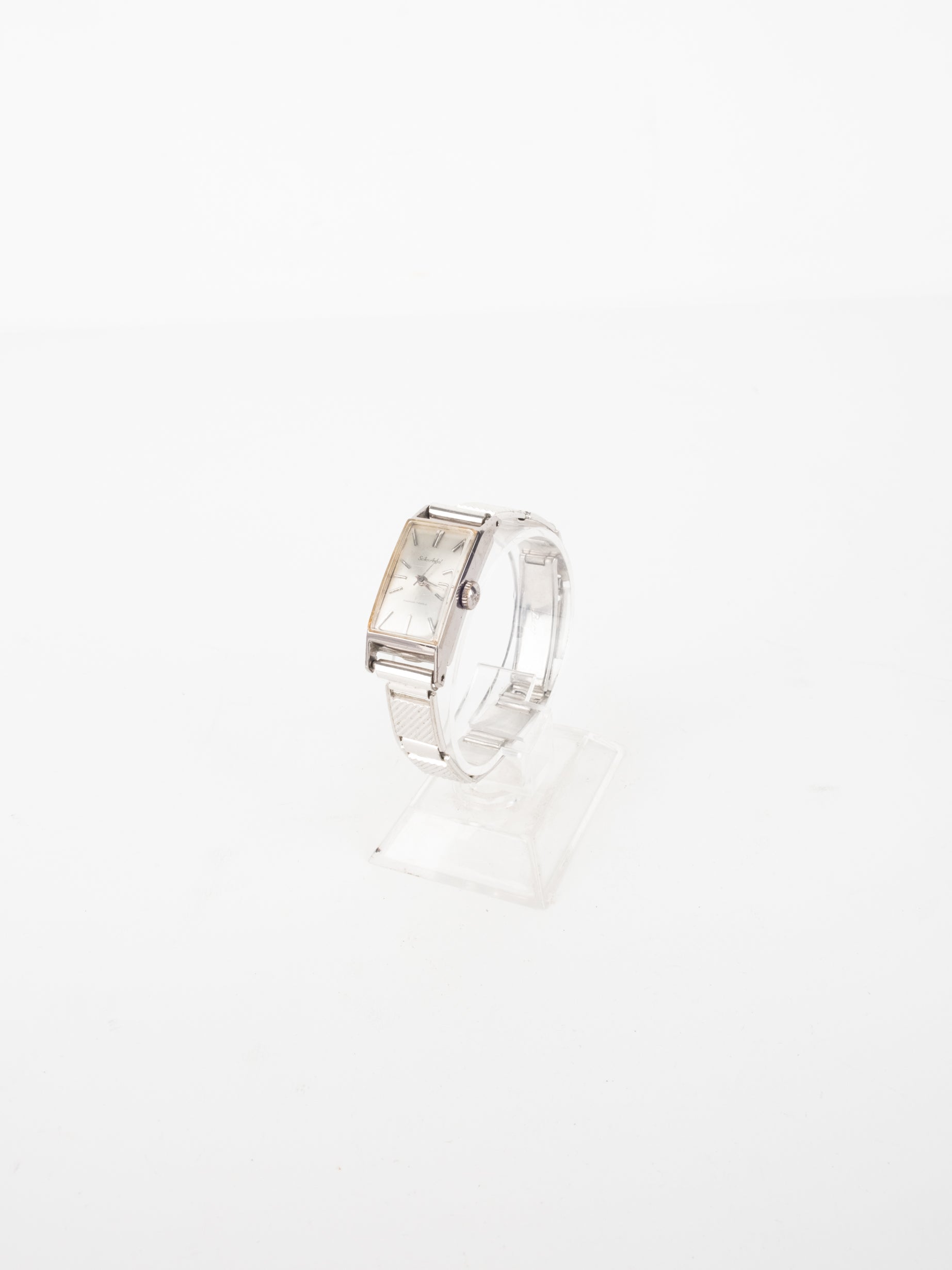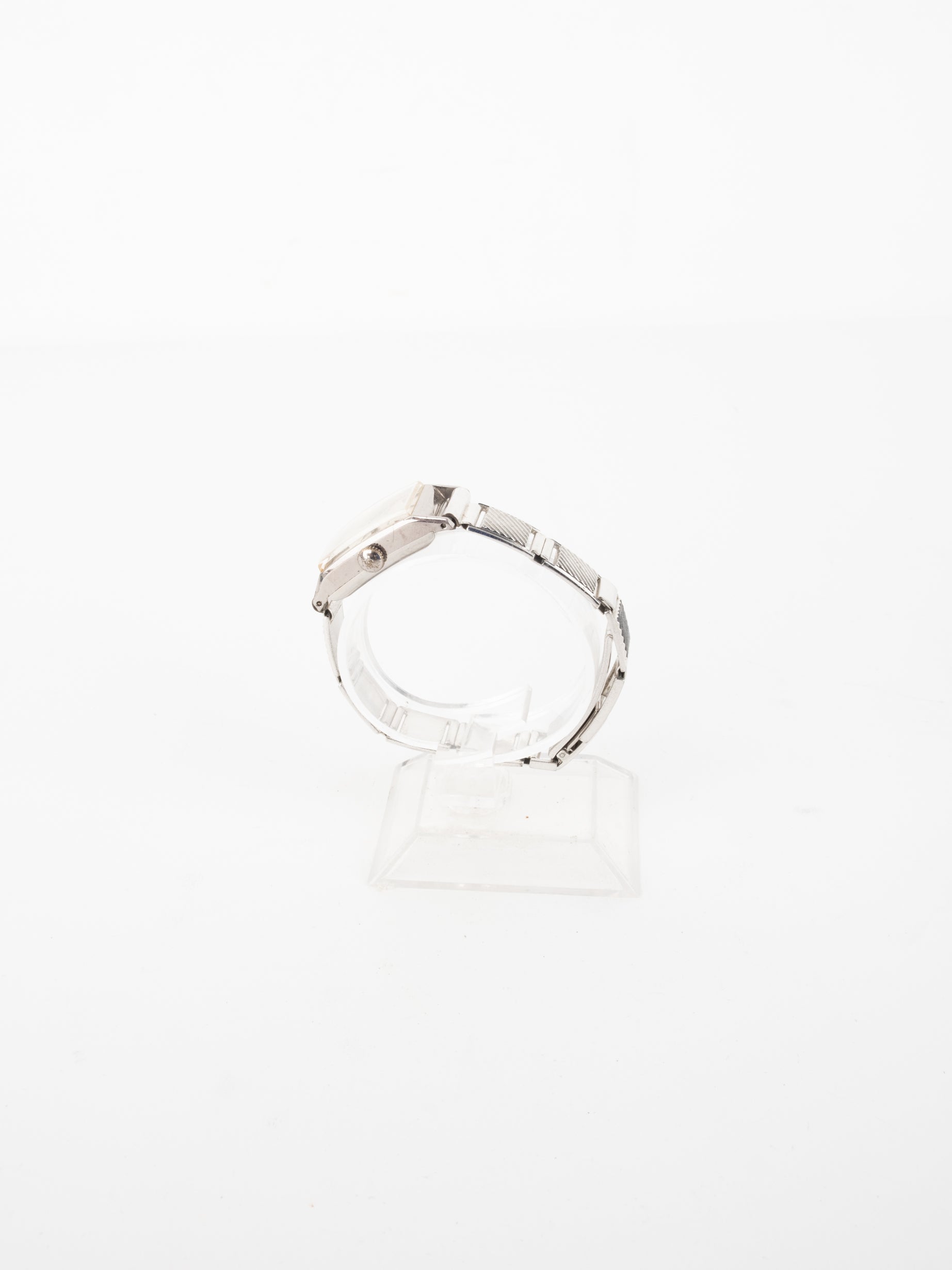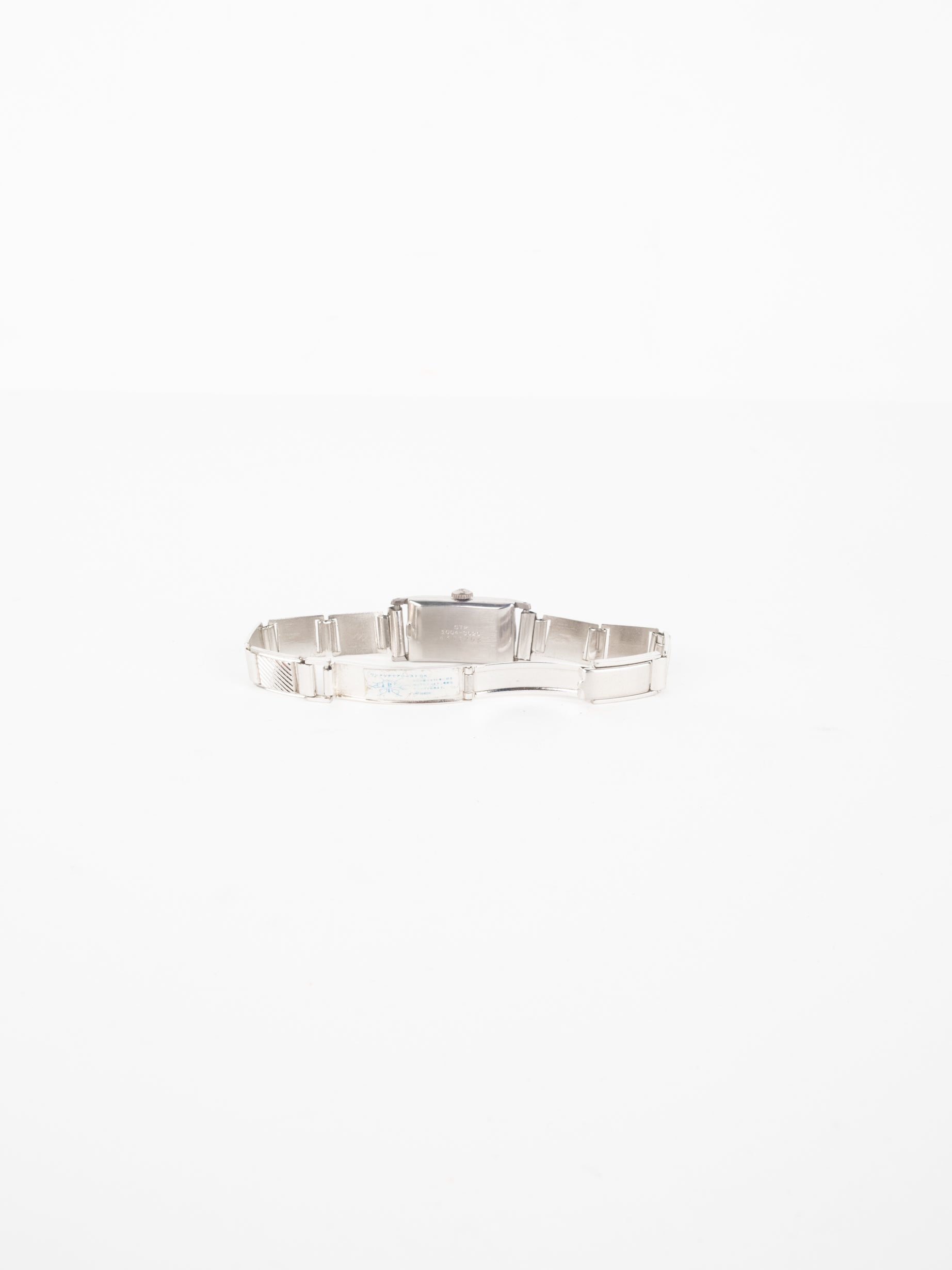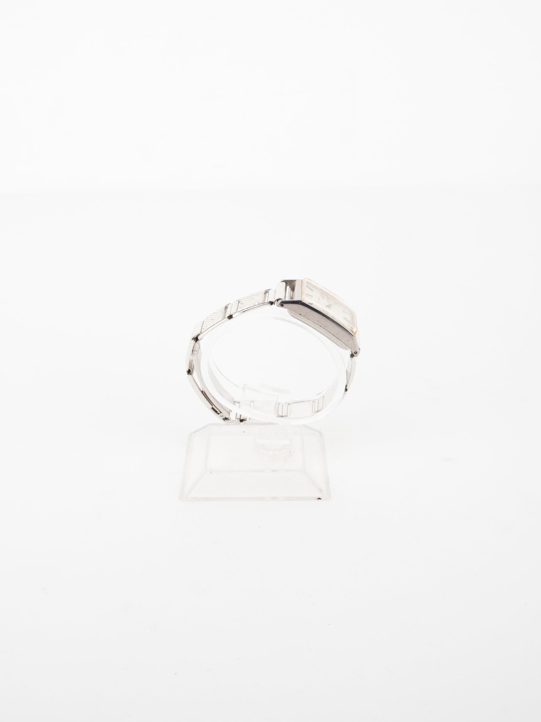 שעון קלאסי ואלגנטי בצבע כסוף בעל פני שעון בצורה מלבנית עם רקע לבן ומחוגים. שעון זה נסגר באמצעות סוגר ממותג.