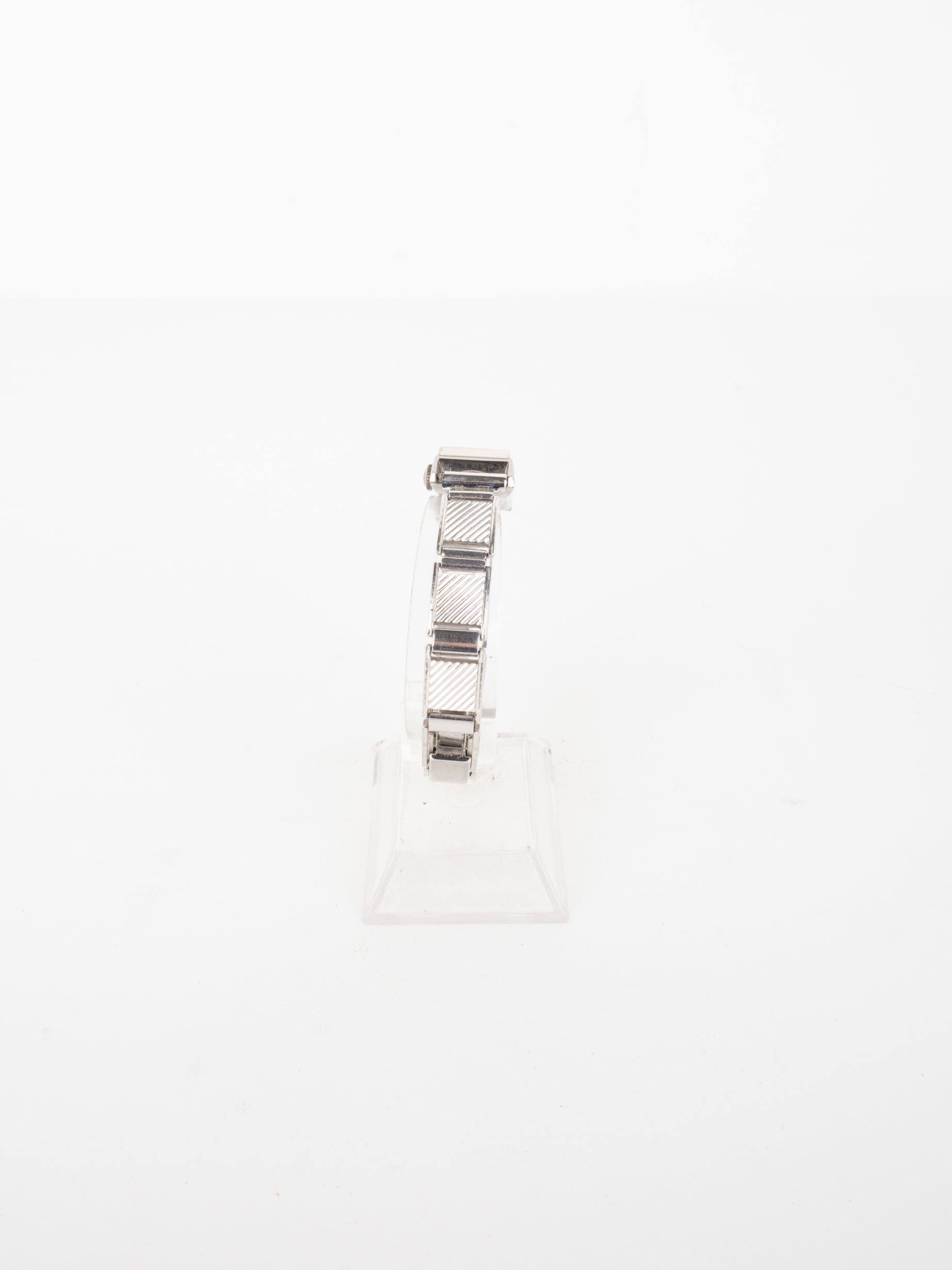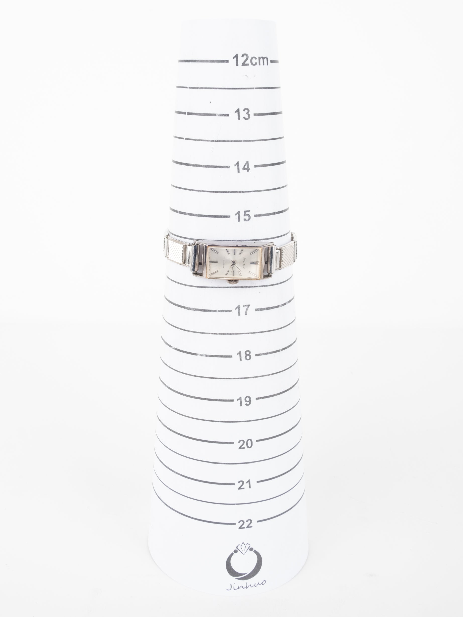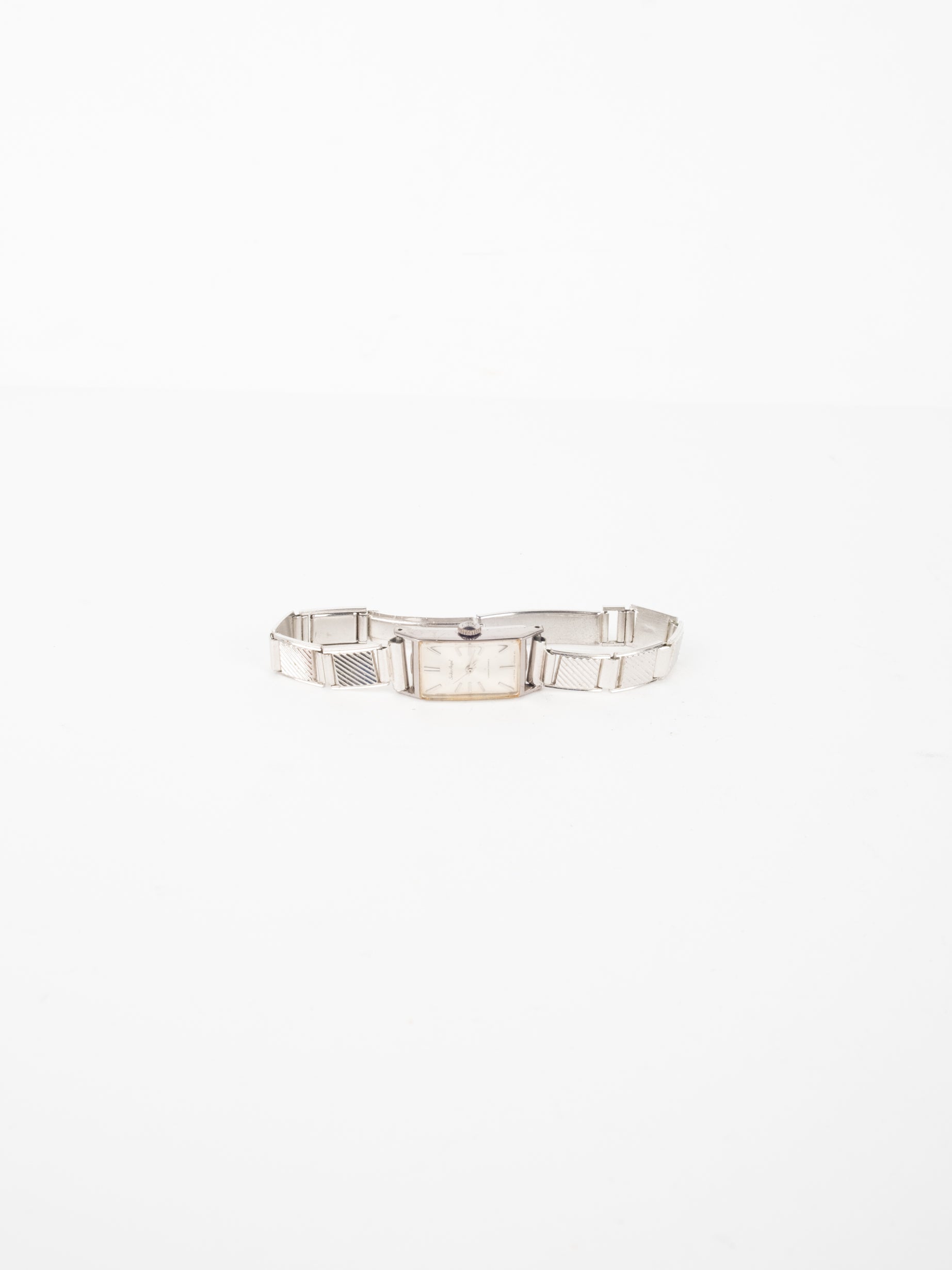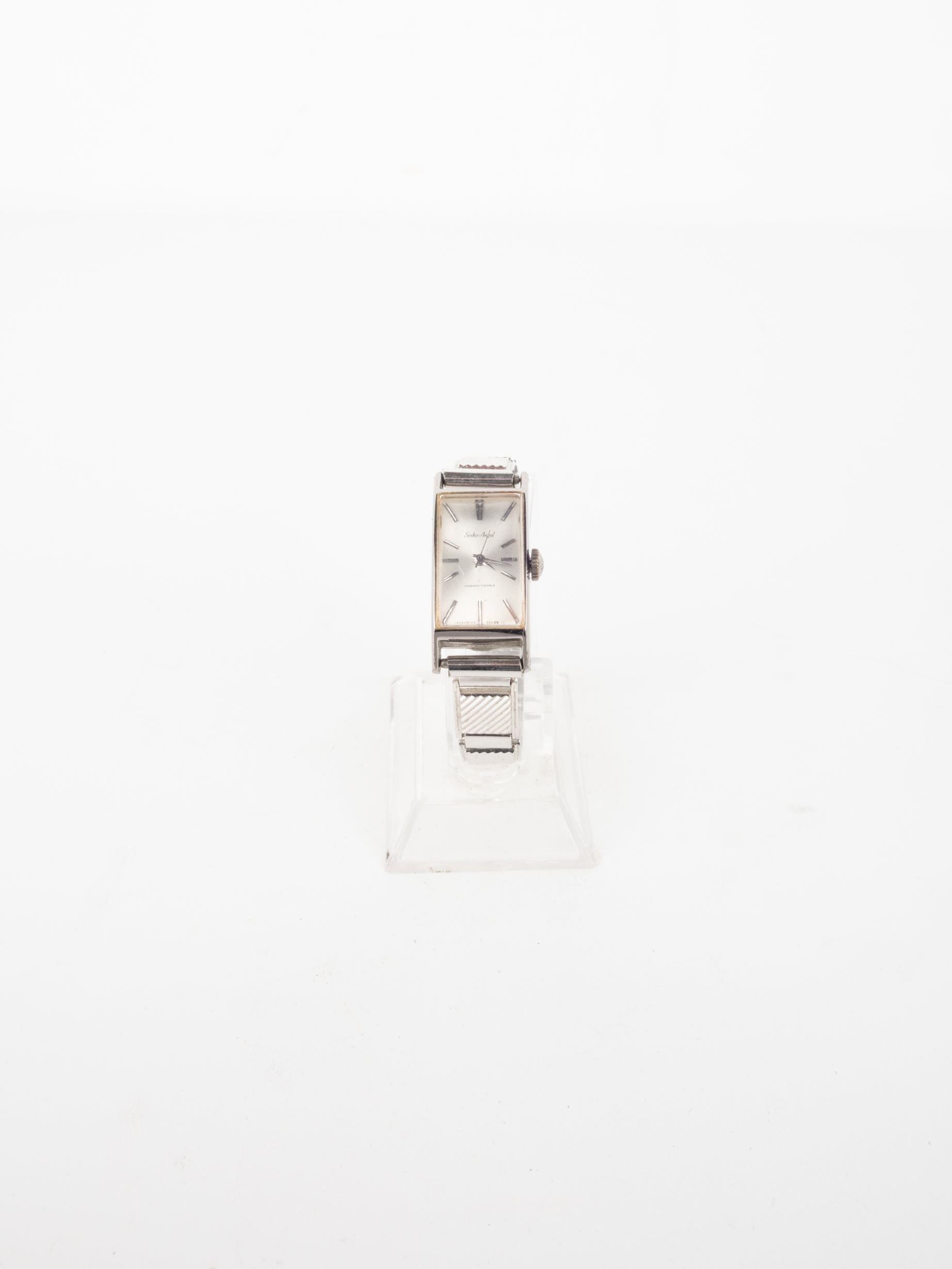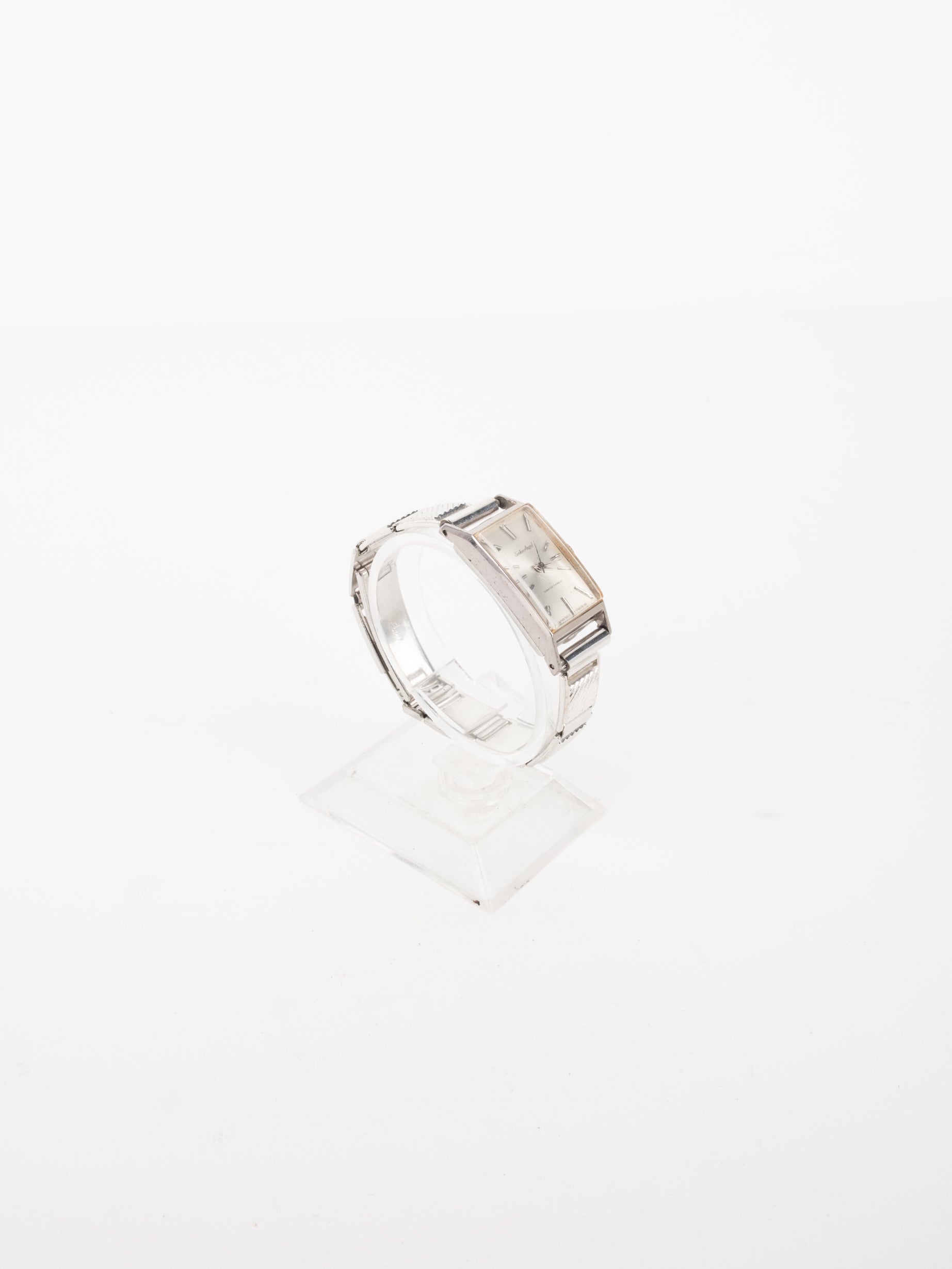 שעון קלאסי ואלגנטי בצבע כסוף בעל פני שעון בצורה מלבנית עם רקע לבן ומחוגים. שעון זה נסגר באמצעות סוגר ממותג.