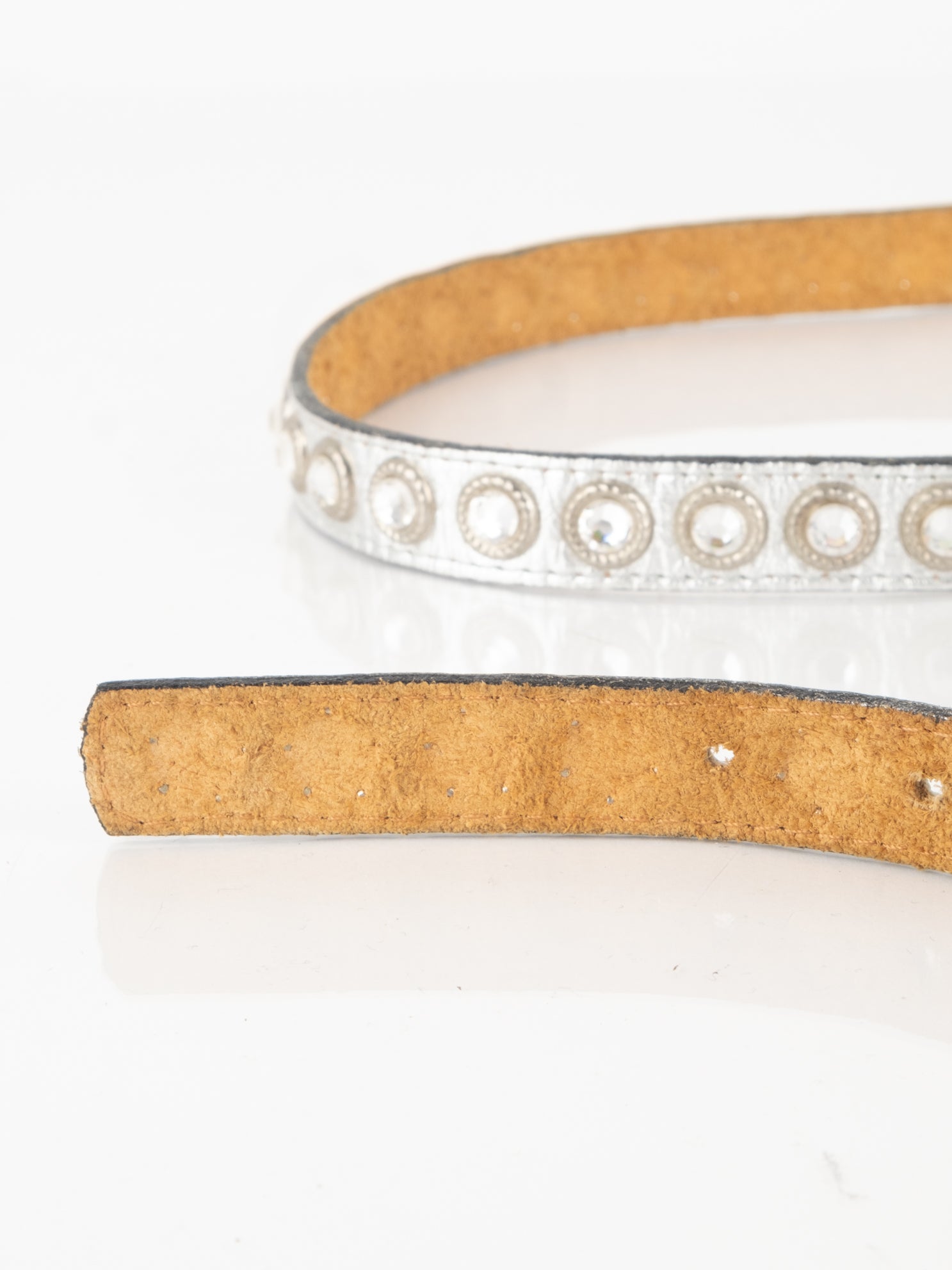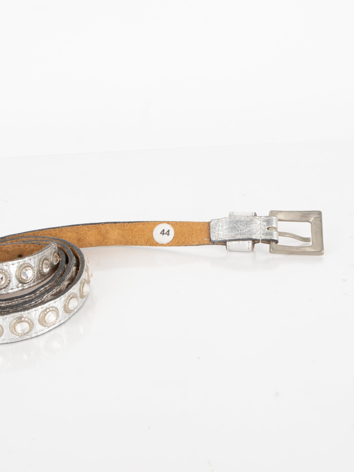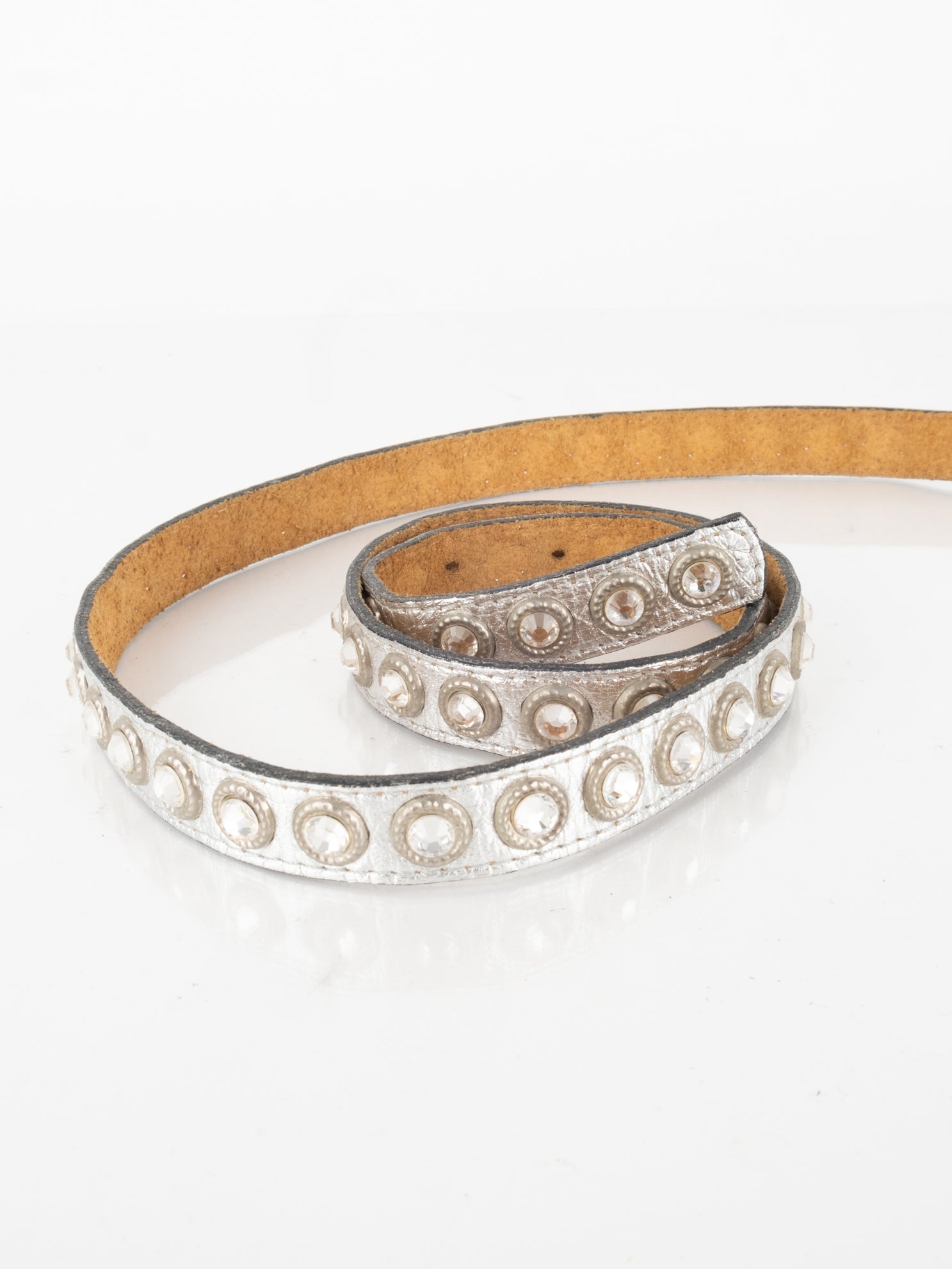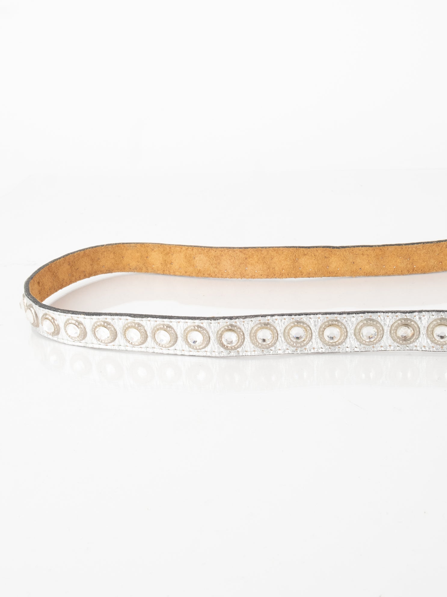 חגורה דקה העשויה מעור בצבע כסוף בעלת דיטיילים מוזהבים ואבנים.