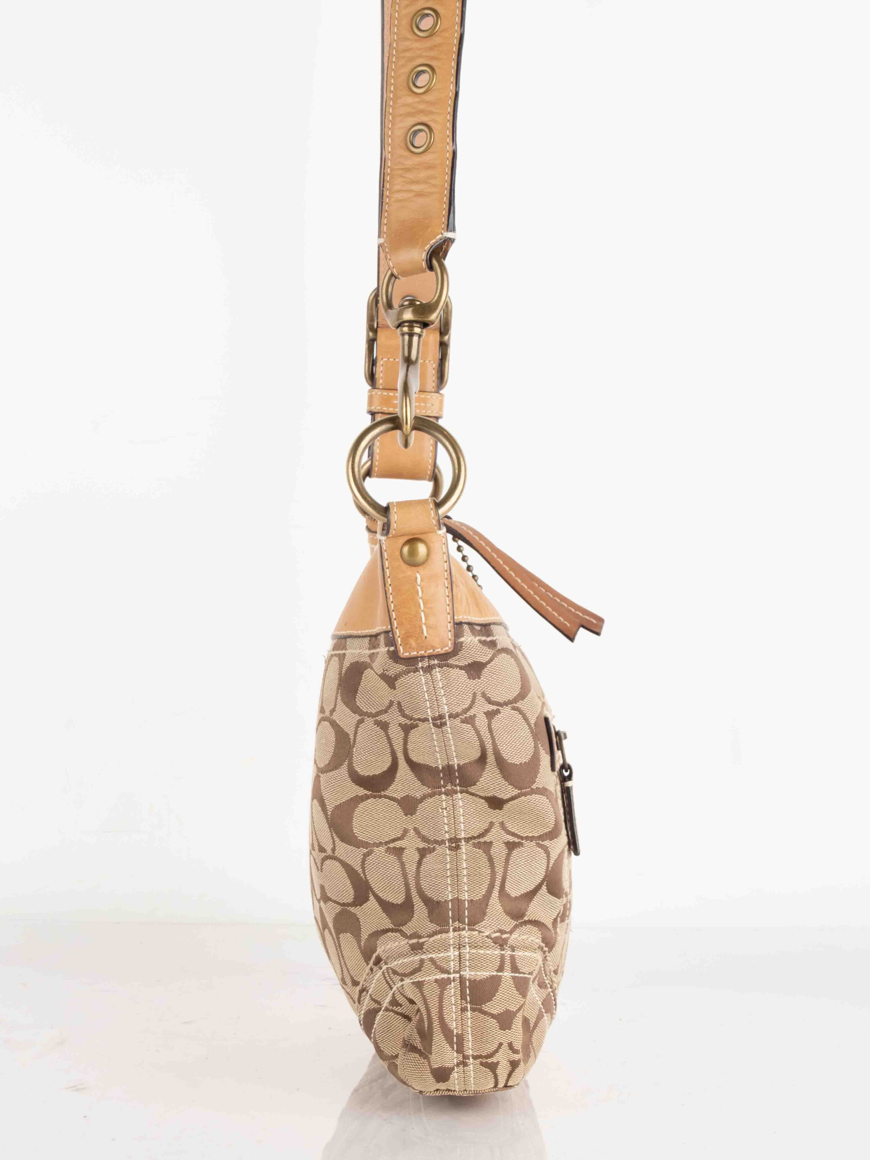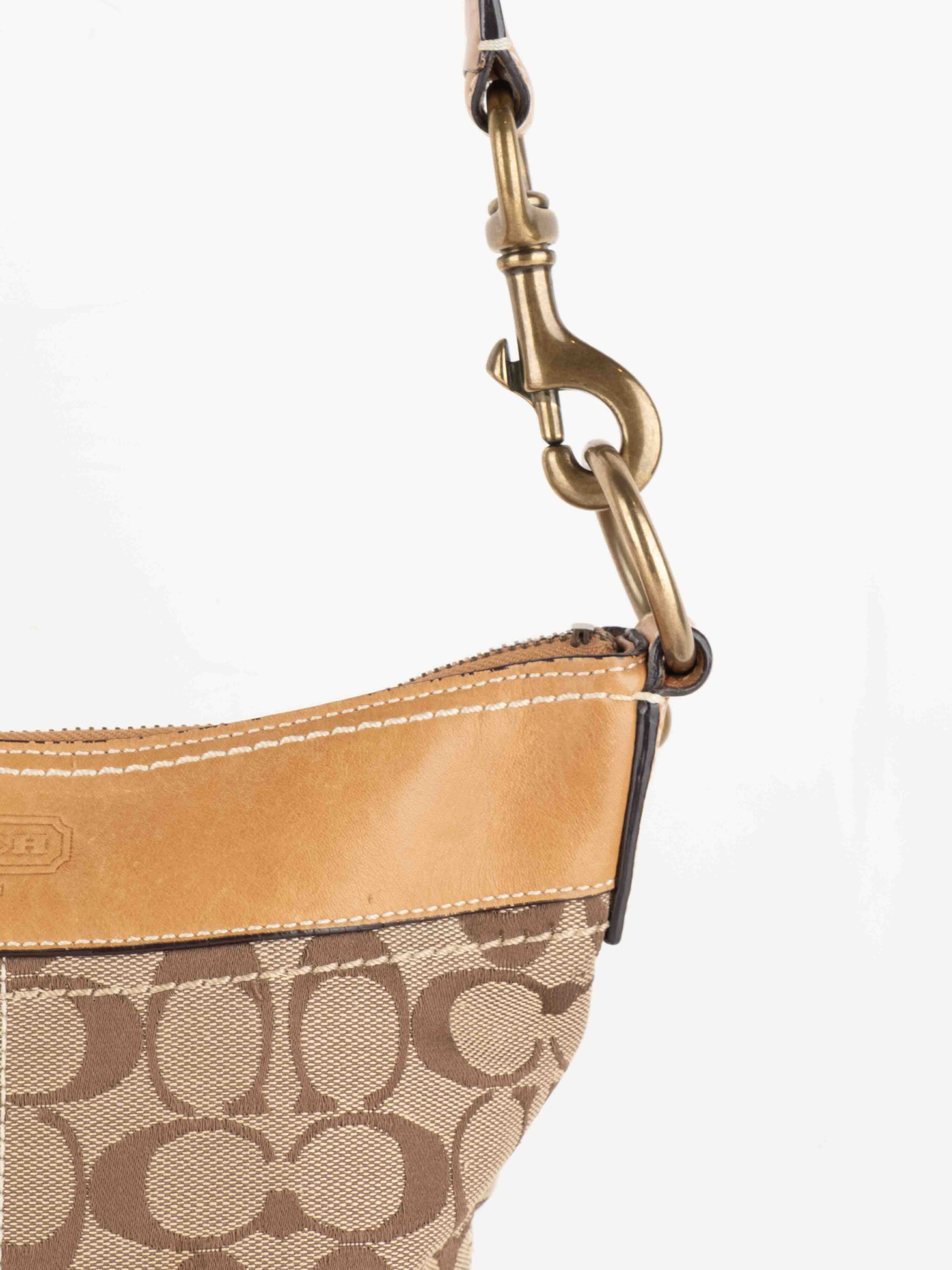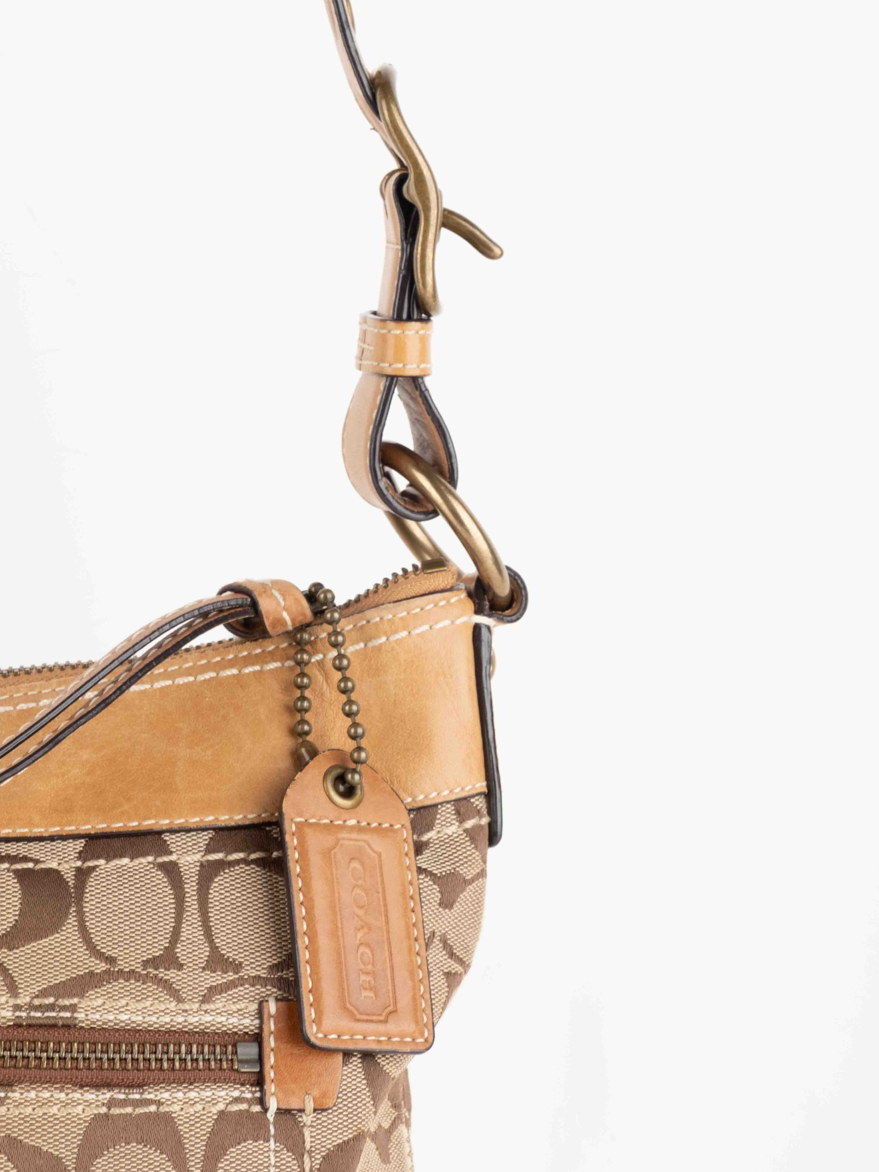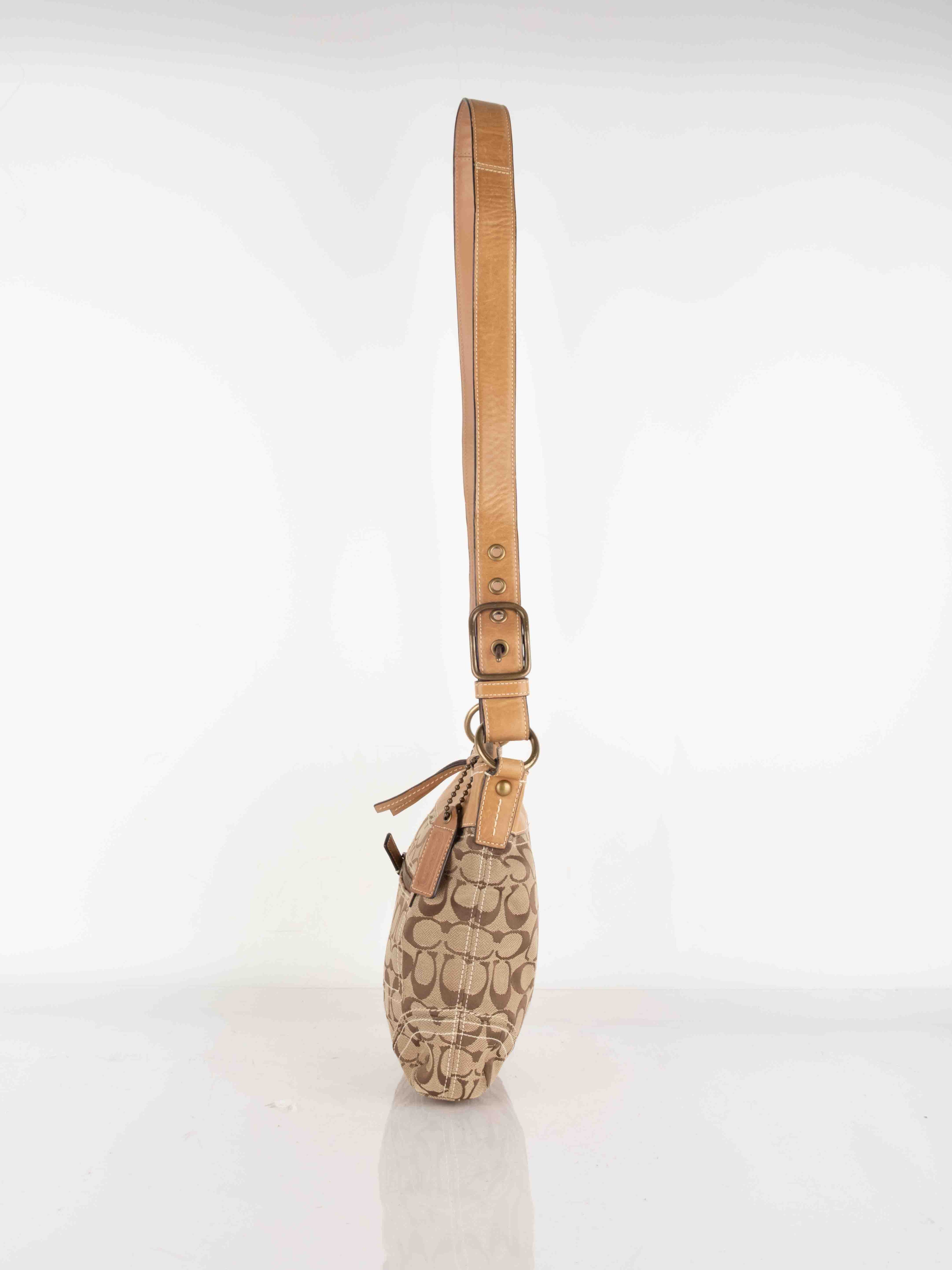 התיק עשוי קנבס Signature בגווני בז' וחום, עם חלק עליון בצבע בהיר יותר. רצועת כתף ארוכה ומתכווננת, סגירה עליונה (לא נראית בסוג), קווי עיצוב רכים ורוחב קומפקטי.