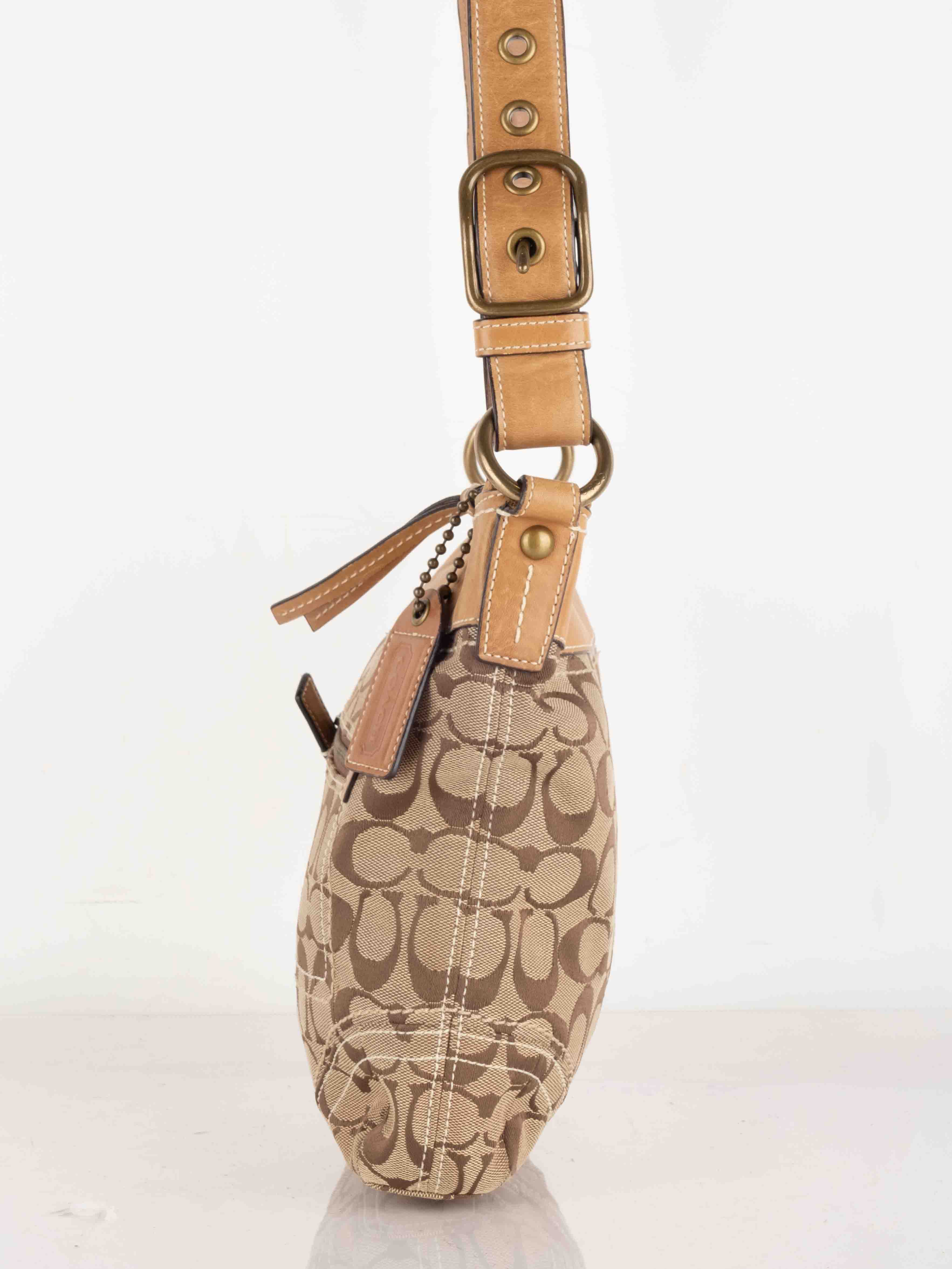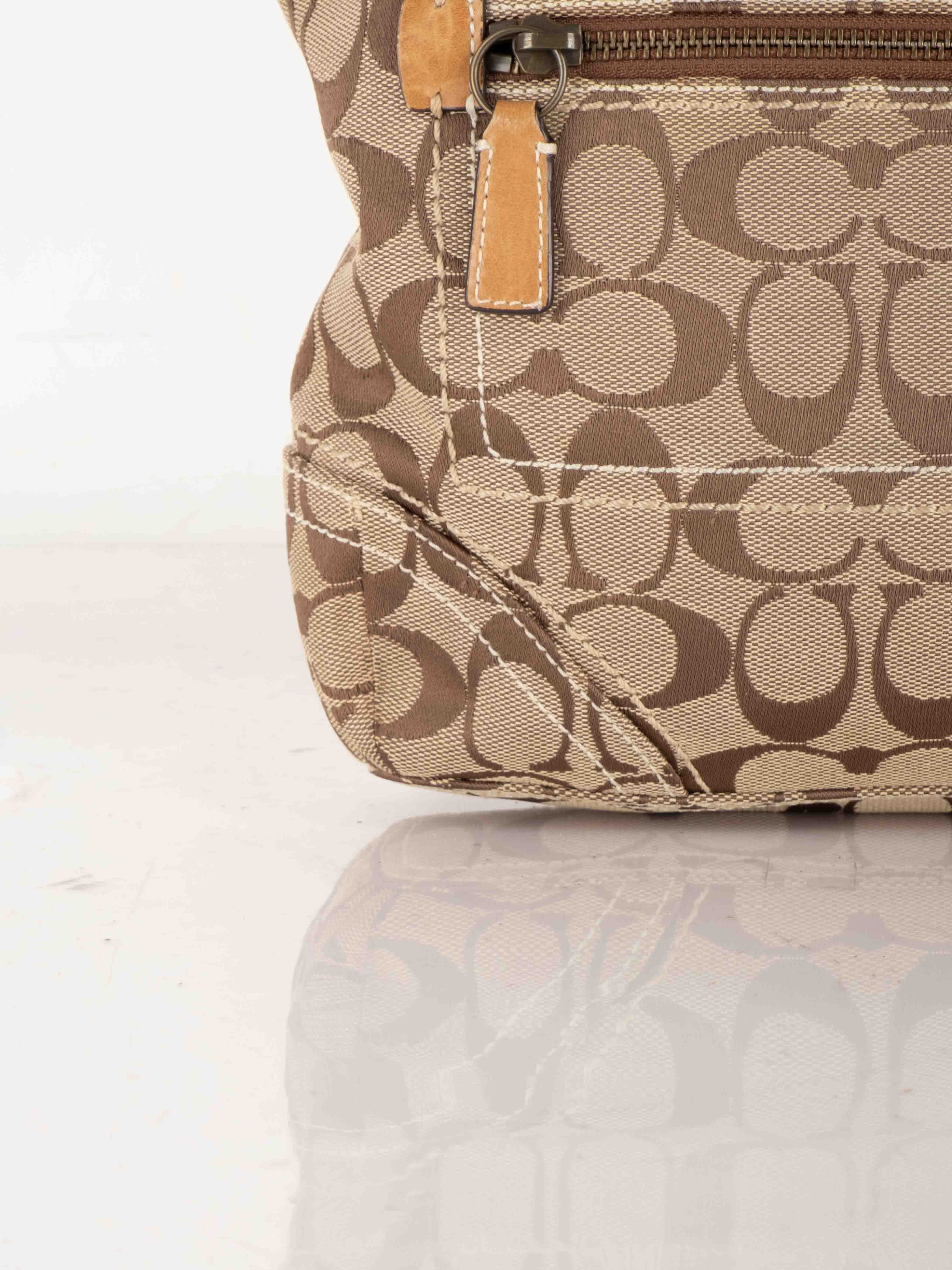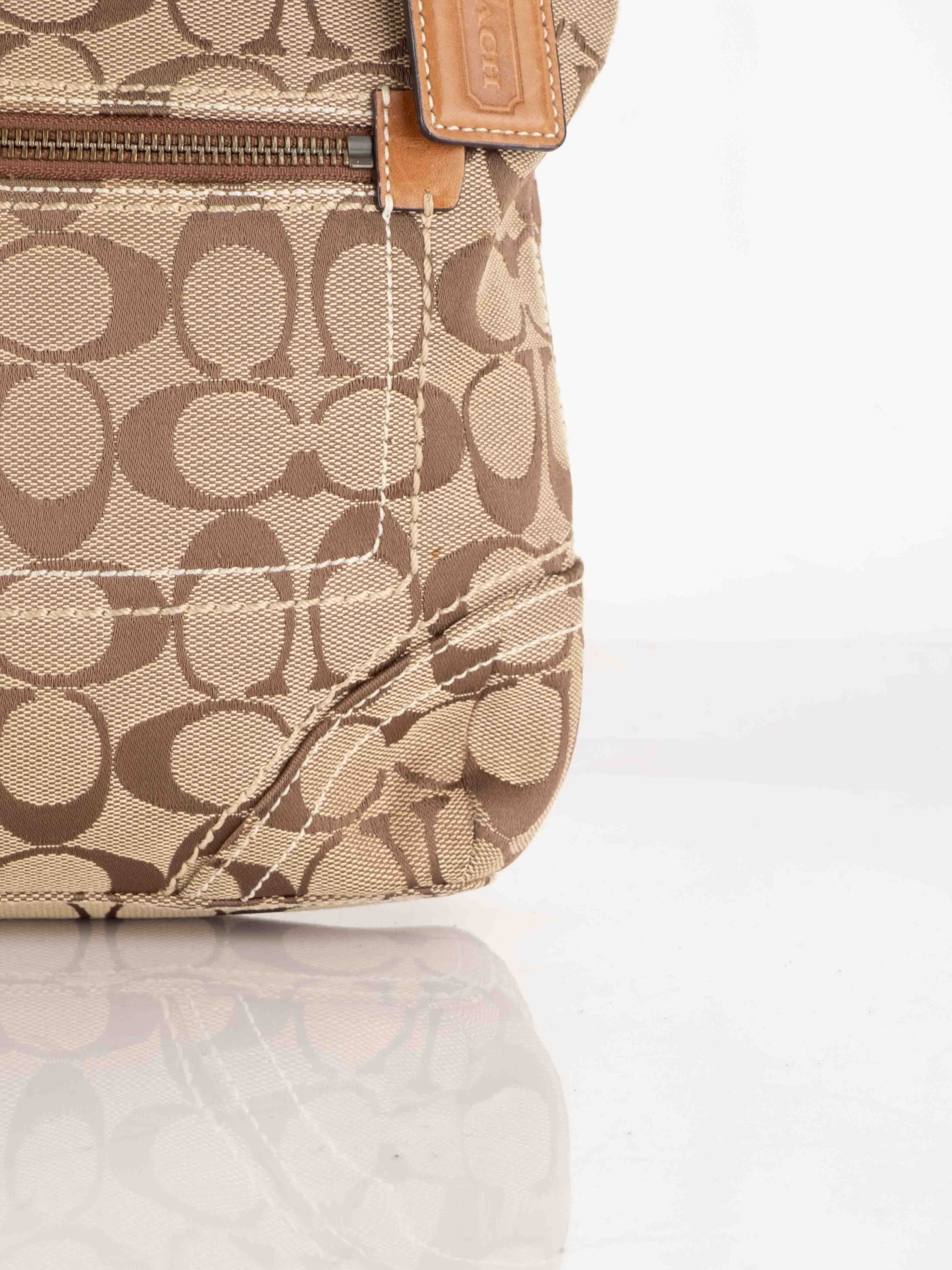 התיק עשוי קנבס Signature בגווני בז' וחום, עם חלק עליון בצבע בהיר יותר. רצועת כתף ארוכה ומתכווננת, סגירה עליונה (לא נראית בסוג), קווי עיצוב רכים ורוחב קומפקטי.