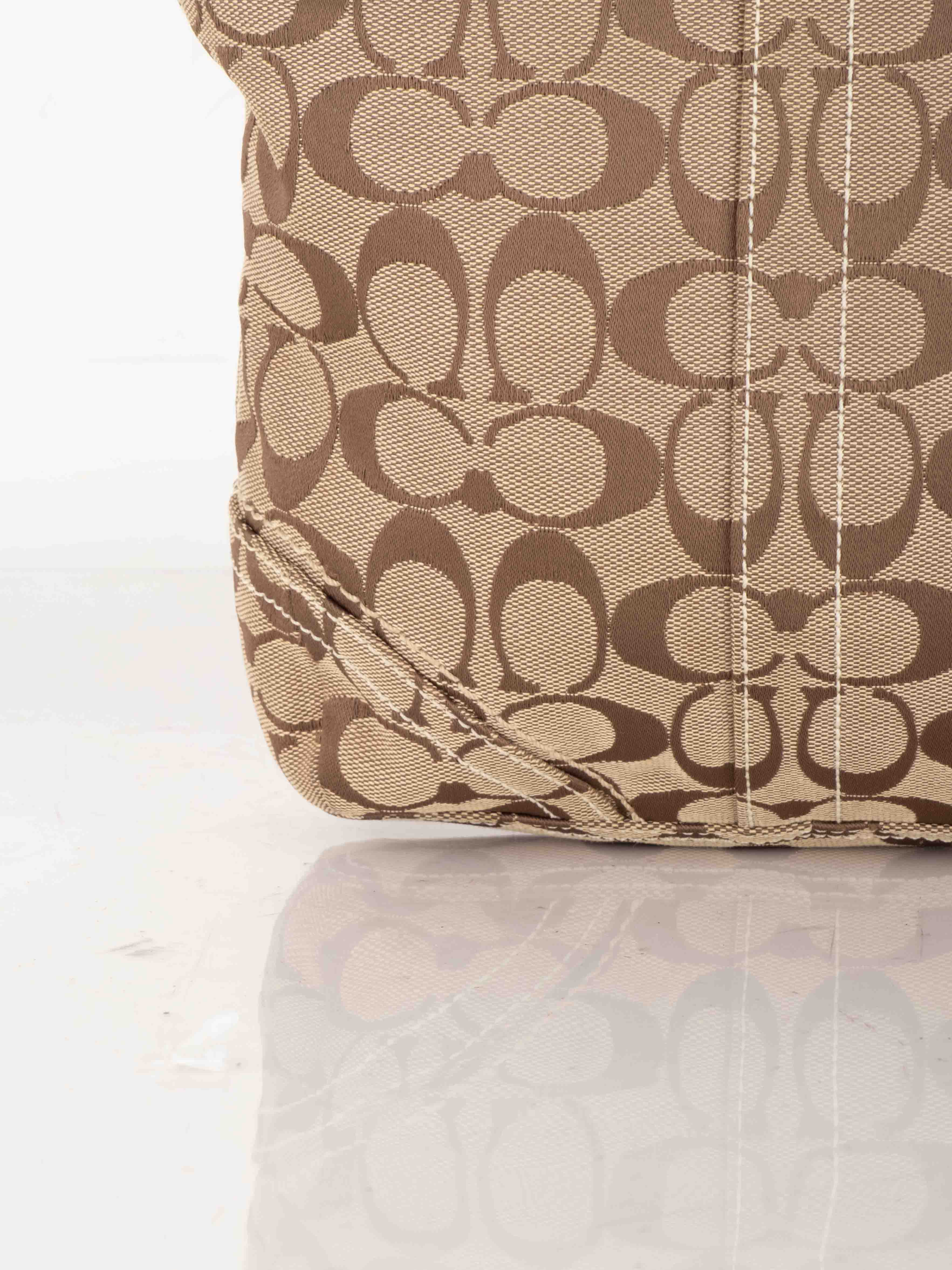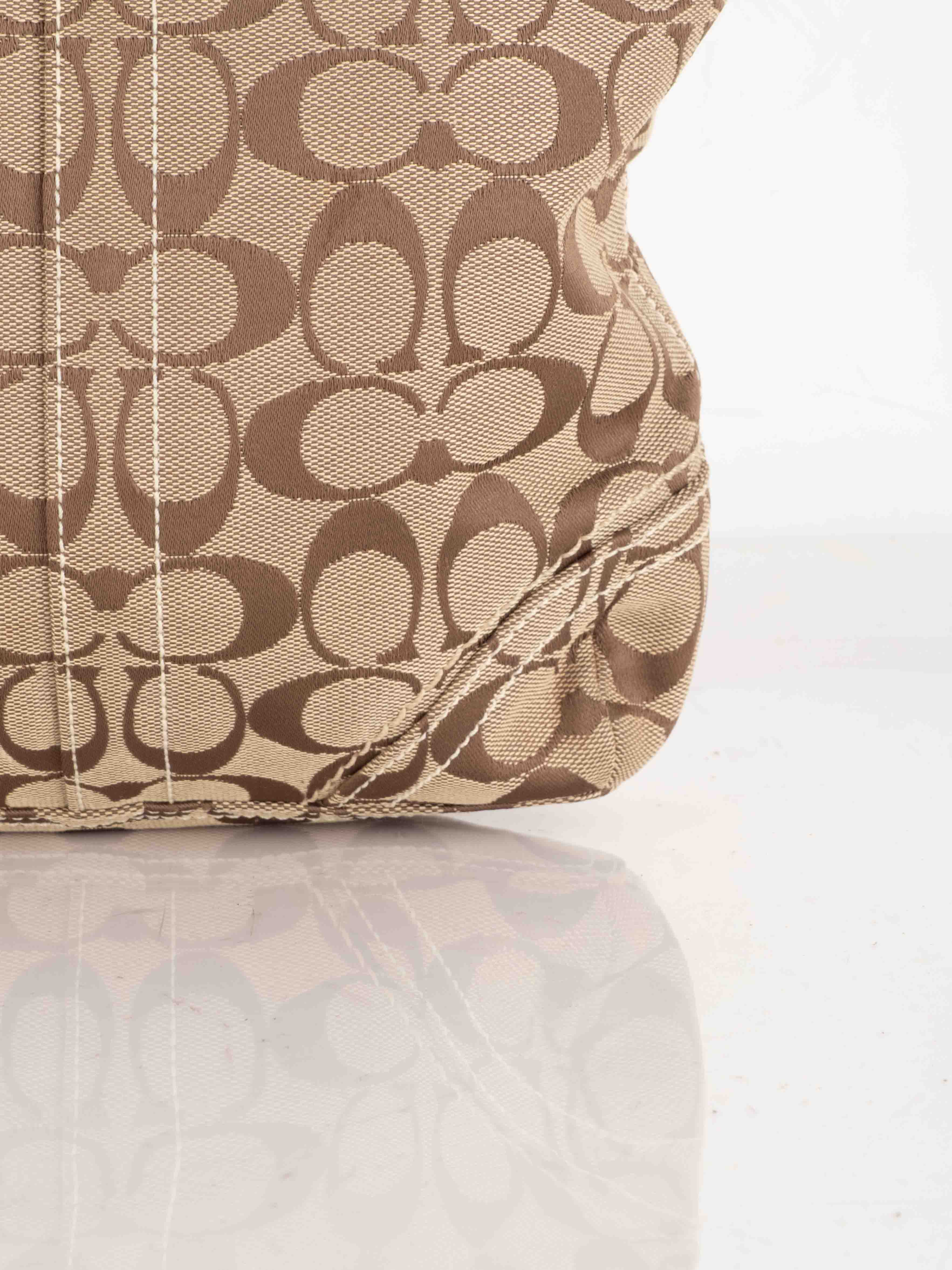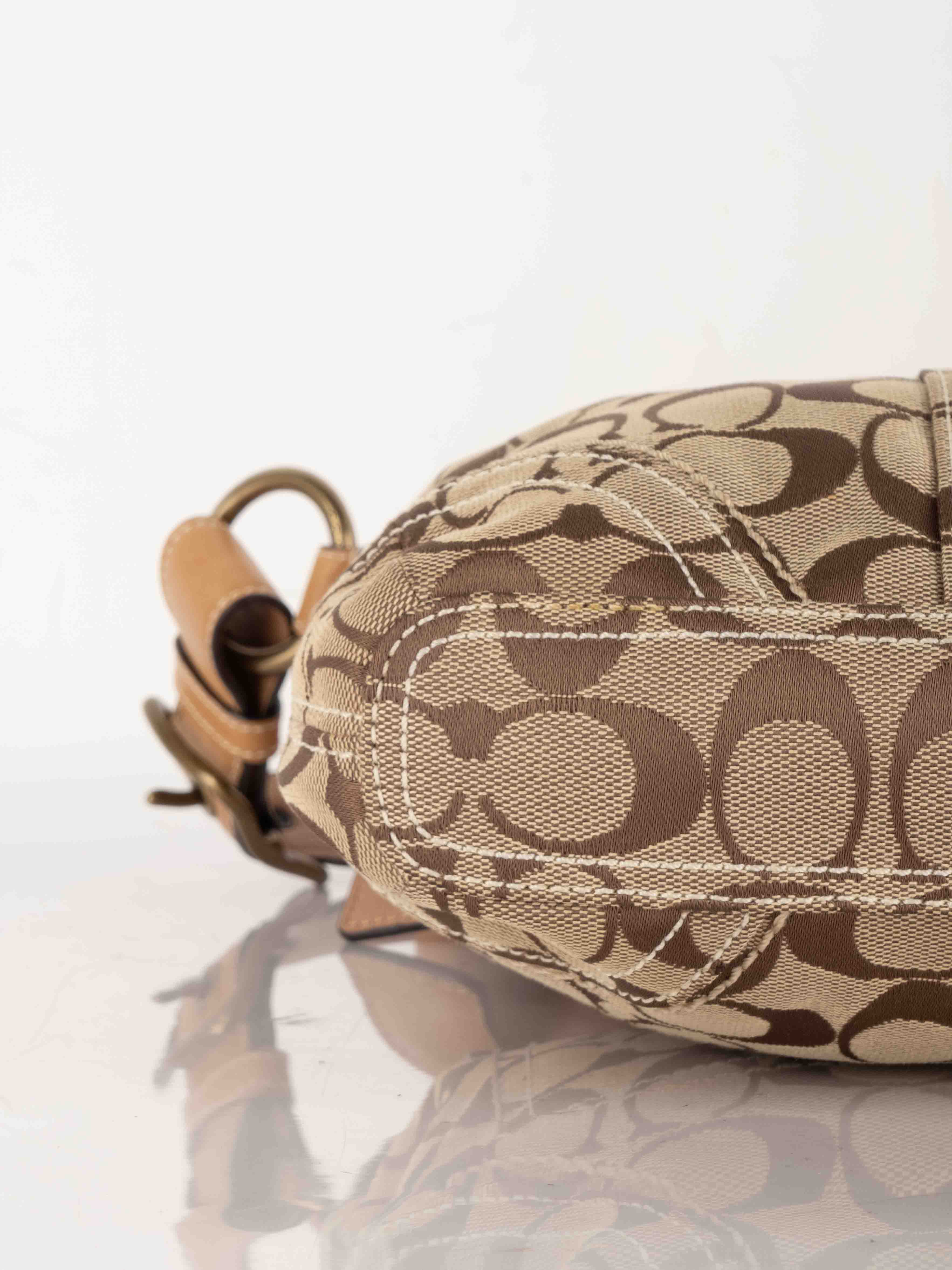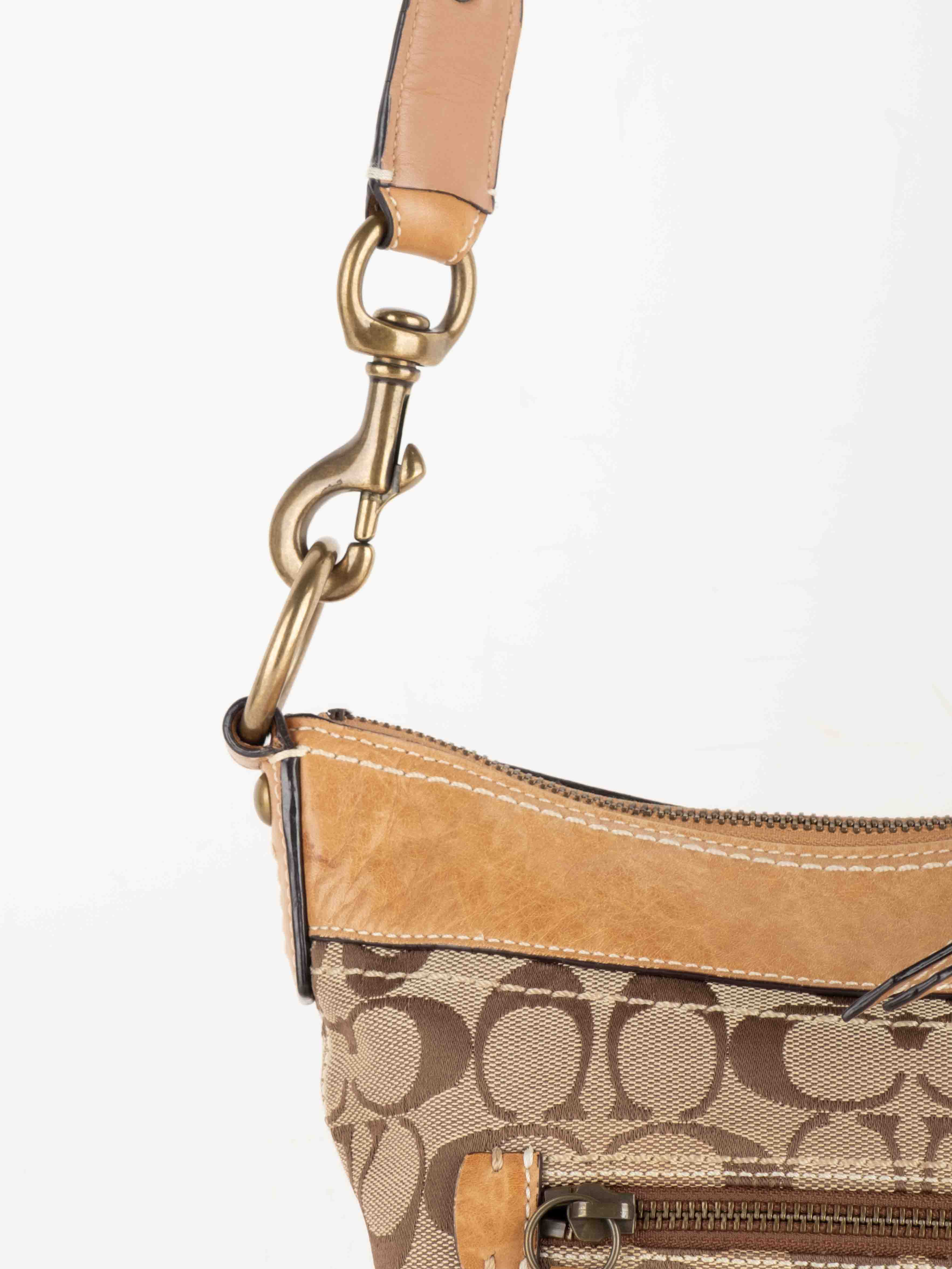 התיק עשוי קנבס Signature בגווני בז' וחום, עם חלק עליון בצבע בהיר יותר. רצועת כתף ארוכה ומתכווננת, סגירה עליונה (לא נראית בסוג), קווי עיצוב רכים ורוחב קומפקטי.