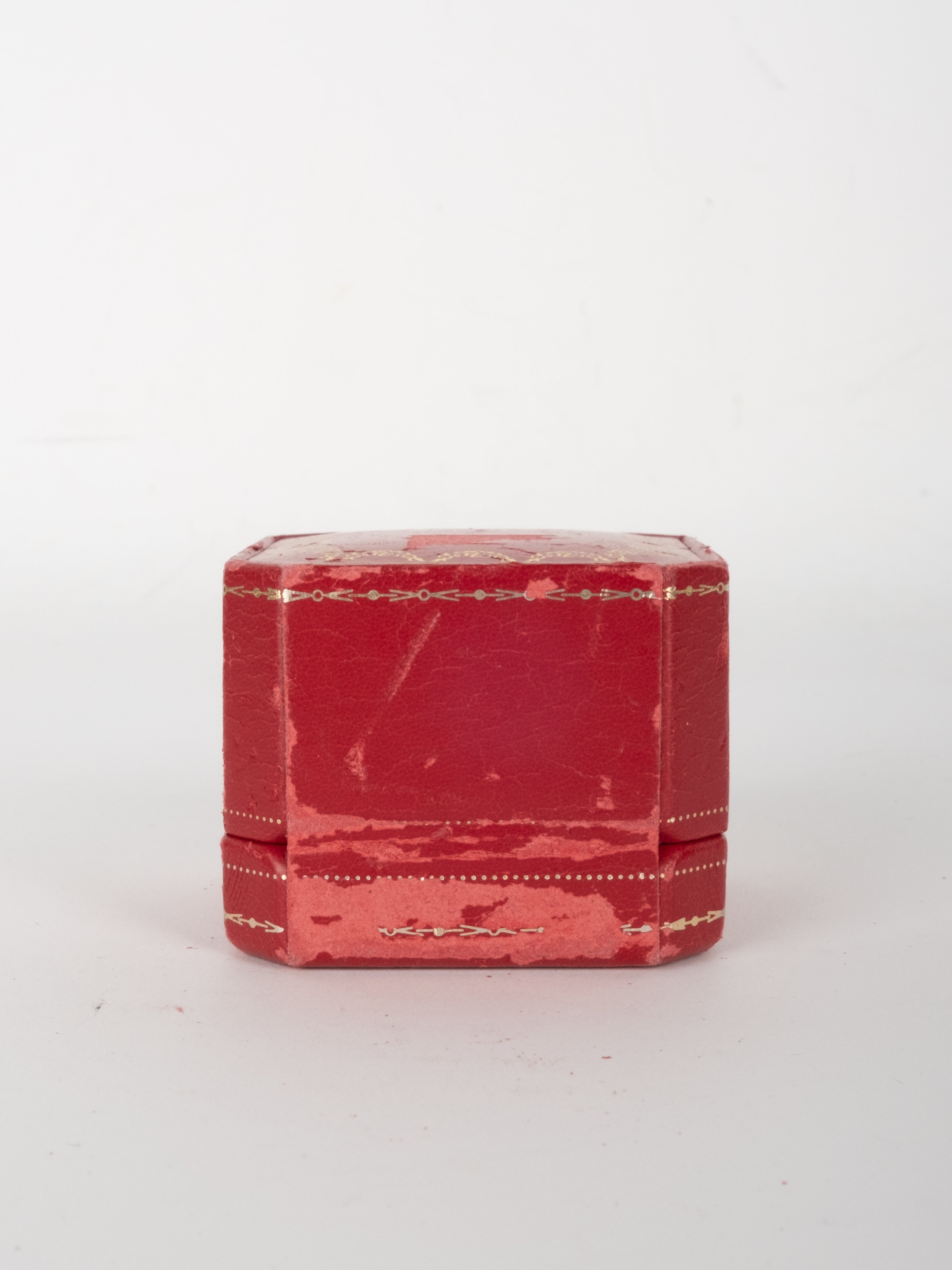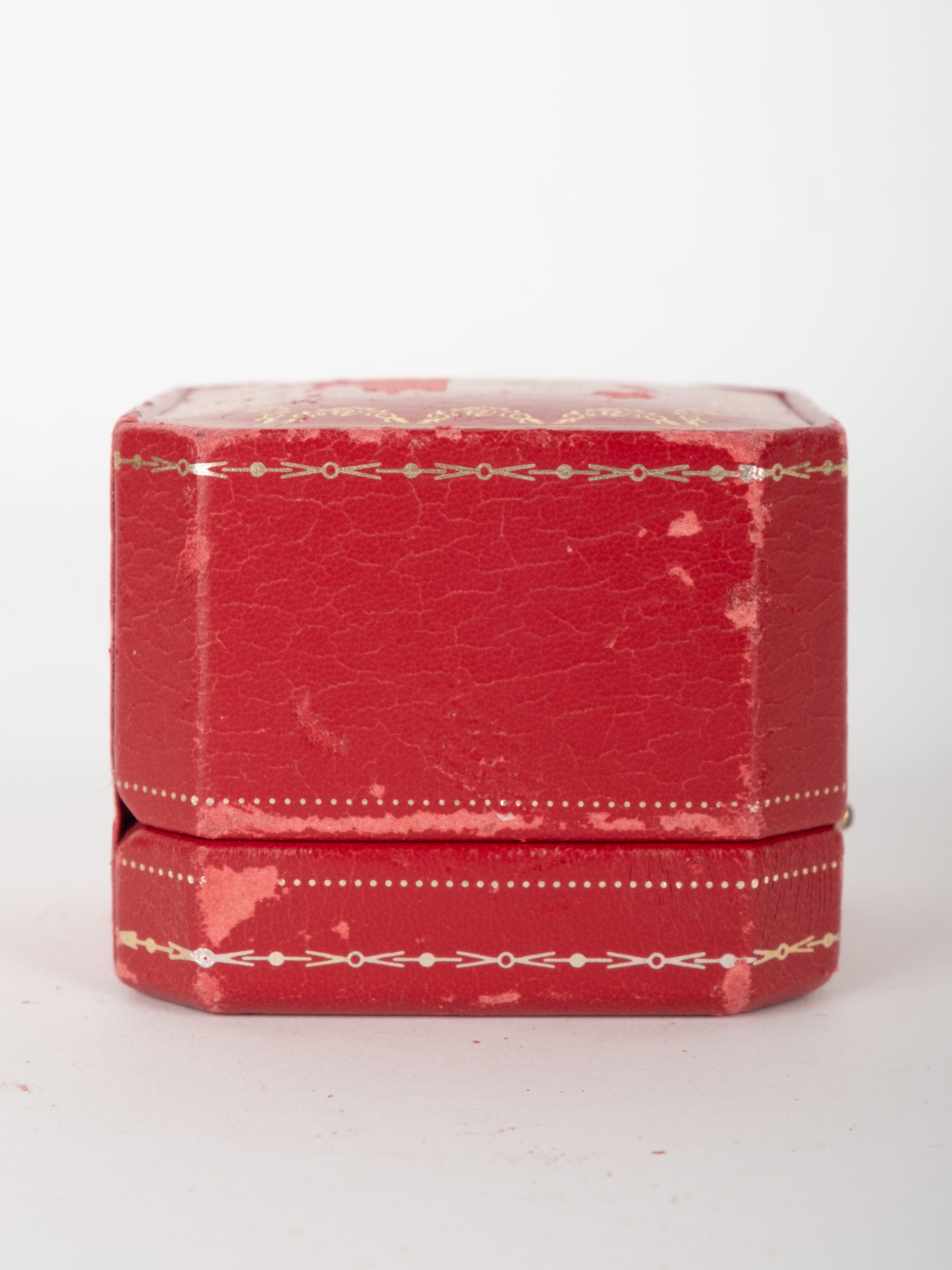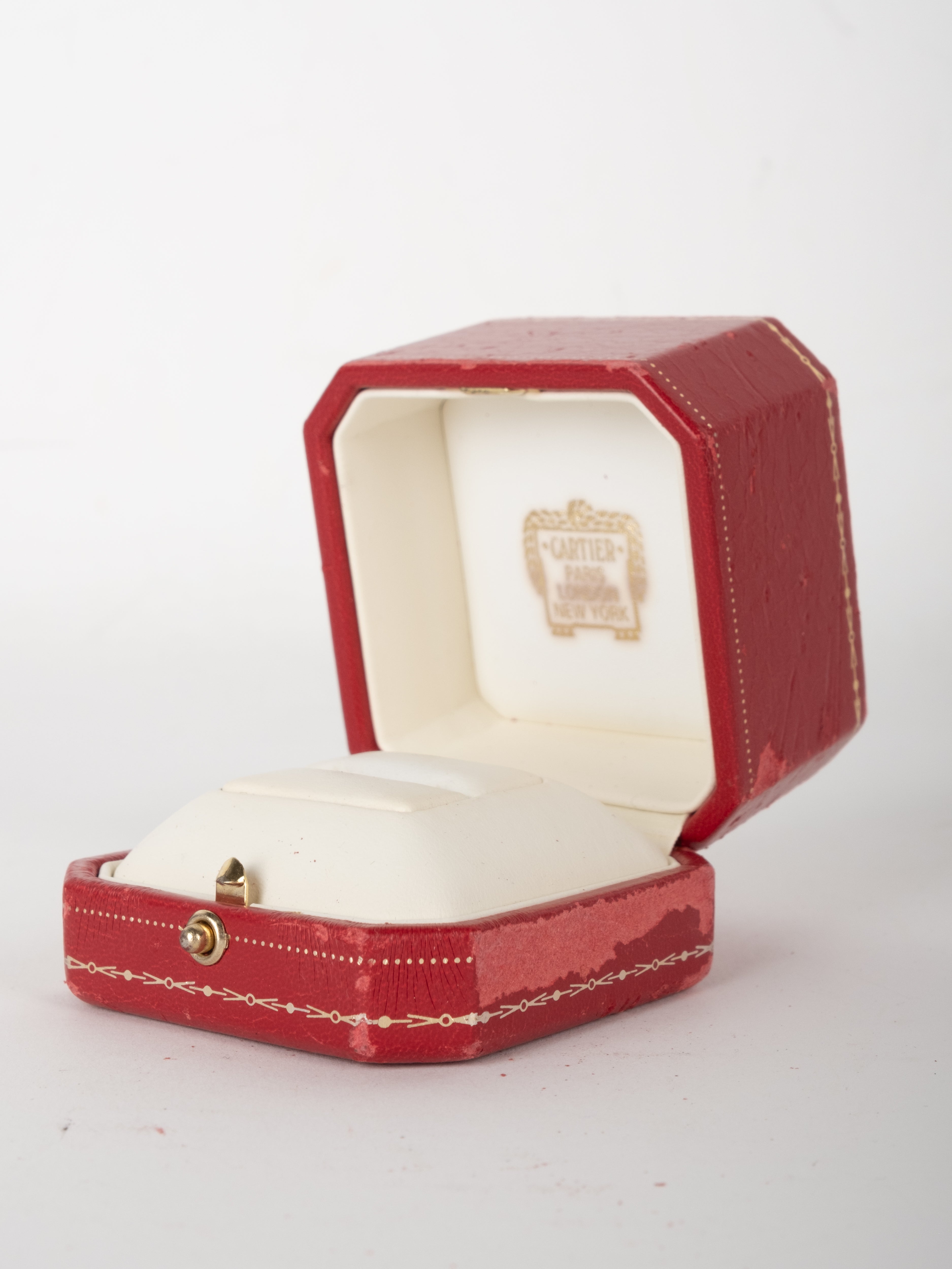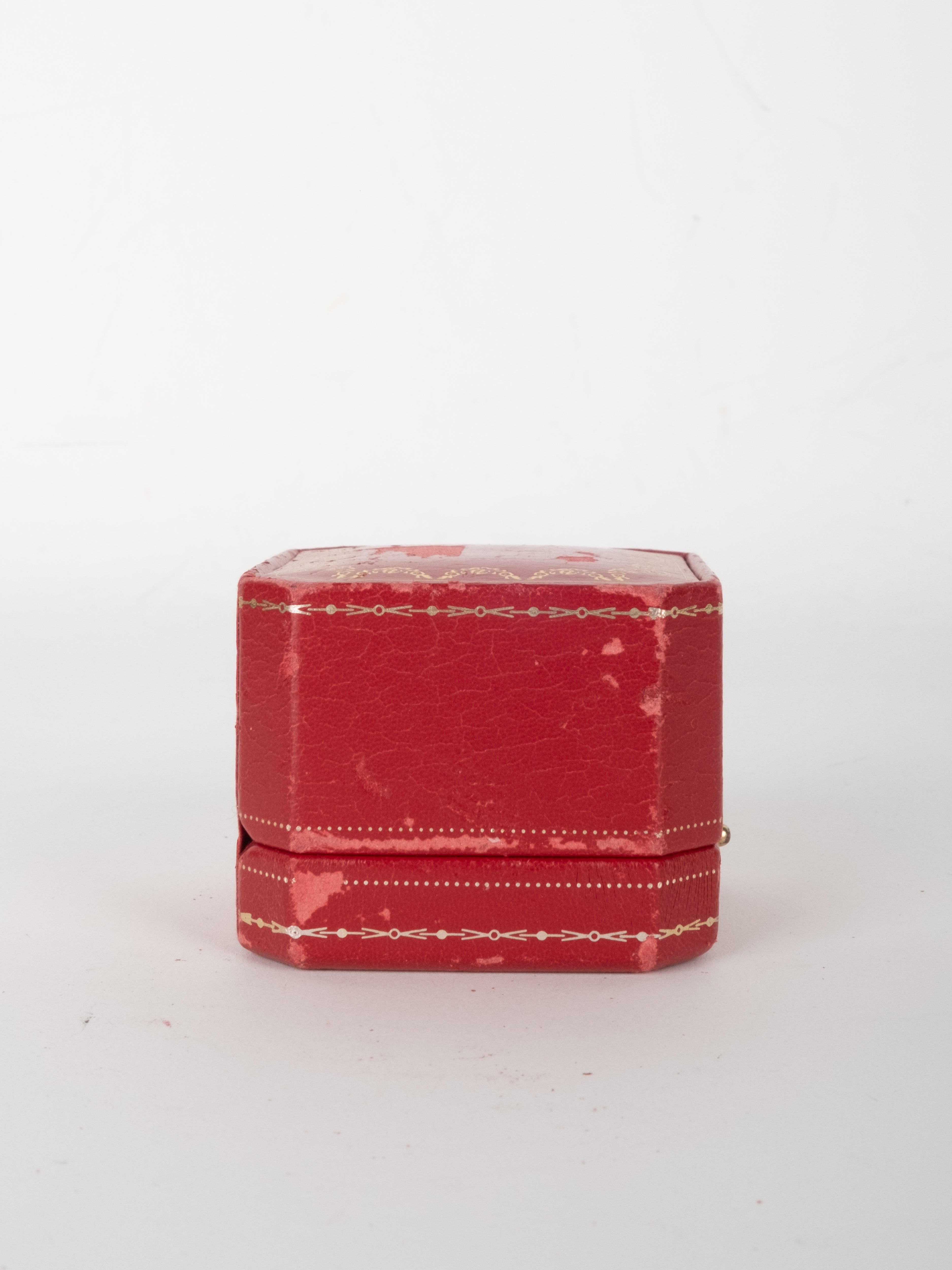 קופסת תכשיטים מקורית של Cartier בגוון אדום עמוק, עם תפירה דקורטיבית והטבעות זהב עדינות. הקופסה נפתחת ונסגרת בצורה תקינה, עם פנים בהיר המיועד לאחסון תכשיט.